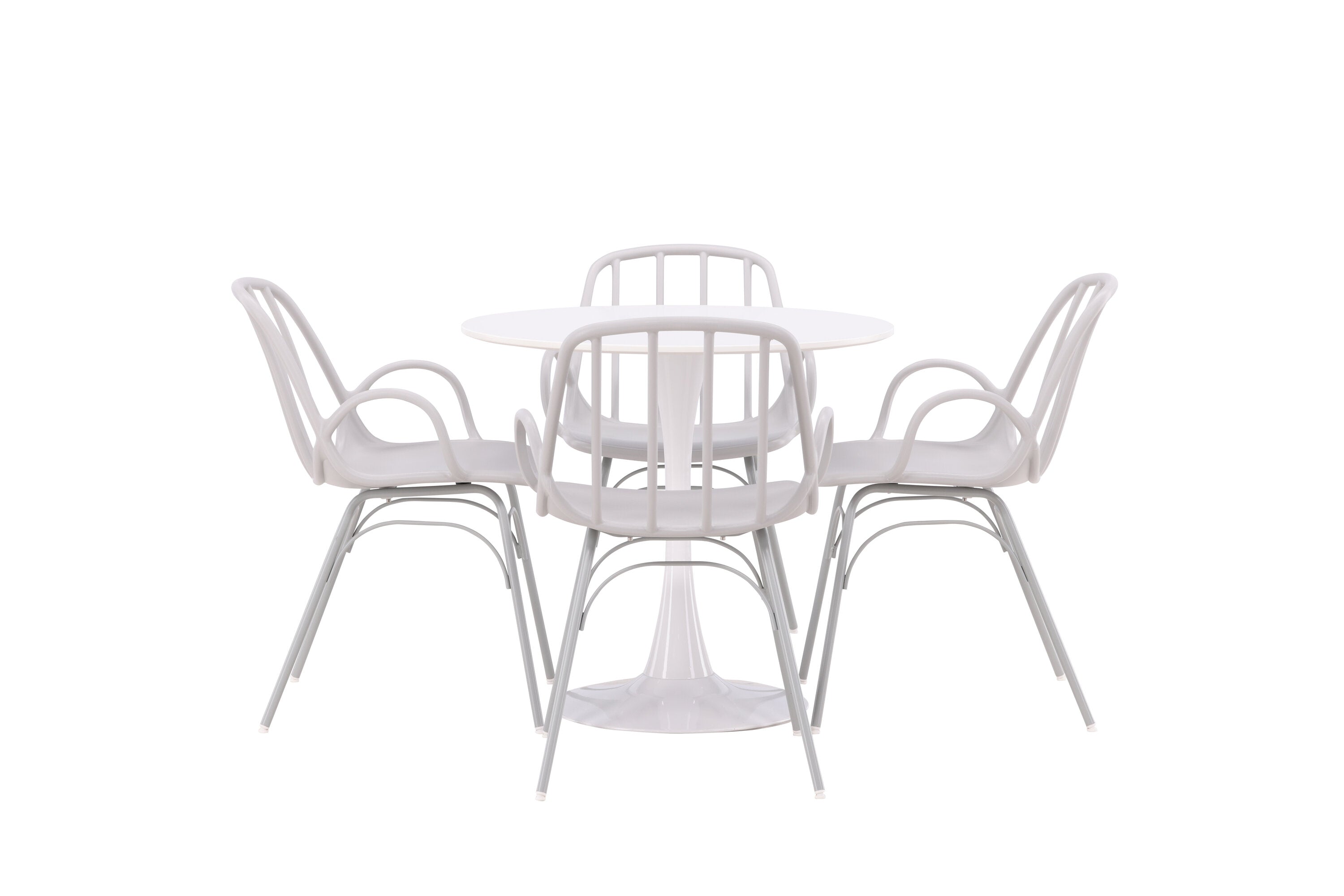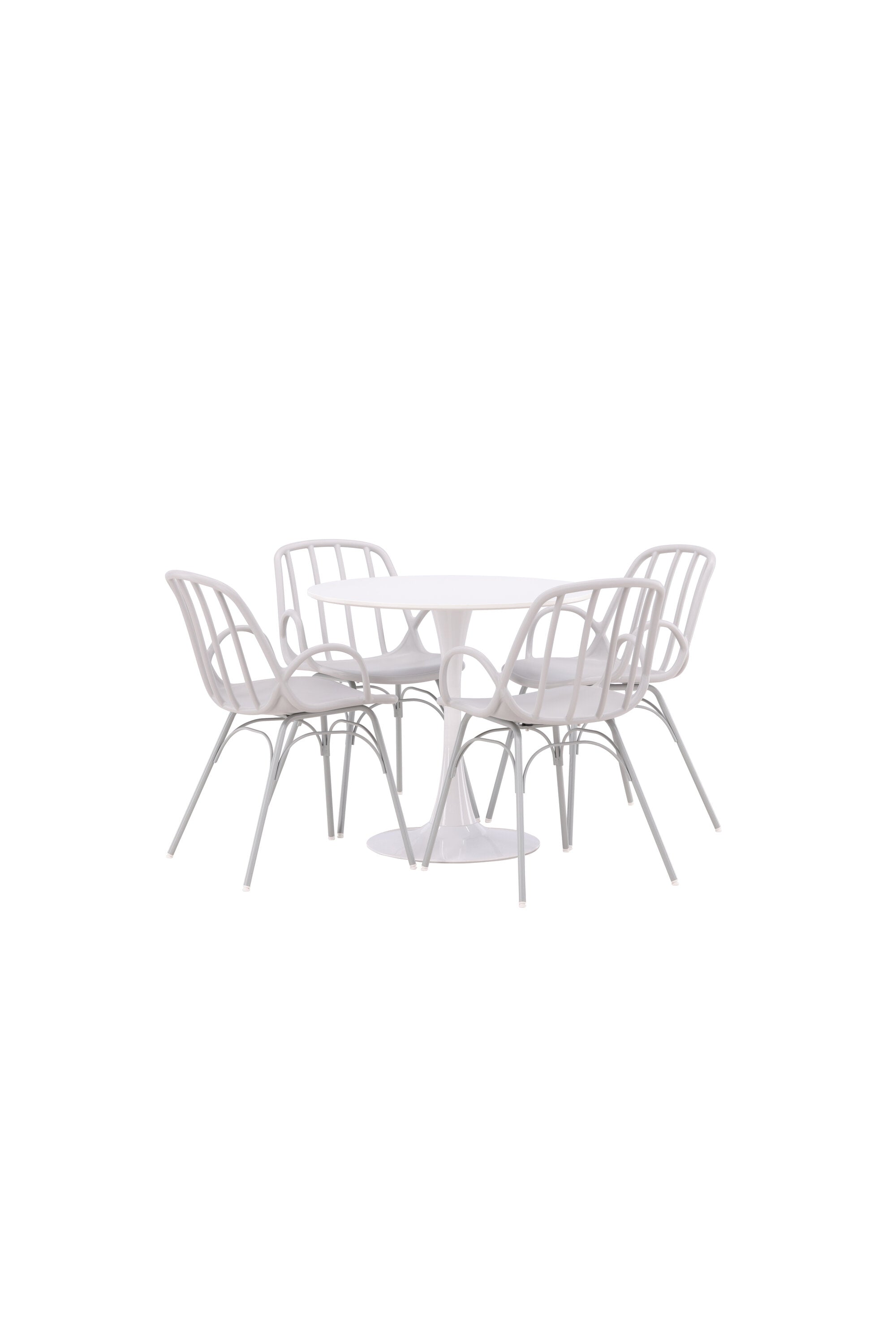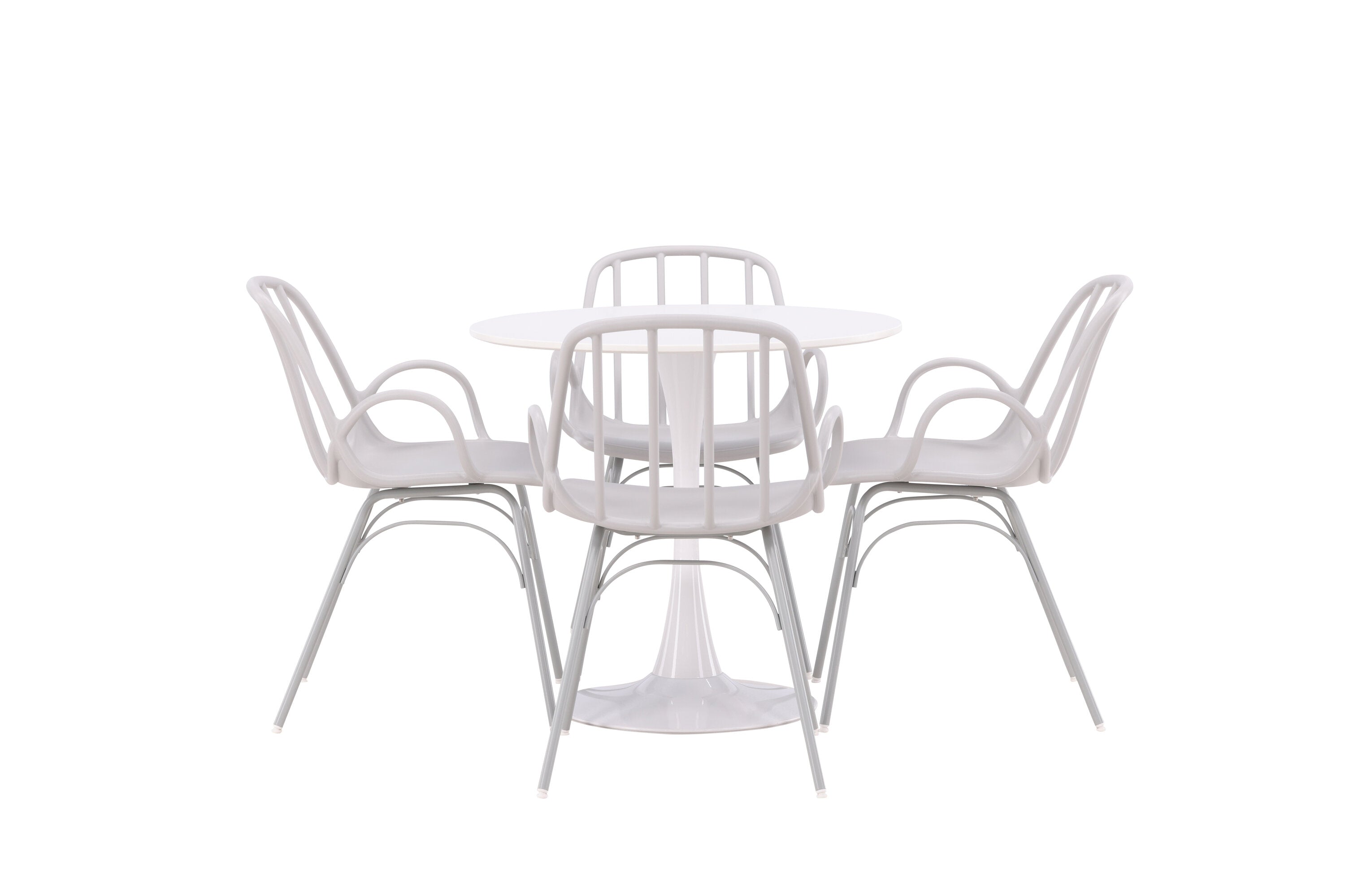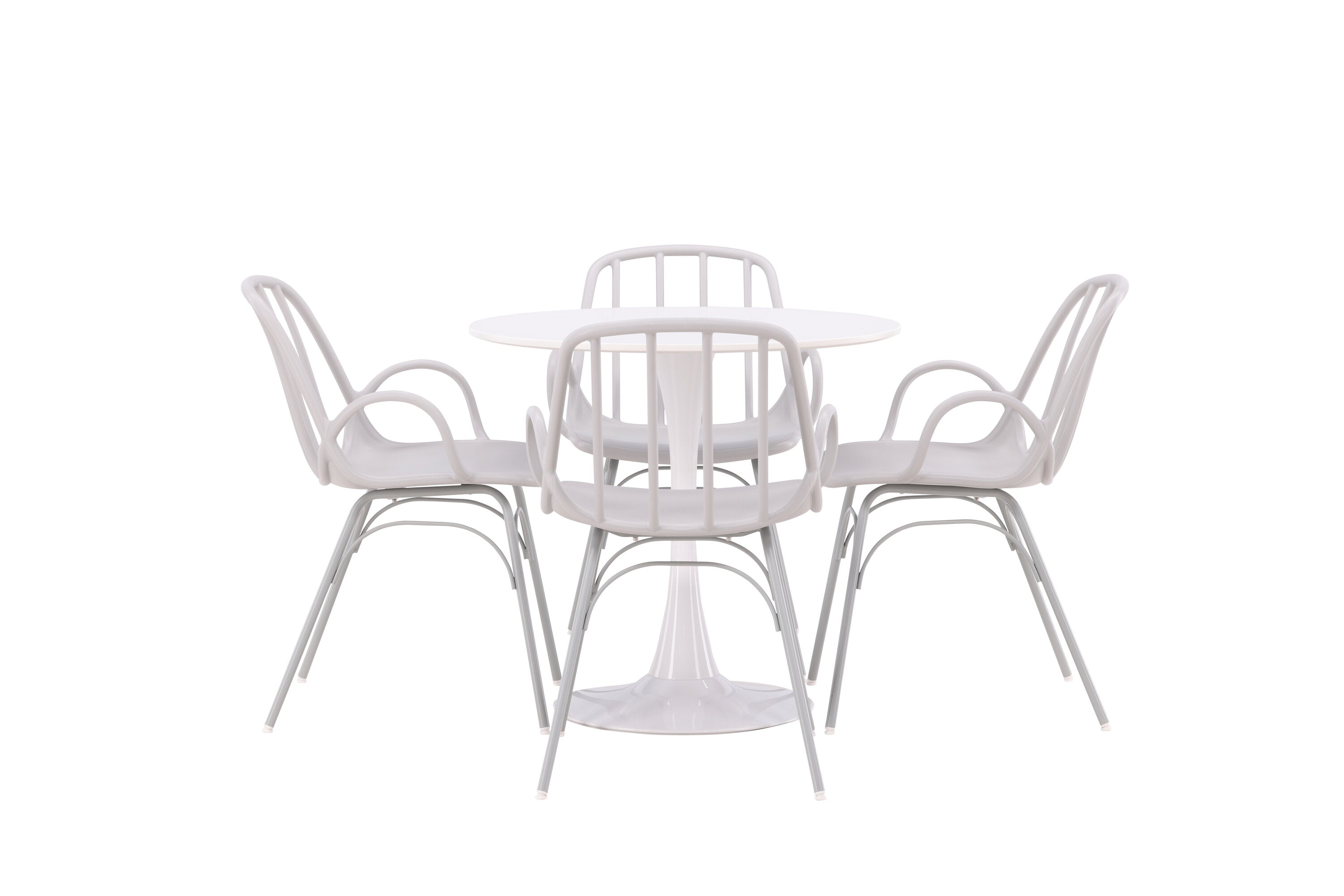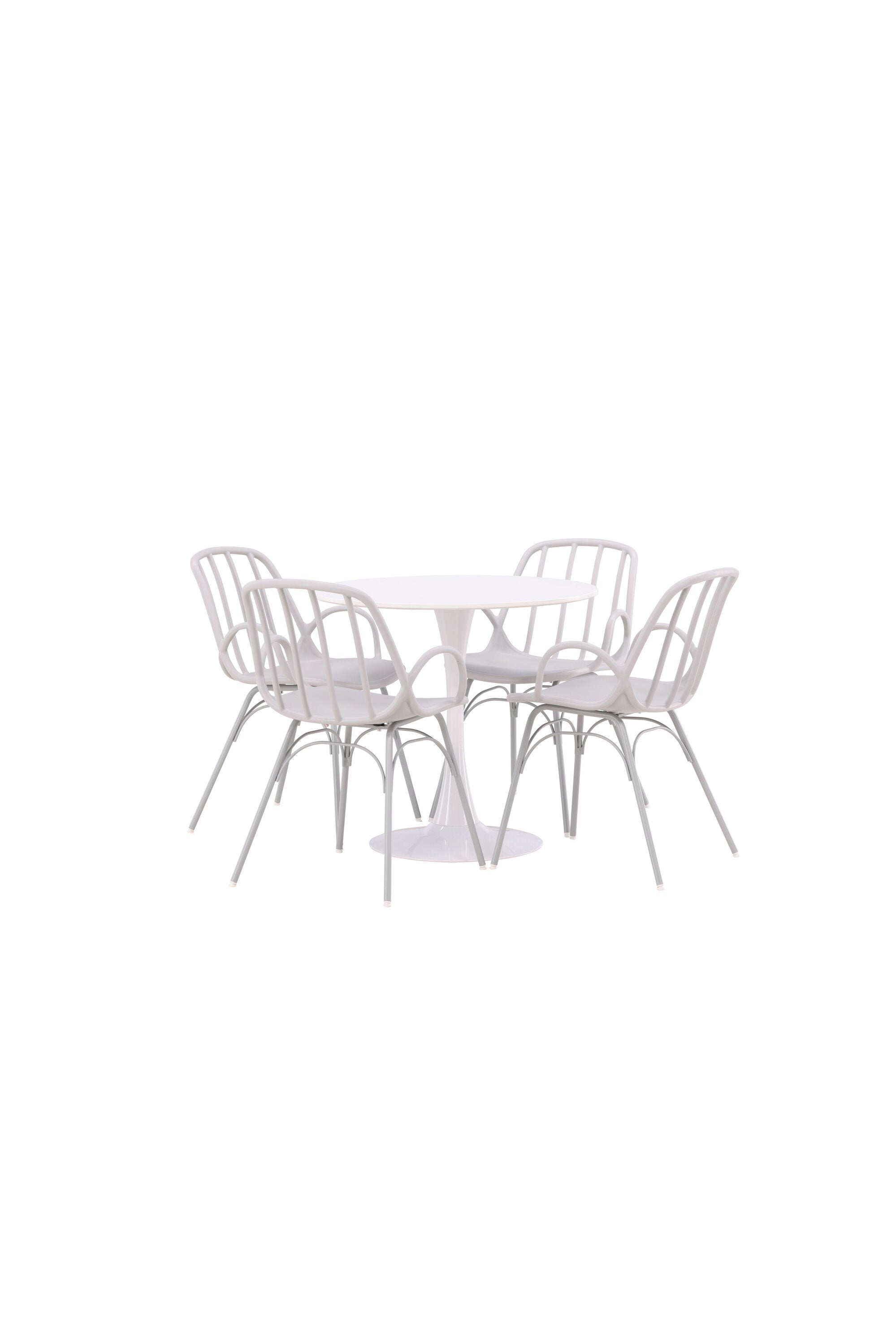 Stůl Hamden má výšku 75 cm a průměr 80 ​​cm, díky čemuž je kompaktní a všestranný. Bílá stolní deska poskytuje jasný a svěží pocit, zatímco šedé židle Dyrön dodávají jemný kontrast a přispívají k nadčasové estetice.