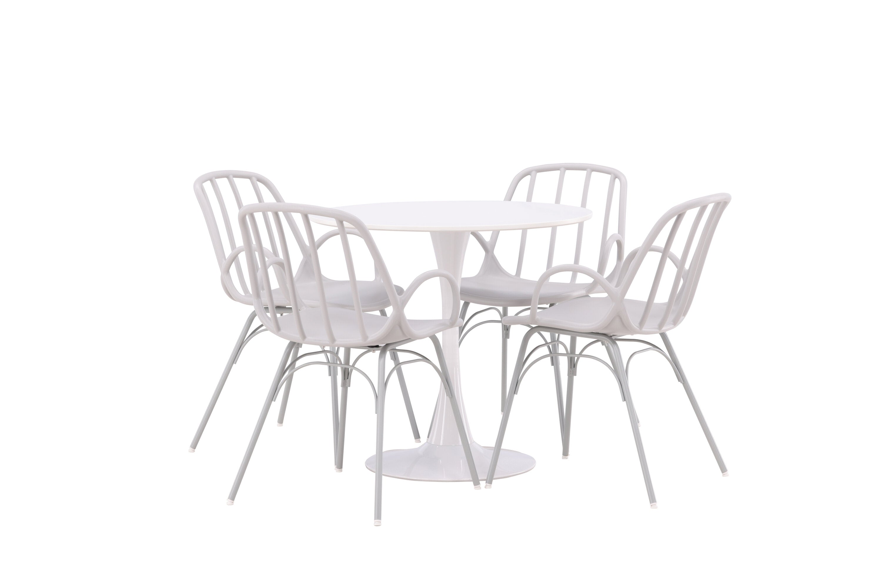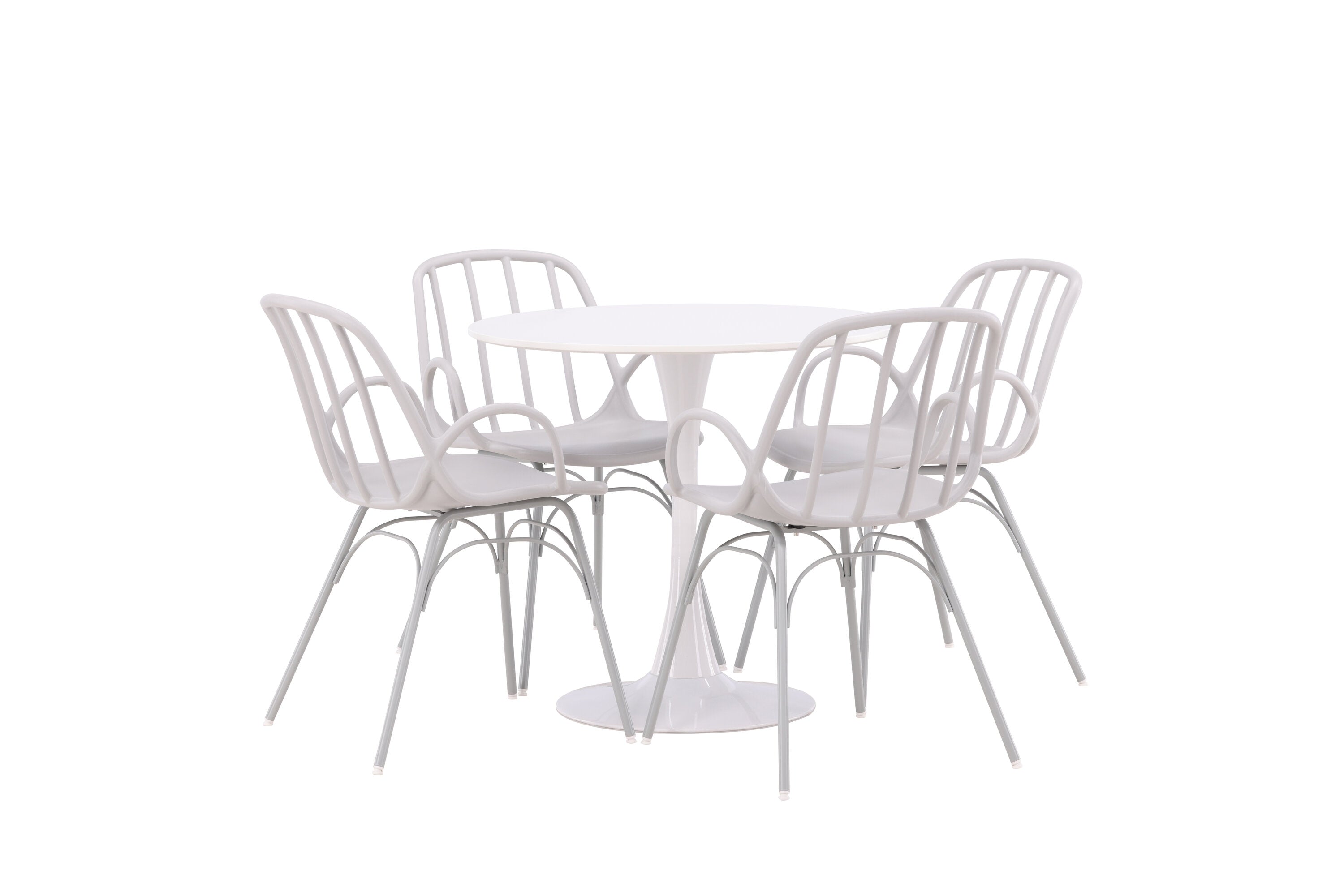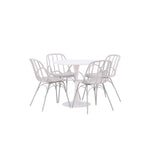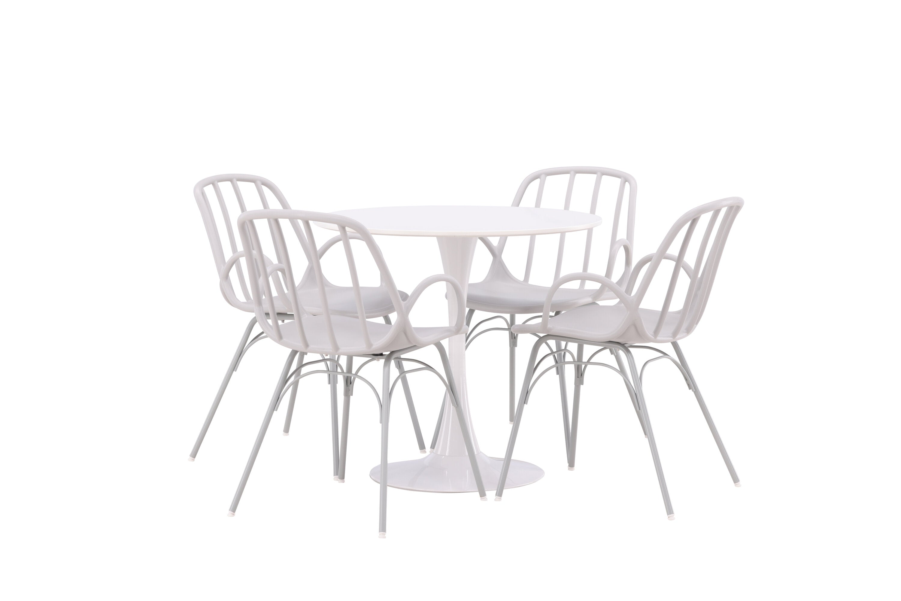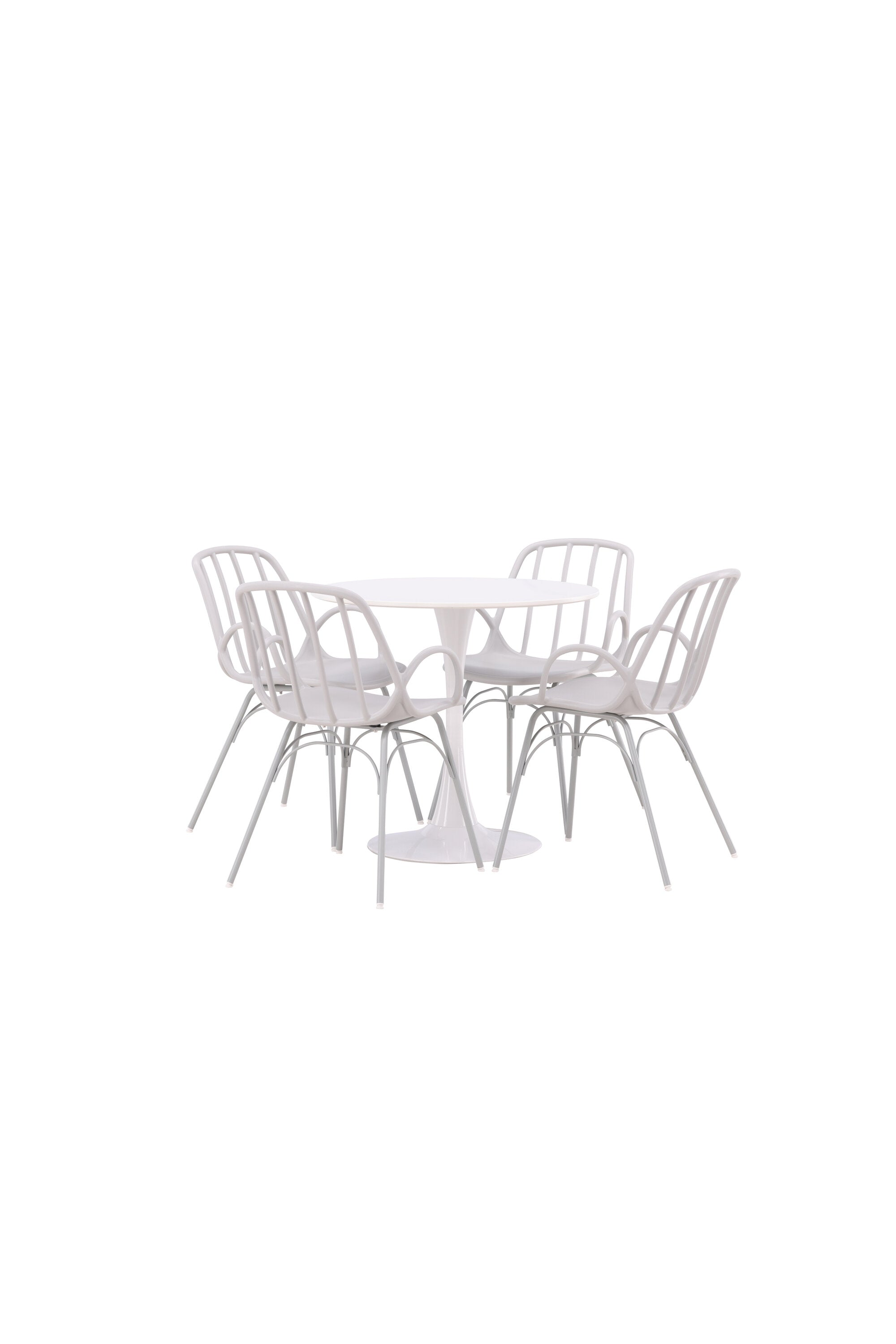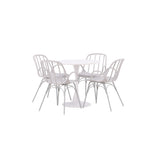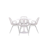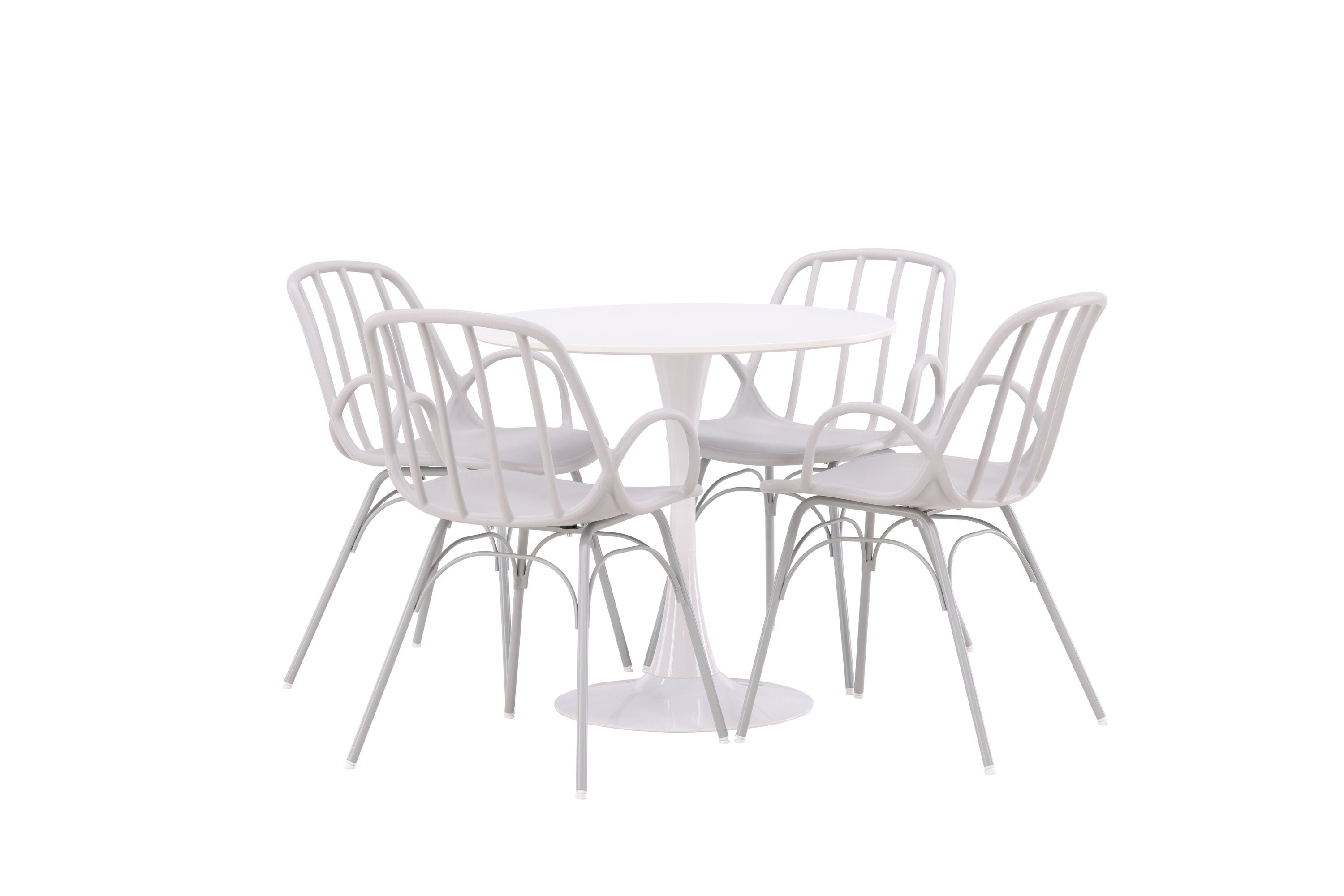 Stůl Hamden má výšku 75 cm a průměr 80 ​​cm, díky čemuž je kompaktní a všestranný. Bílá stolní deska poskytuje jasný a svěží pocit, zatímco šedé židle Dyrön dodávají jemný kontrast a přispívají k nadčasové estetice.