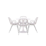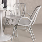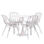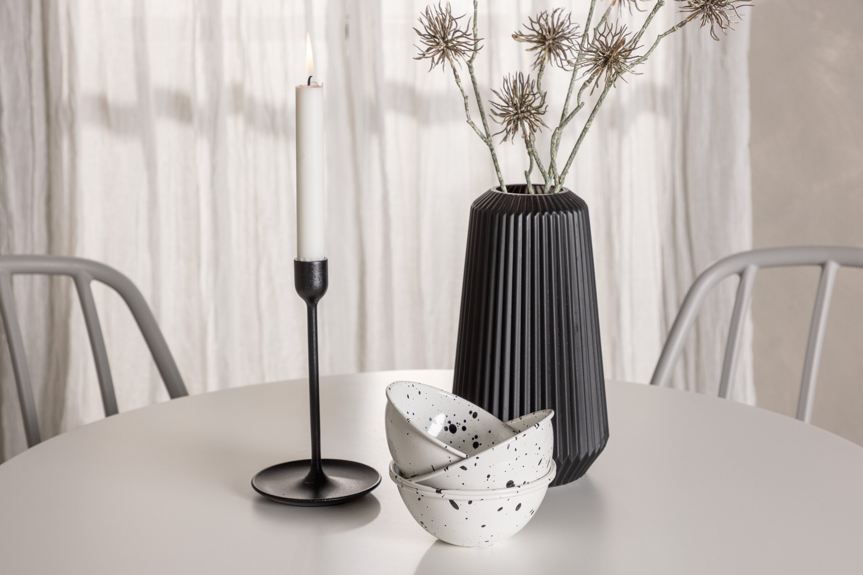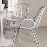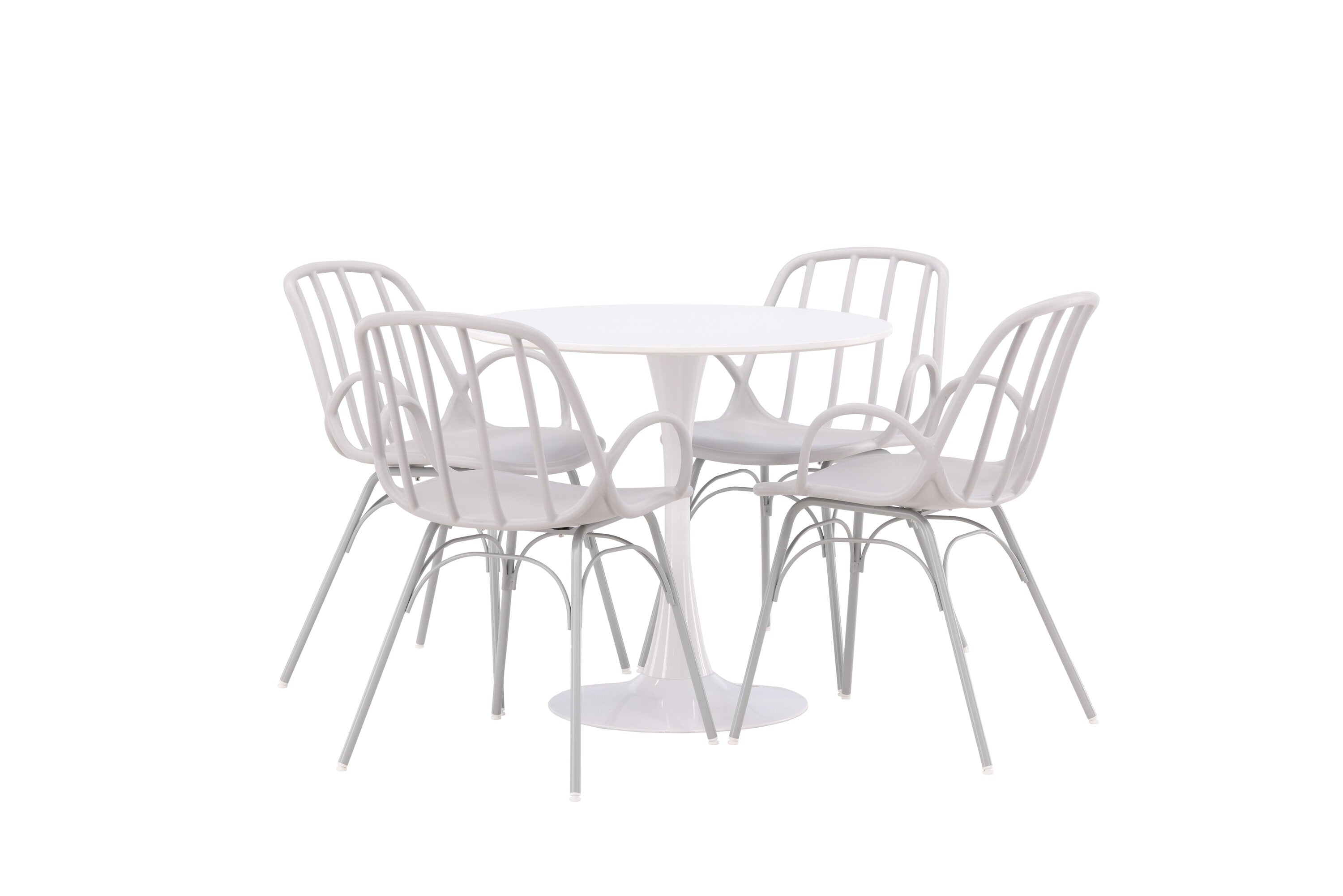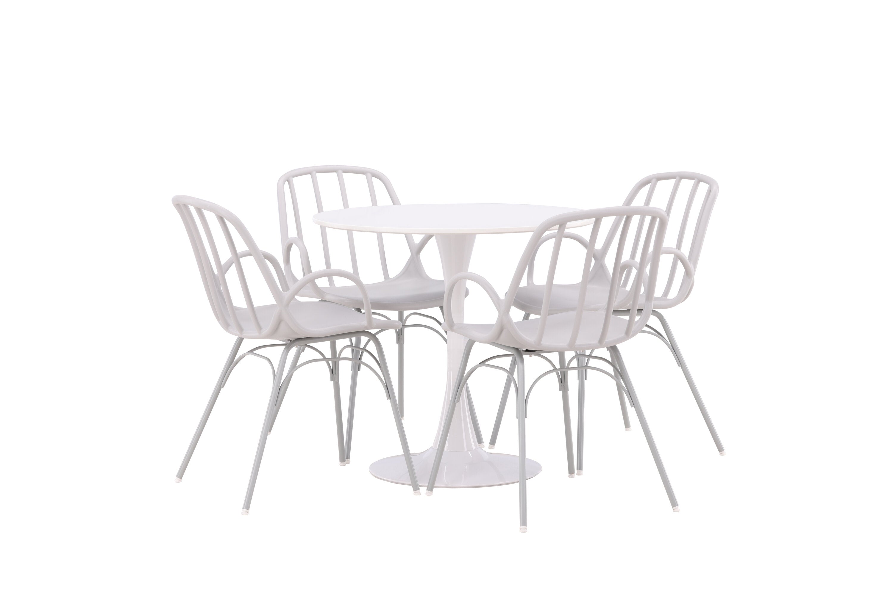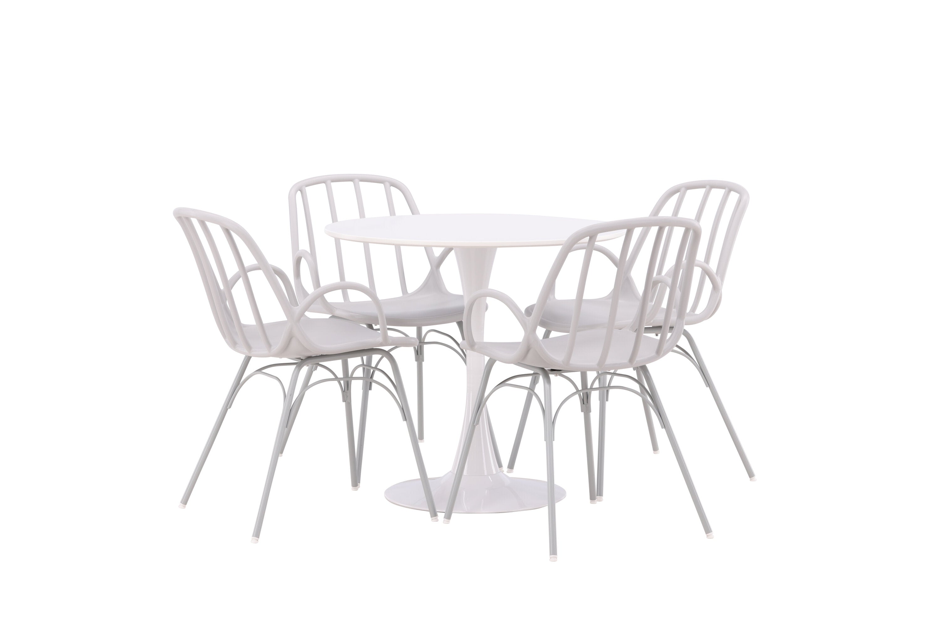 Stůl Hamden má výšku 75 cm a průměr 80 ​​cm, díky čemuž je kompaktní a všestranný. Bílá stolní deska poskytuje jasný a svěží pocit, zatímco šedé židle Dyrön dodávají jemný kontrast a přispívají k nadčasové estetice.