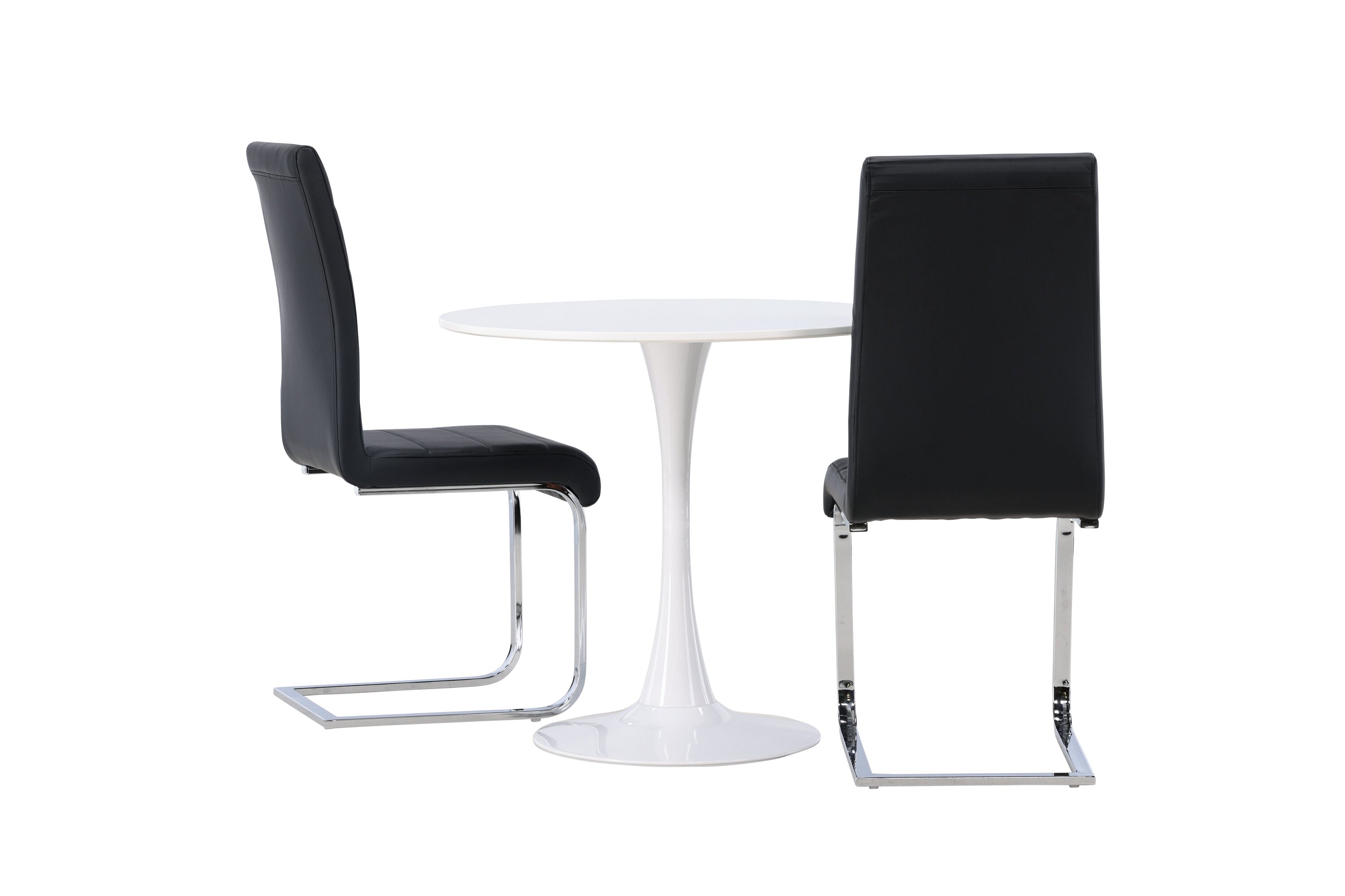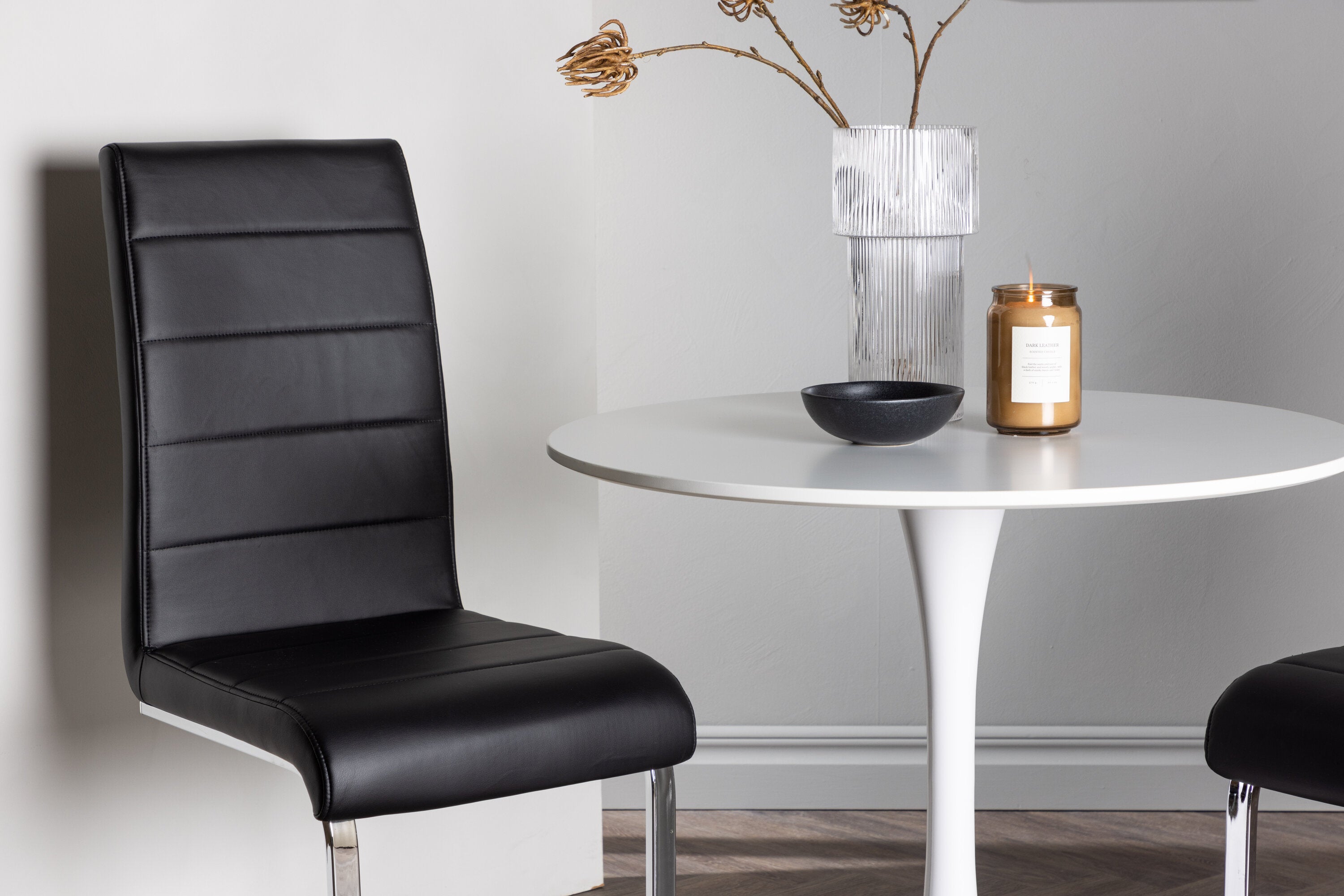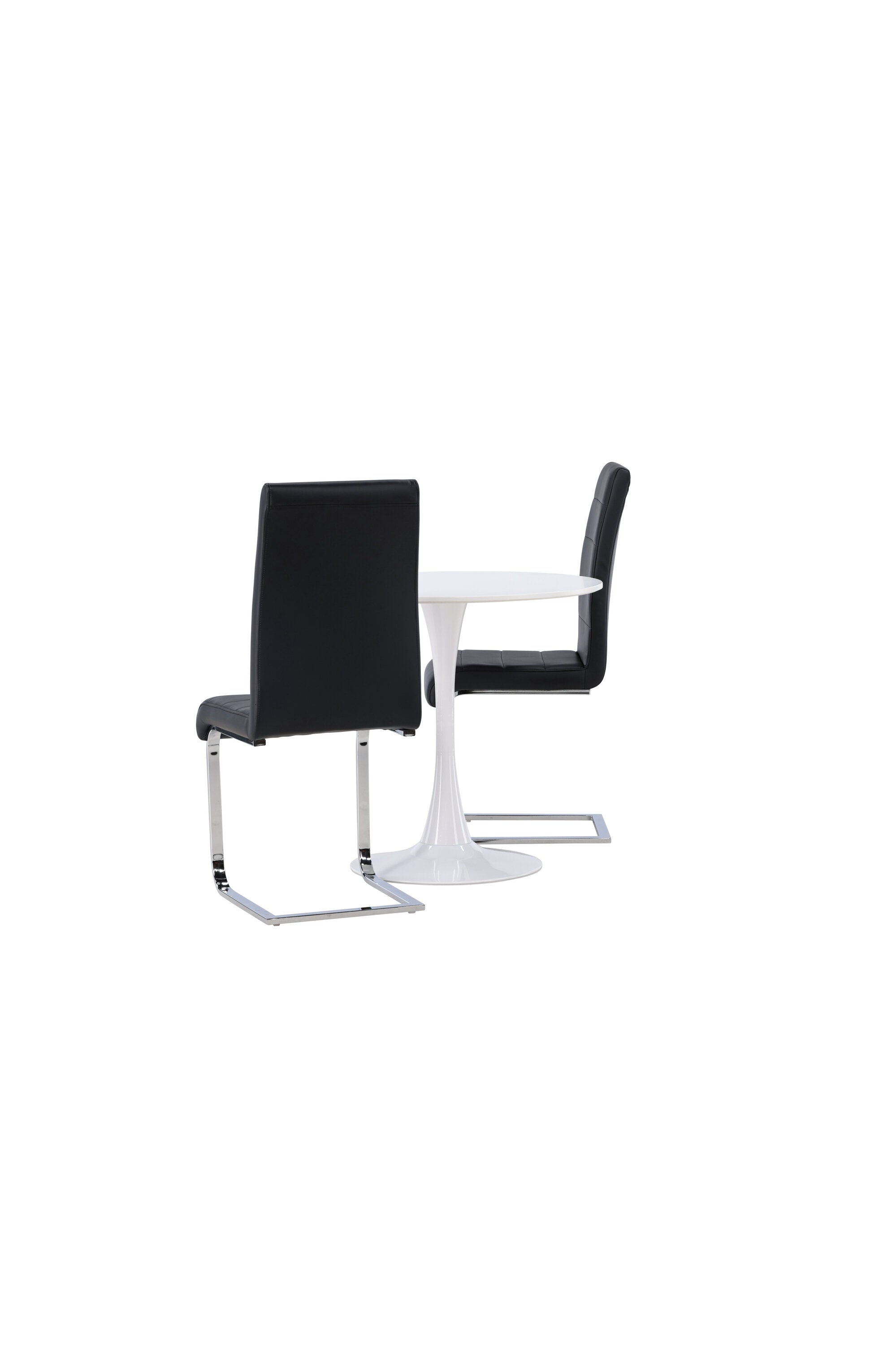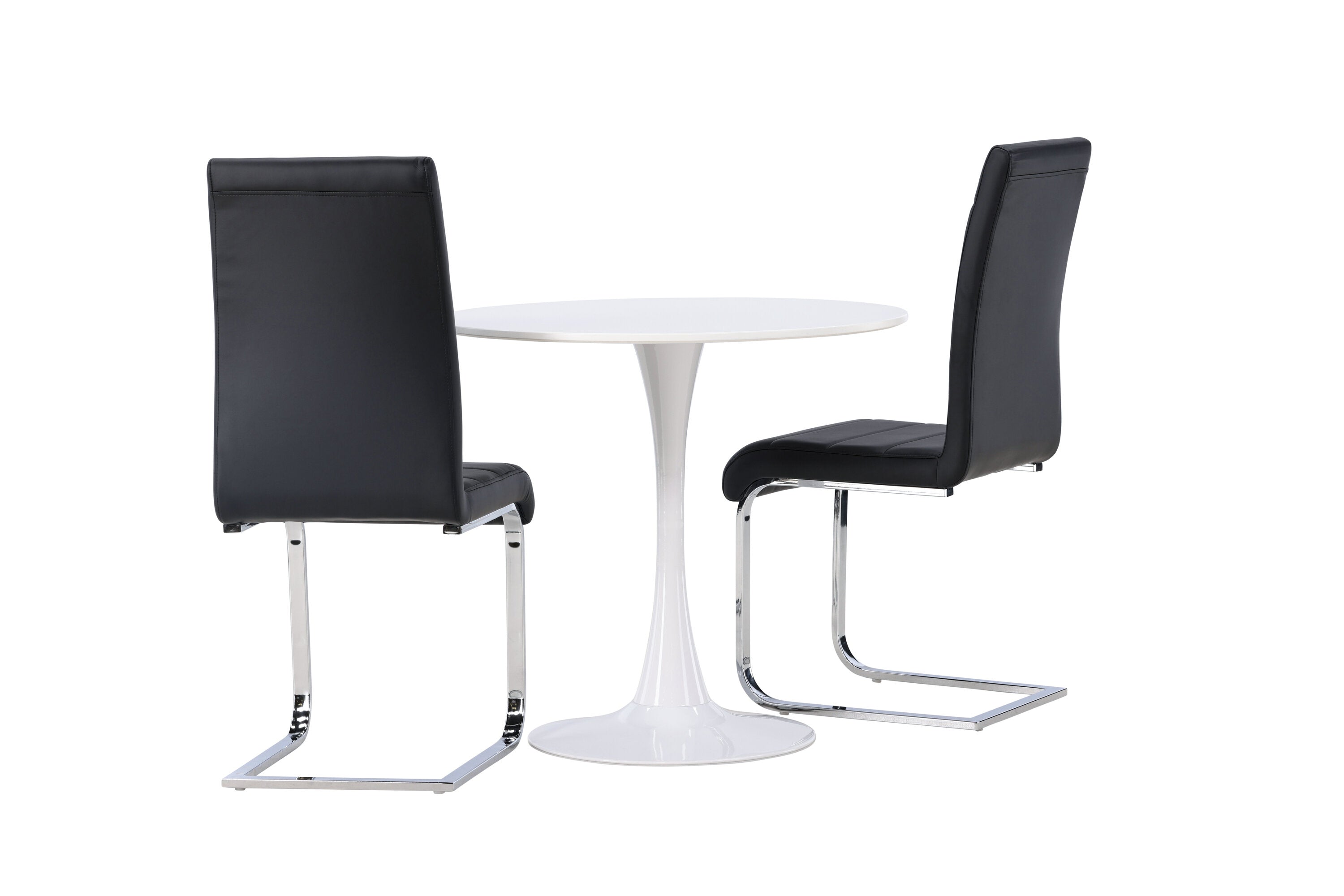 Pěkná kombinace industriálního designu a vysokého komfortu! Kulatý jídelní stůl Hamden má tenkou desku z bílé MDF a stylovou trumpetovou nohu z bílé oceli. Zde společně s našimi velkými černými jídelními židlemi ze série Tempo. Židle má rovné opěradlo v černém PU s ozdobným prošíváním a nohy jsou z chromovaného kovu. Perfektní skupina do menší kuchyně! Průměr stolu: 60 cm.