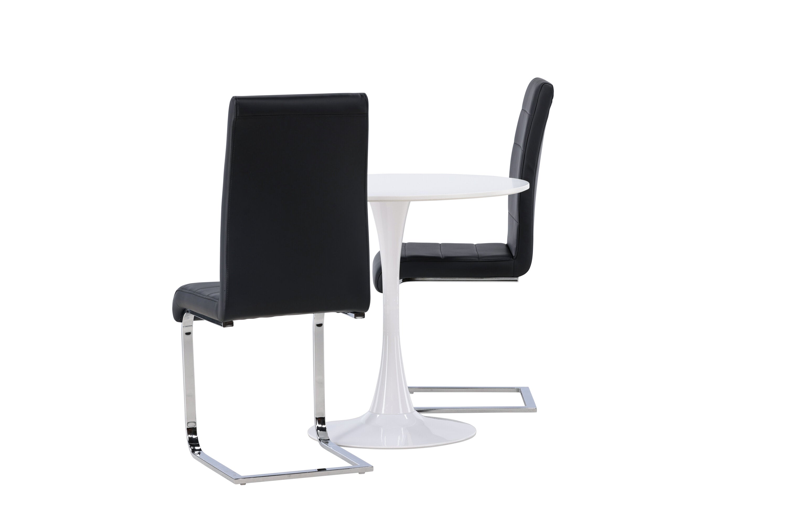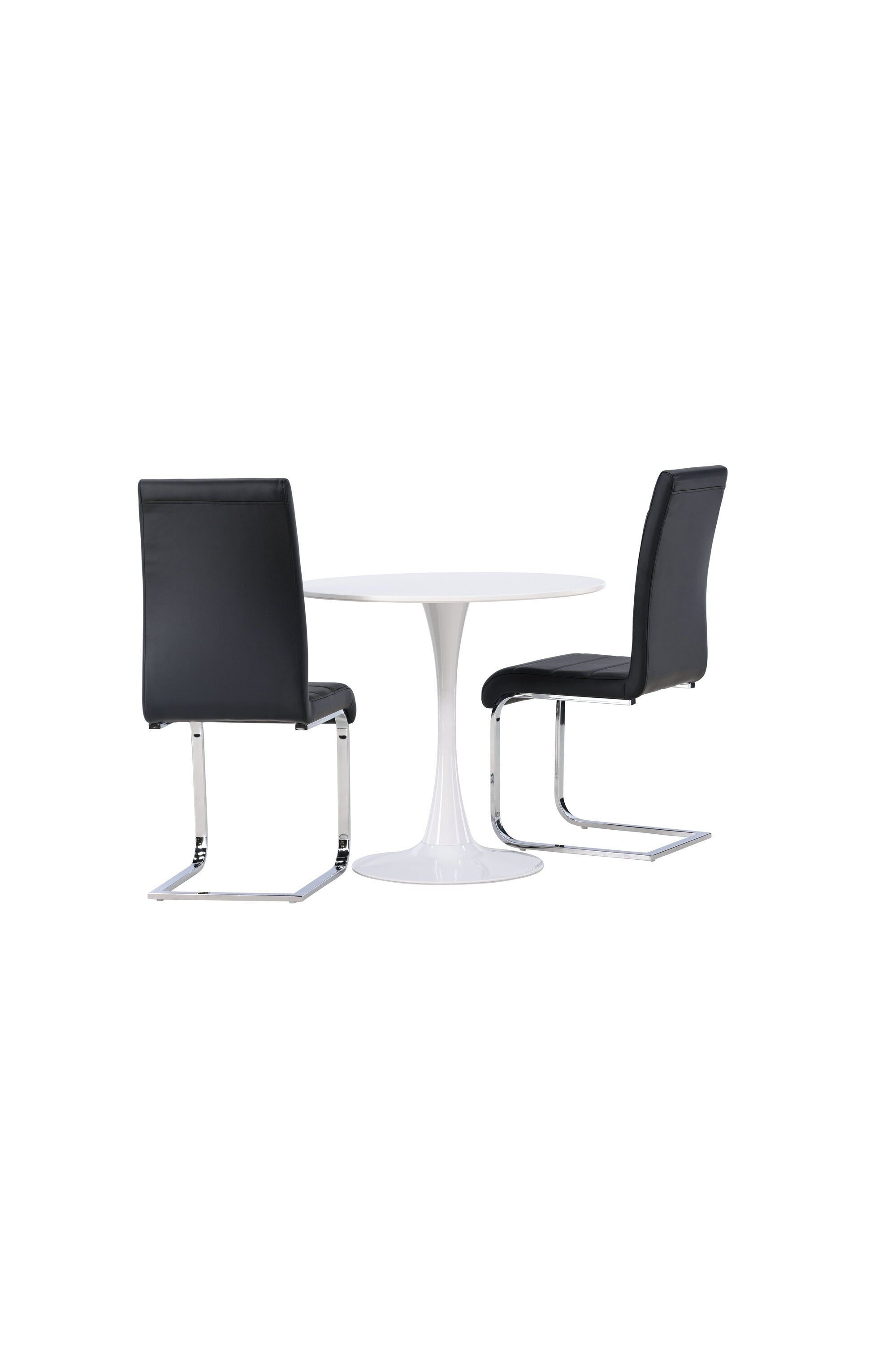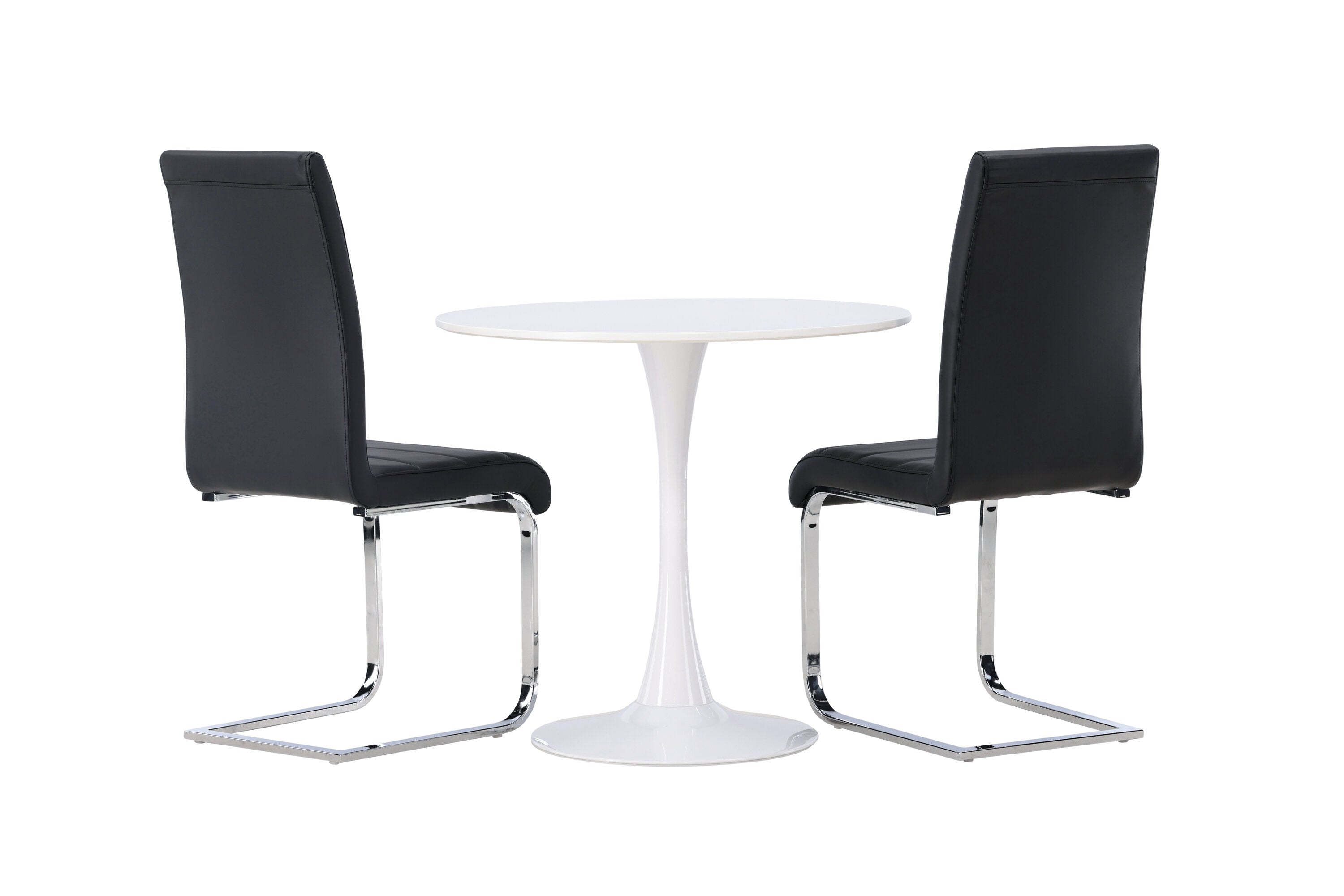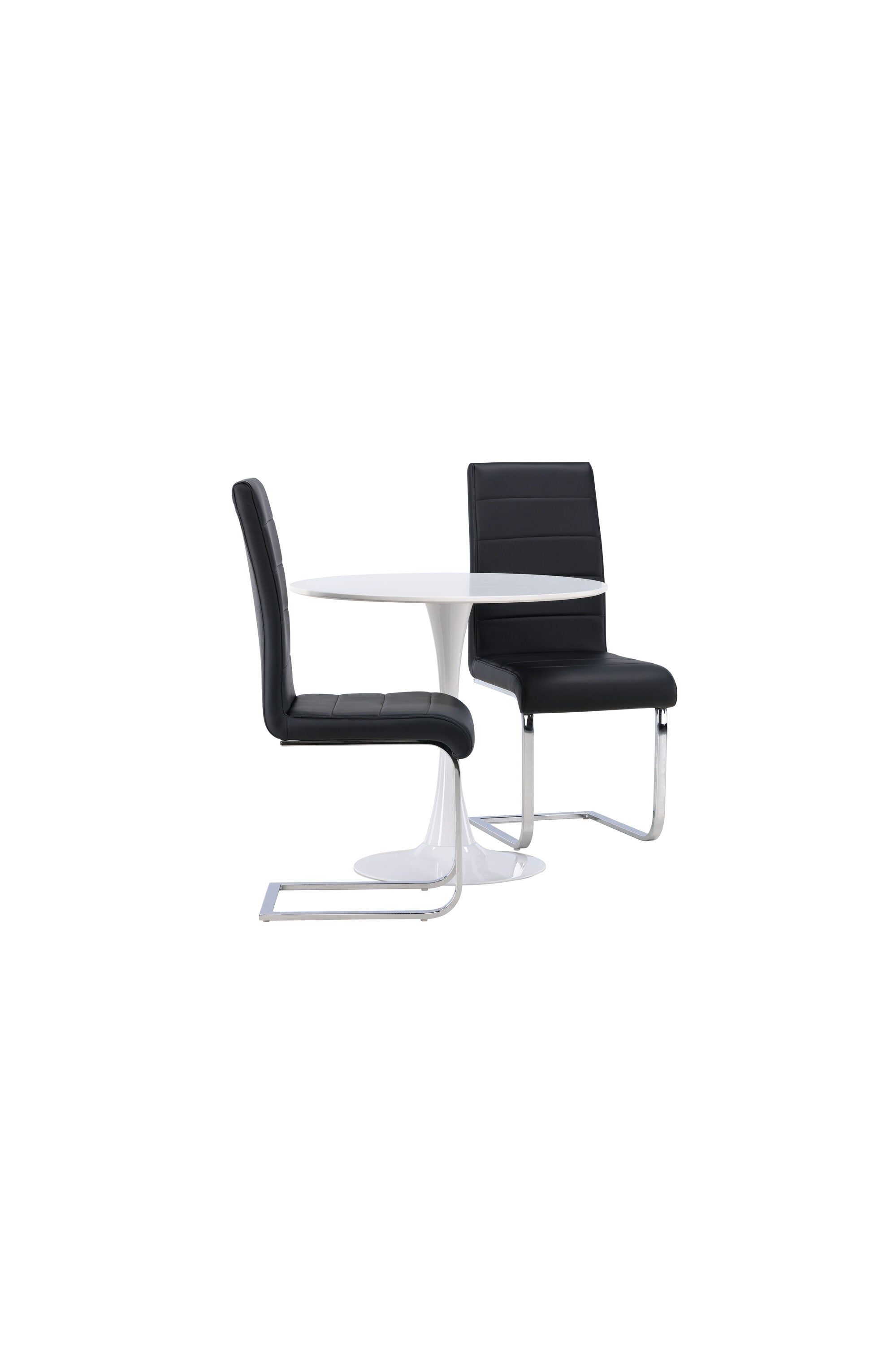 Pěkná kombinace industriálního designu a vysokého komfortu! Kulatý jídelní stůl Hamden má tenkou desku z bílé MDF a stylovou trumpetovou nohu z bílé oceli. Zde společně s našimi velkými černými jídelními židlemi ze série Tempo. Židle má rovné opěradlo v černém PU s ozdobným prošíváním a nohy jsou z chromovaného kovu. Perfektní skupina do menší kuchyně! Průměr stolu: 60 cm.
