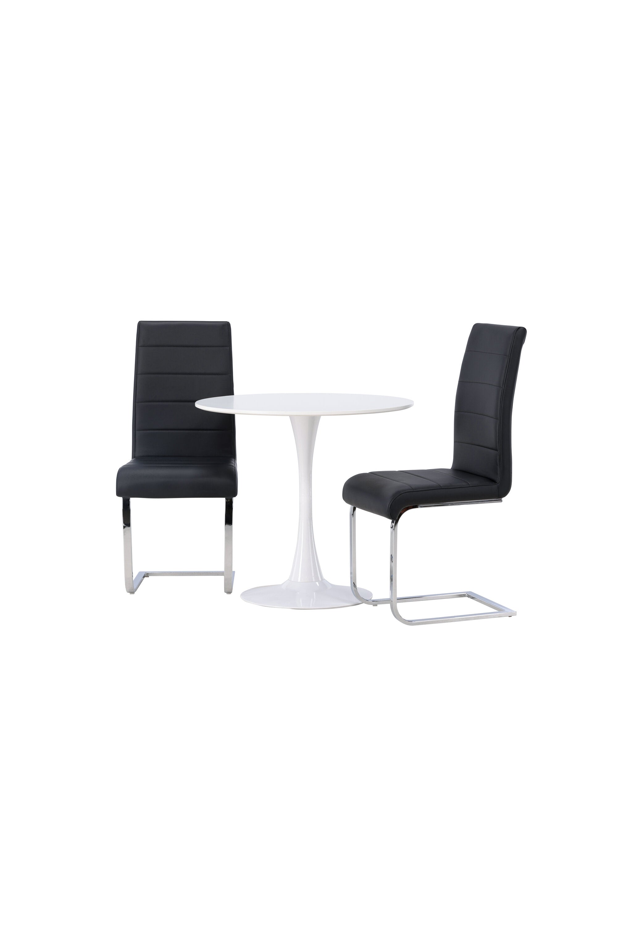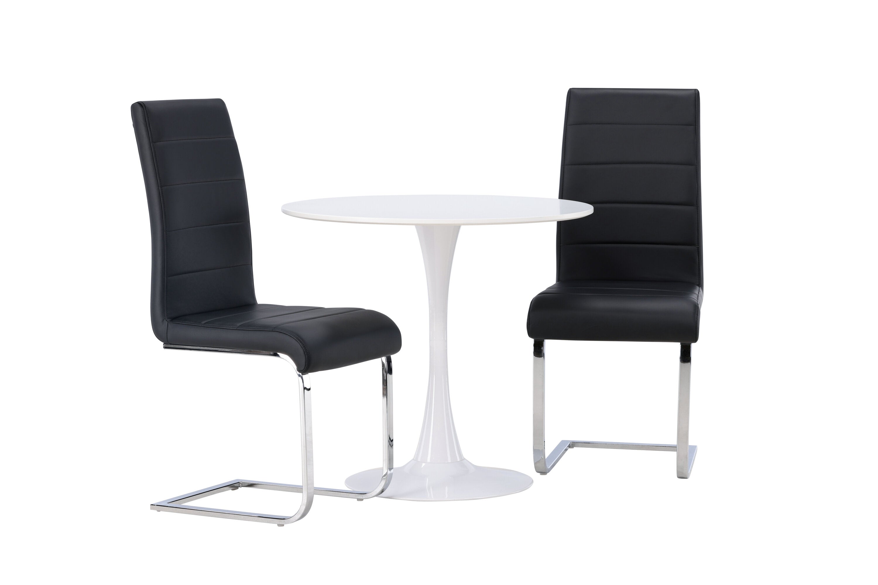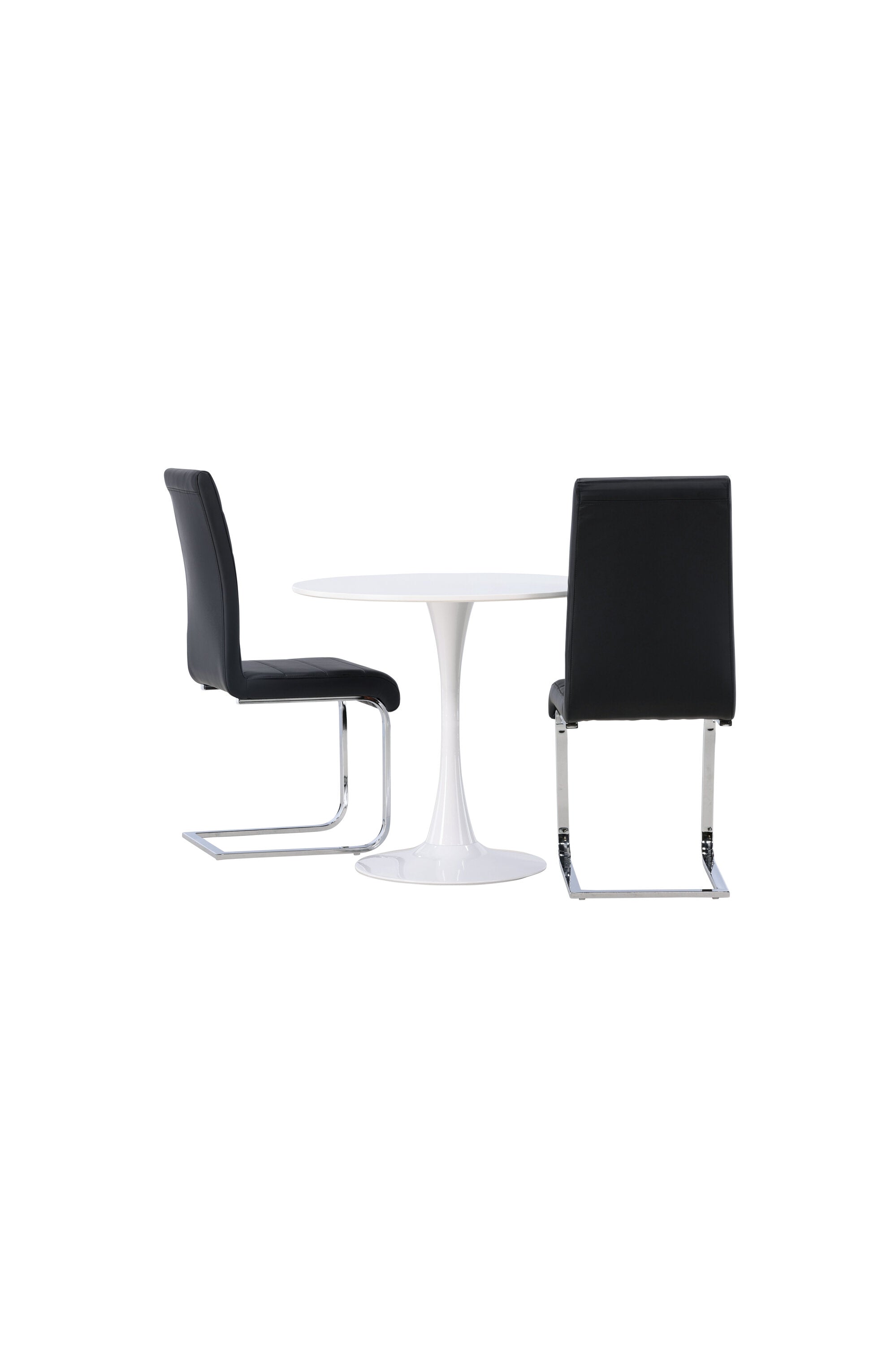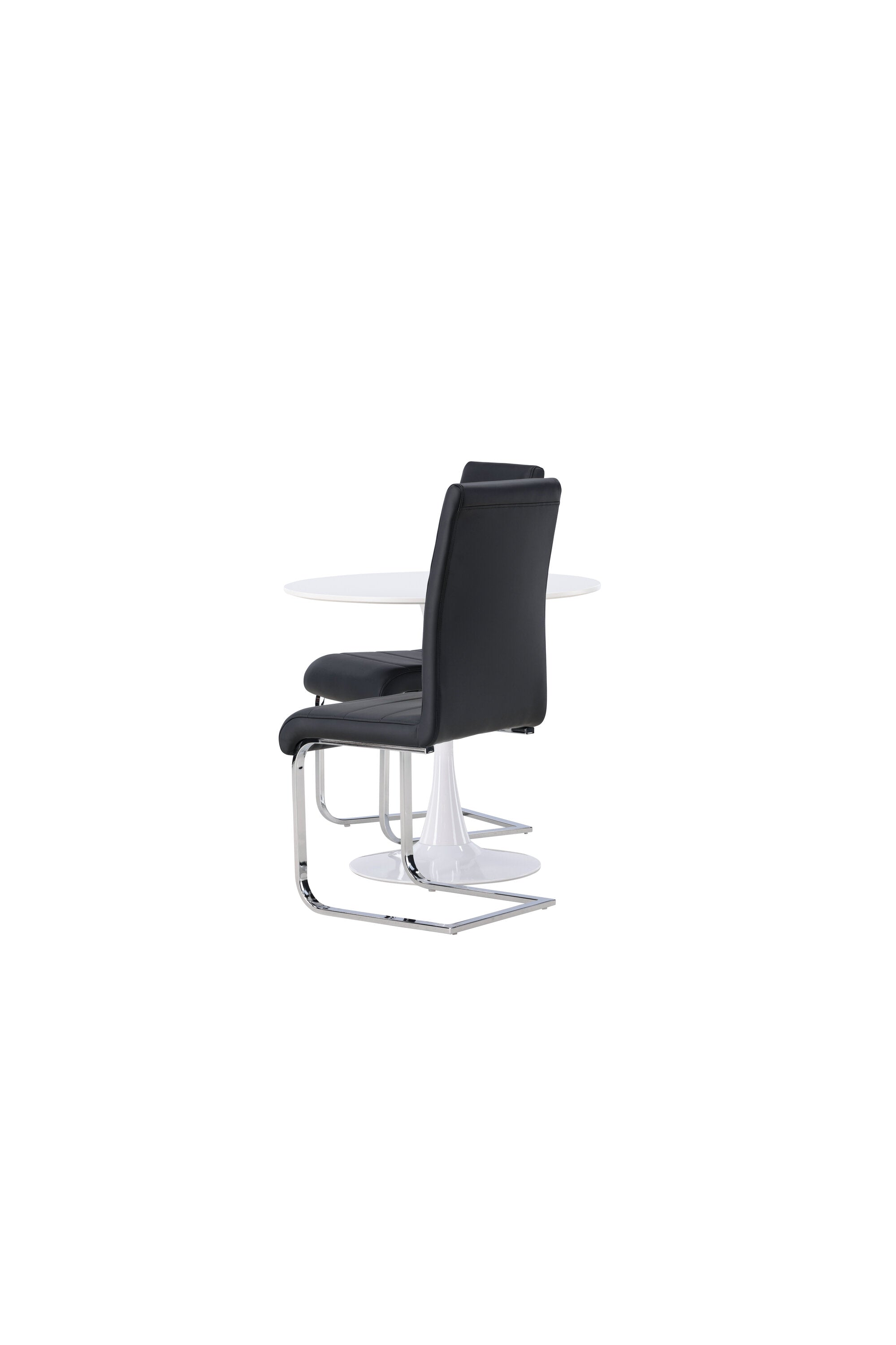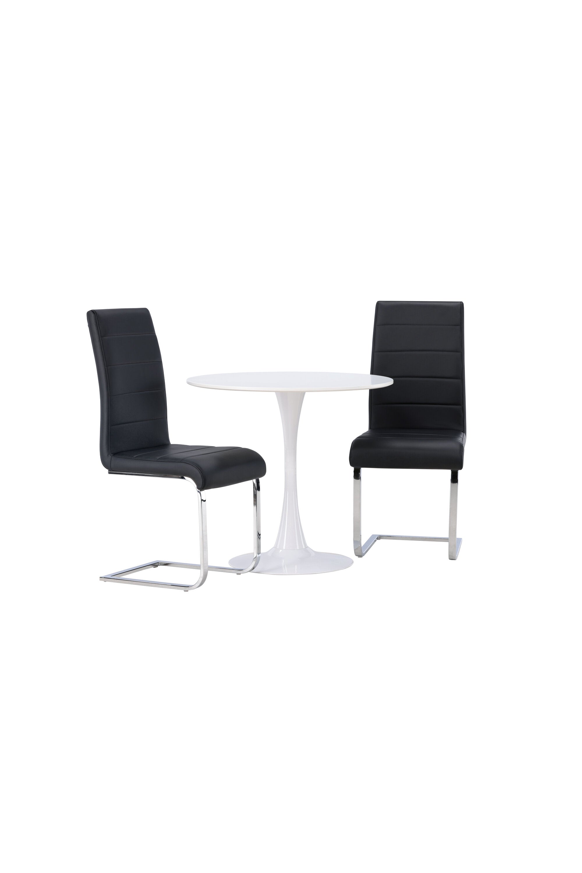 Pěkná kombinace industriálního designu a vysokého komfortu! Kulatý jídelní stůl Hamden má tenkou desku z bílé MDF a stylovou trumpetovou nohu z bílé oceli. Zde společně s našimi velkými černými jídelními židlemi ze série Tempo. Židle má rovné opěradlo v černém PU s ozdobným prošíváním a nohy jsou z chromovaného kovu. Perfektní skupina do menší kuchyně! Průměr stolu: 60 cm.
