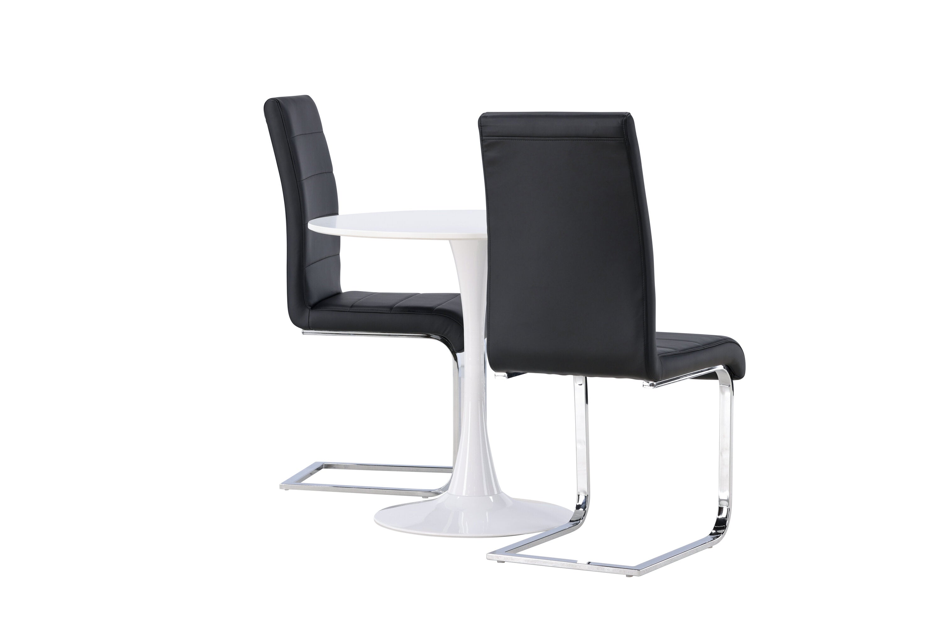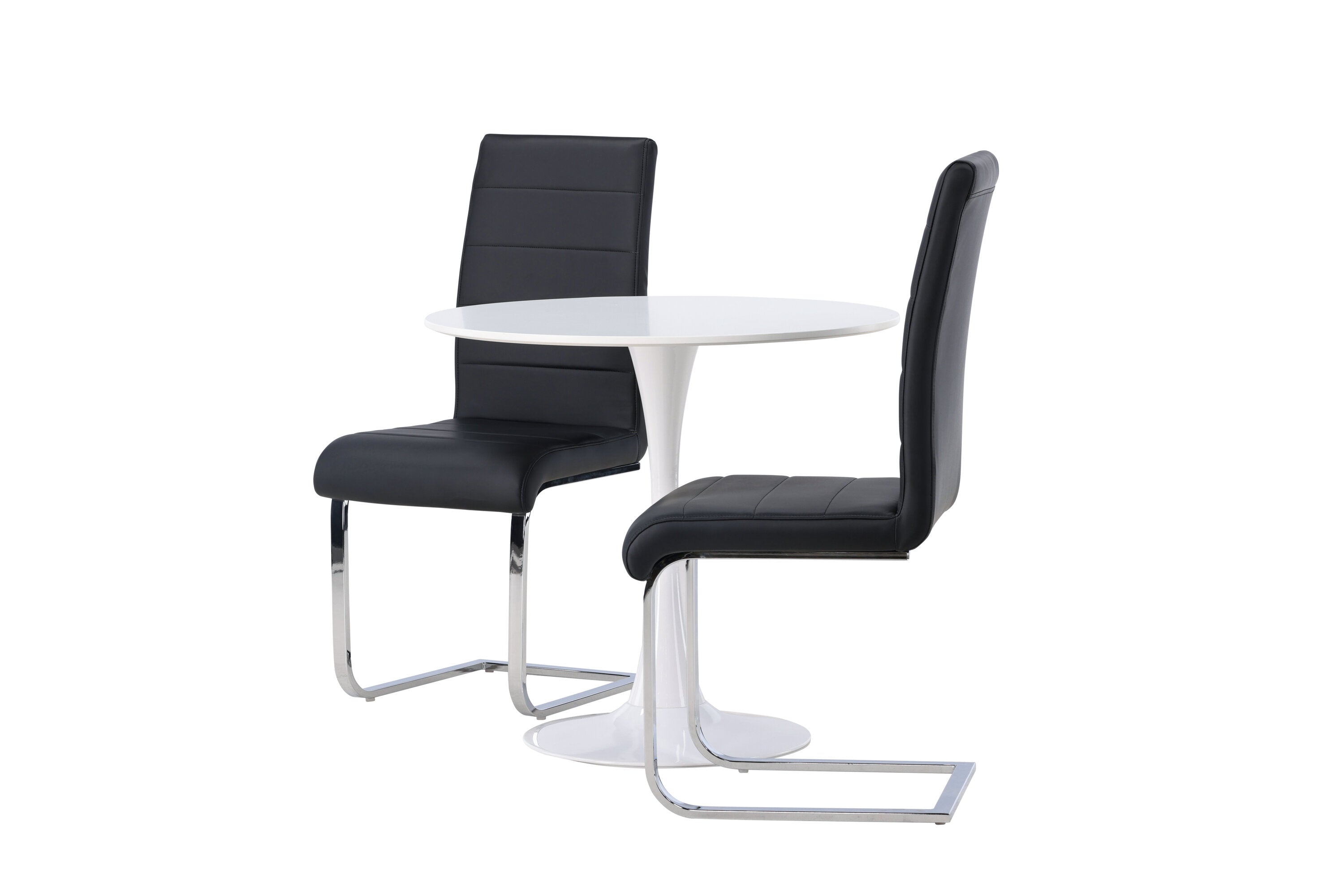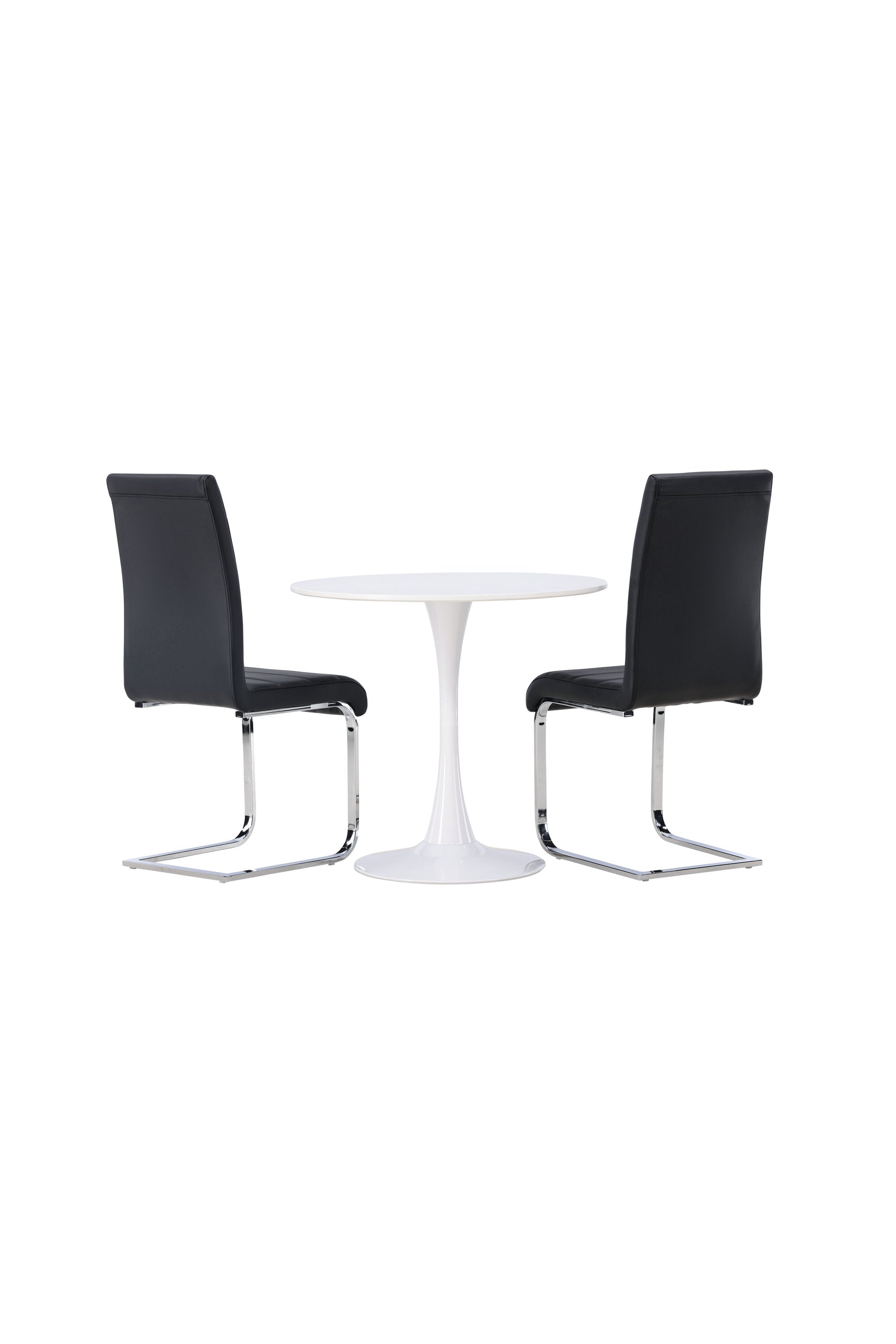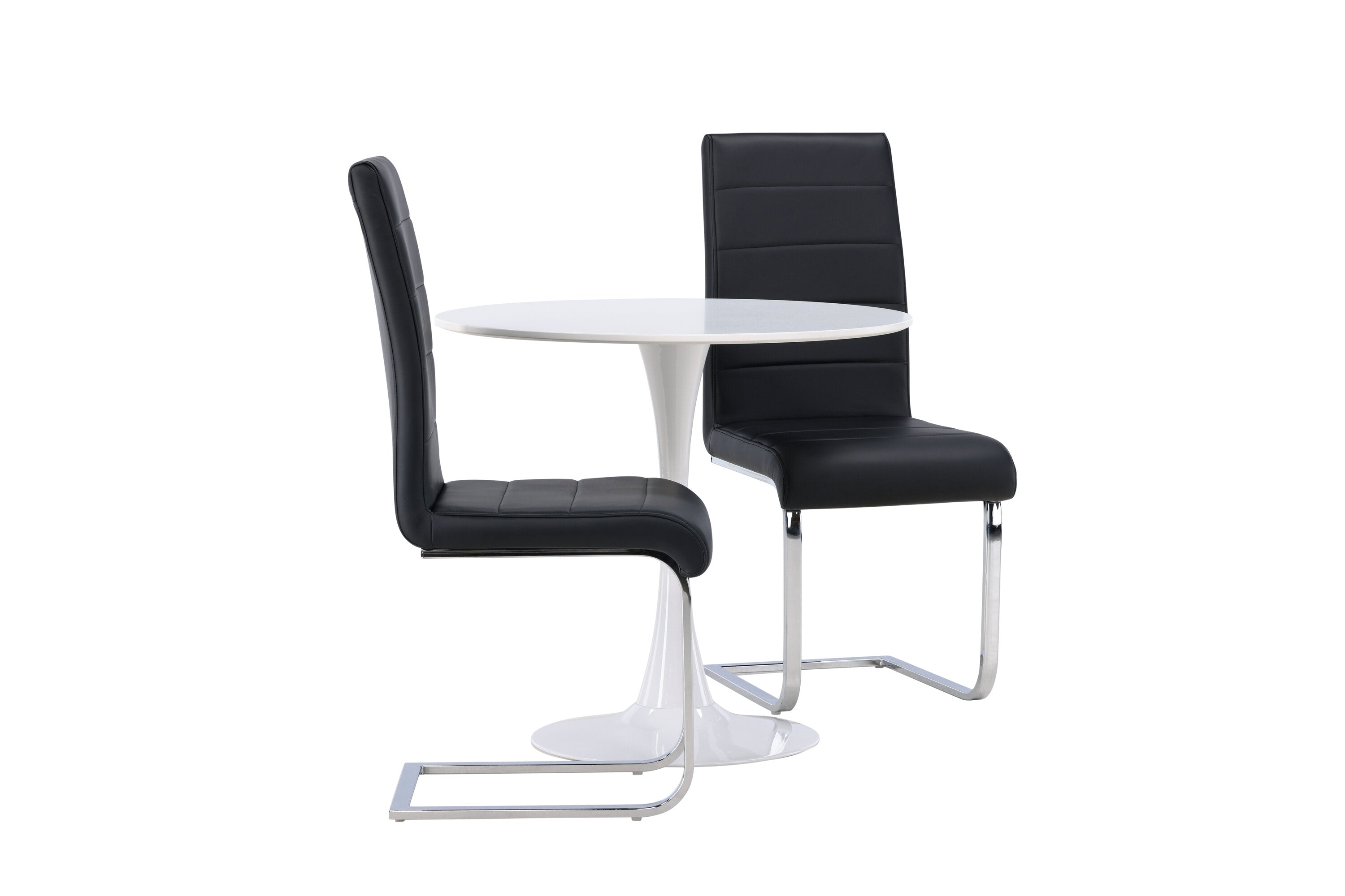 Pěkná kombinace industriálního designu a vysokého komfortu! Kulatý jídelní stůl Hamden má tenkou desku z bílé MDF a stylovou trumpetovou nohu z bílé oceli. Zde společně s našimi velkými černými jídelními židlemi ze série Tempo. Židle má rovné opěradlo v černém PU s ozdobným prošíváním a nohy jsou z chromovaného kovu. Perfektní skupina do menší kuchyně! Průměr stolu: 60 cm.