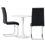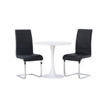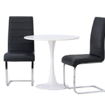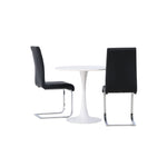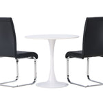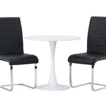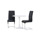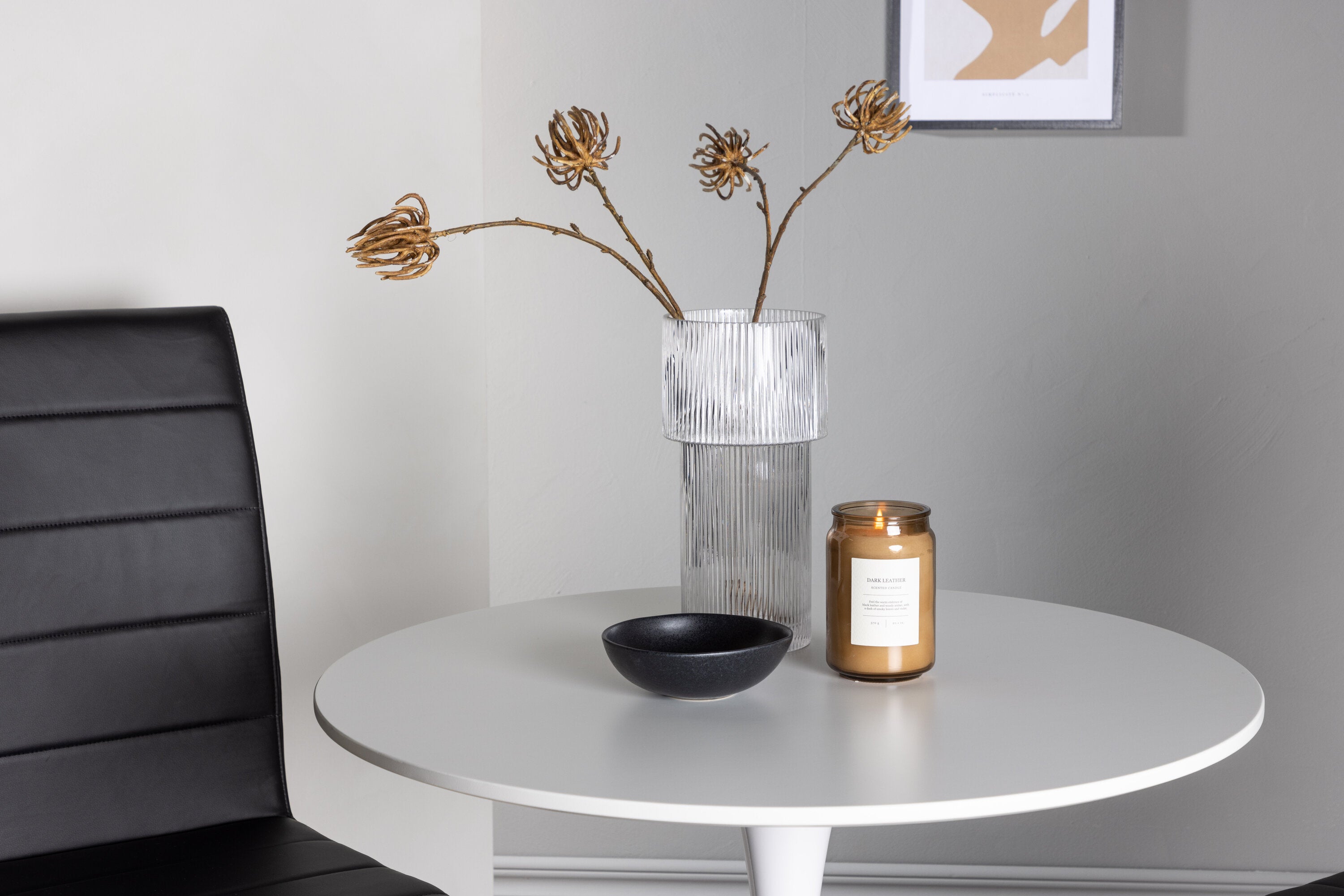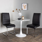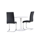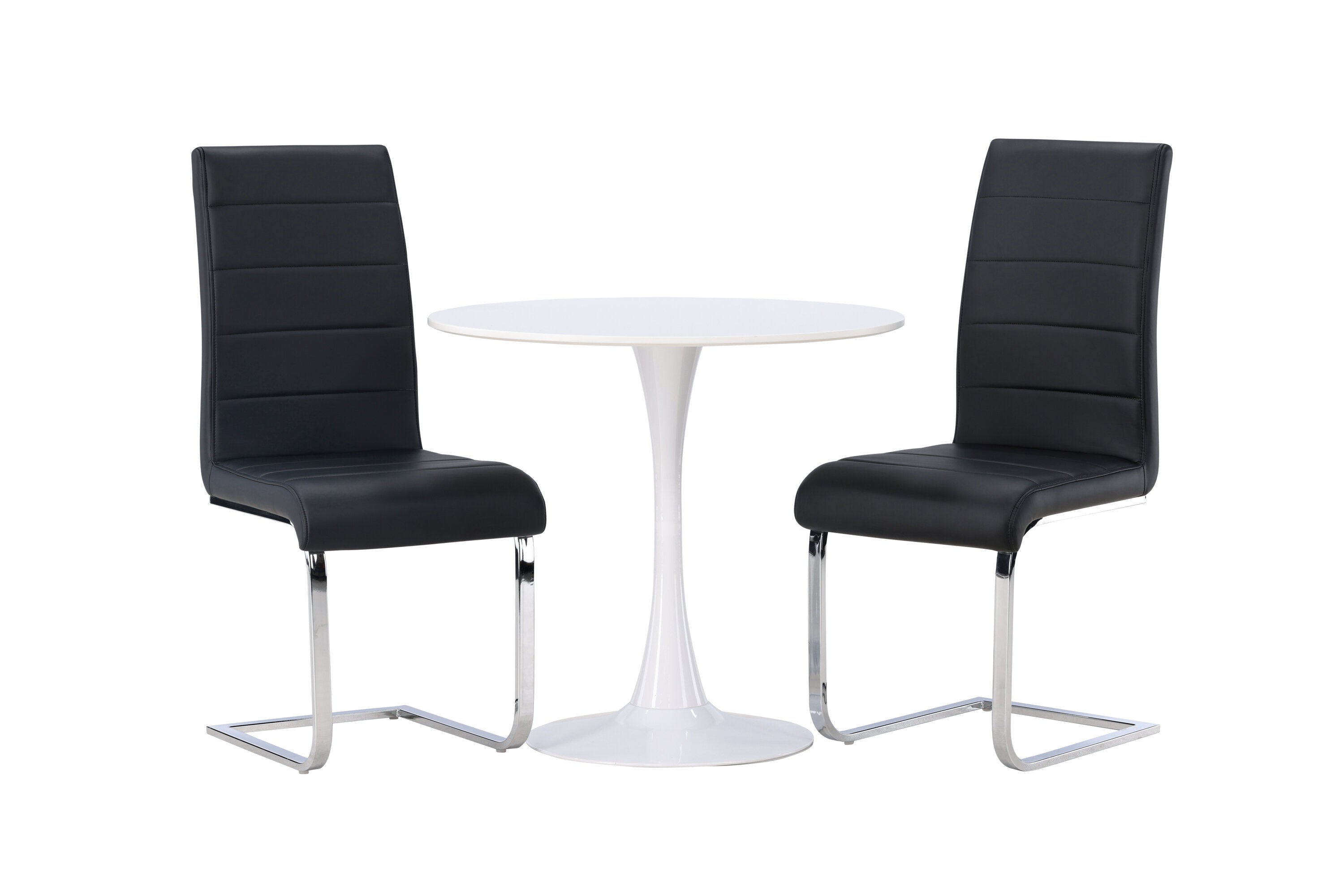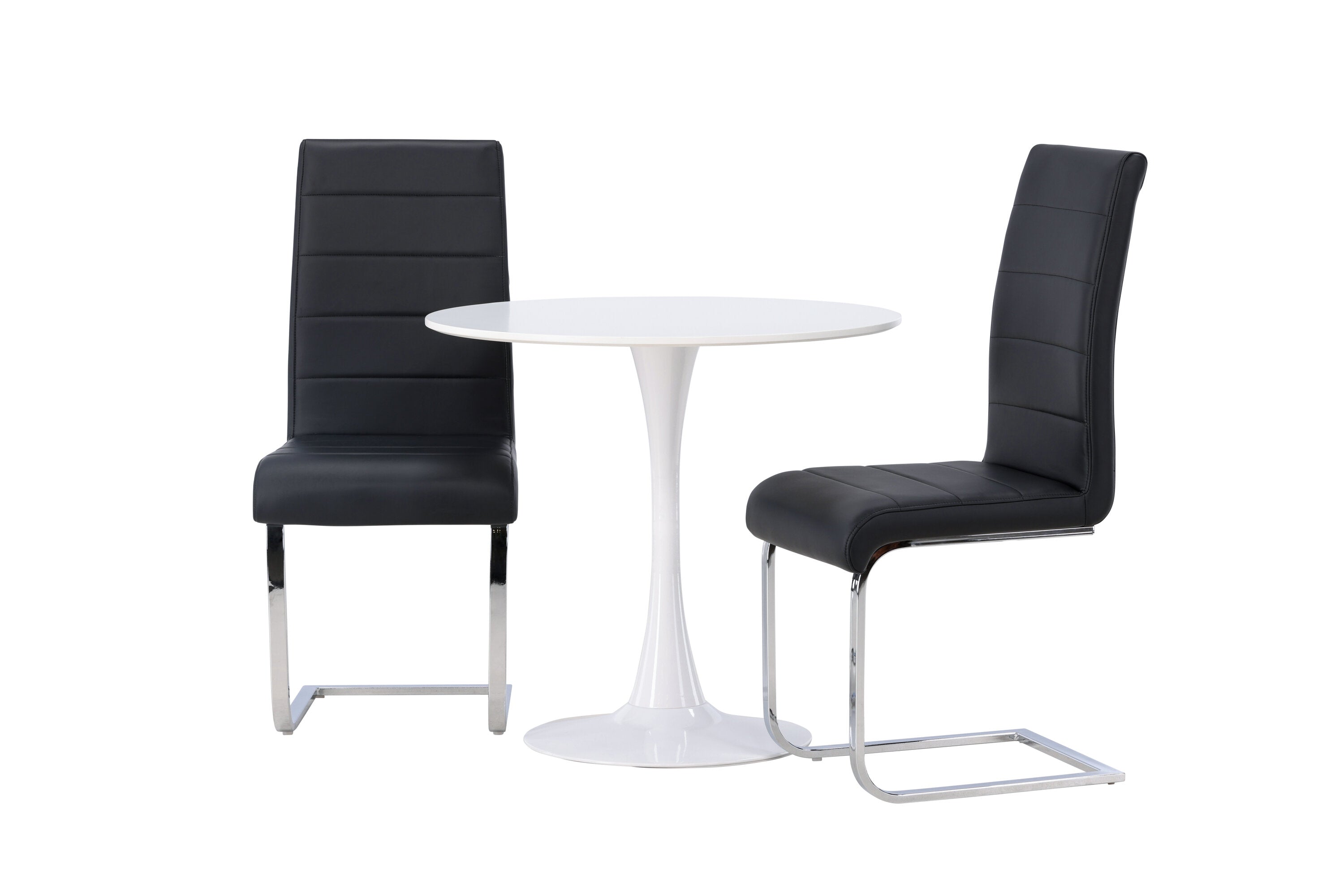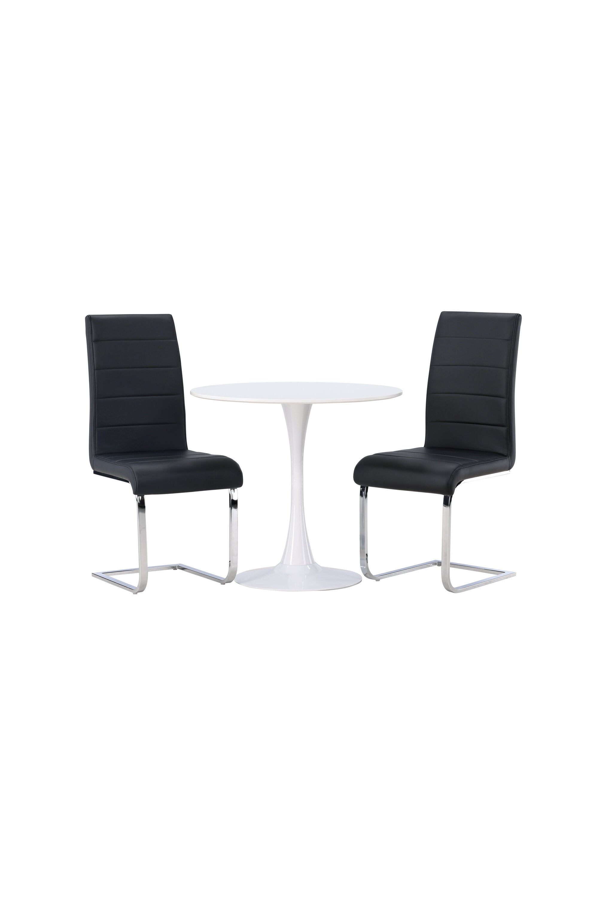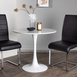 Pěkná kombinace industriálního designu a vysokého komfortu! Kulatý jídelní stůl Hamden má tenkou desku z bílé MDF a stylovou trumpetovou nohu z bílé oceli. Zde společně s našimi velkými černými jídelními židlemi ze série Tempo. Židle má rovné opěradlo v černém PU s ozdobným prošíváním a nohy jsou z chromovaného kovu. Perfektní skupina do menší kuchyně! Průměr stolu: 60 cm.