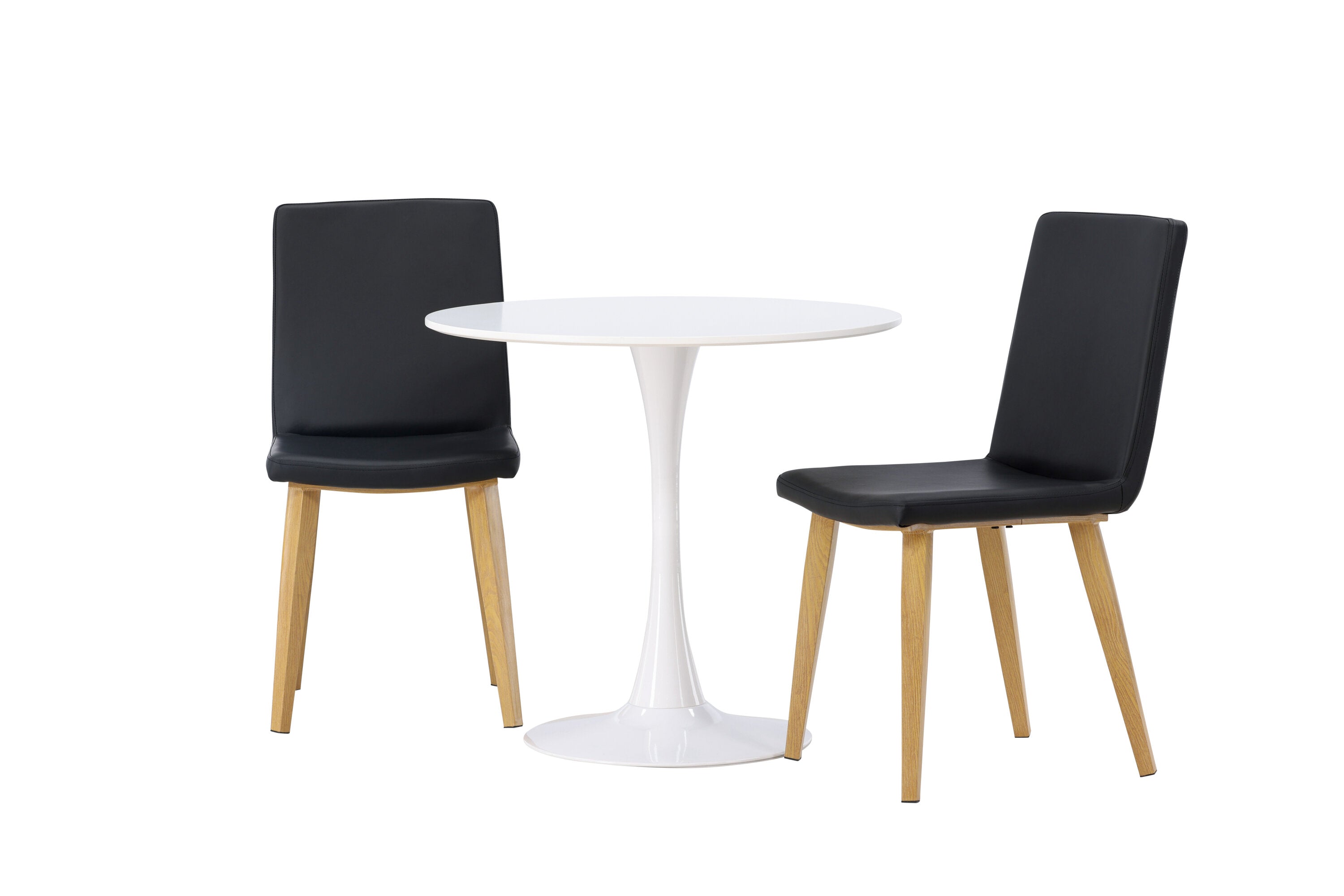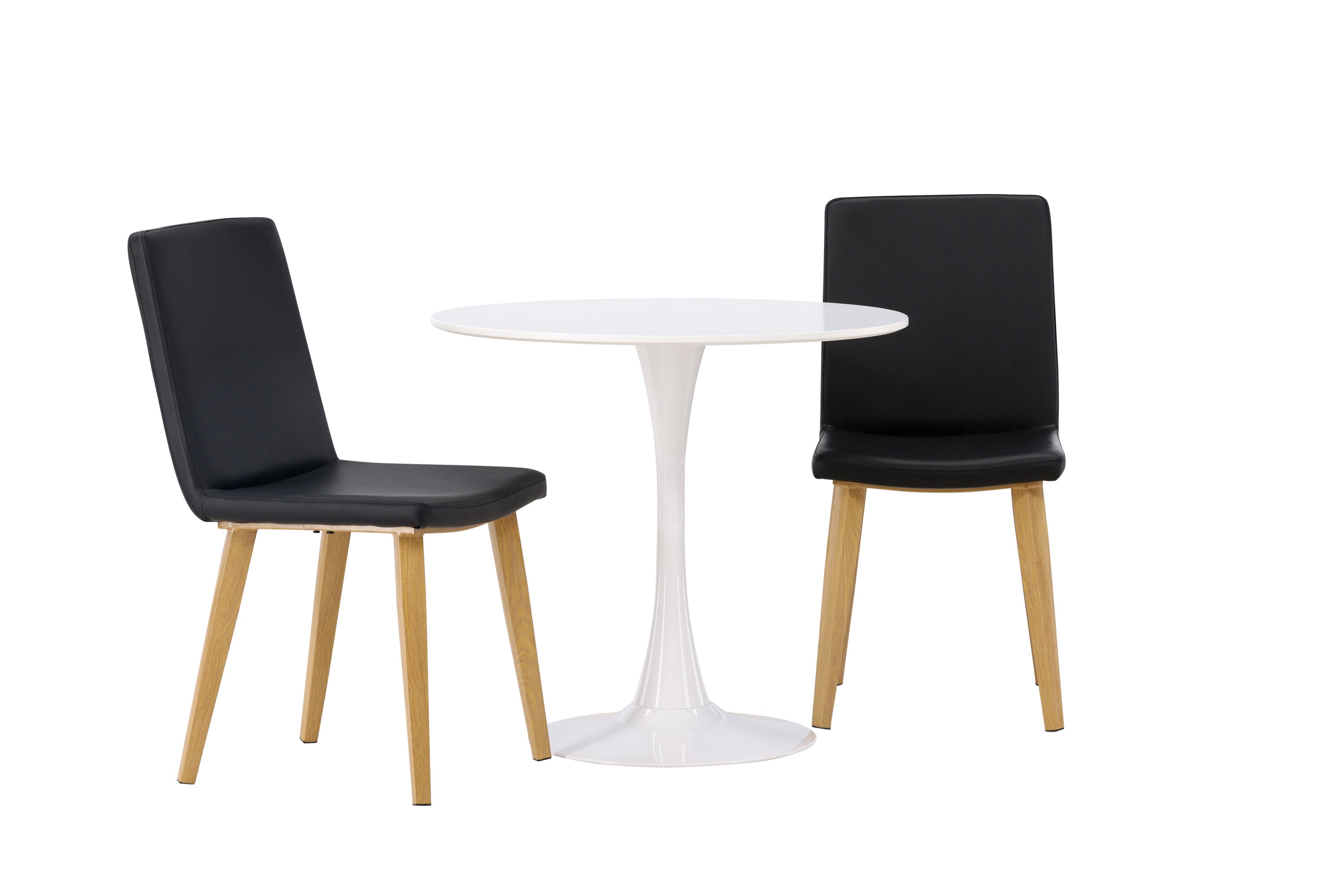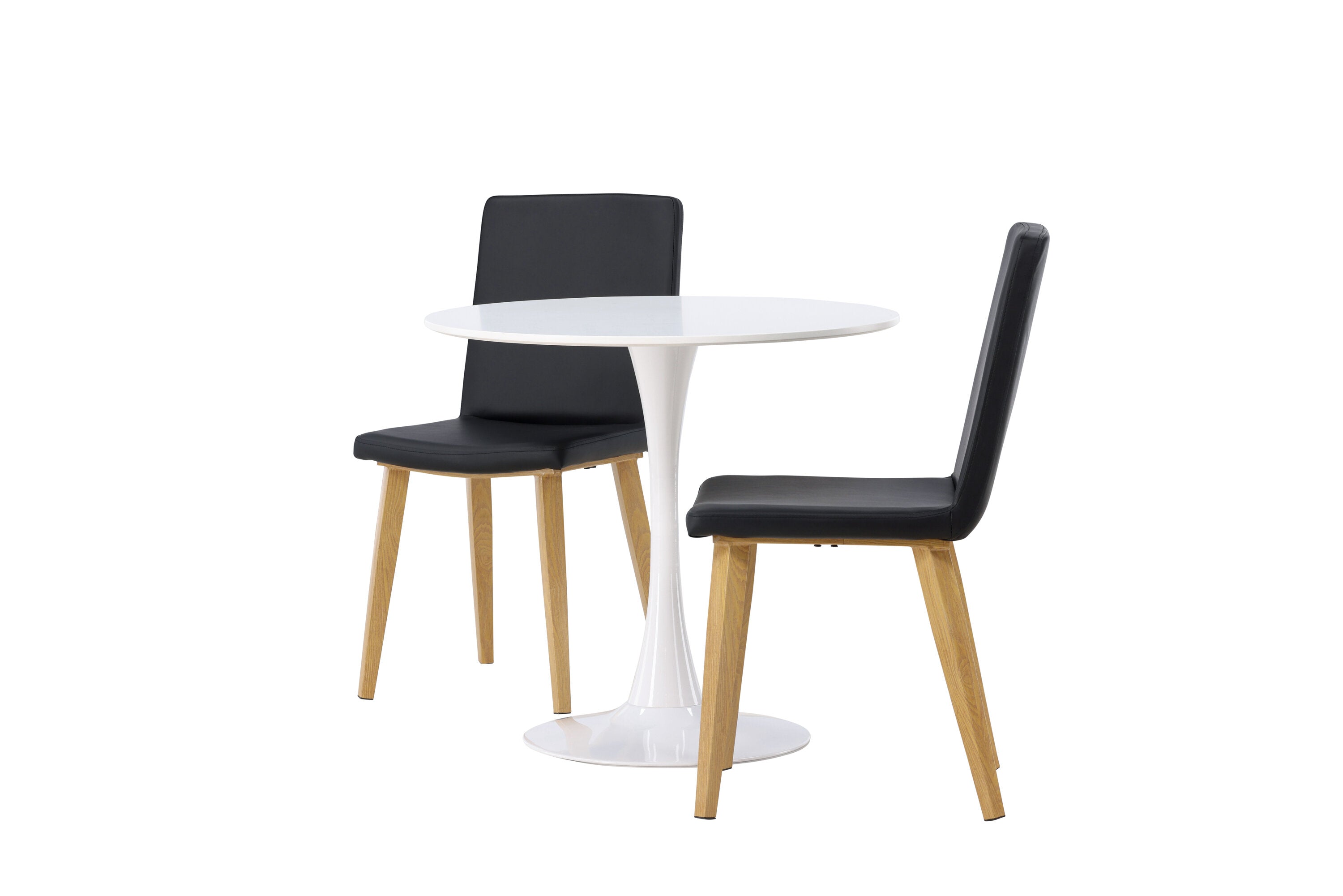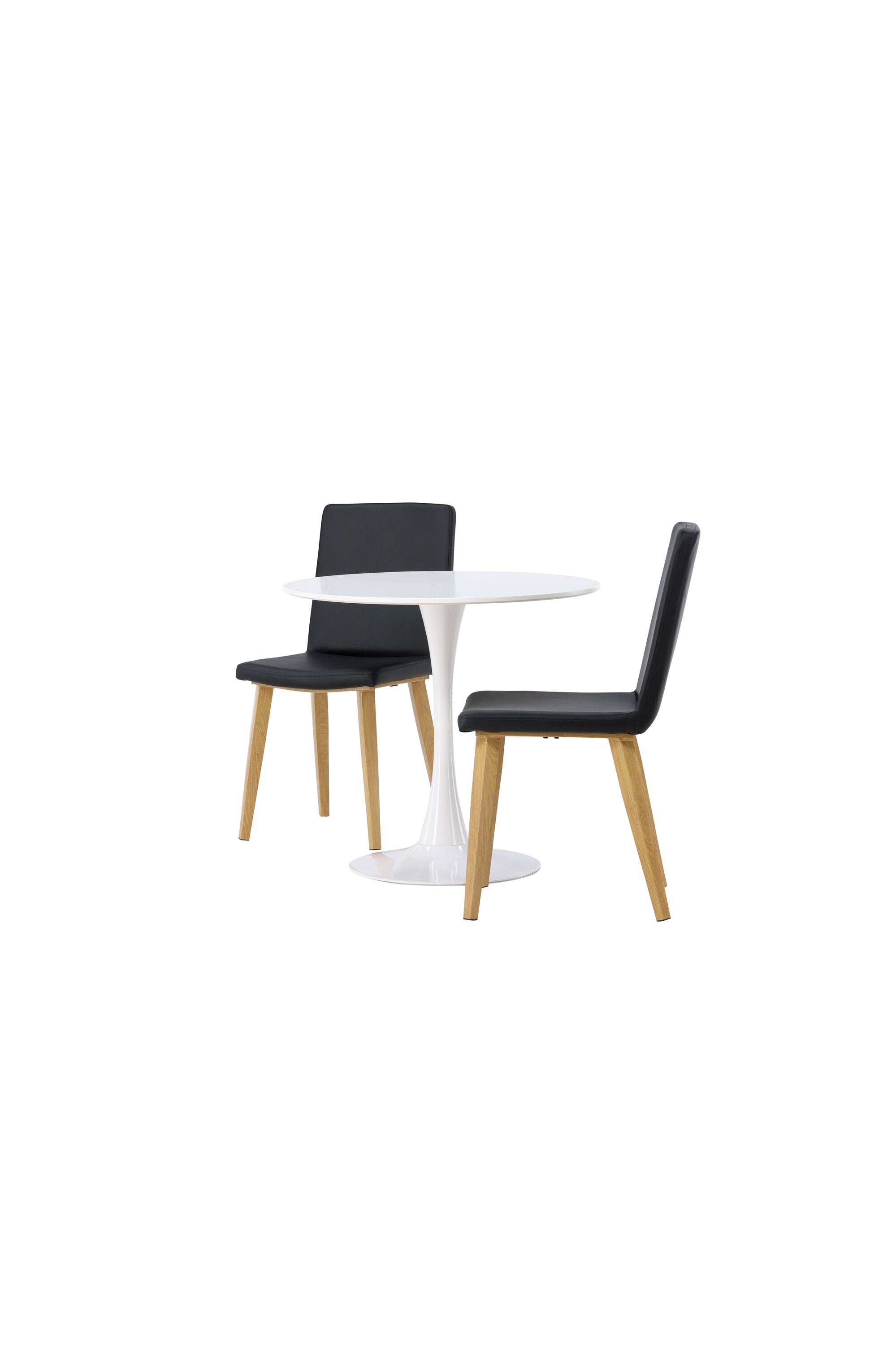 Zařiďte pohodlně a luxusně! Kulatý jídelní stůl Hamden má tenkou desku z bílé MDF a stylovou trumpetovou nohu z bílé oceli. Zde spolu s klasickými jídelními židlemi ze série Today. Židle má rovné severské tvary a hladký celočalouněný sedák v černé umělé kůži. Nohy židle jsou mírně rozšířené v přírodním dřevě a působí stabilním dojmem. Vytvořte osobní atmosféru! Průměr stolu: 60 cm.