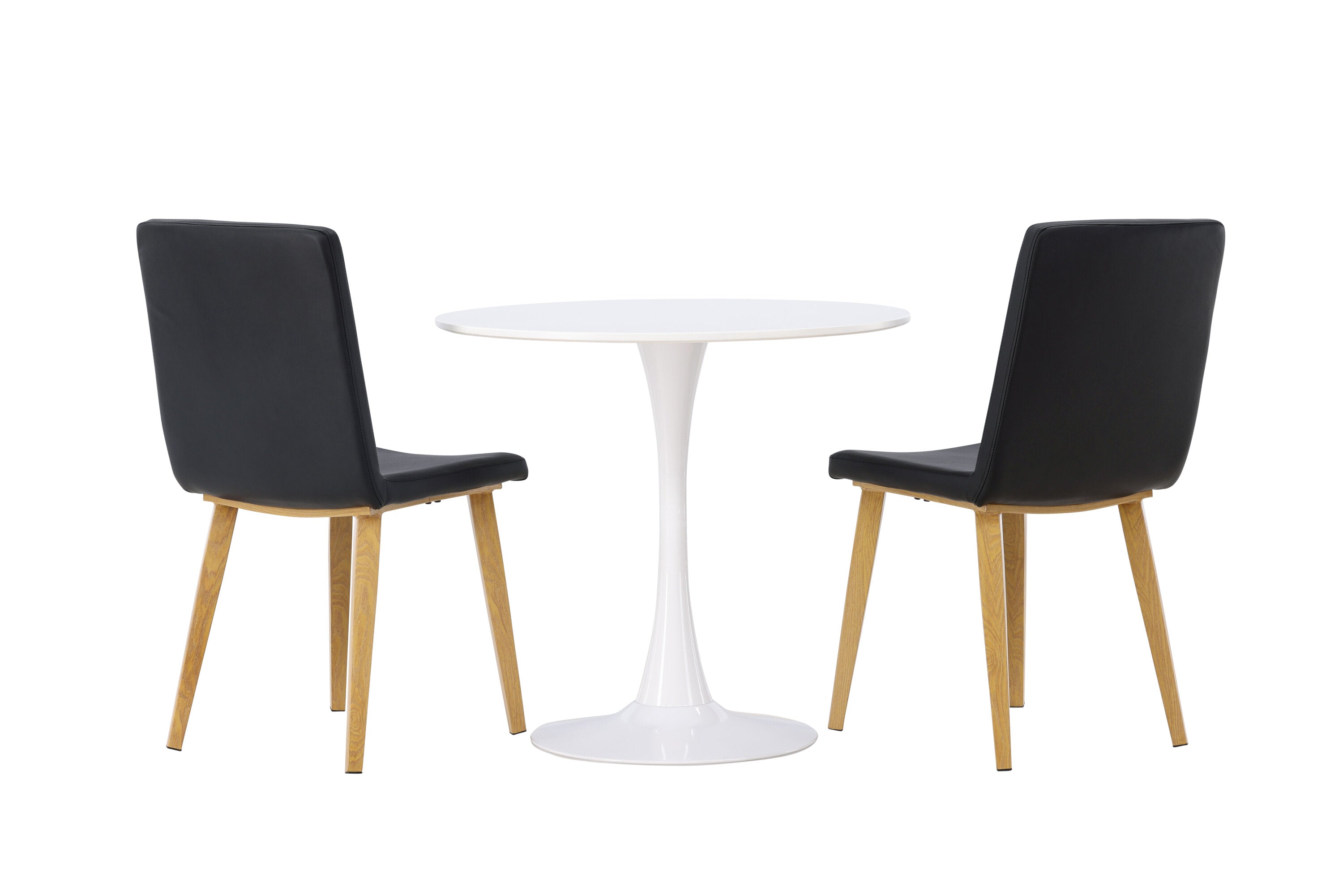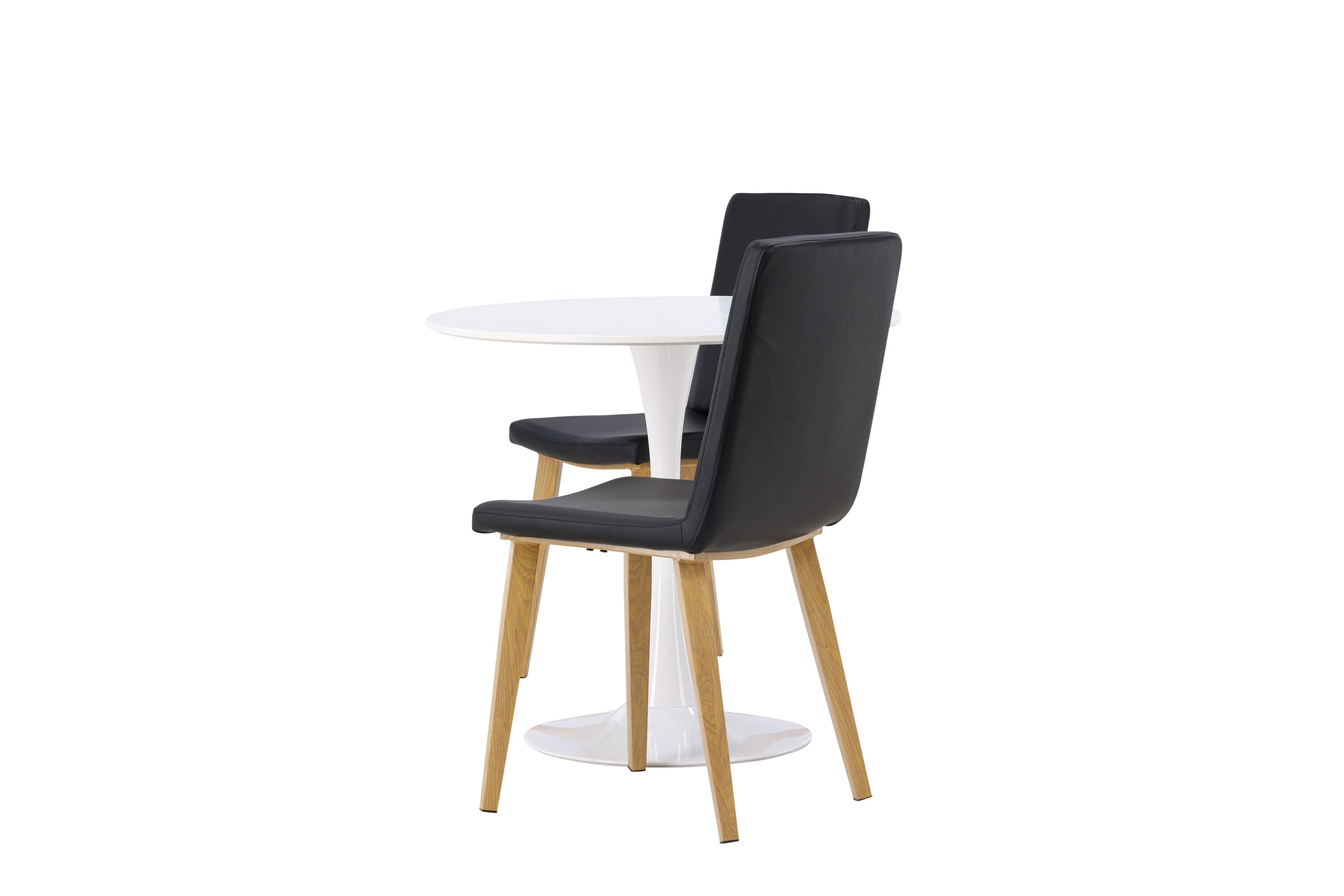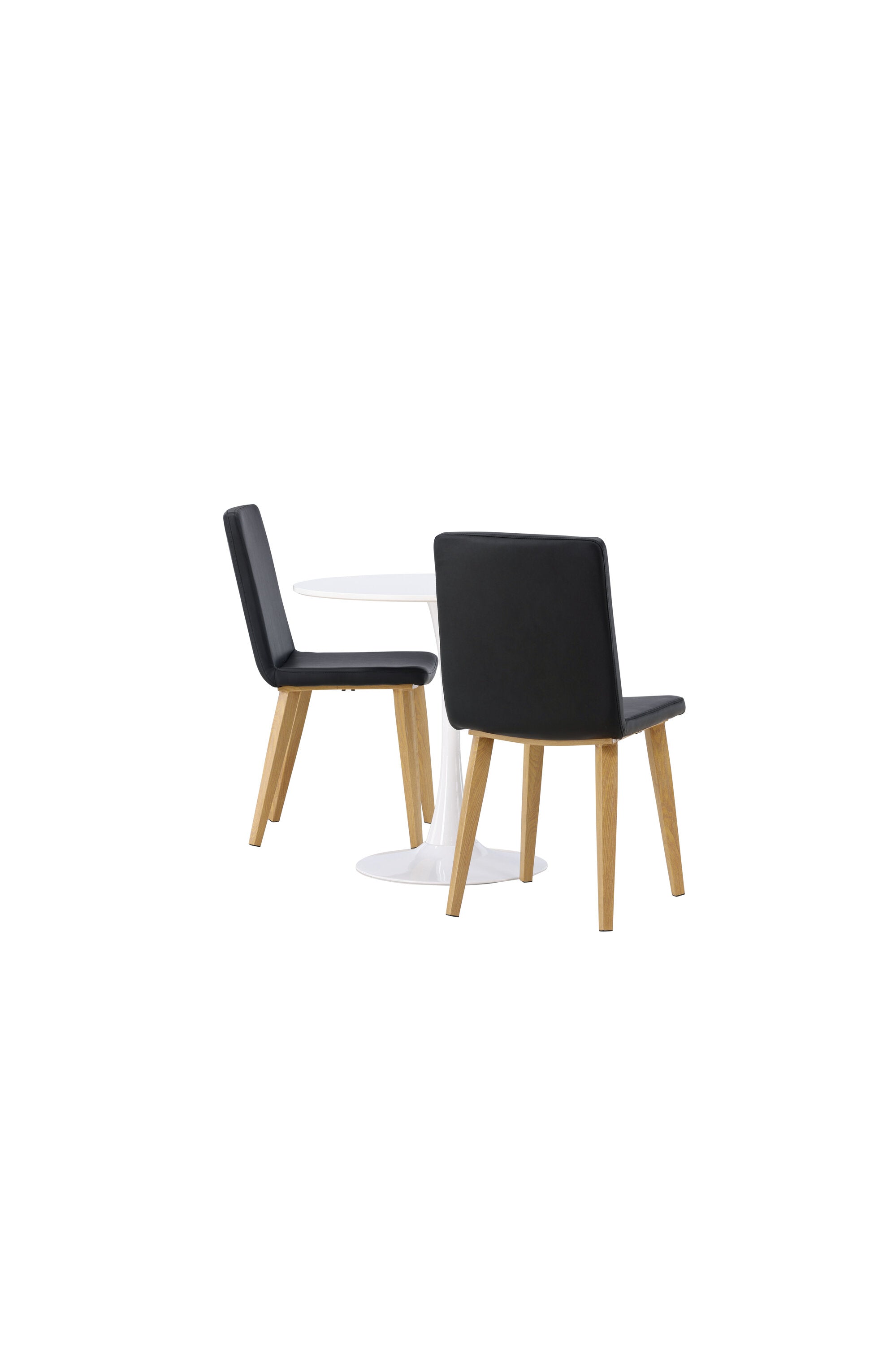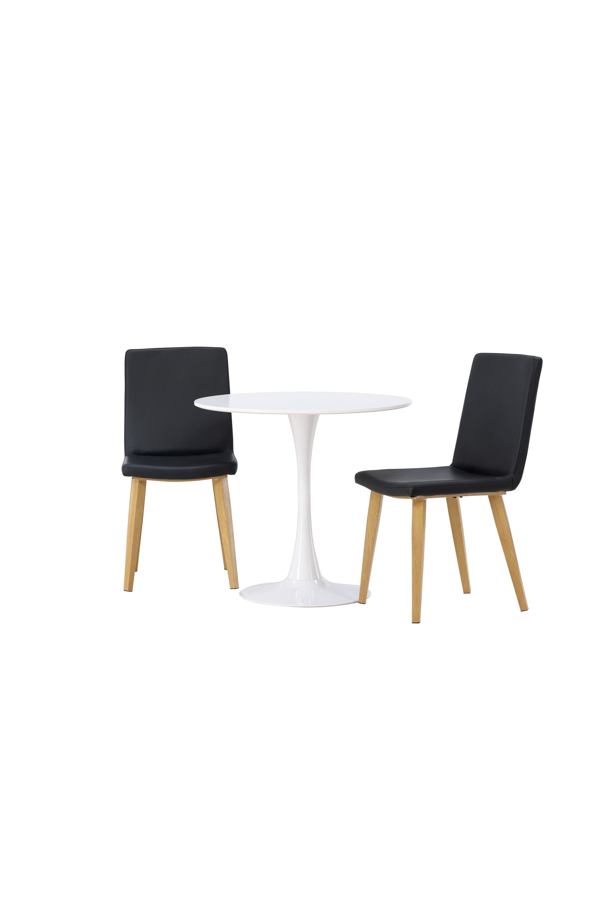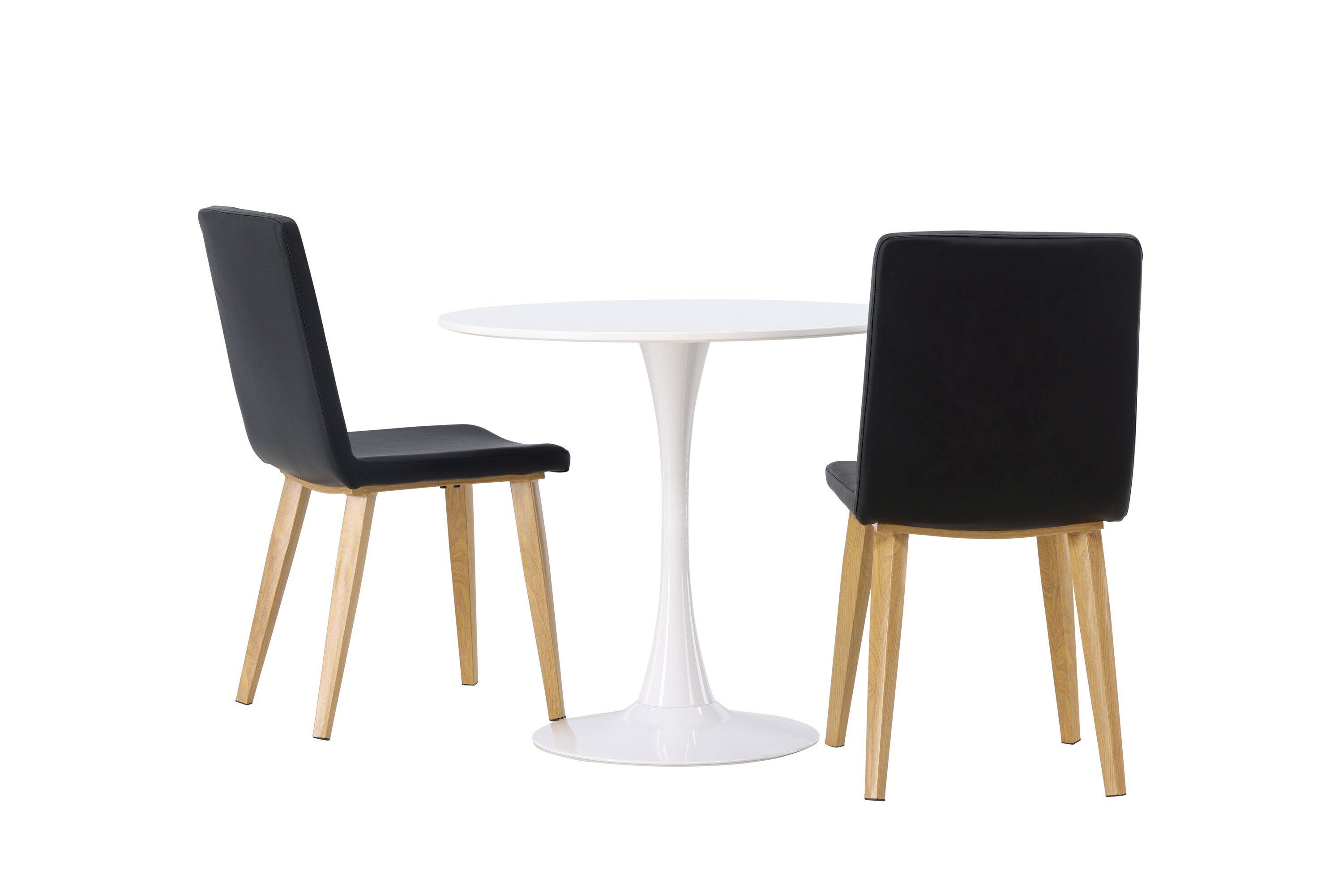 Zařiďte pohodlně a luxusně! Kulatý jídelní stůl Hamden má tenkou desku z bílé MDF a stylovou trumpetovou nohu z bílé oceli. Zde spolu s klasickými jídelními židlemi ze série Today. Židle má rovné severské tvary a hladký celočalouněný sedák v černé umělé kůži. Nohy židle jsou mírně rozšířené v přírodním dřevě a působí stabilním dojmem. Vytvořte osobní atmosféru! Průměr stolu: 60 cm.
