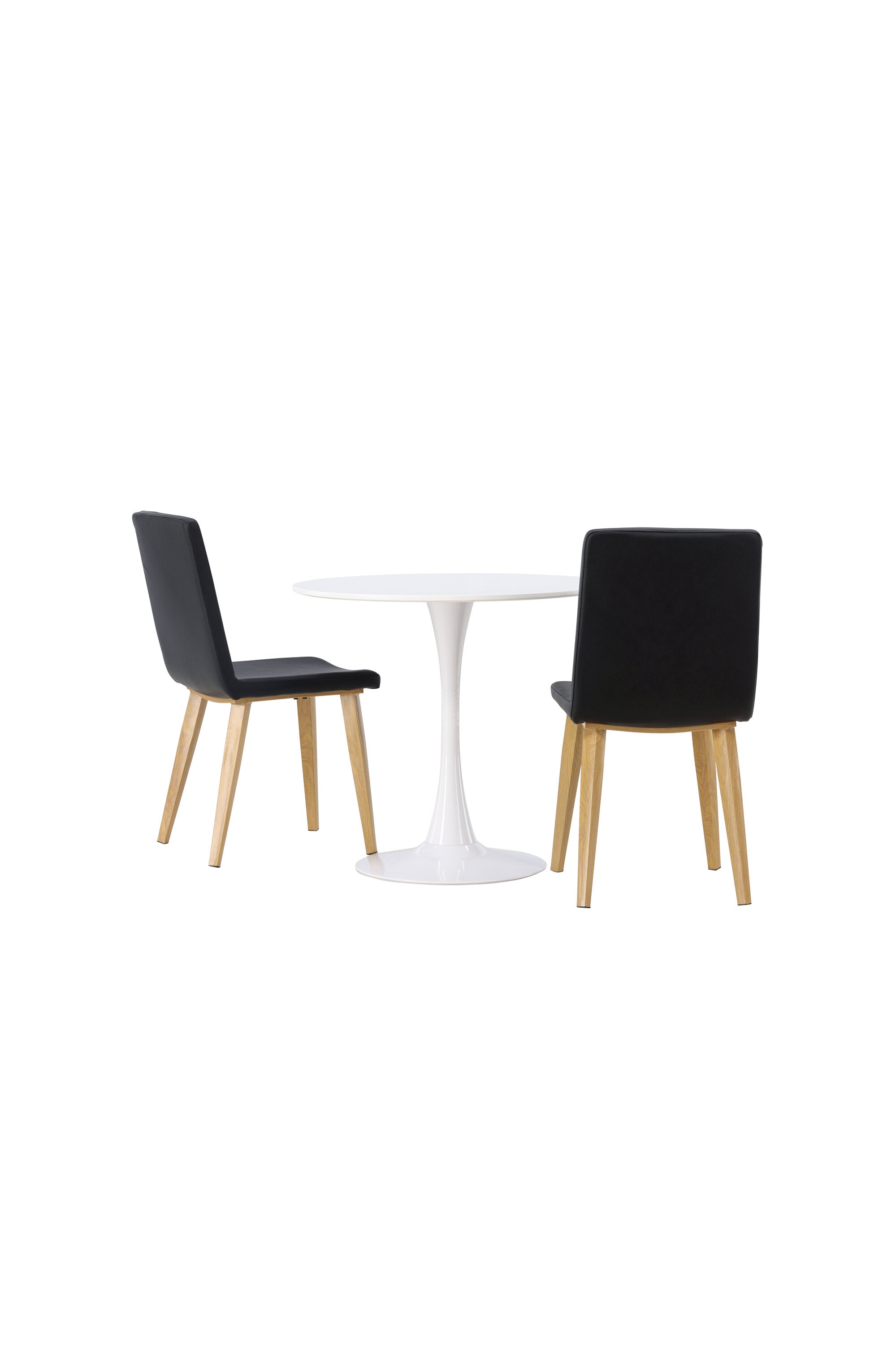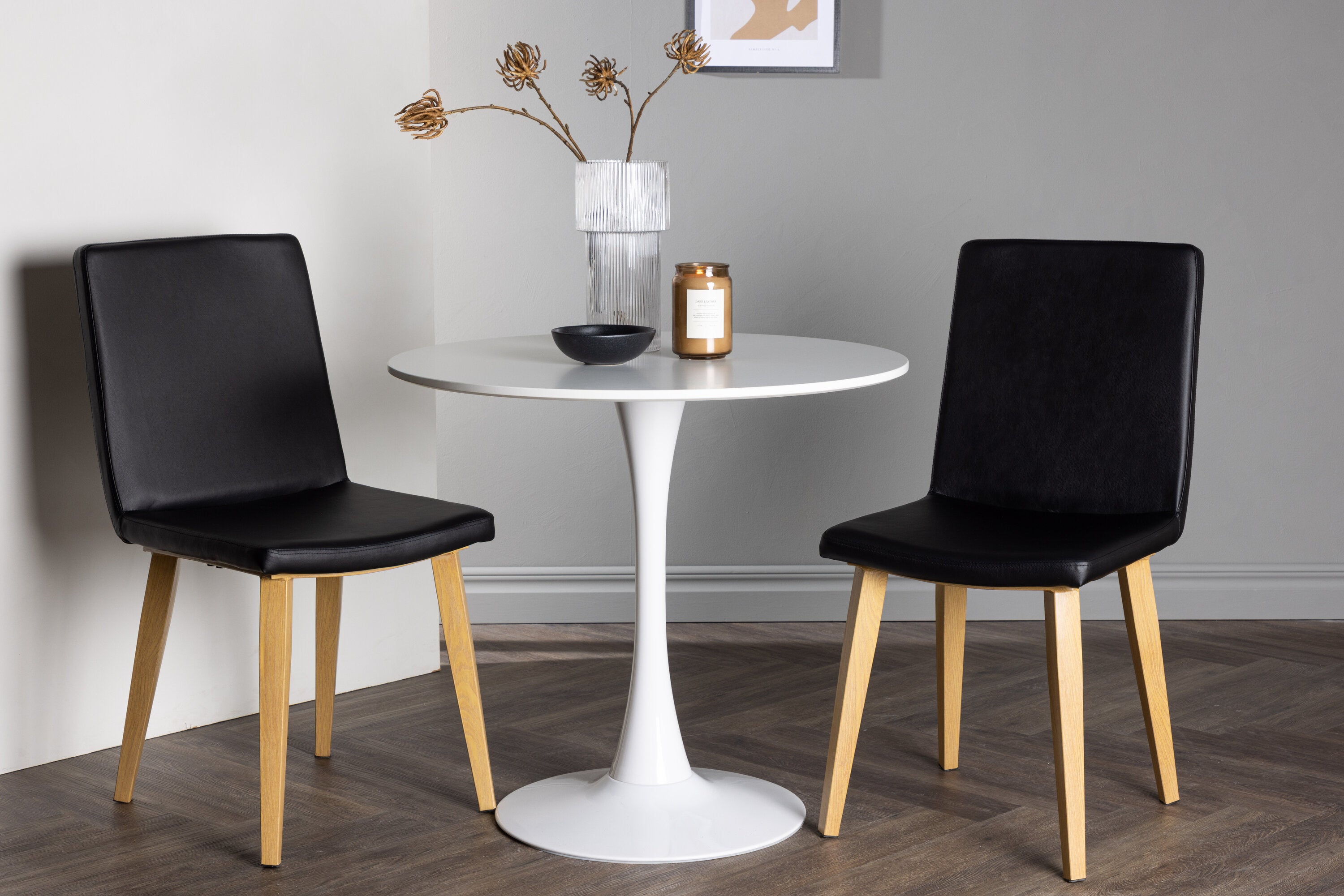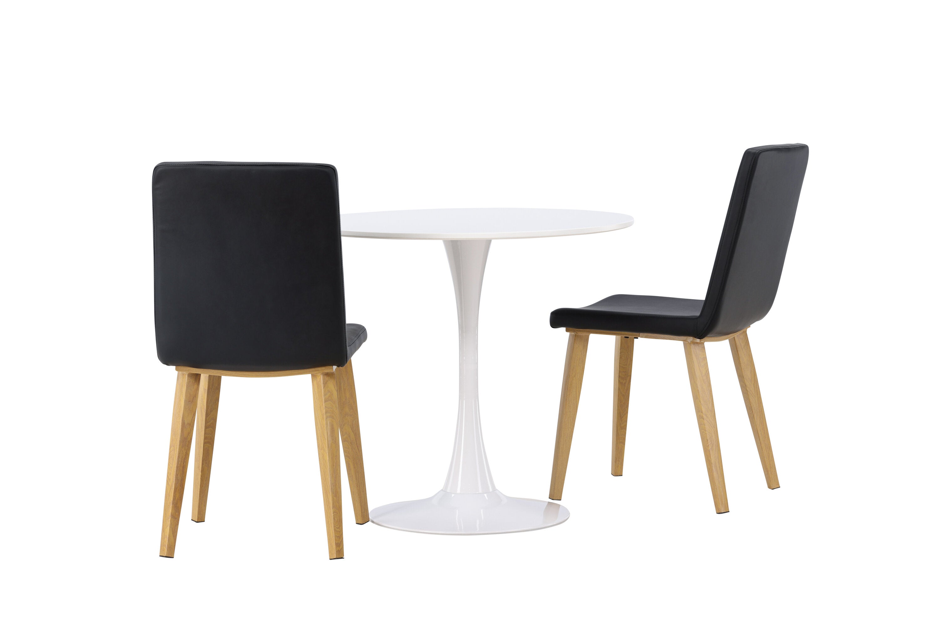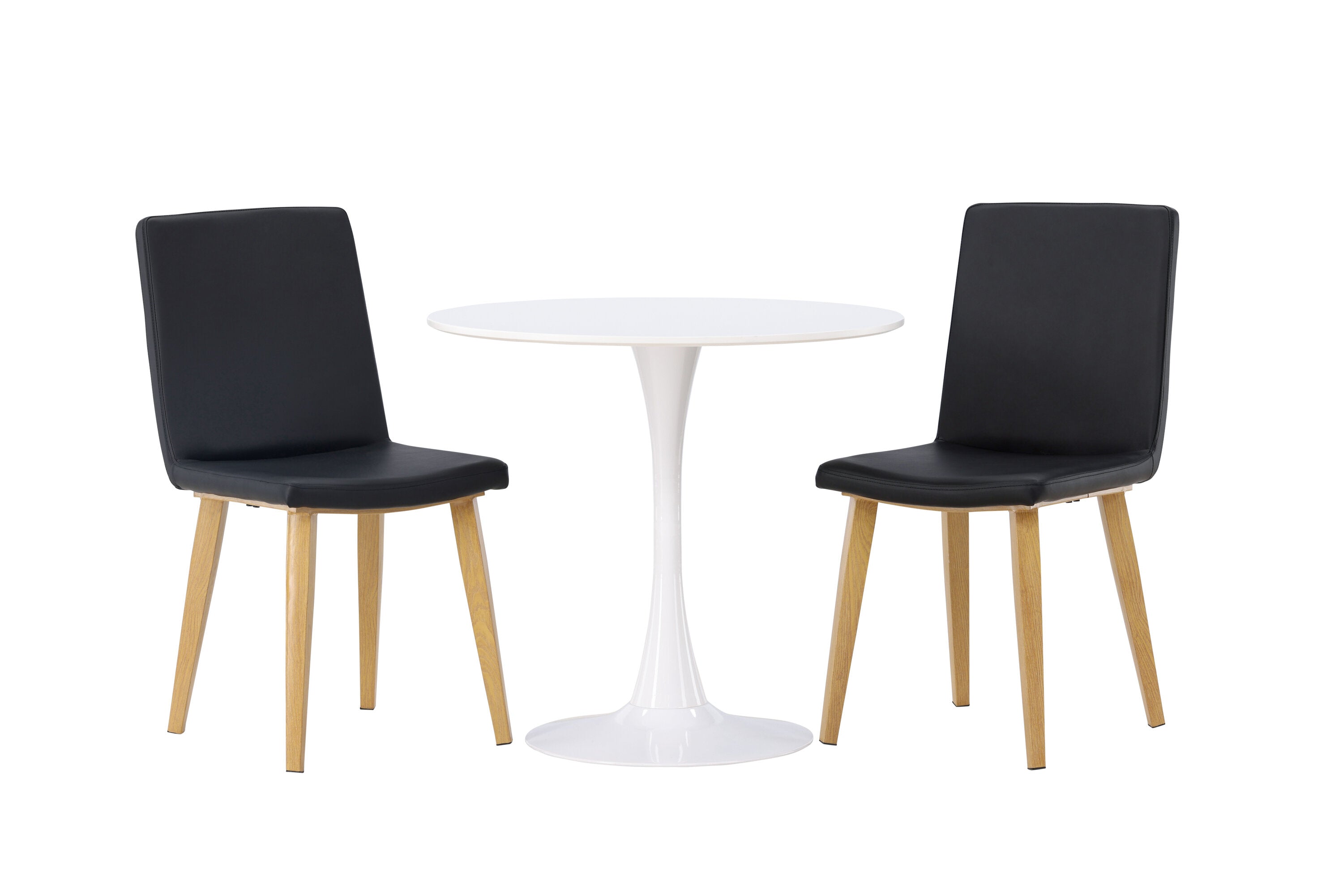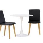 Zařiďte pohodlně a luxusně! Kulatý jídelní stůl Hamden má tenkou desku z bílé MDF a stylovou trumpetovou nohu z bílé oceli. Zde spolu s klasickými jídelními židlemi ze série Today. Židle má rovné severské tvary a hladký celočalouněný sedák v černé umělé kůži. Nohy židle jsou mírně rozšířené v přírodním dřevě a působí stabilním dojmem. Vytvořte osobní atmosféru! Průměr stolu: 60 cm.