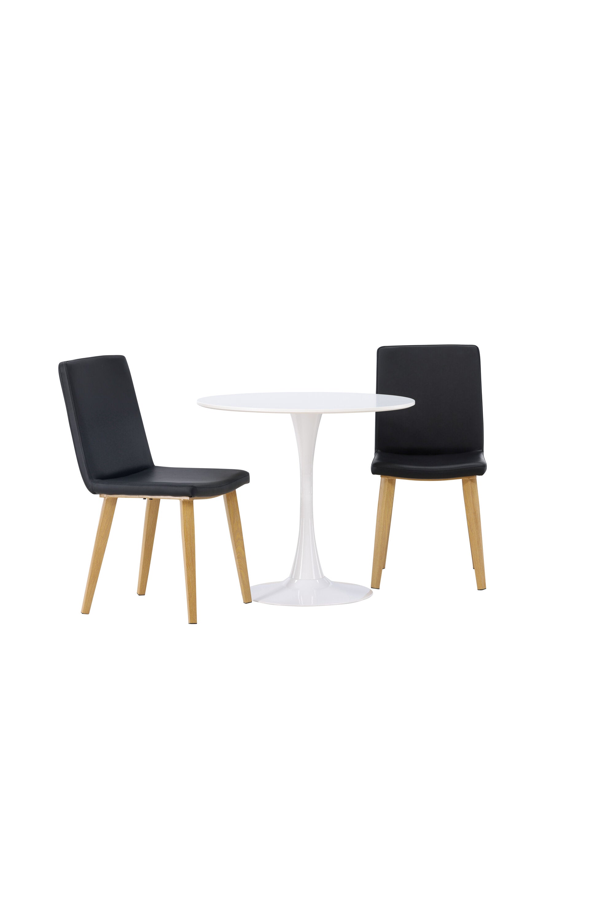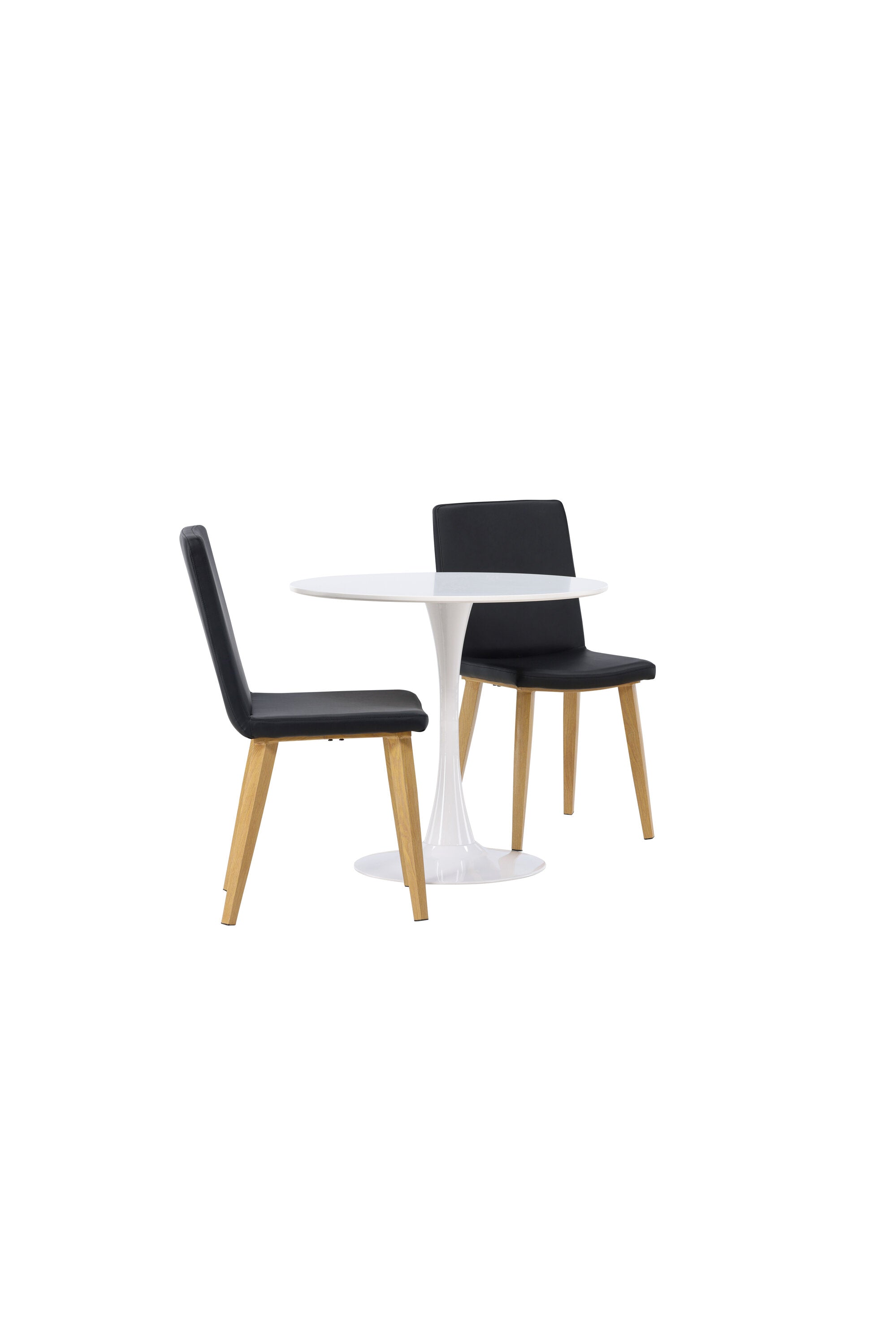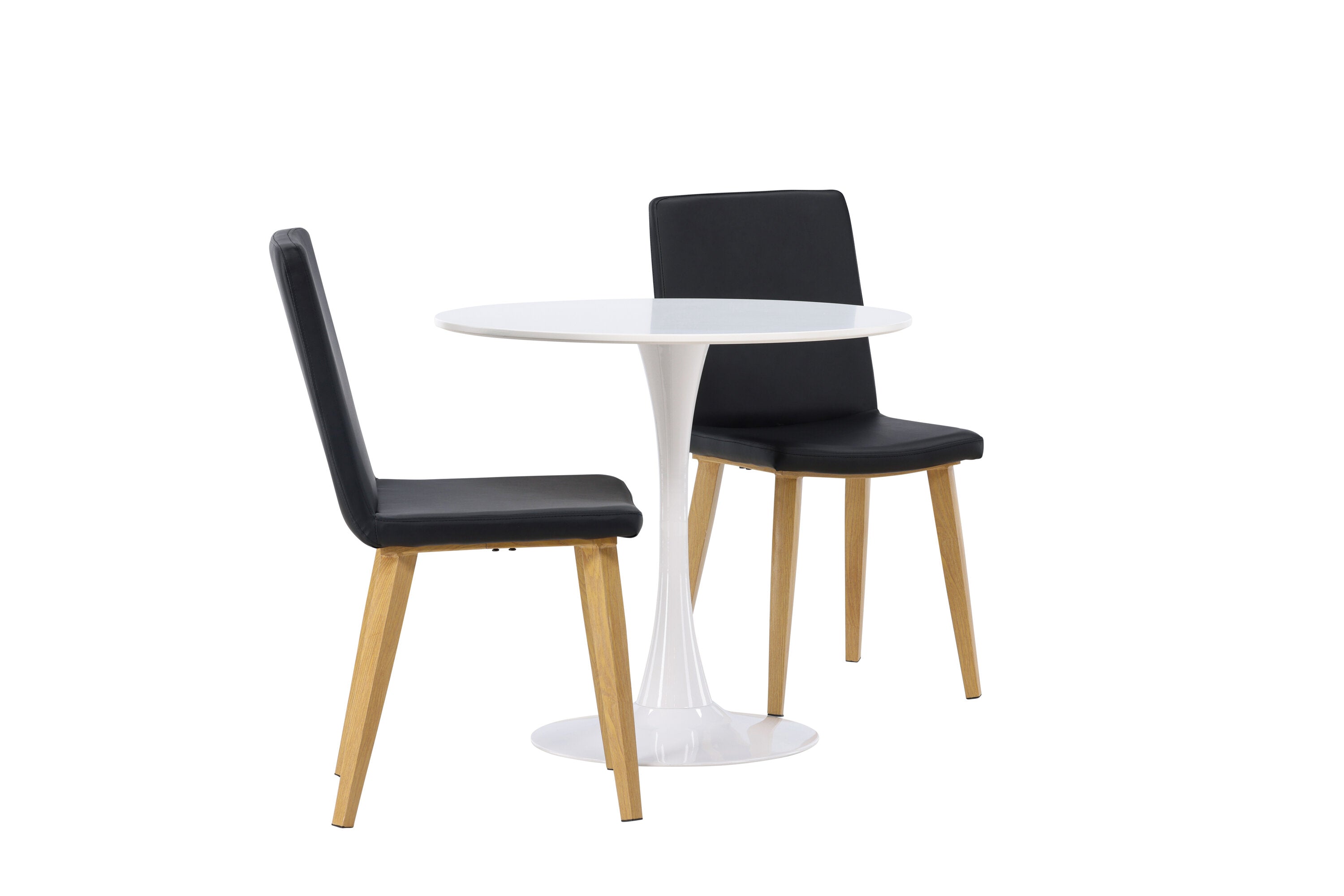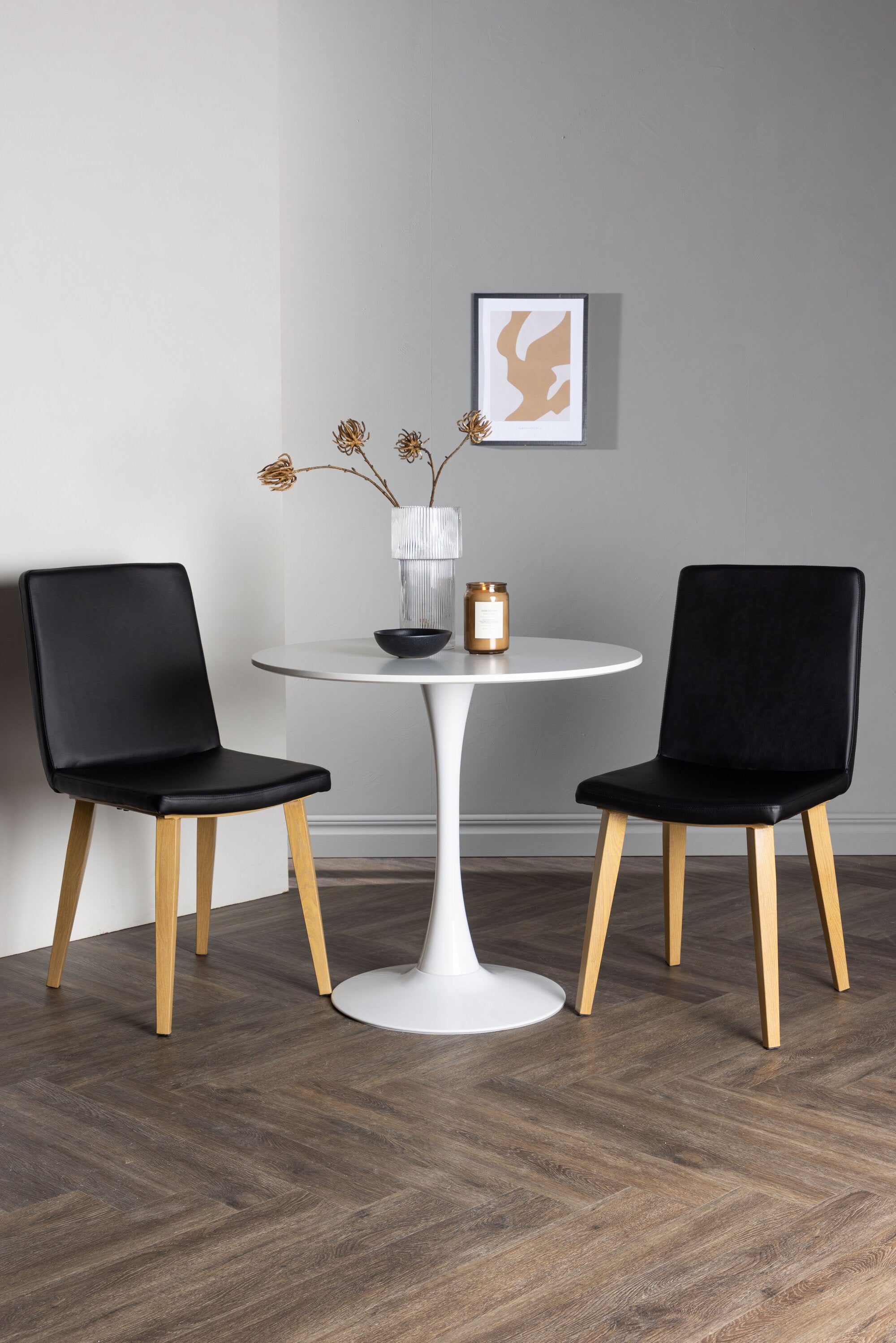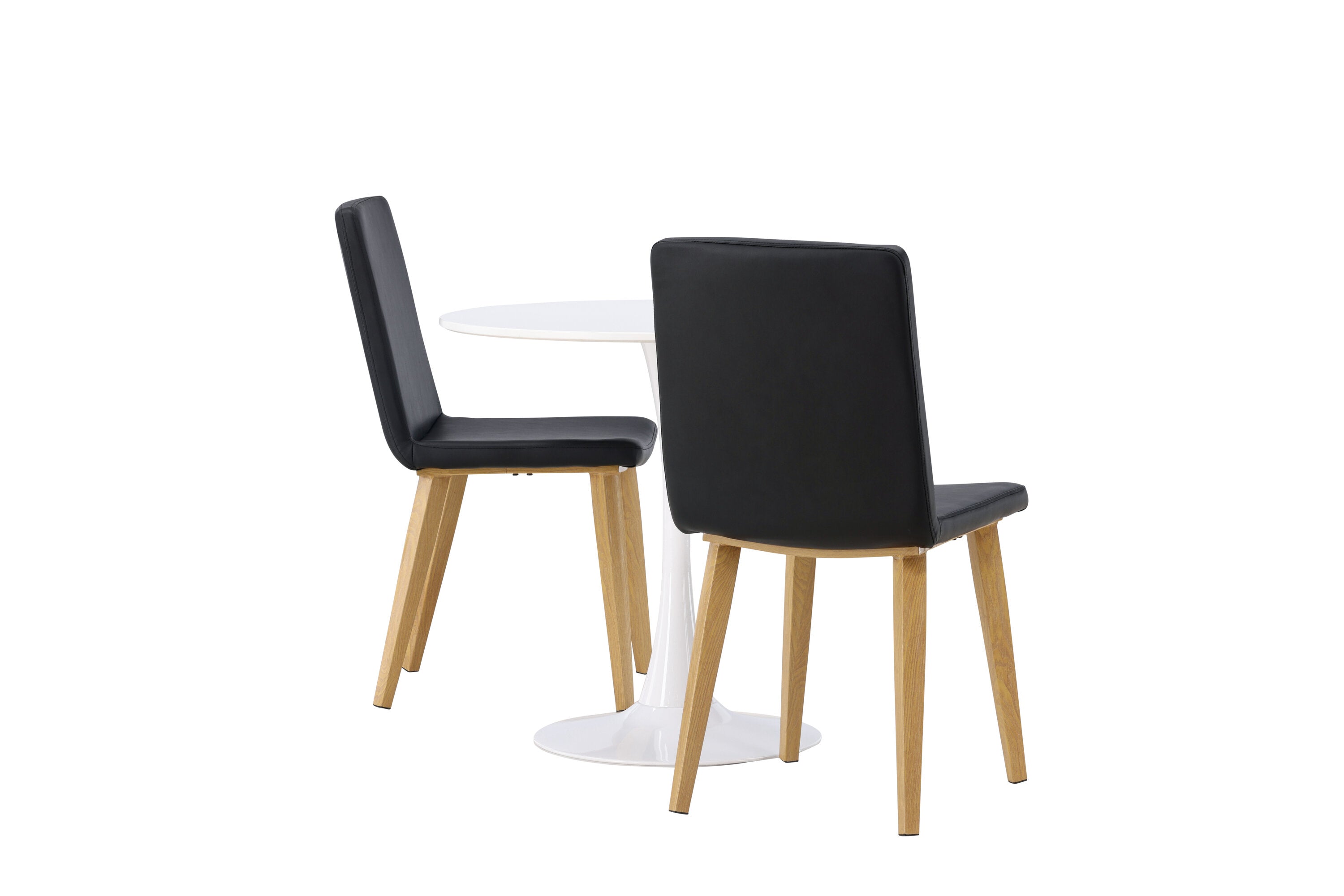 Zařiďte pohodlně a luxusně! Kulatý jídelní stůl Hamden má tenkou desku z bílé MDF a stylovou trumpetovou nohu z bílé oceli. Zde spolu s klasickými jídelními židlemi ze série Today. Židle má rovné severské tvary a hladký celočalouněný sedák v černé umělé kůži. Nohy židle jsou mírně rozšířené v přírodním dřevě a působí stabilním dojmem. Vytvořte osobní atmosféru! Průměr stolu: 60 cm.