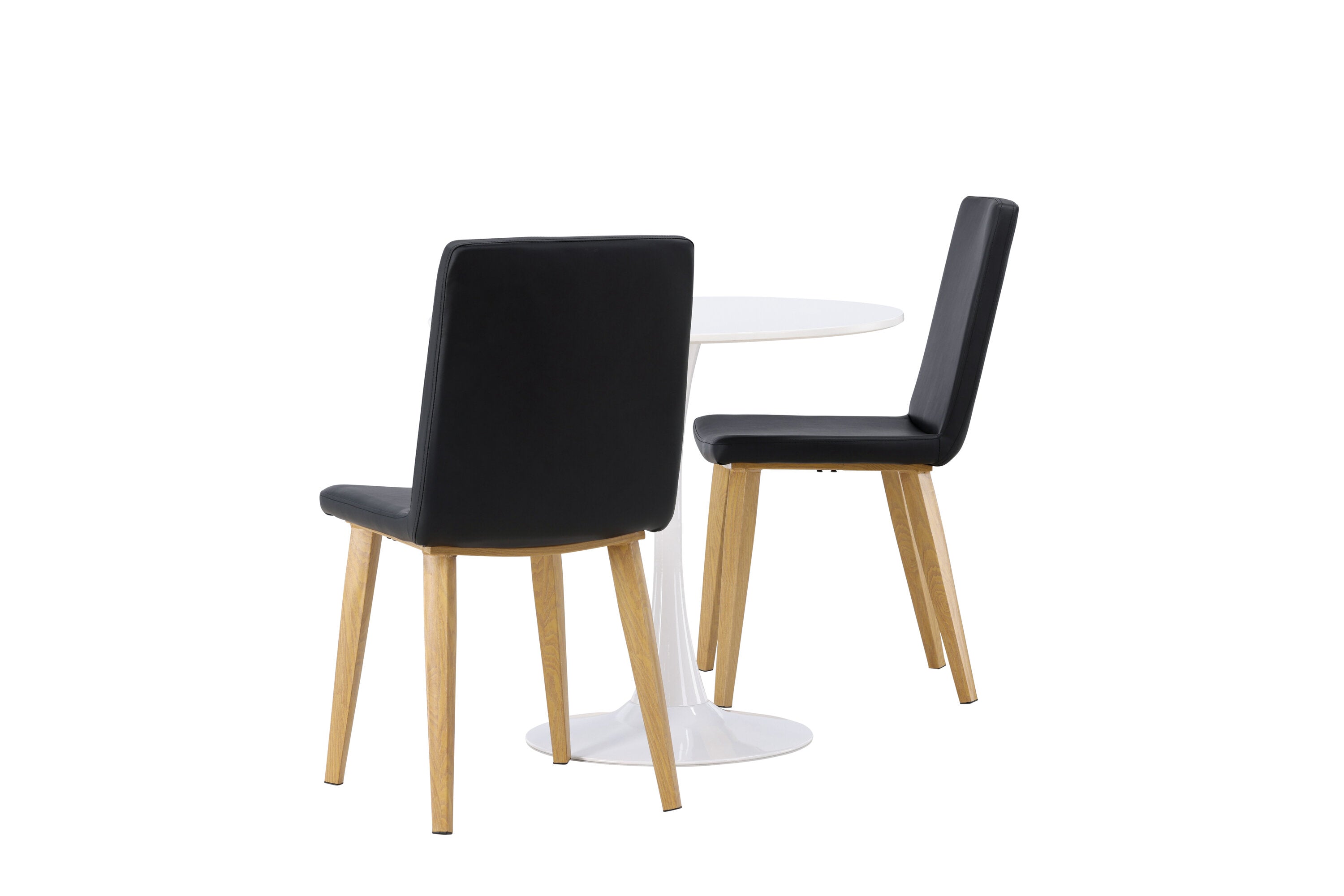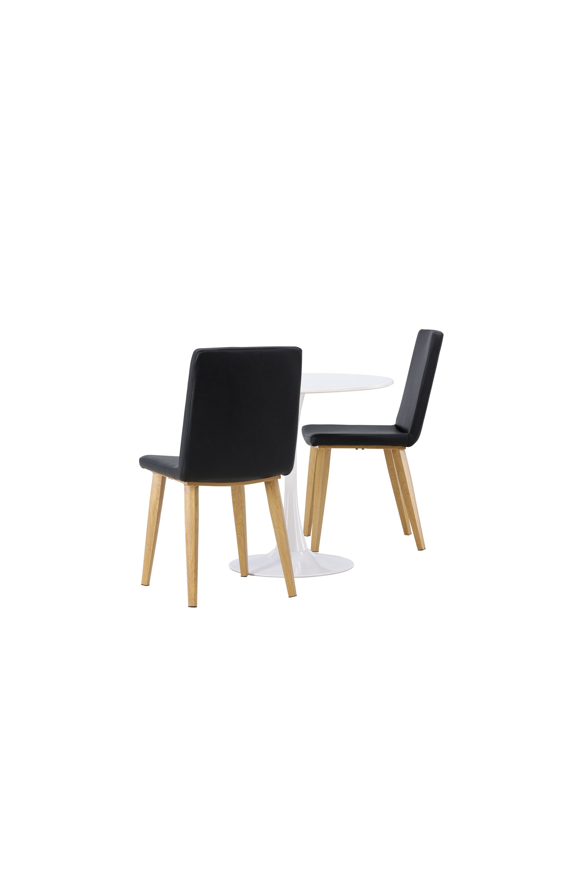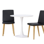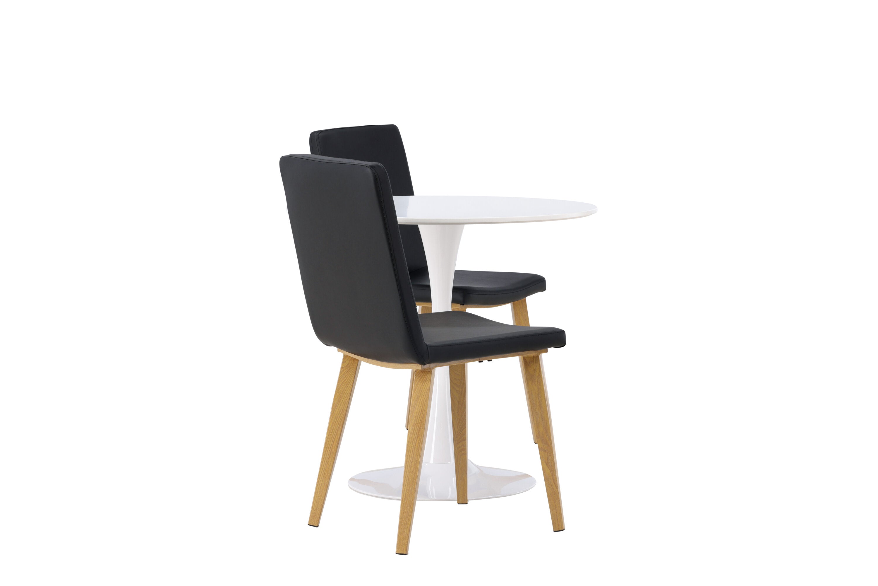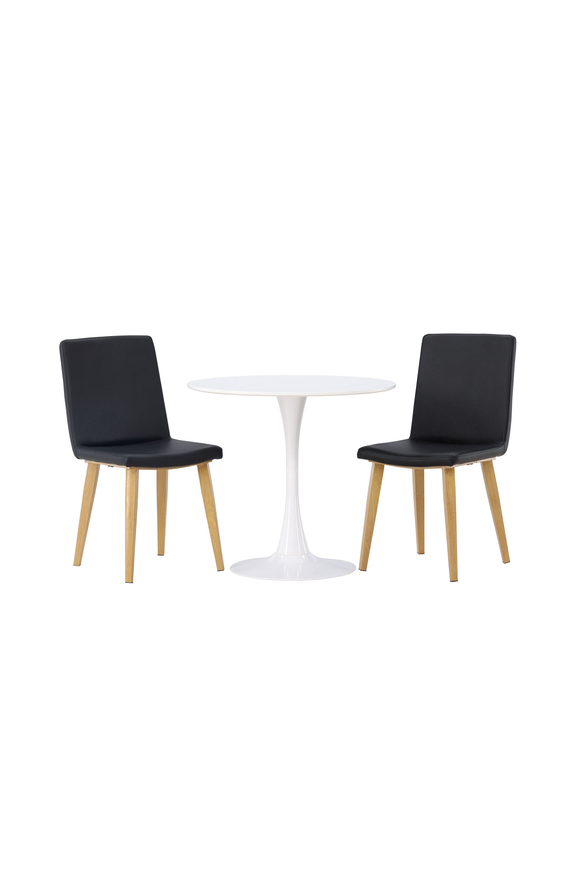 Zařiďte pohodlně a luxusně! Kulatý jídelní stůl Hamden má tenkou desku z bílé MDF a stylovou trumpetovou nohu z bílé oceli. Zde spolu s klasickými jídelními židlemi ze série Today. Židle má rovné severské tvary a hladký celočalouněný sedák v černé umělé kůži. Nohy židle jsou mírně rozšířené v přírodním dřevě a působí stabilním dojmem. Vytvořte osobní atmosféru! Průměr stolu: 60 cm.