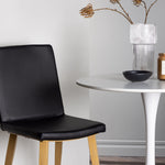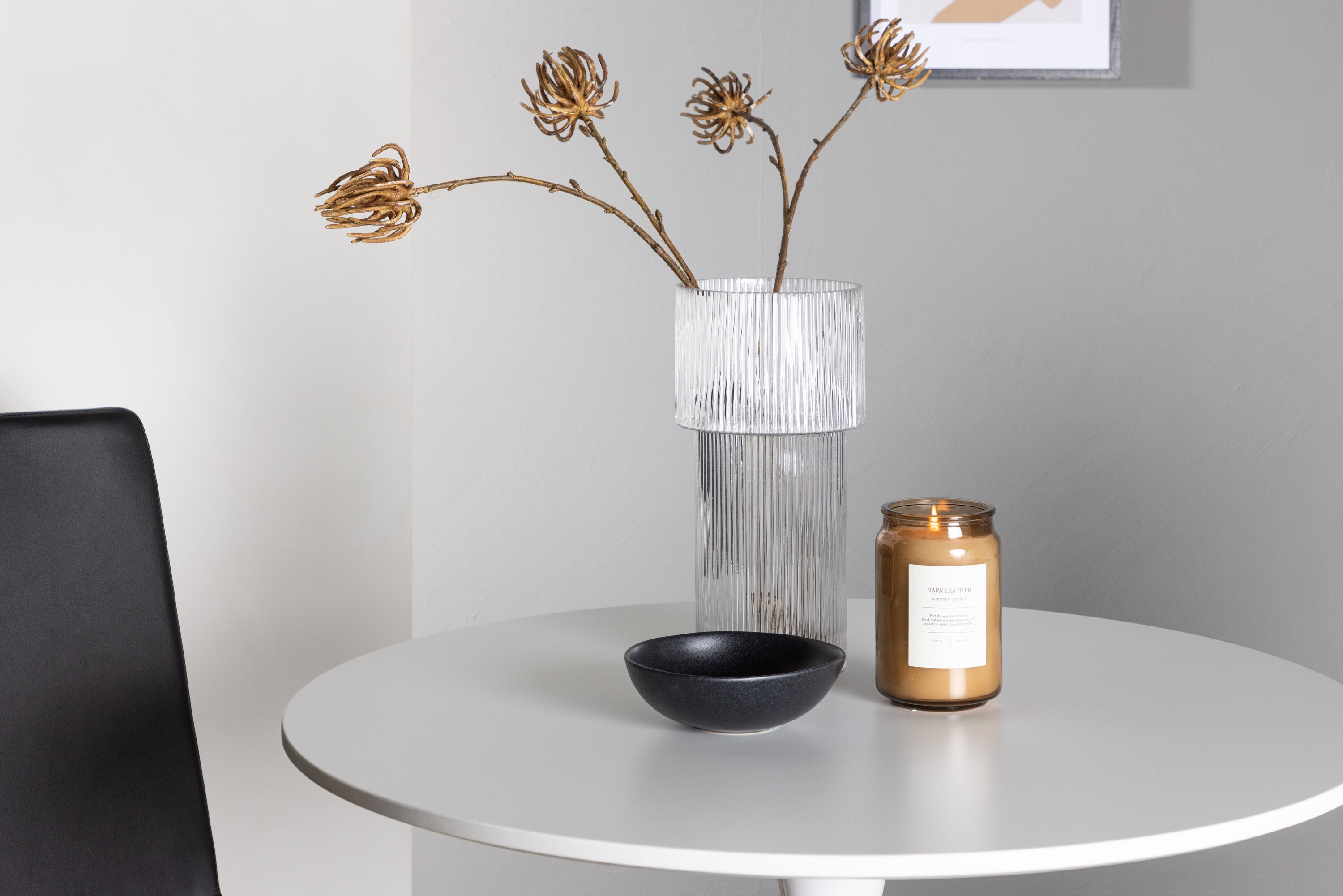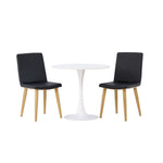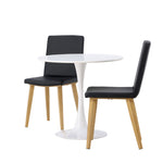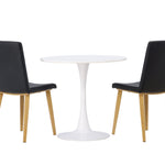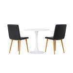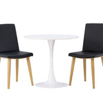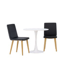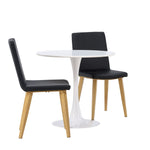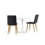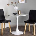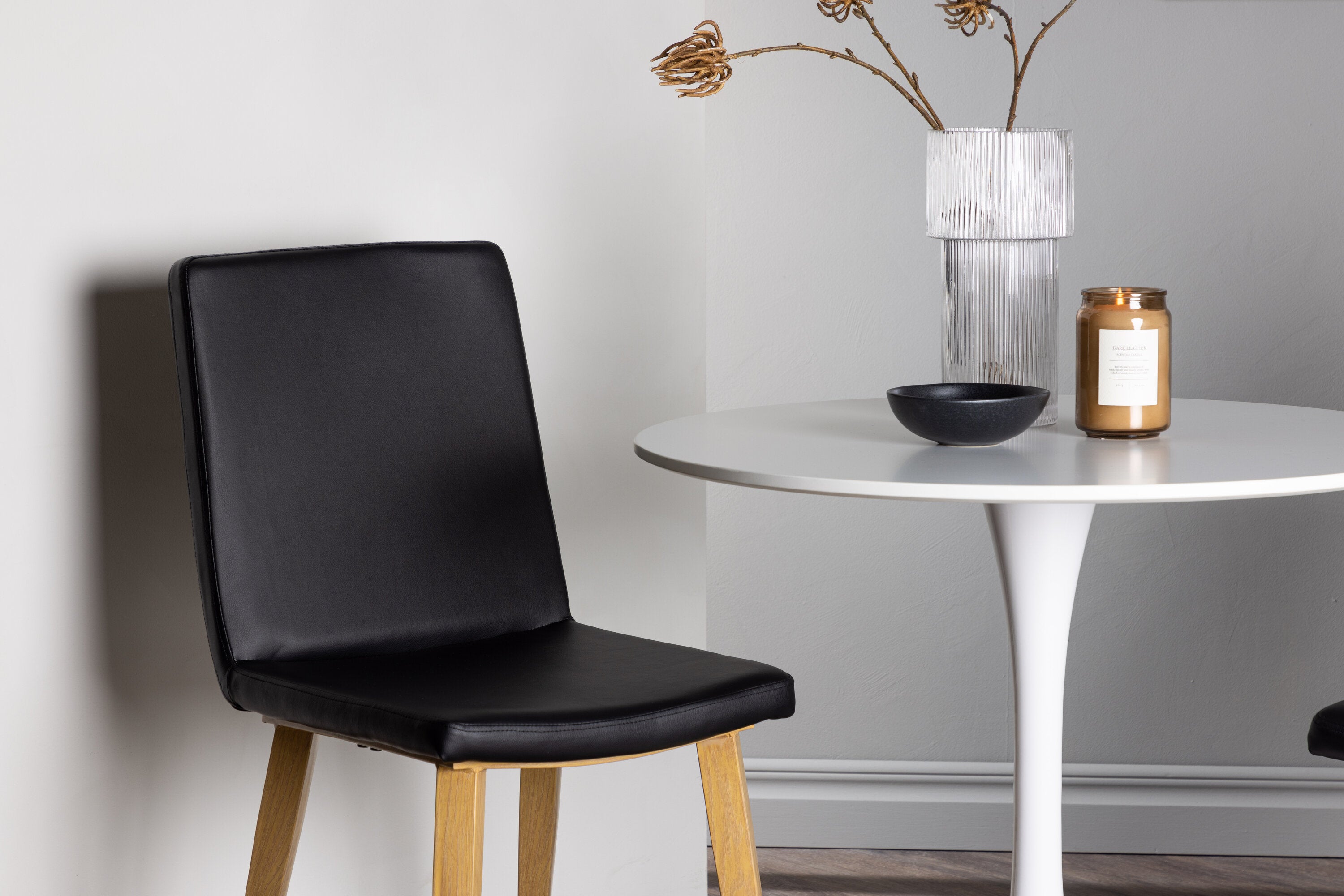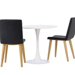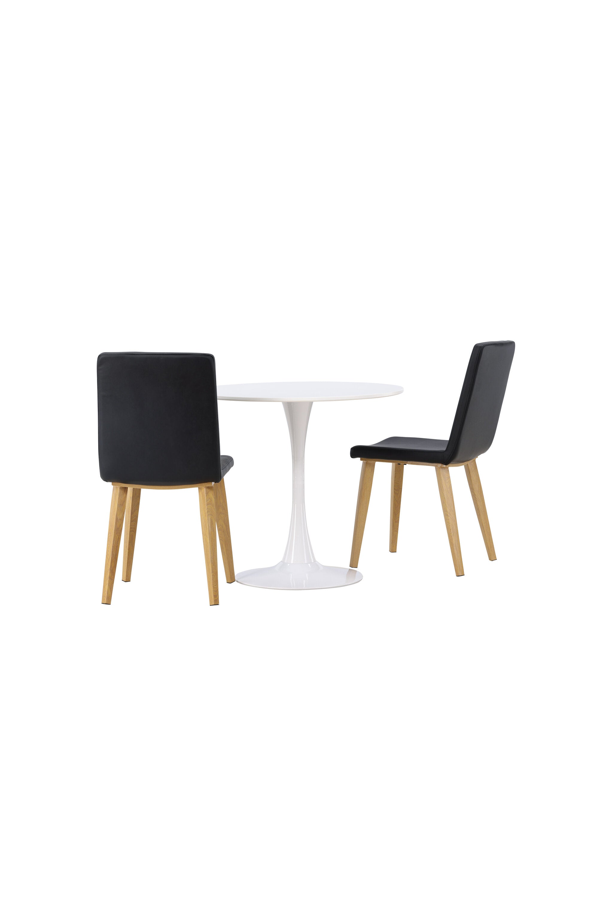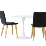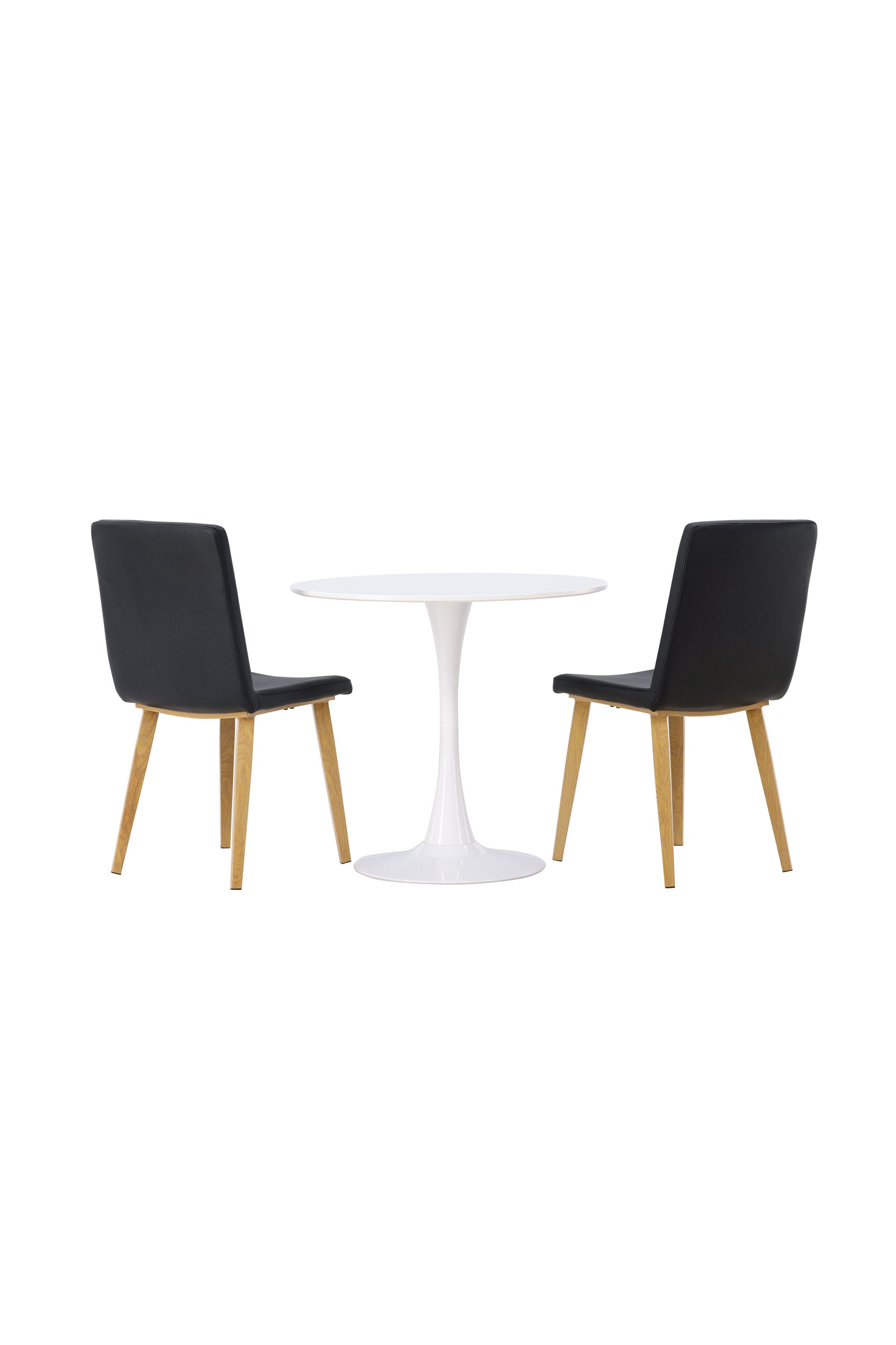 Zařiďte pohodlně a luxusně! Kulatý jídelní stůl Hamden má tenkou desku z bílé MDF a stylovou trumpetovou nohu z bílé oceli. Zde spolu s klasickými jídelními židlemi ze série Today. Židle má rovné severské tvary a hladký celočalouněný sedák v černé umělé kůži. Nohy židle jsou mírně rozšířené v přírodním dřevě a působí stabilním dojmem. Vytvořte osobní atmosféru! Průměr stolu: 60 cm.