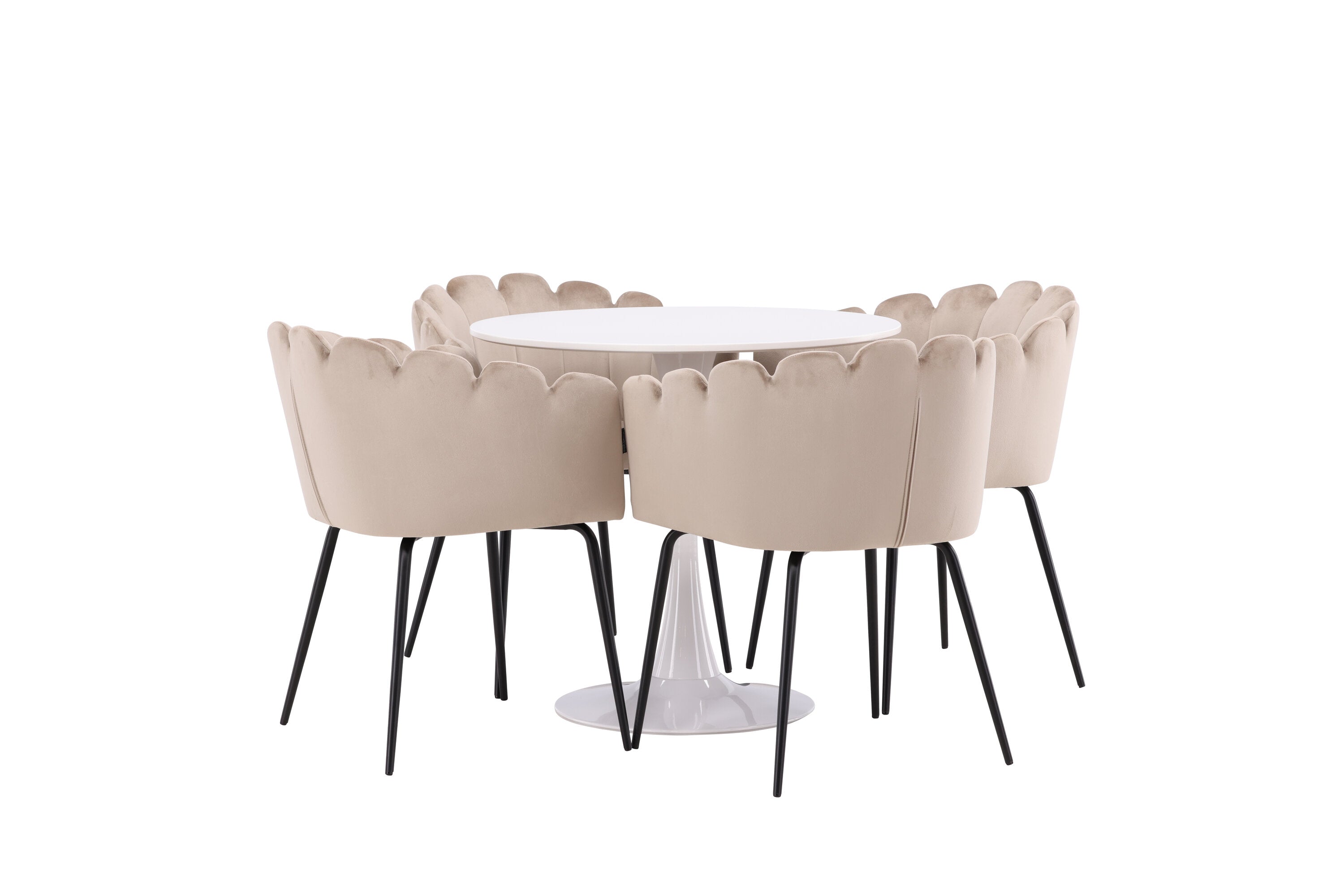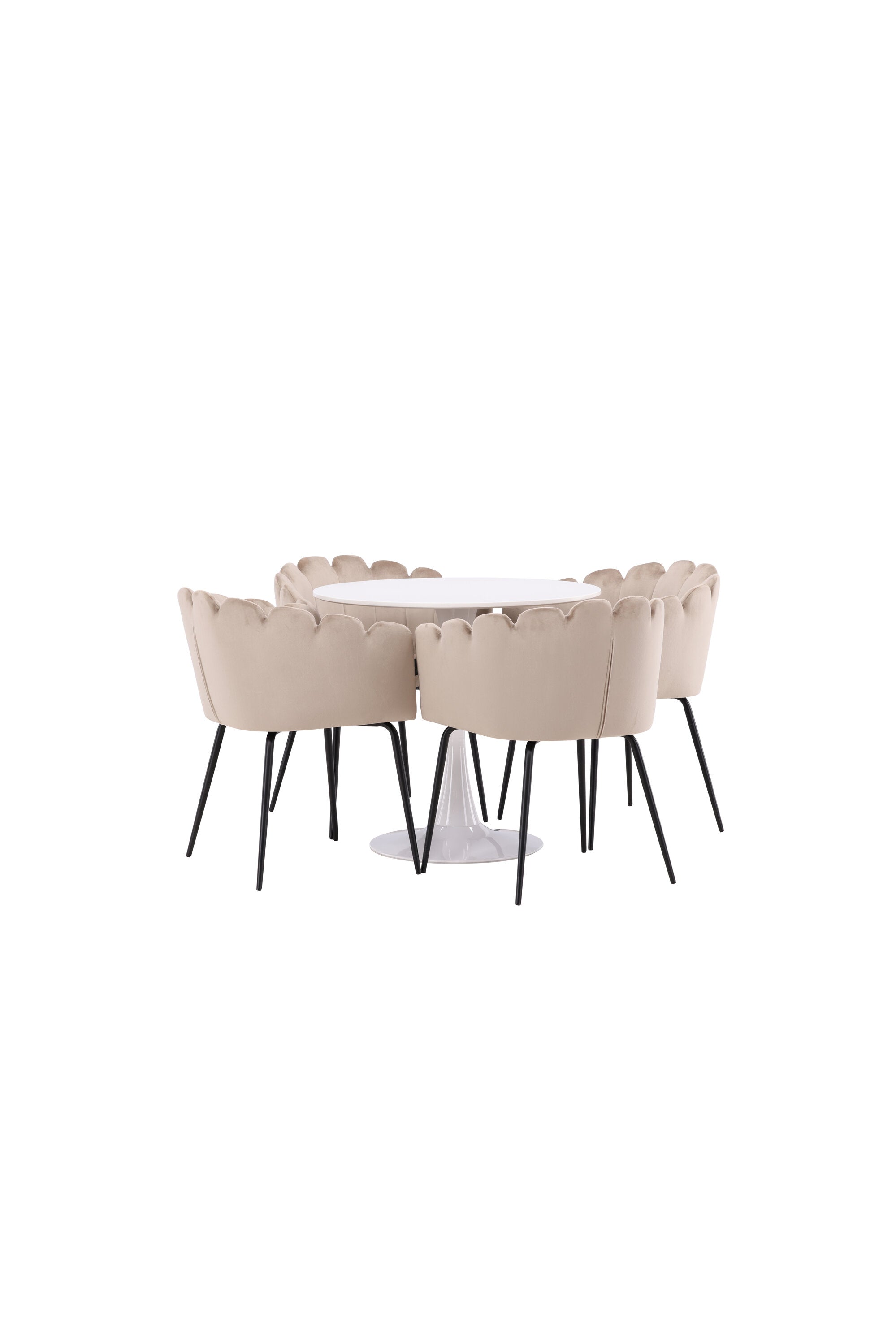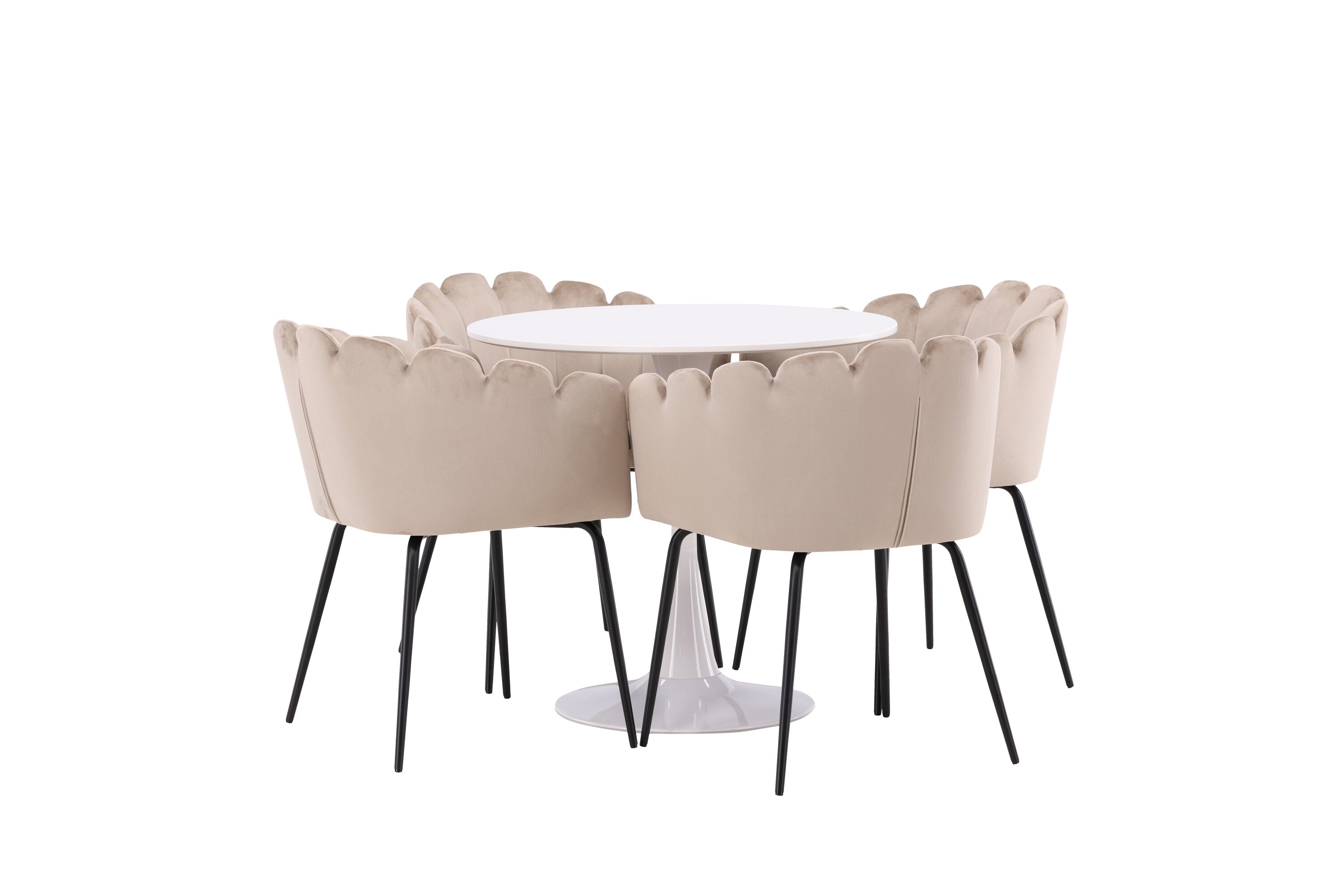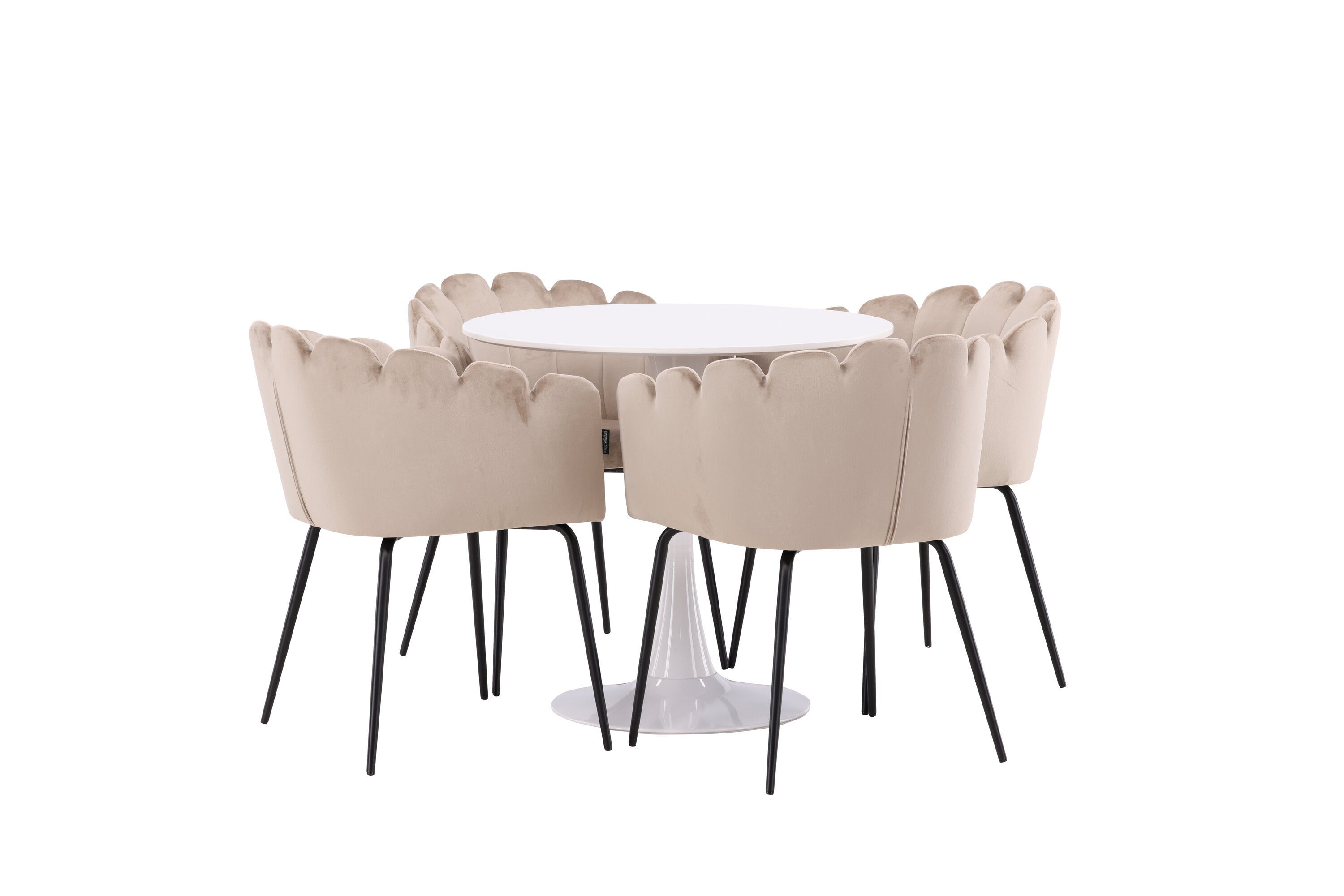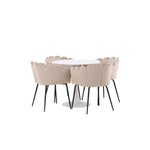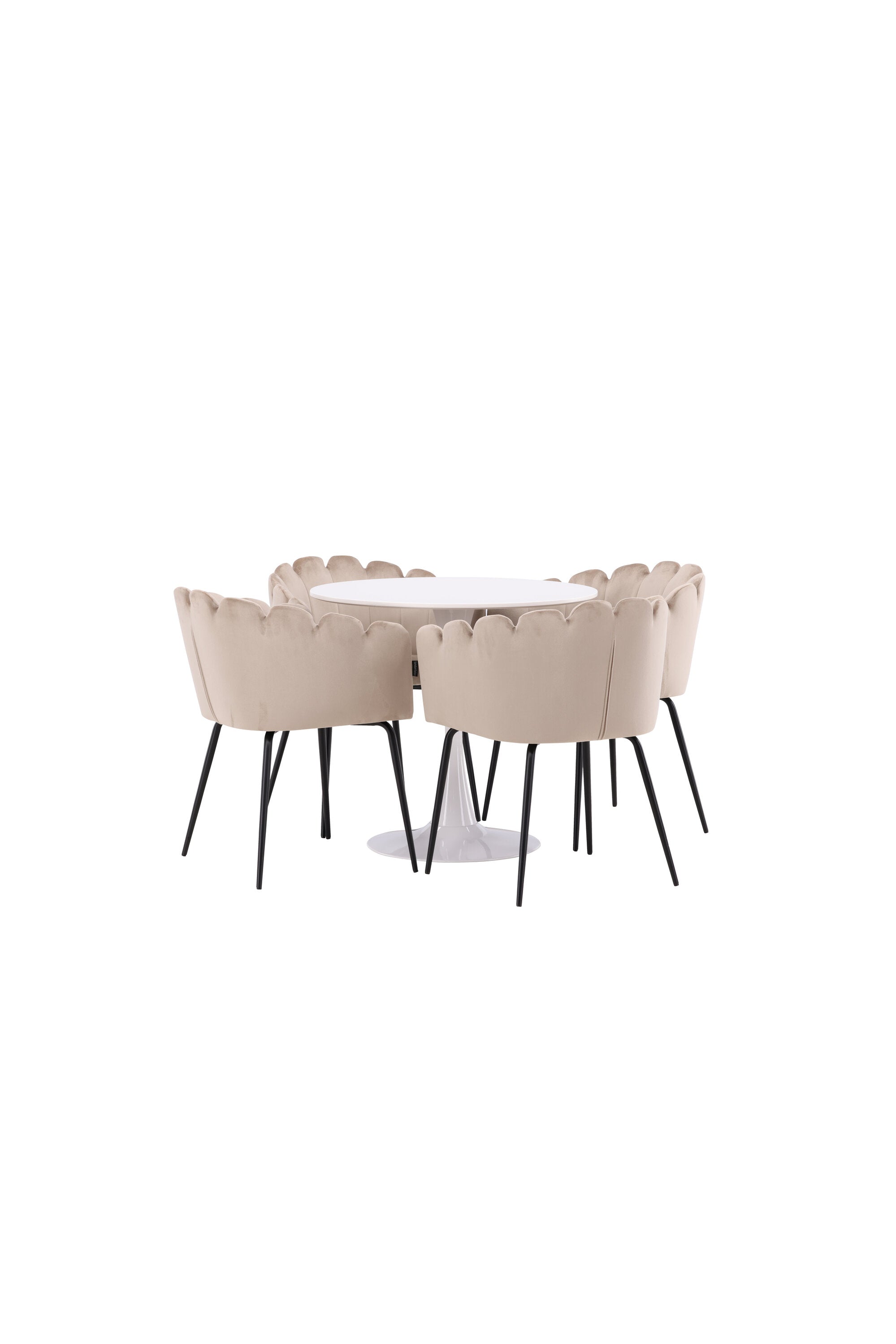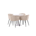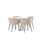 Objevte dokonalé spojení funkčnosti a stylu s touto praktickou a stylovou jídelní sadou od Venture Home. Jídelní set se skládá z moderních a elegantních židlí Limhamn a elegantního stolu Hamden. Tato jídelní souprava s bílou deskou a židlemi v béžovém odstínu vytváří moderní a sofistikovanou atmosféru.