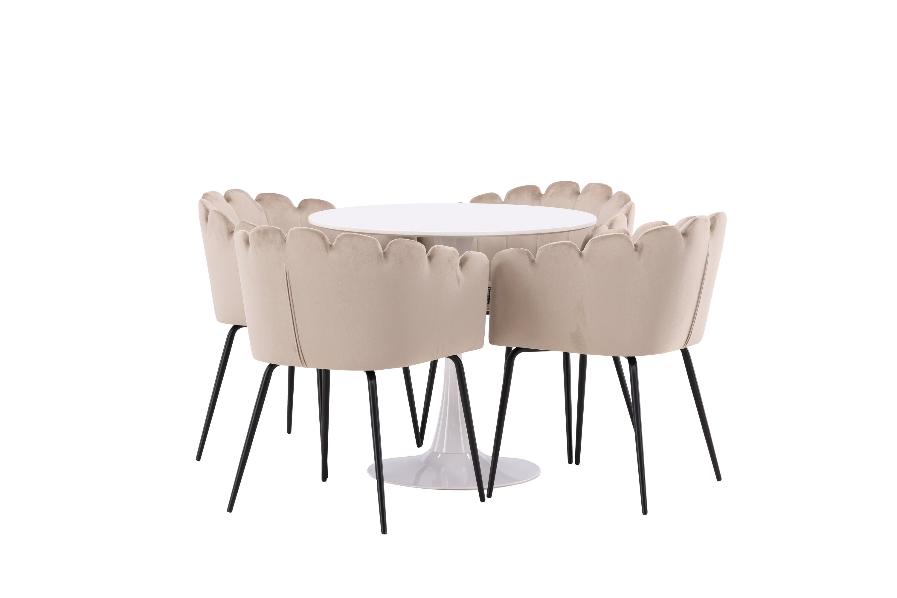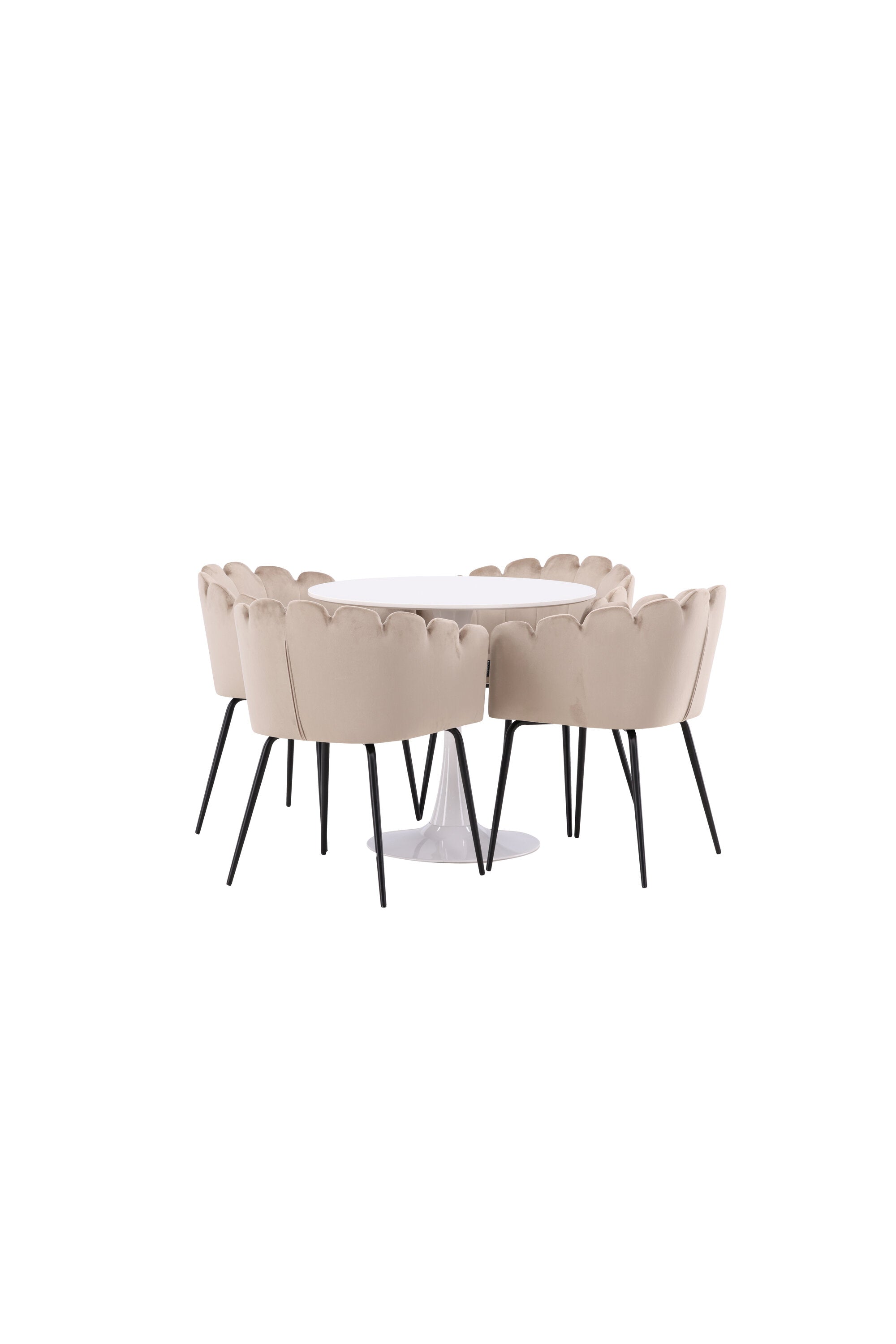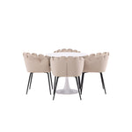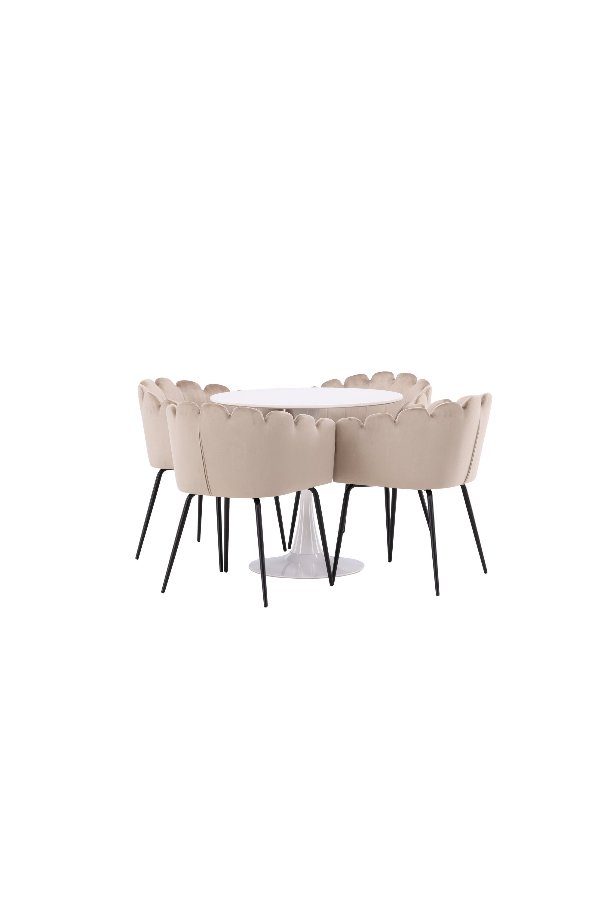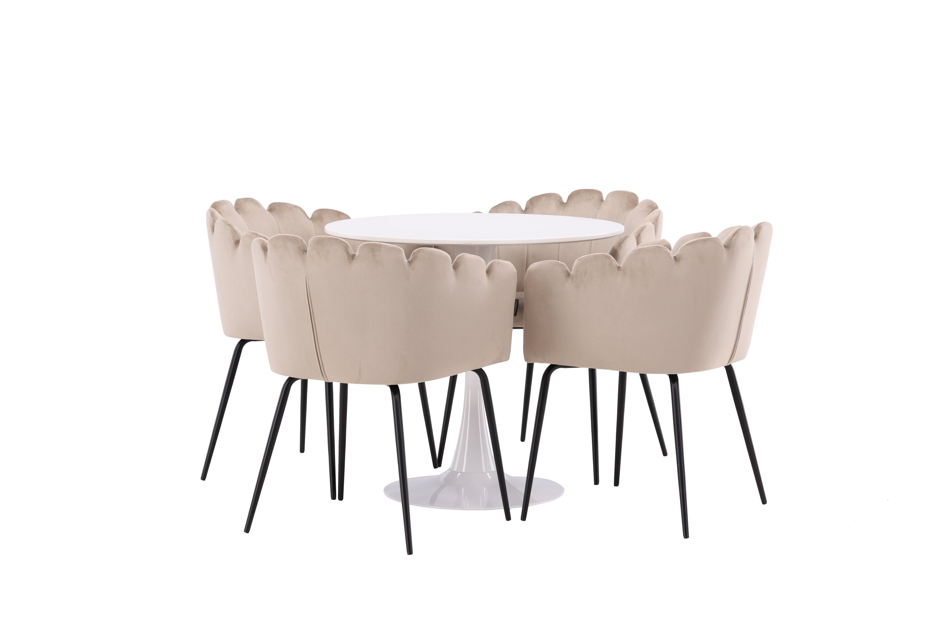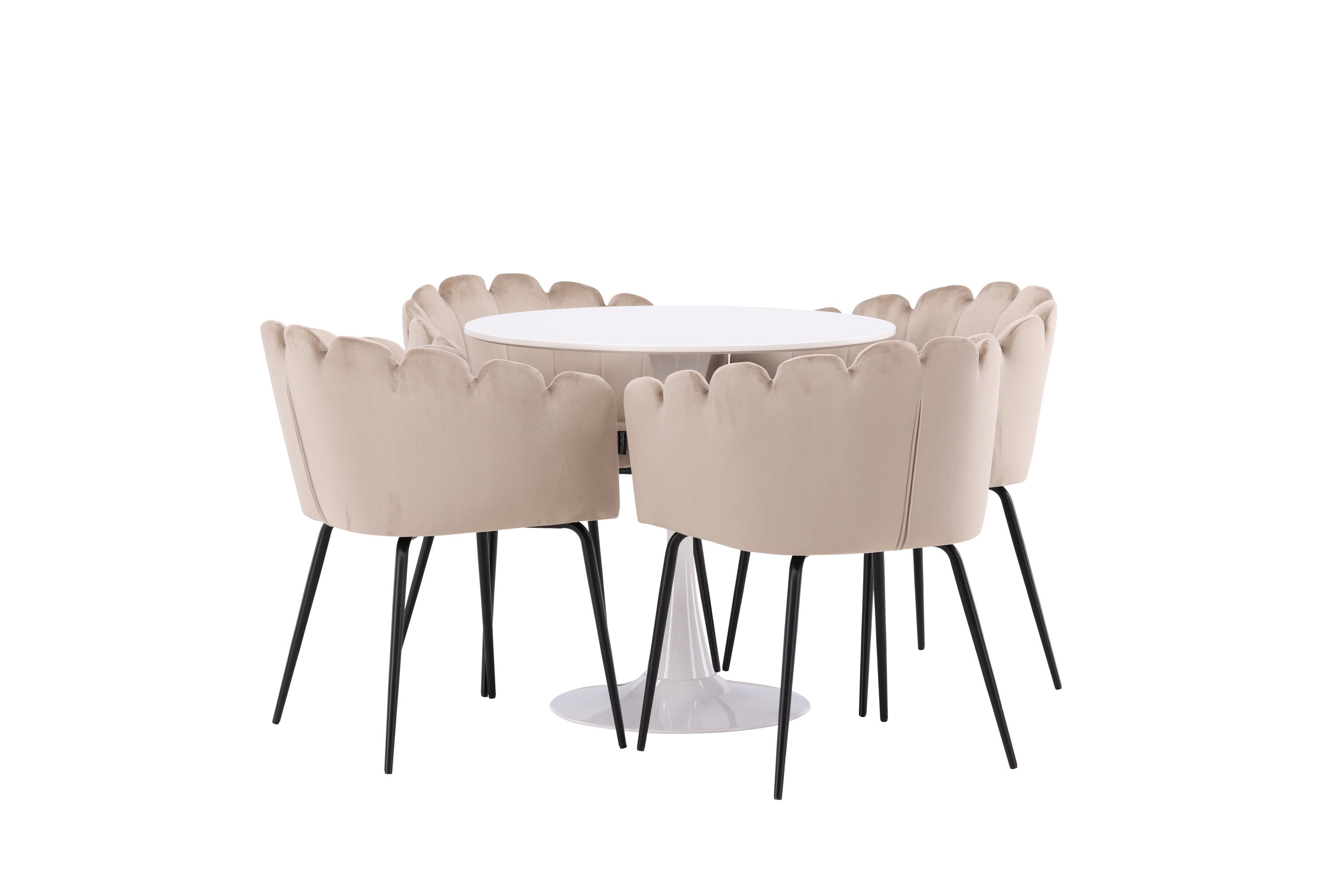 Objevte dokonalé spojení funkčnosti a stylu s touto praktickou a stylovou jídelní sadou od Venture Home. Jídelní set se skládá z moderních a elegantních židlí Limhamn a elegantního stolu Hamden. Tato jídelní souprava s bílou deskou a židlemi v béžovém odstínu vytváří moderní a sofistikovanou atmosféru.