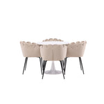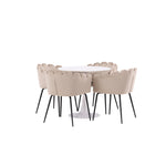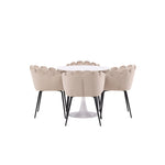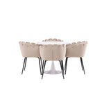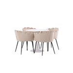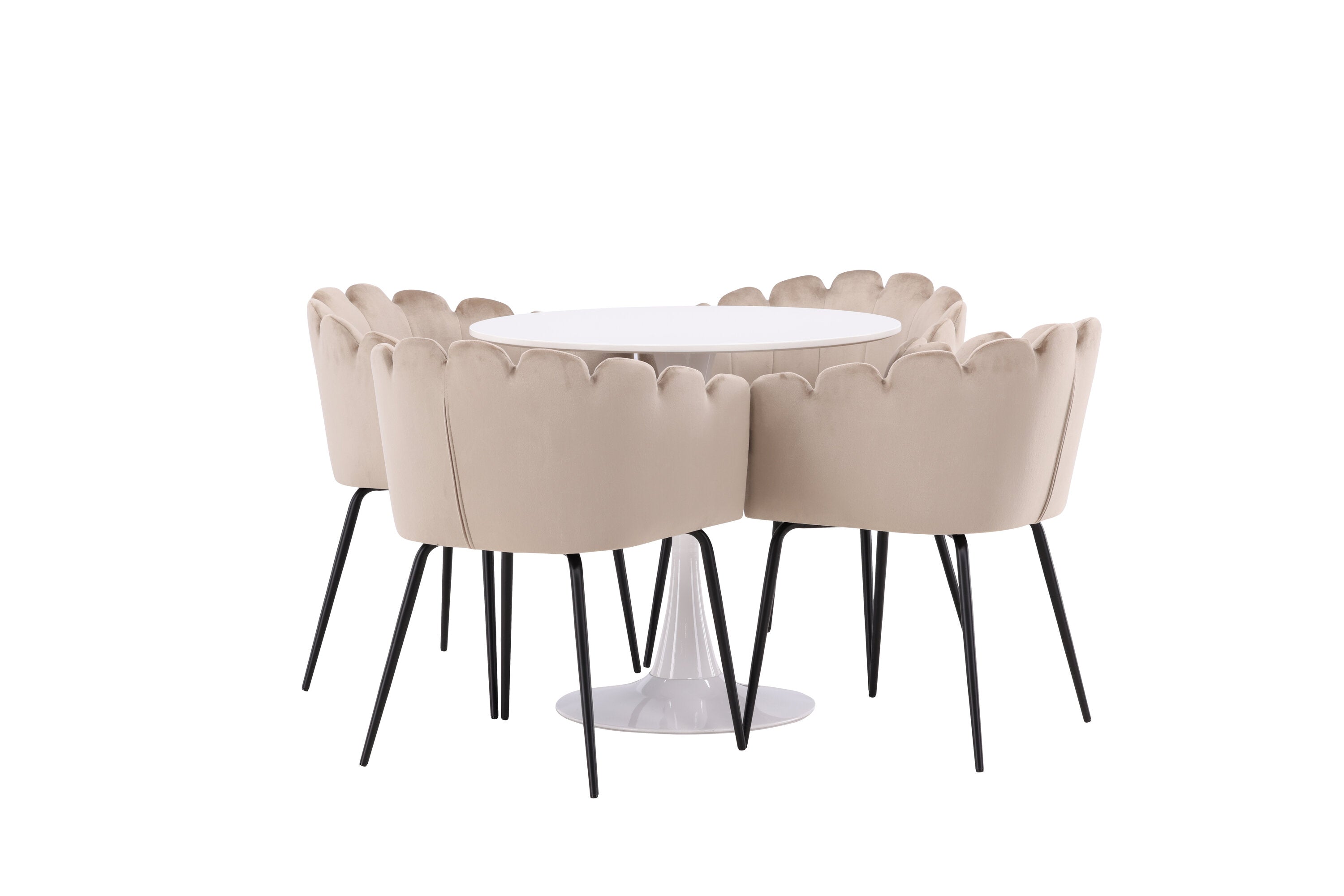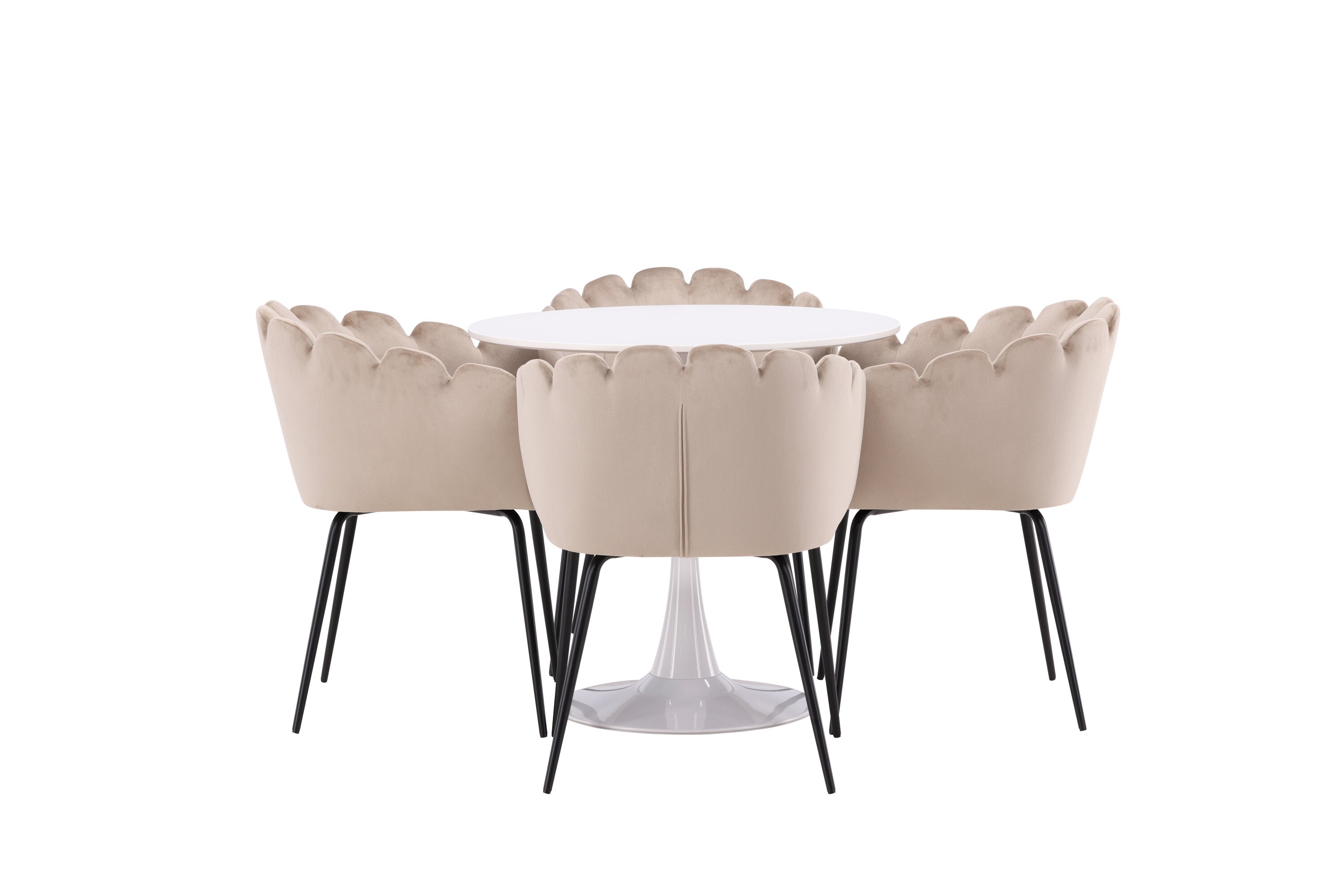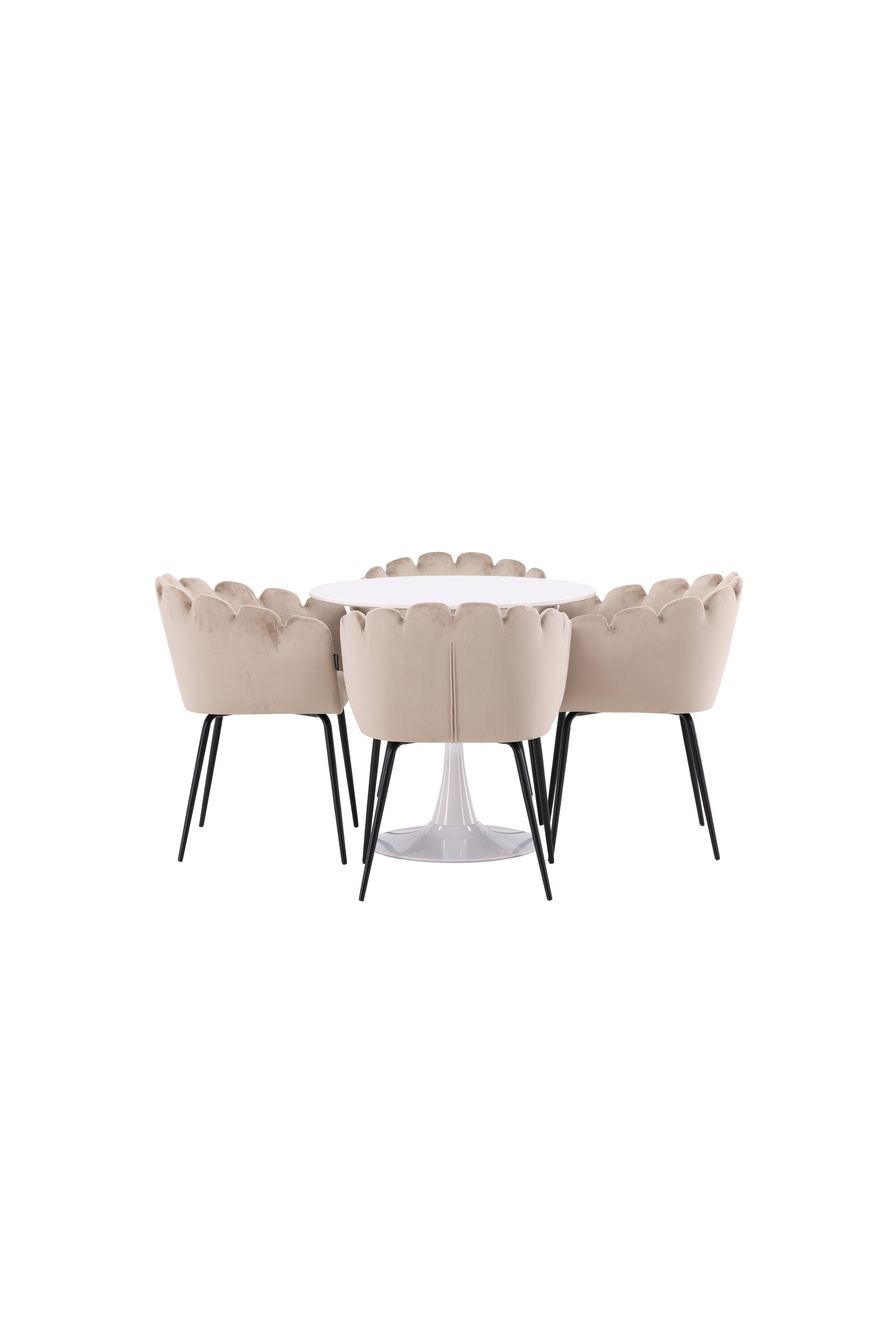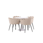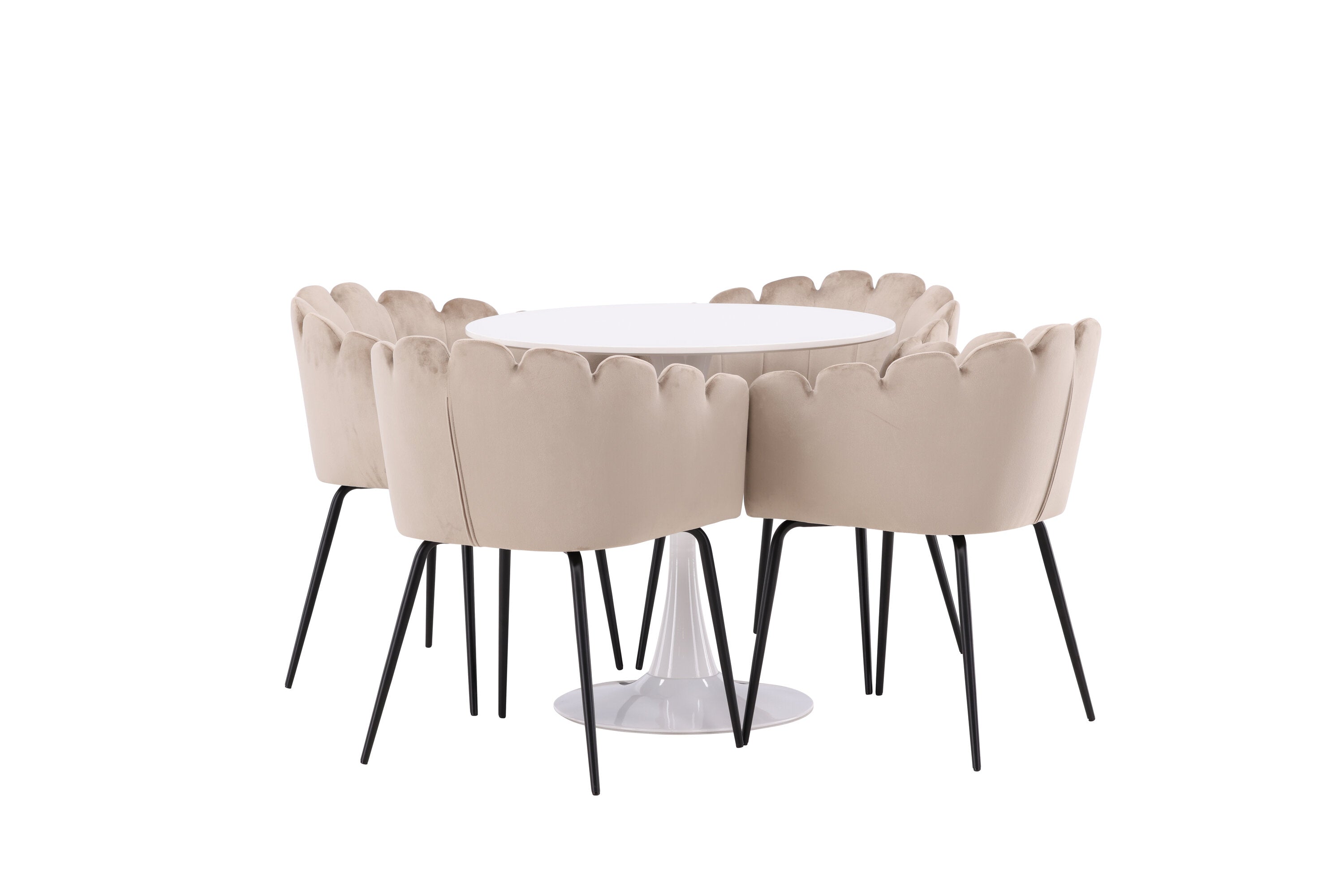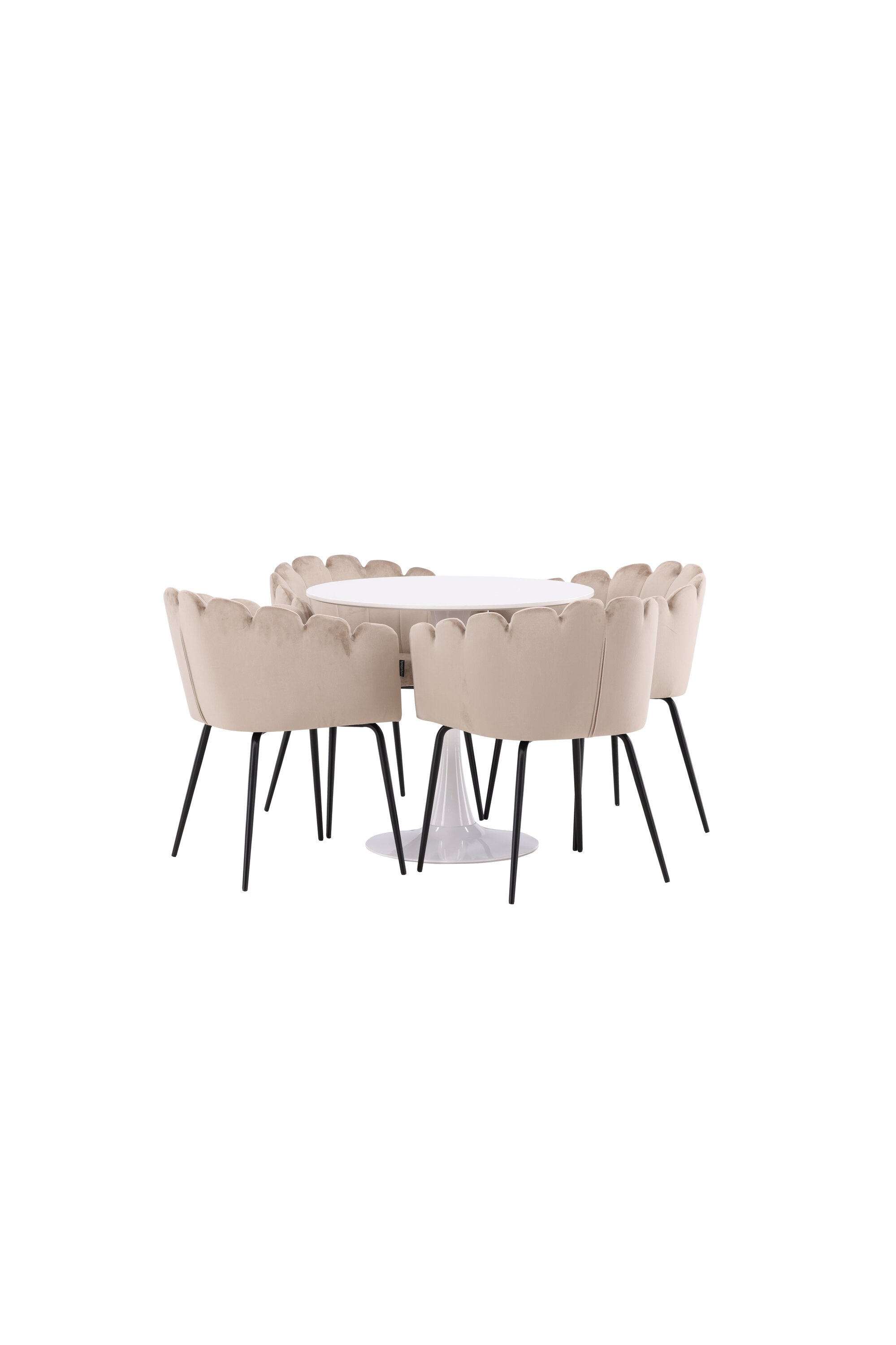 Objevte dokonalé spojení funkčnosti a stylu s touto praktickou a stylovou jídelní sadou od Venture Home. Jídelní set se skládá z moderních a elegantních židlí Limhamn a elegantního stolu Hamden. Tato jídelní souprava s bílou deskou a židlemi v béžovém odstínu vytváří moderní a sofistikovanou atmosféru.