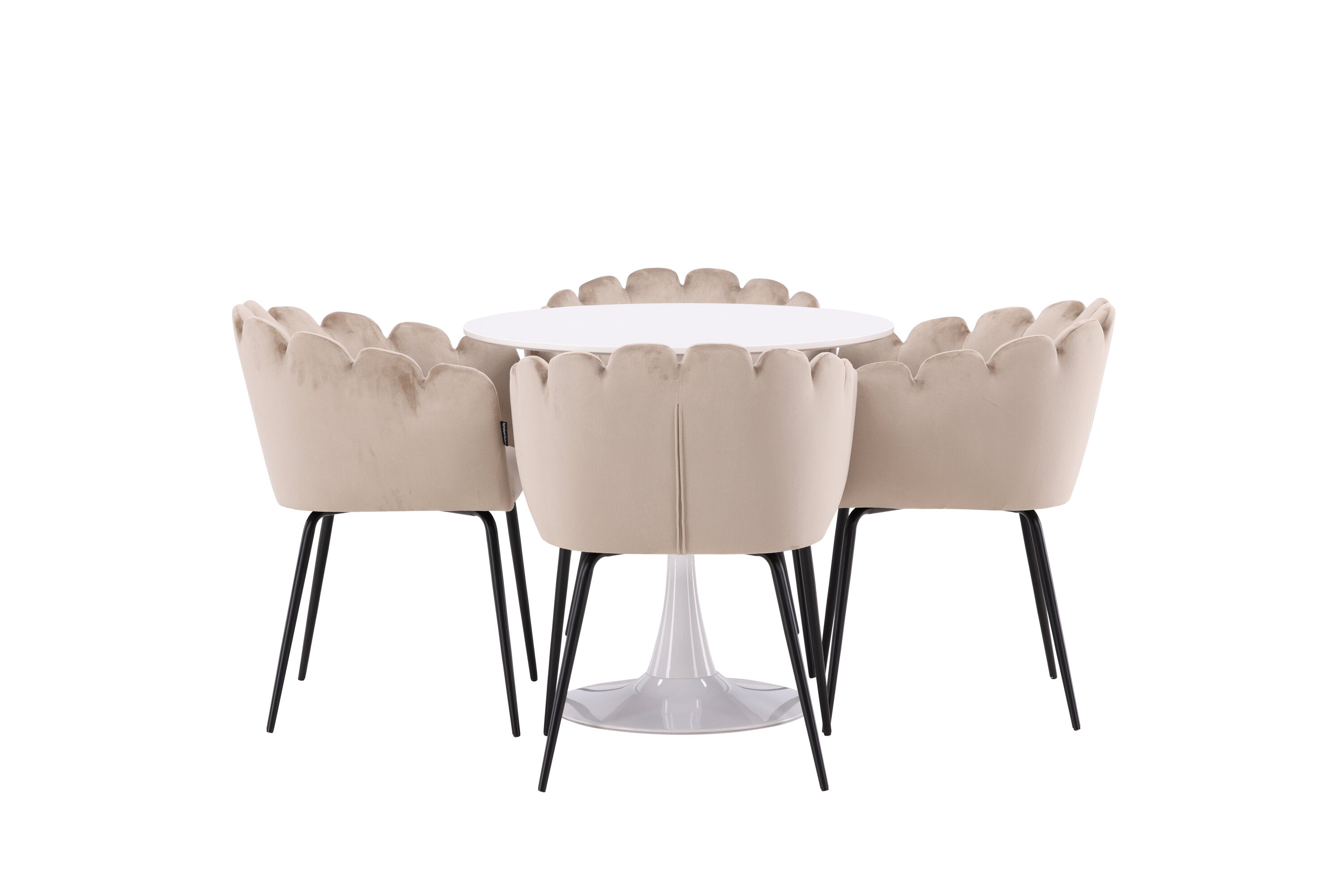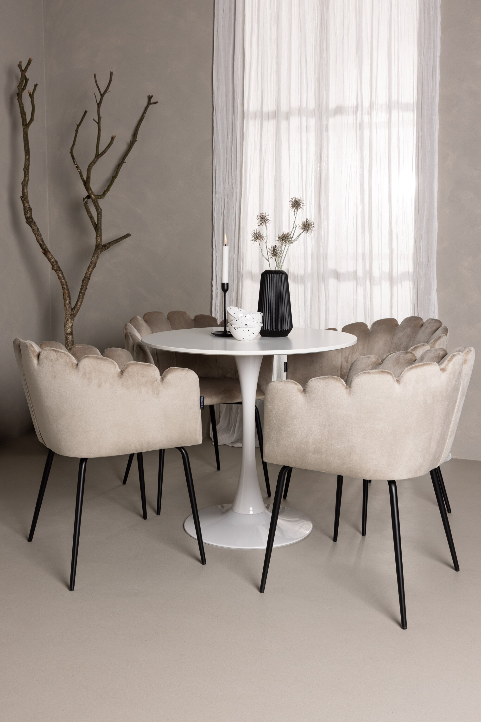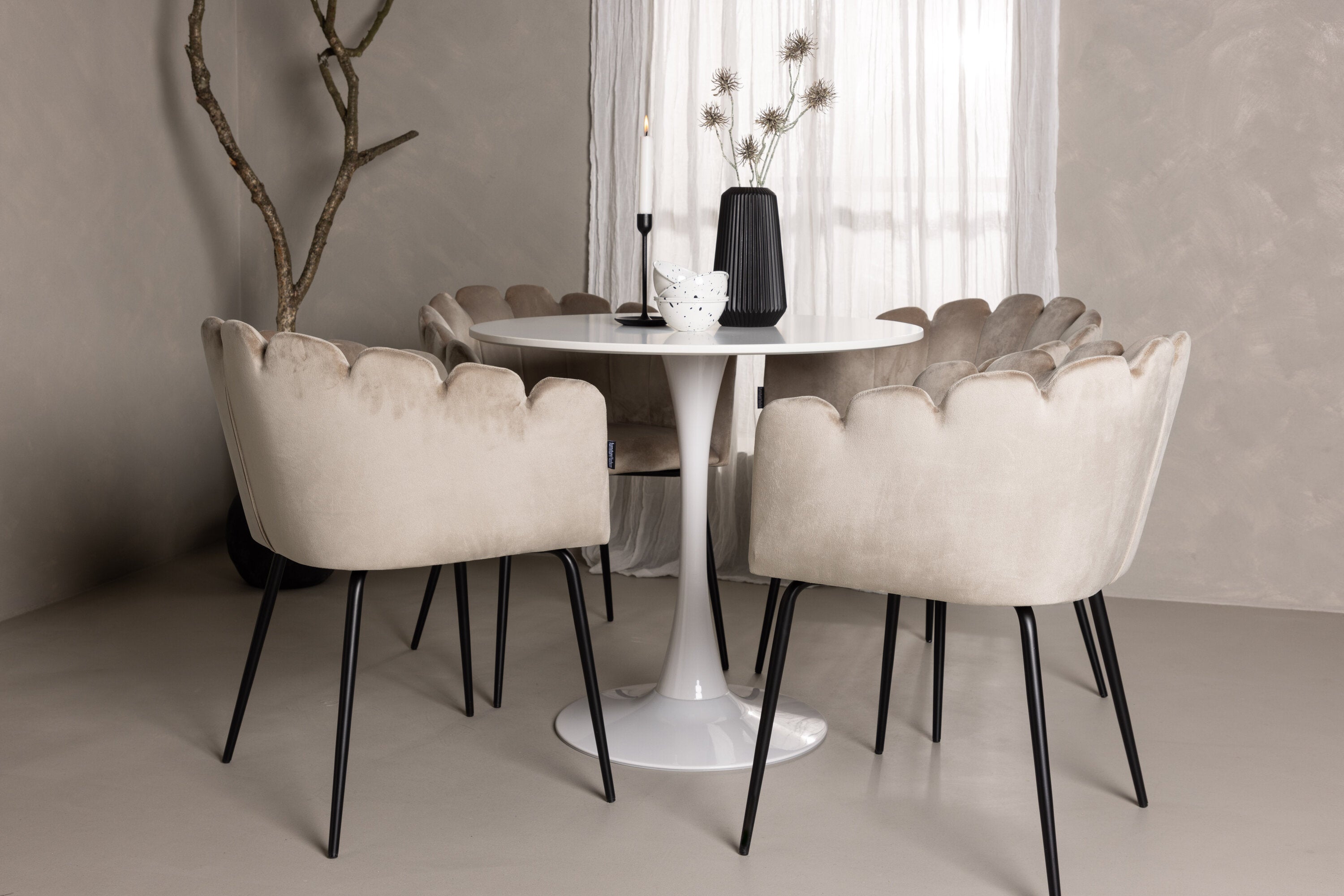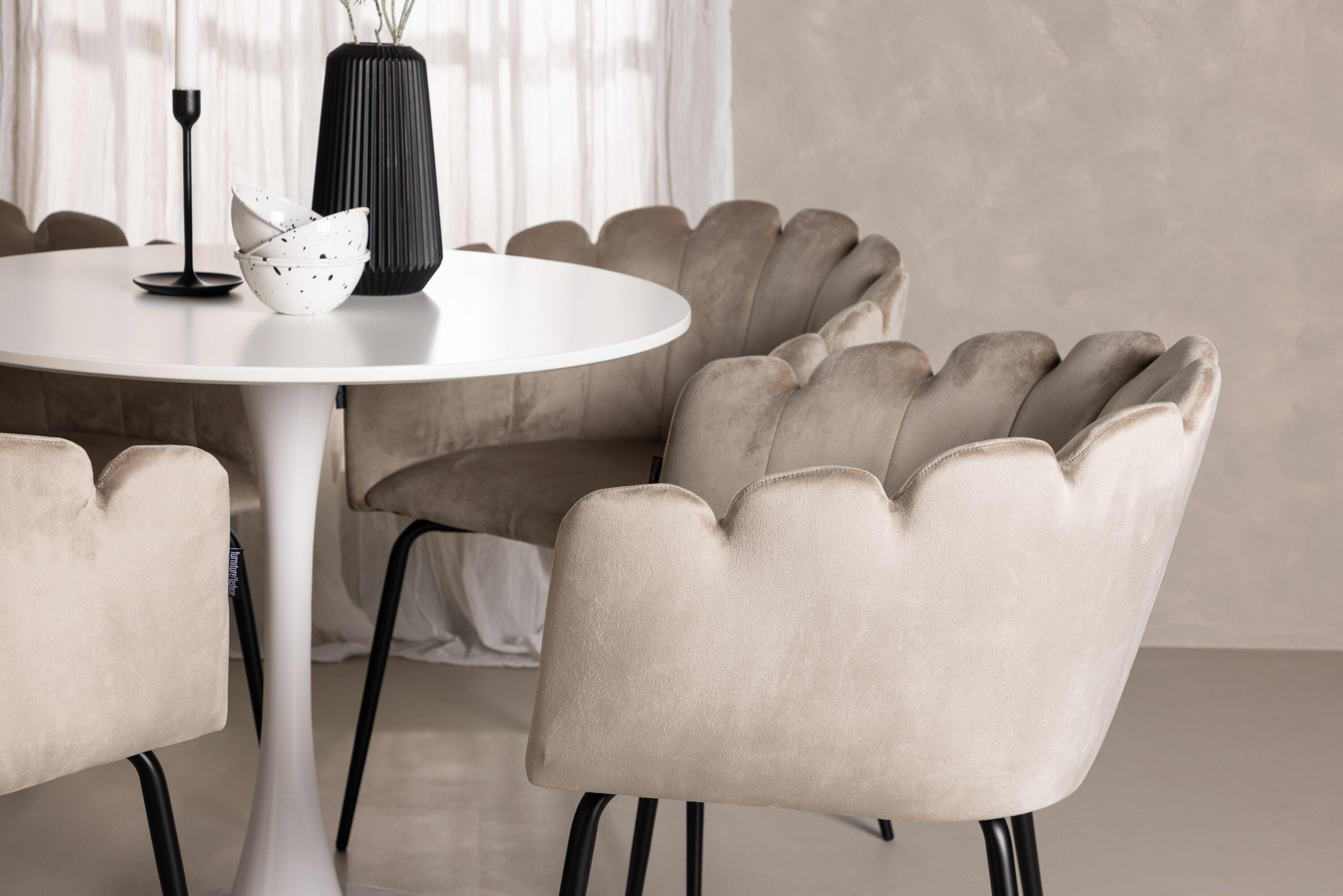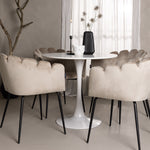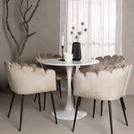 Stůl Hamden má výšku 75 cm a průměr 80 ​​cm, díky čemuž je kompaktní a všestranný. Bílá stolní deska přináší jasný a svěží pocit, zatímco béžové židle Limhamn dodávají jemný kontrast a přispívají k nadčasové estetice.