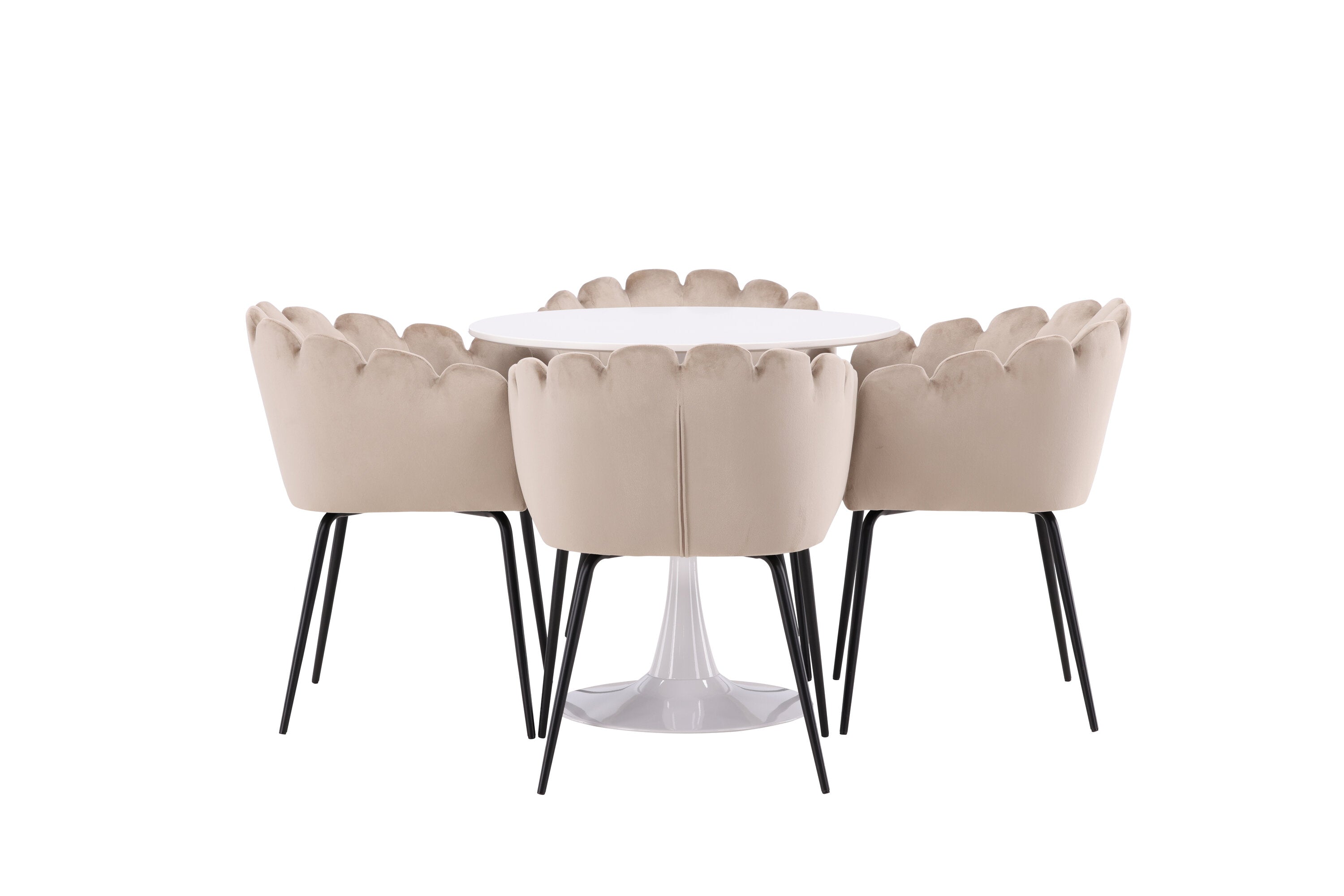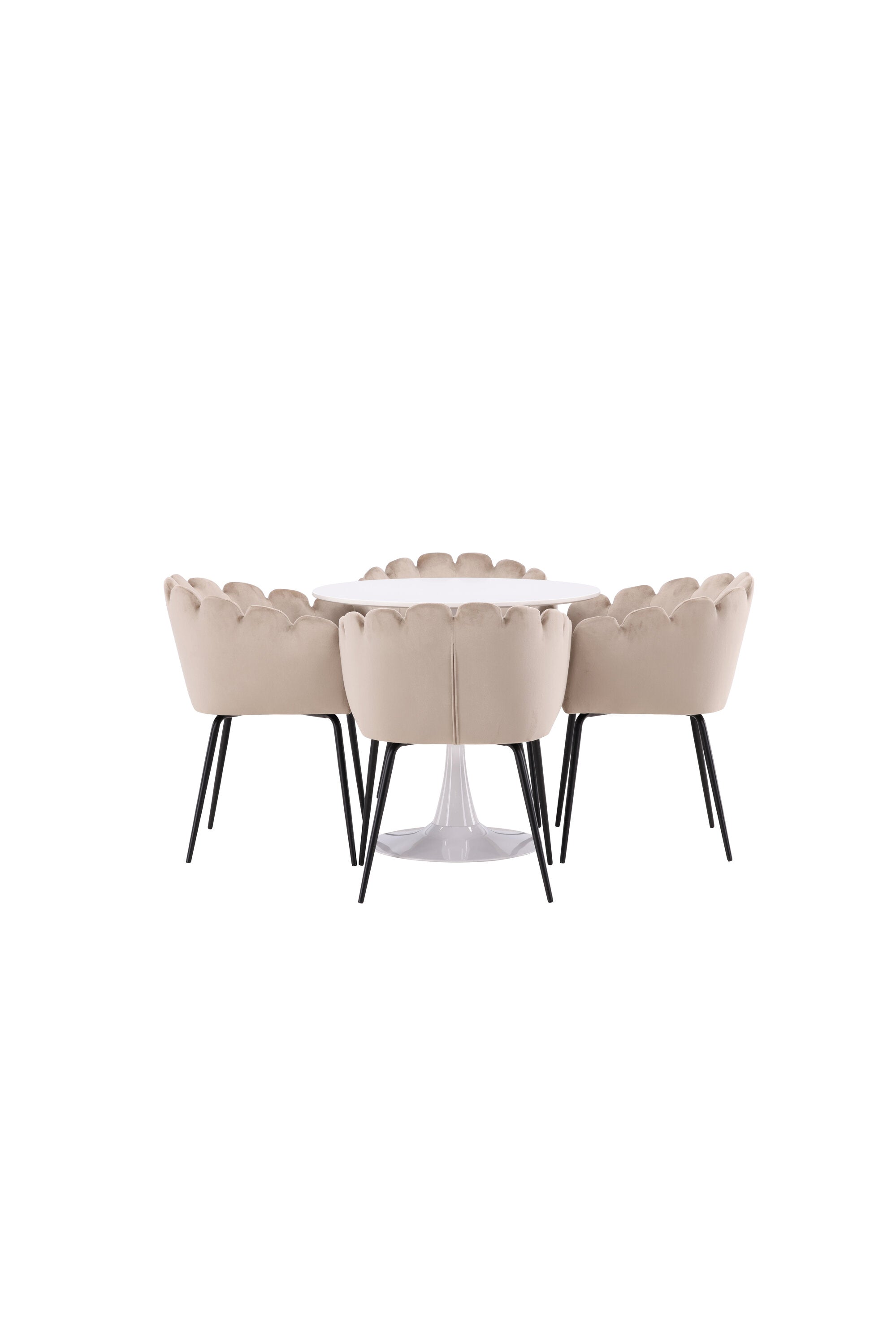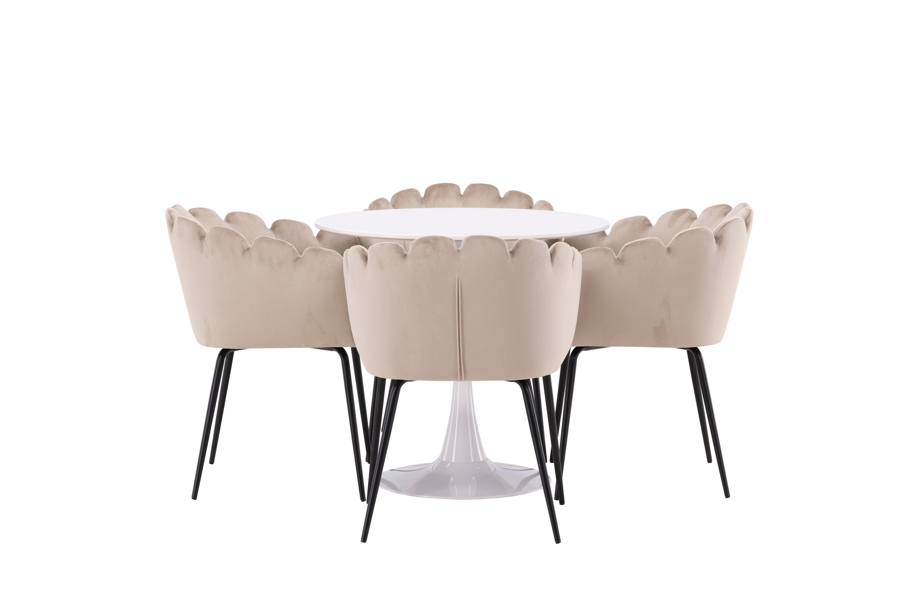 Stůl Hamden má výšku 75 cm a průměr 80 ​​cm, díky čemuž je kompaktní a všestranný. Bílá stolní deska přináší jasný a svěží pocit, zatímco béžové židle Limhamn dodávají jemný kontrast a přispívají k nadčasové estetice.