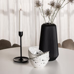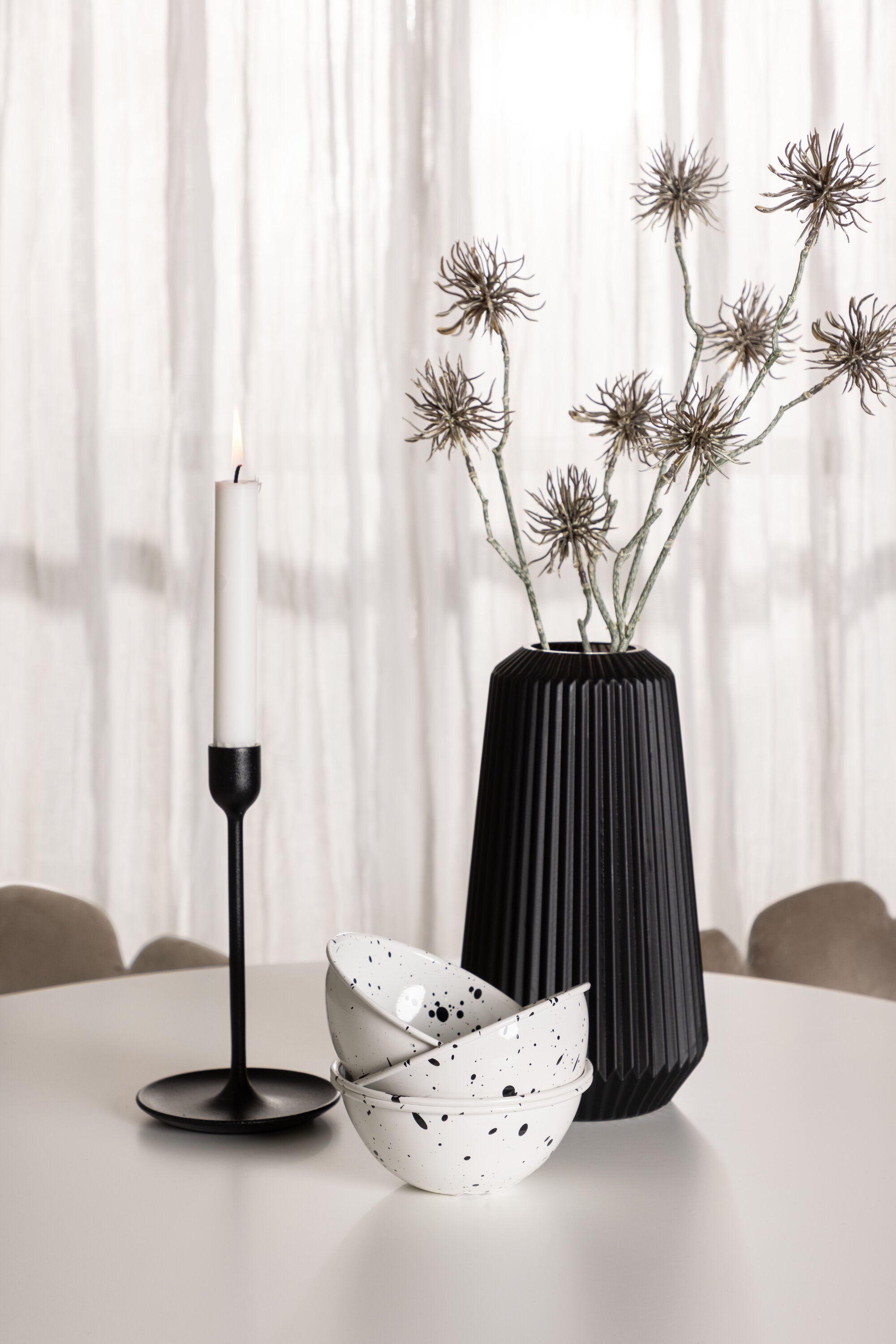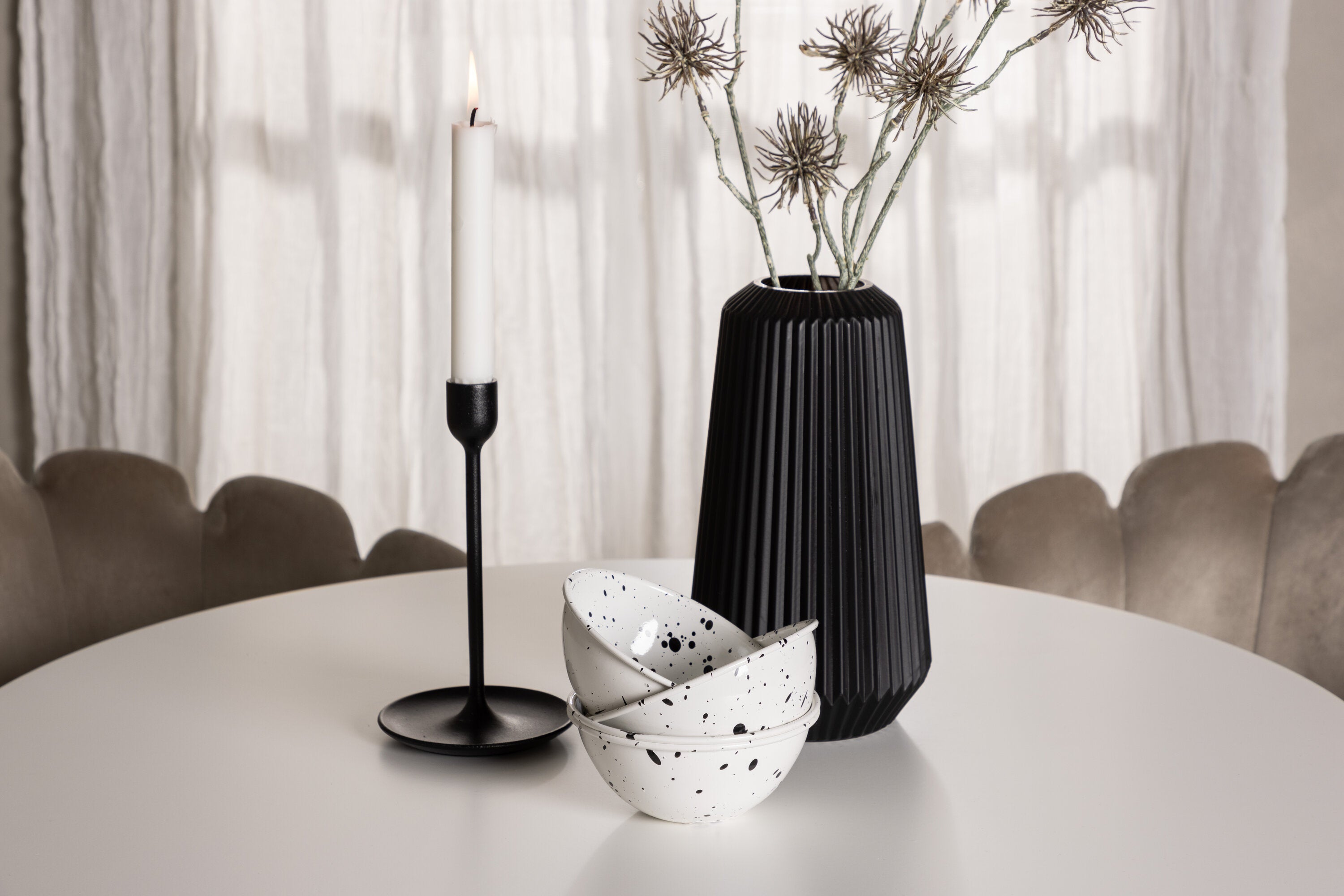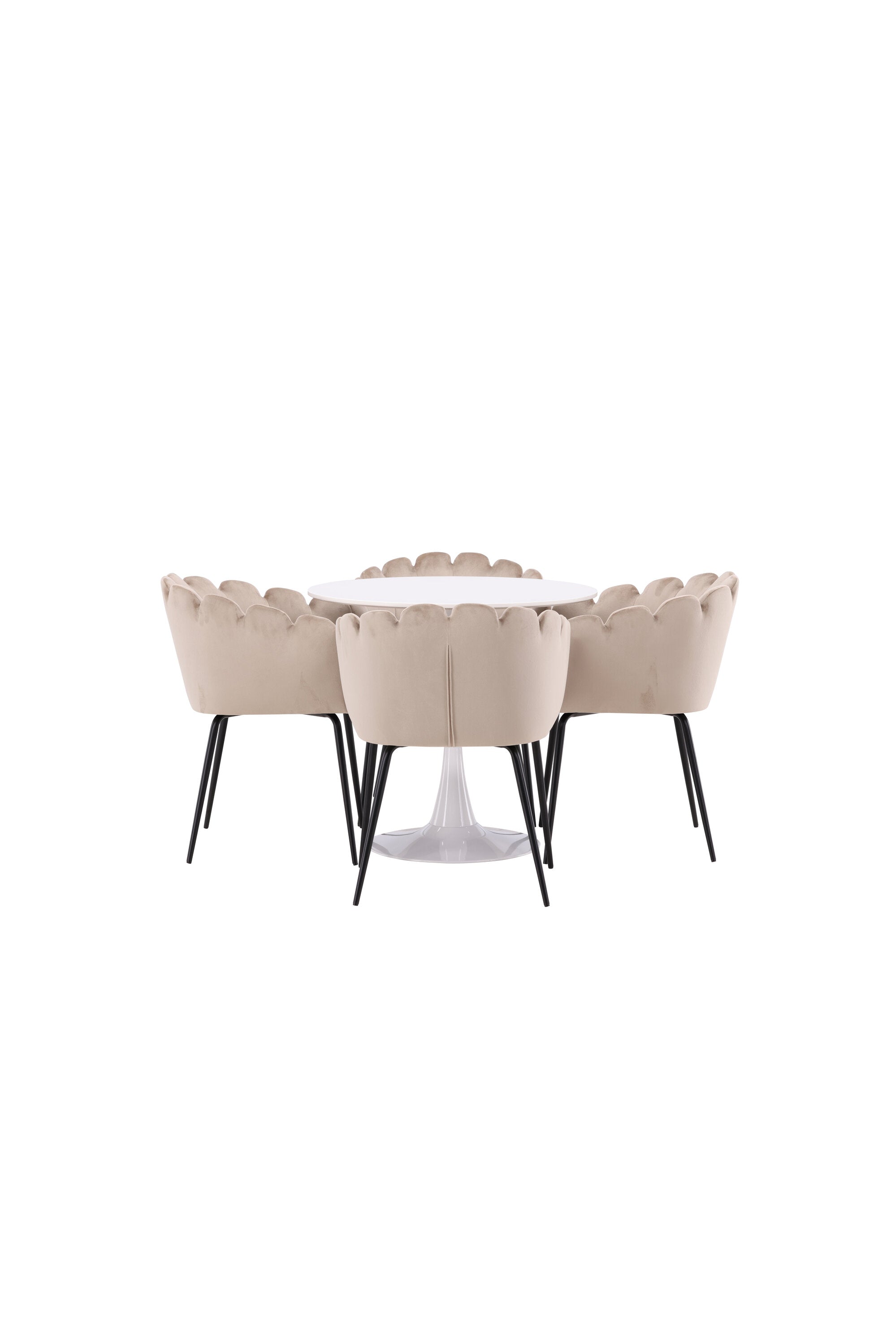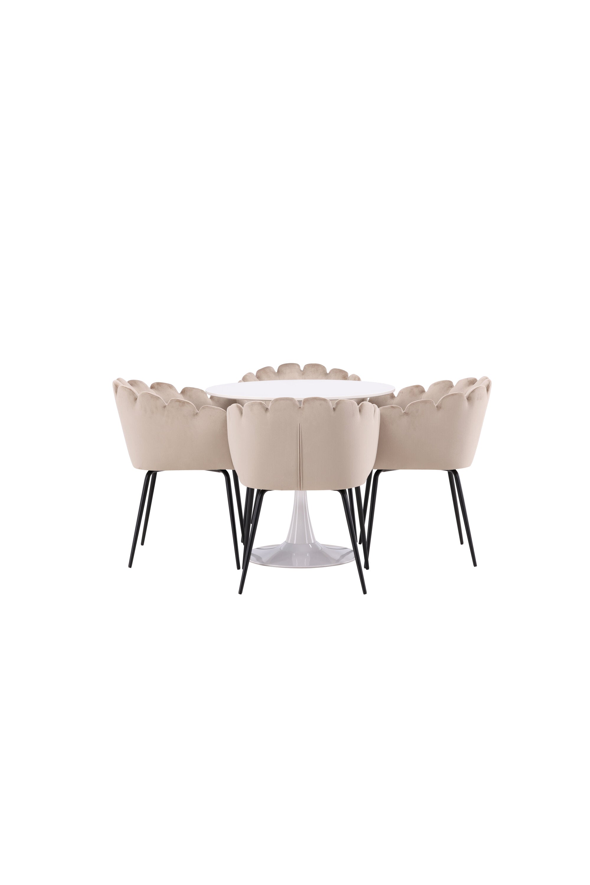 Stůl Hamden má výšku 75 cm a průměr 80 ​​cm, díky čemuž je kompaktní a všestranný. Bílá stolní deska přináší jasný a svěží pocit, zatímco béžové židle Limhamn dodávají jemný kontrast a přispívají k nadčasové estetice.