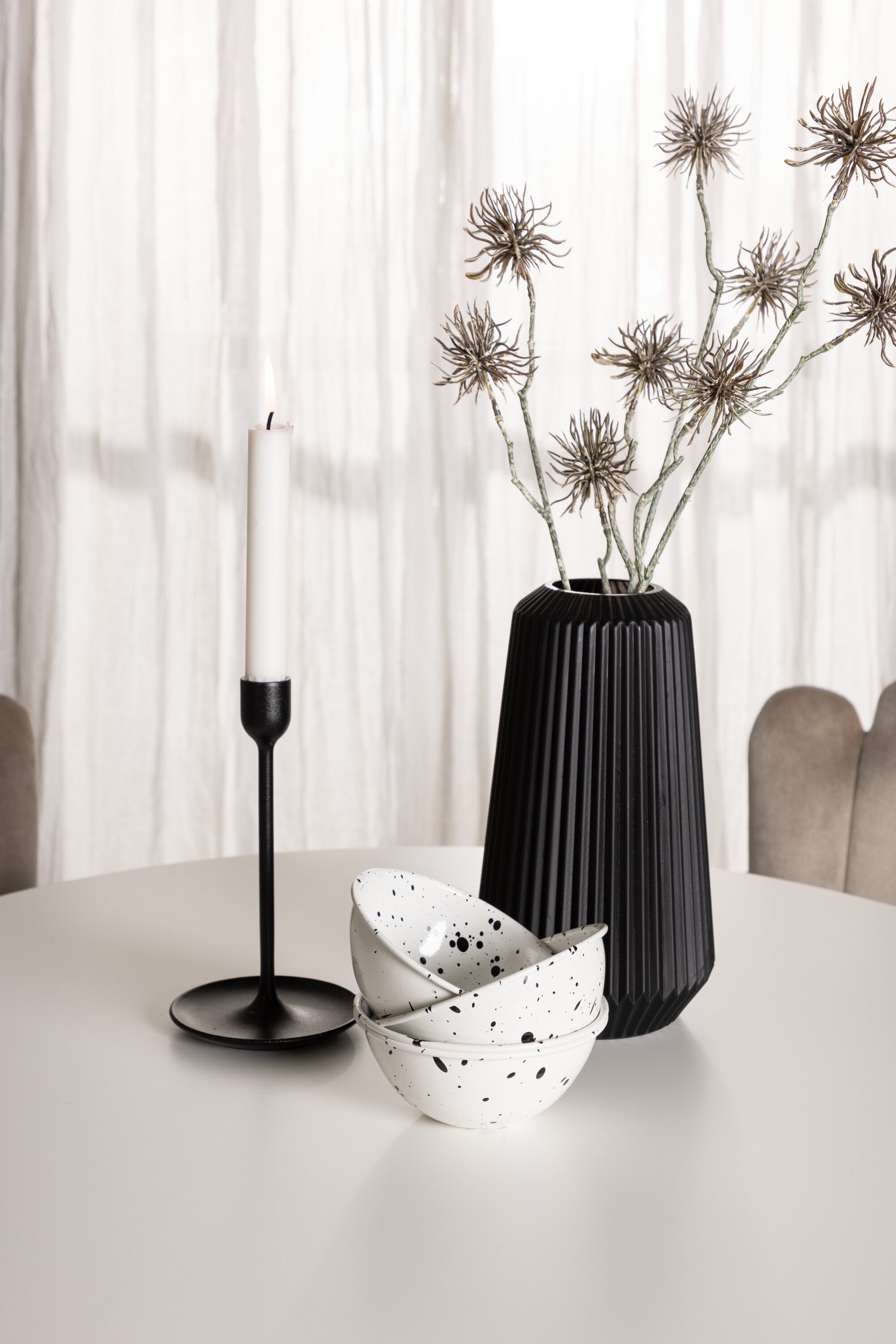 Srdcem toho všeho je výjimečný stůl Hamden. Tento kulatý stůl se svým průměrem 80 cm a výškou 75 cm není jen místem k jídlu; je to umělecká tvorba. Hladká deska stolu z MDF není jen vzhledově příjemná – je také odolná a snadno se udržuje, takže je ideální volbou pro každodenní život.