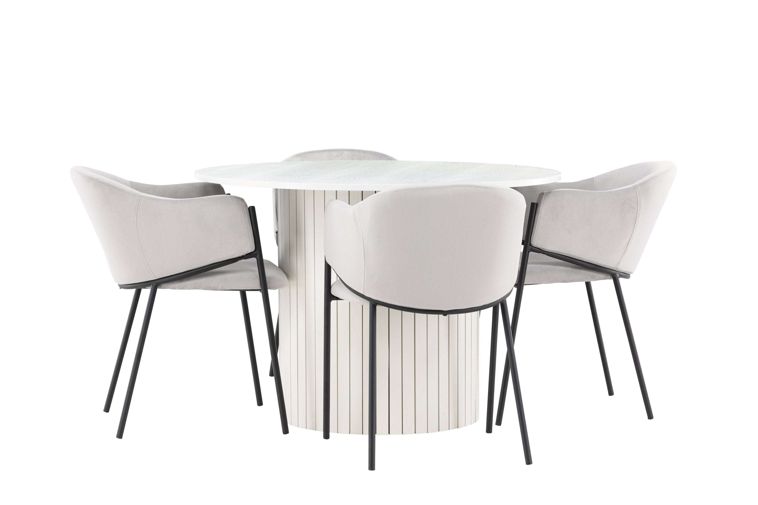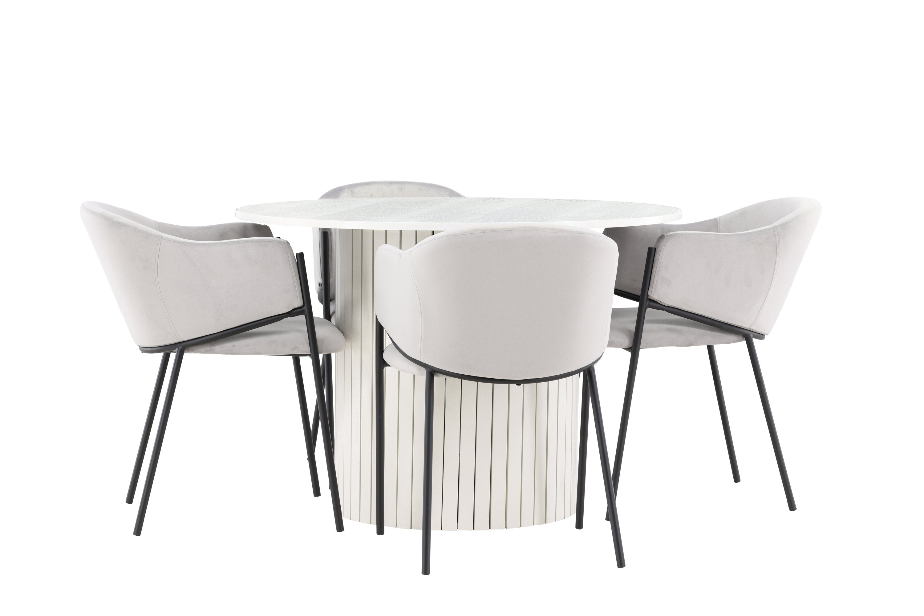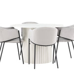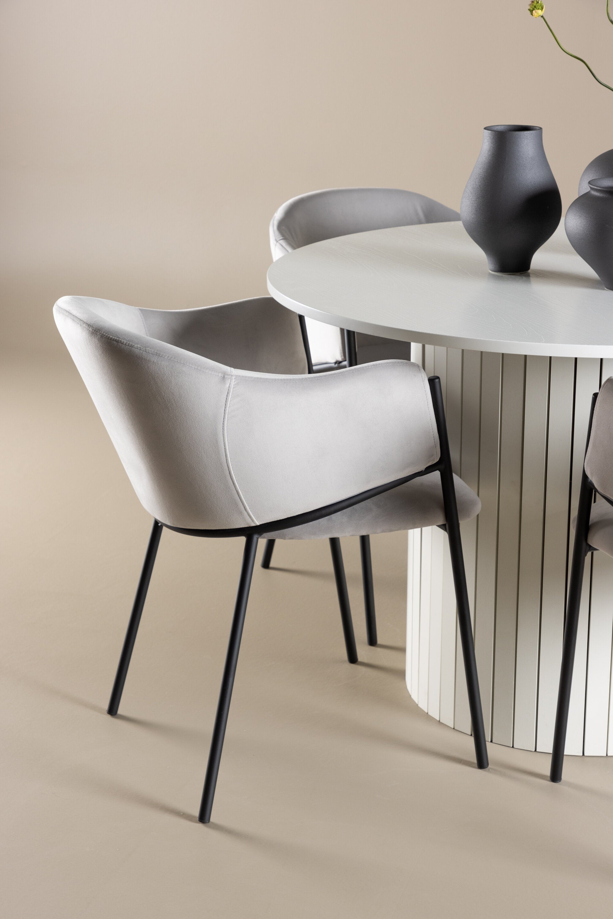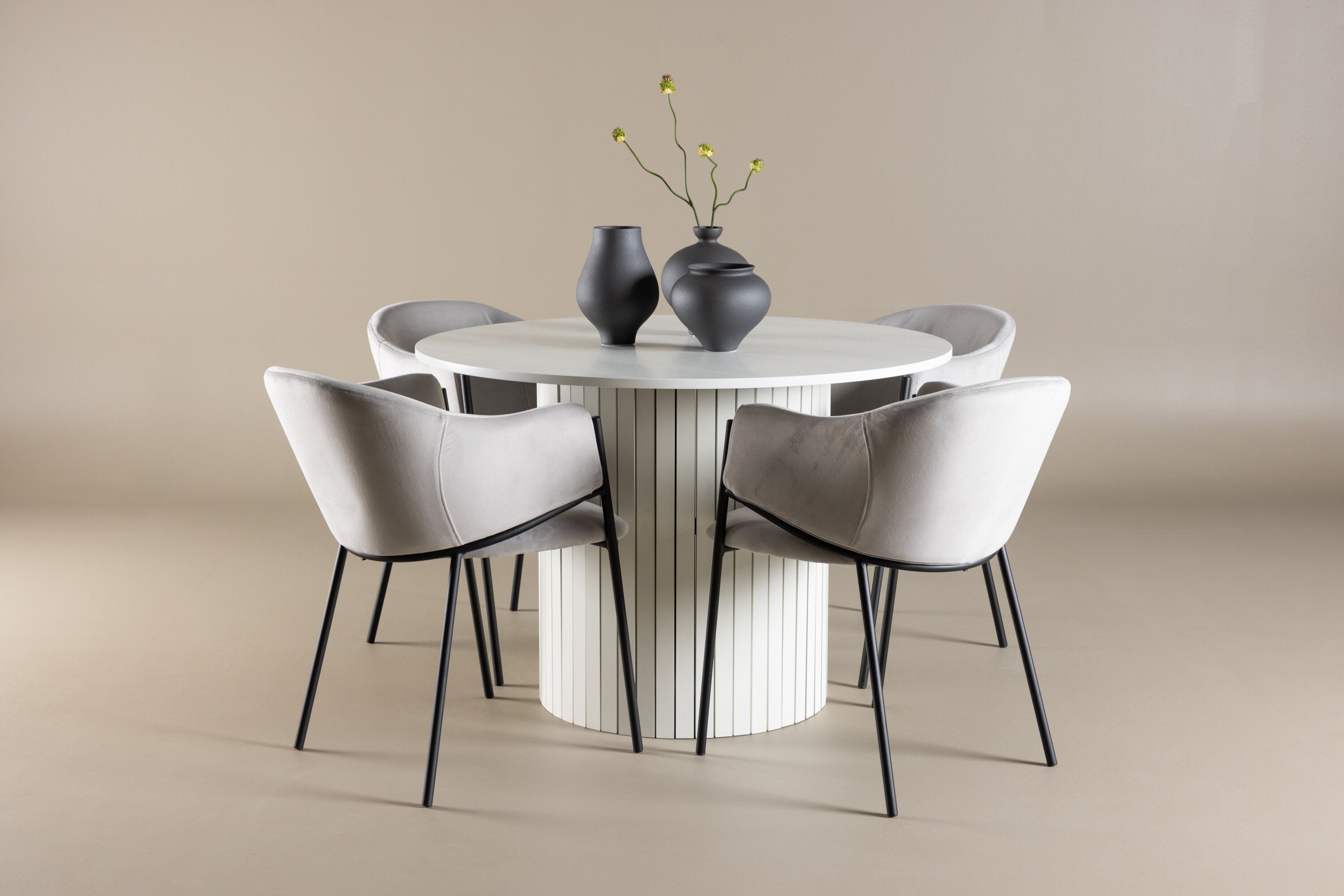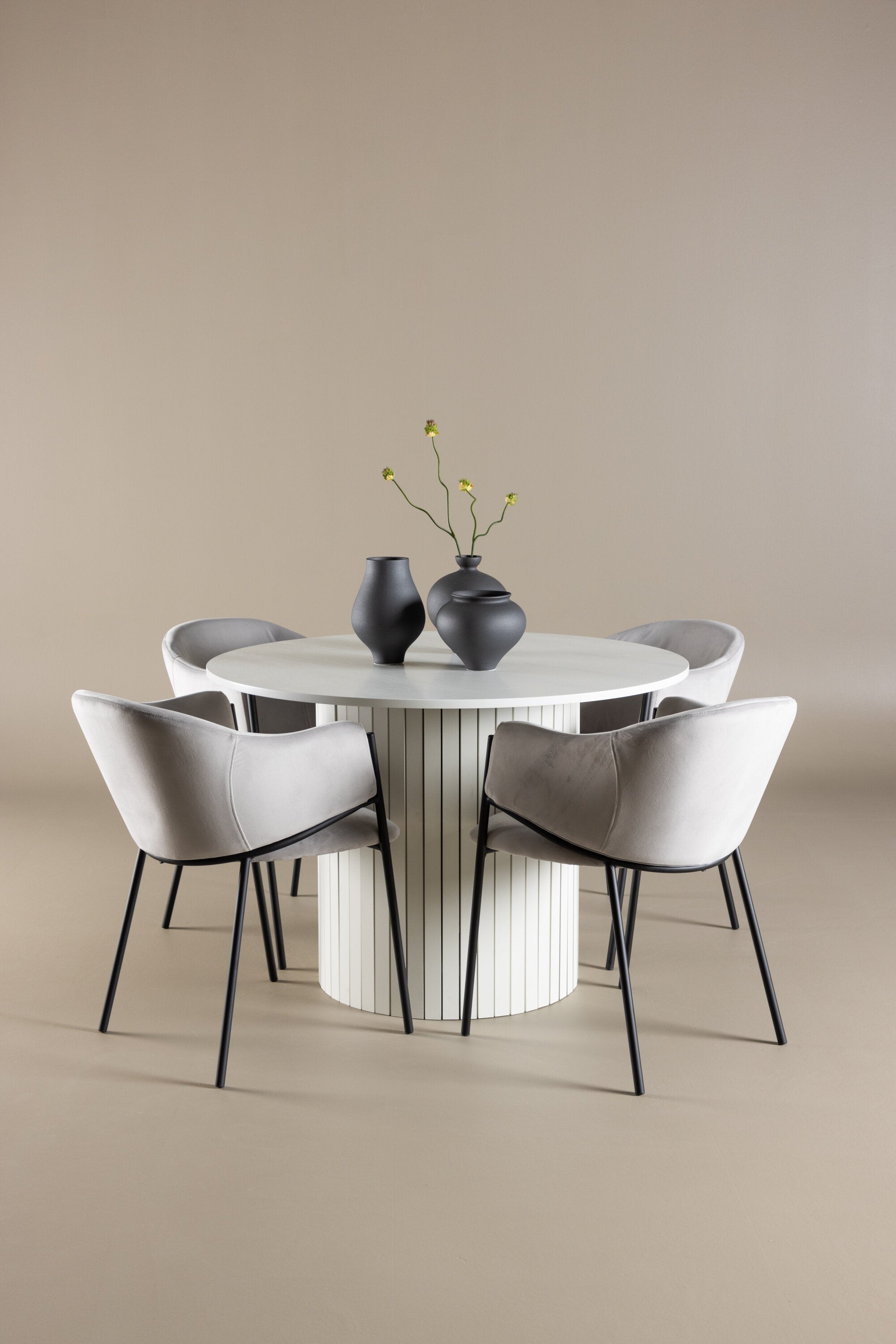Vytvořte si stylový a příjemný jídelní kout s naší elegantní jídelní sadou, která kombinuje moderní stůl Häron s pohodlnými židlemi Evelina. Tato jídelní souprava, která je ideální jak pro každodenní večeři, tak pro slavnostní příležitosti, dodá vaší jídelně sofistikovaný a moderní pocit. Stůl Häron vyrobený z MDF má čistě bílou barvu, která dodá vaší jídelně světlou a svěží atmosféru. Stůl s průměrem 110 cm nabízí dostatek prostoru pro jídlo i rozhovory, přičemž jeho kulatý tvar vytváří harmonické a vyvážené prostředí. Robustní konstrukce stolu zajišťuje dlouhodobé používání a stabilitu. Čtyři židle Evelina se svými elegantními šedými sametovými sedáky skvěle doplňují stůl. Tyto židle nabízejí pohodlí i styl, takže jsou ideální pro dlouhé a příjemné večeře s rodinou a přáteli. Jejich moderní design s vysokými opěradly a měkkými sedáky dodá vaší jídelně sofistikovaný a moderní nádech. Tato jídelní souprava je dokonalou kombinací estetiky a funkčnosti, takže je vynikající volbou pro ty, kteří hledají elegantní a pohodlný jídelní kout. Vylepšete svou jídelnu kombinací stolu Häron a židlí Evelina a vytvořte si místo, kde se budou sdílet vzpomínky a radost.