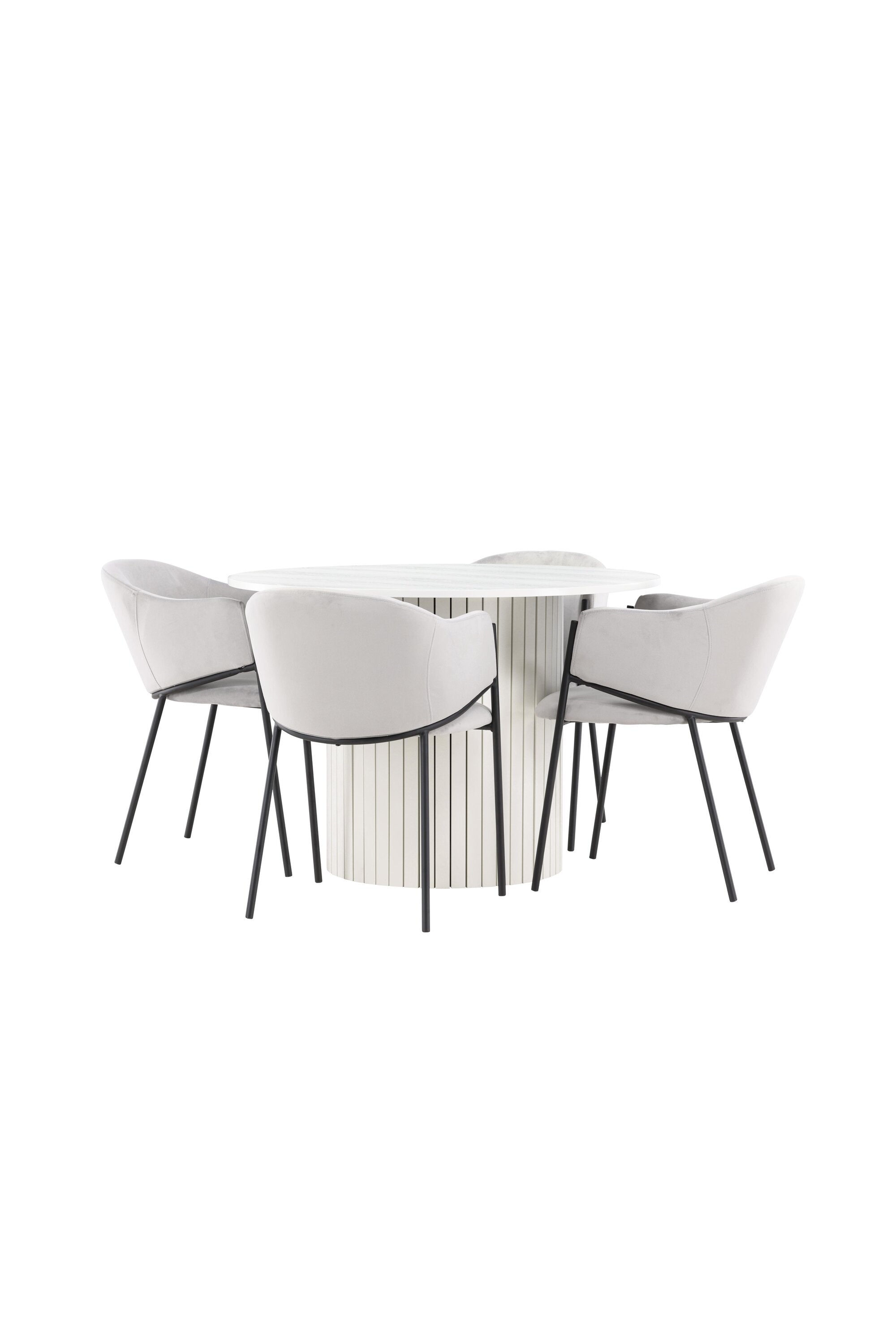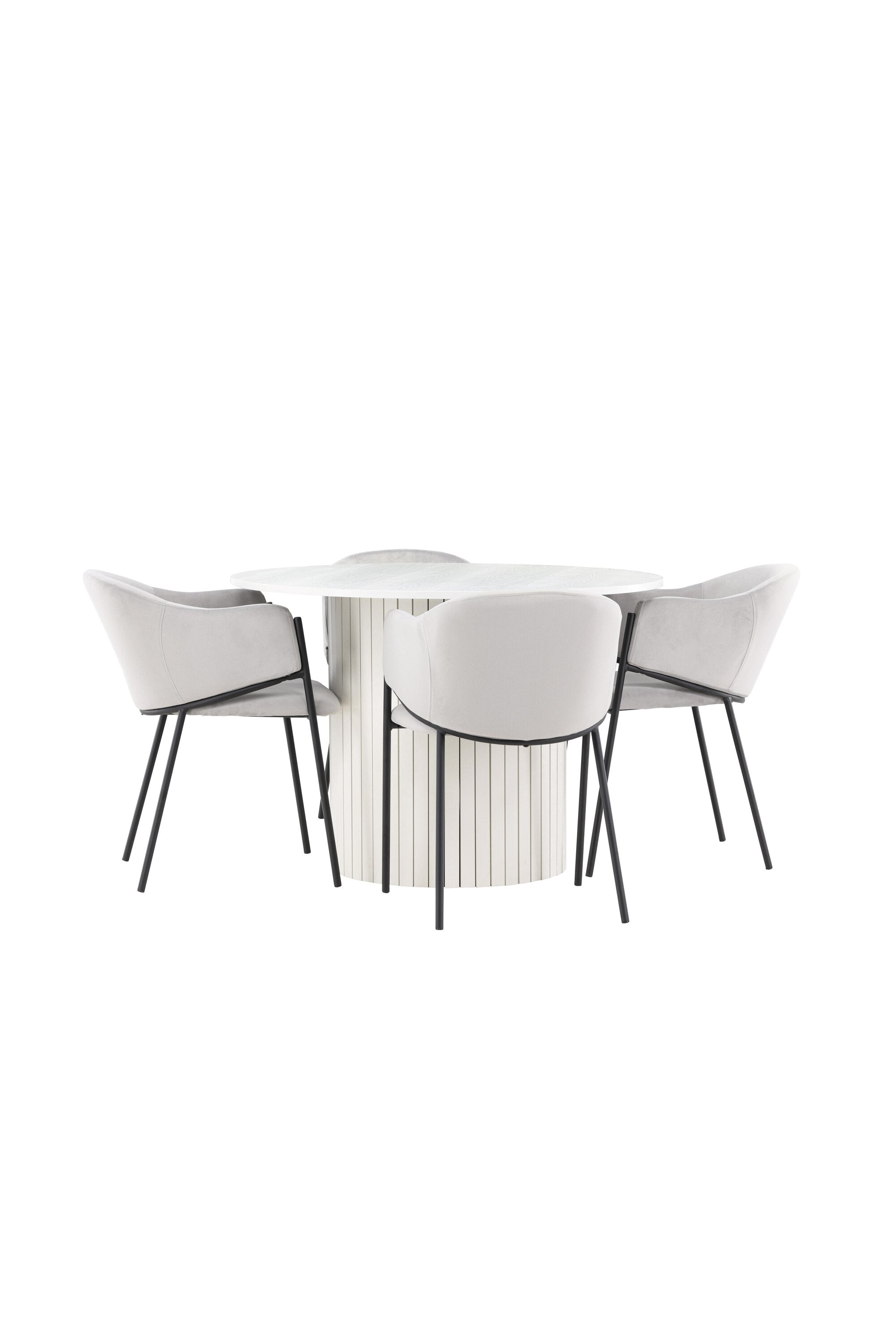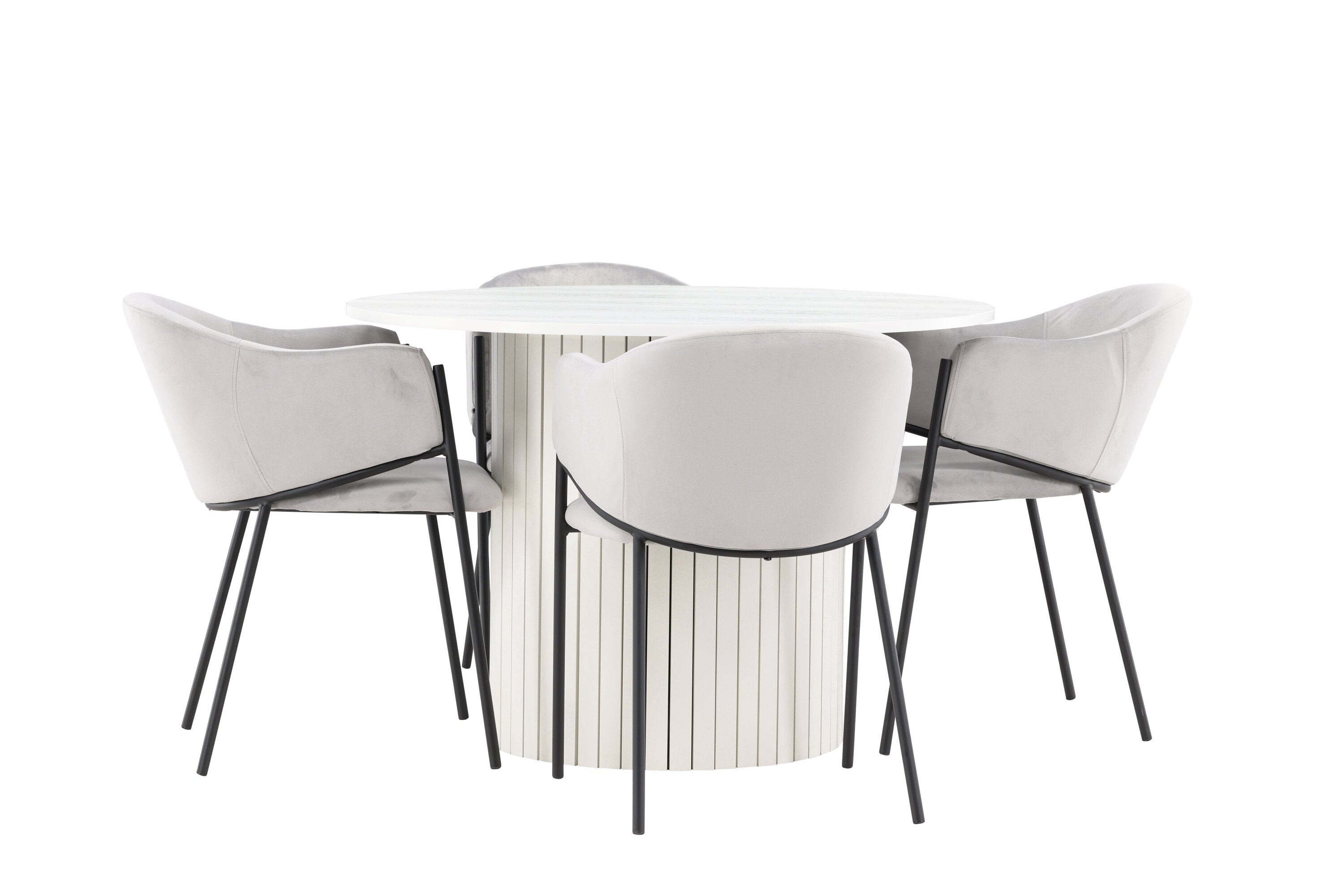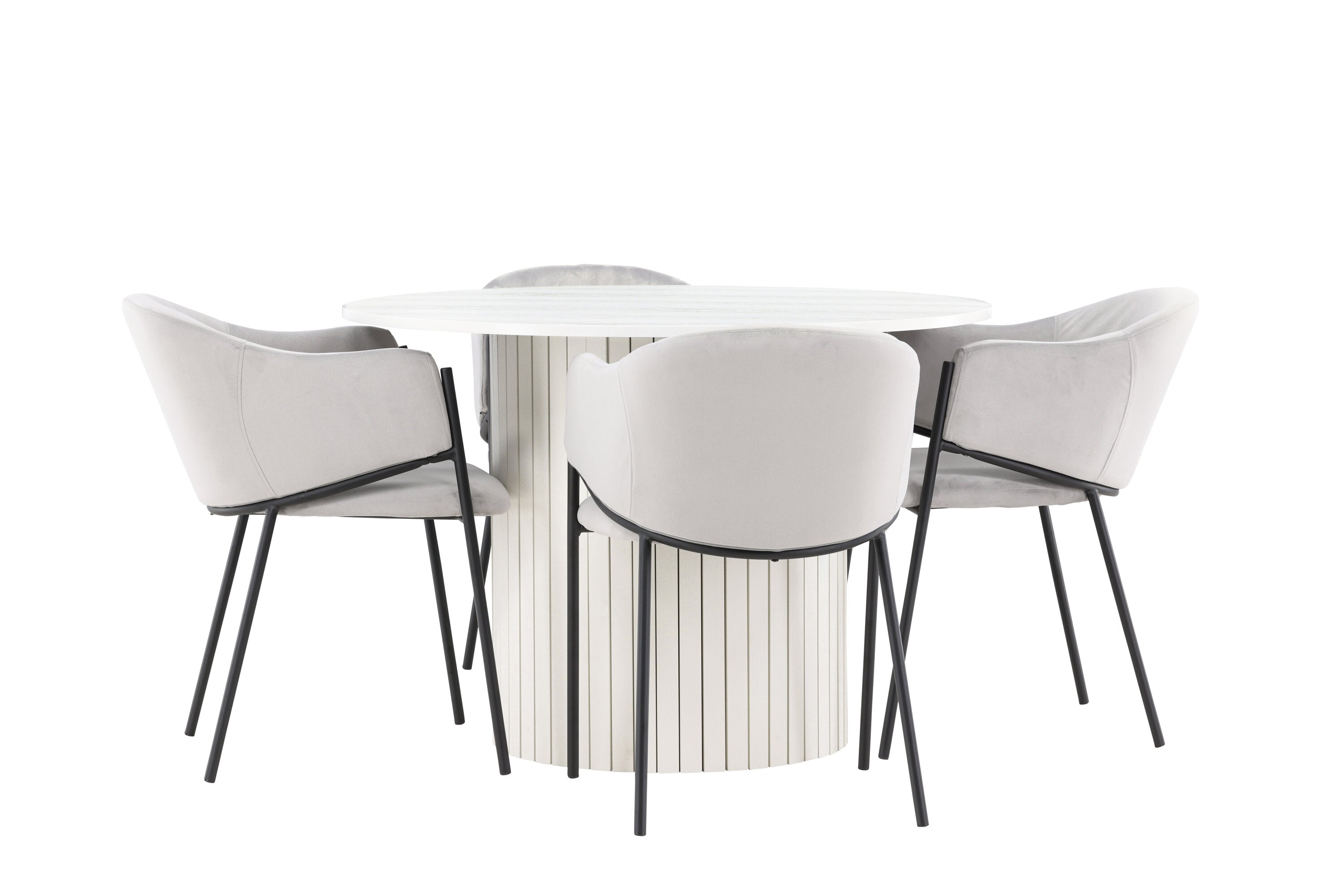 Vytvořte si stylový a příjemný jídelní kout s naší elegantní jídelní sadou, která kombinuje moderní stůl Häron s pohodlnými židlemi Evelina. Tato jídelní souprava, která je ideální jak pro každodenní večeři, tak pro slavnostní příležitosti, dodá vaší jídelně sofistikovaný a moderní pocit. Stůl Häron vyrobený z MDF má čistě bílou barvu, která dodá vaší jídelně světlou a svěží atmosféru. Stůl s průměrem 110 cm nabízí dostatek prostoru pro jídlo i rozhovory, přičemž jeho kulatý tvar vytváří harmonické a vyvážené prostředí. Robustní konstrukce stolu zajišťuje dlouhodobé používání a stabilitu. Čtyři židle Evelina se svými elegantními šedými sametovými sedáky skvěle doplňují stůl. Tyto židle nabízejí pohodlí i styl, takže jsou ideální pro dlouhé a příjemné večeře s rodinou a přáteli. Jejich moderní design s vysokými opěradly a měkkými sedáky dodá vaší jídelně sofistikovaný a moderní nádech. Tato jídelní souprava je dokonalou kombinací estetiky a funkčnosti, takže je vynikající volbou pro ty, kteří hledají elegantní a pohodlný jídelní kout. Vylepšete svou jídelnu kombinací stolu Häron a židlí Evelina a vytvořte si místo, kde se budou sdílet vzpomínky a radost.