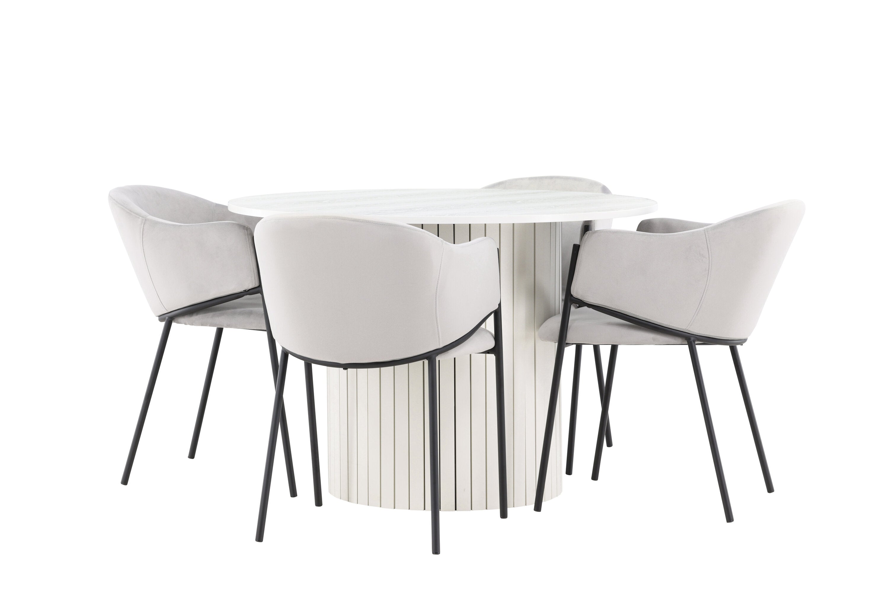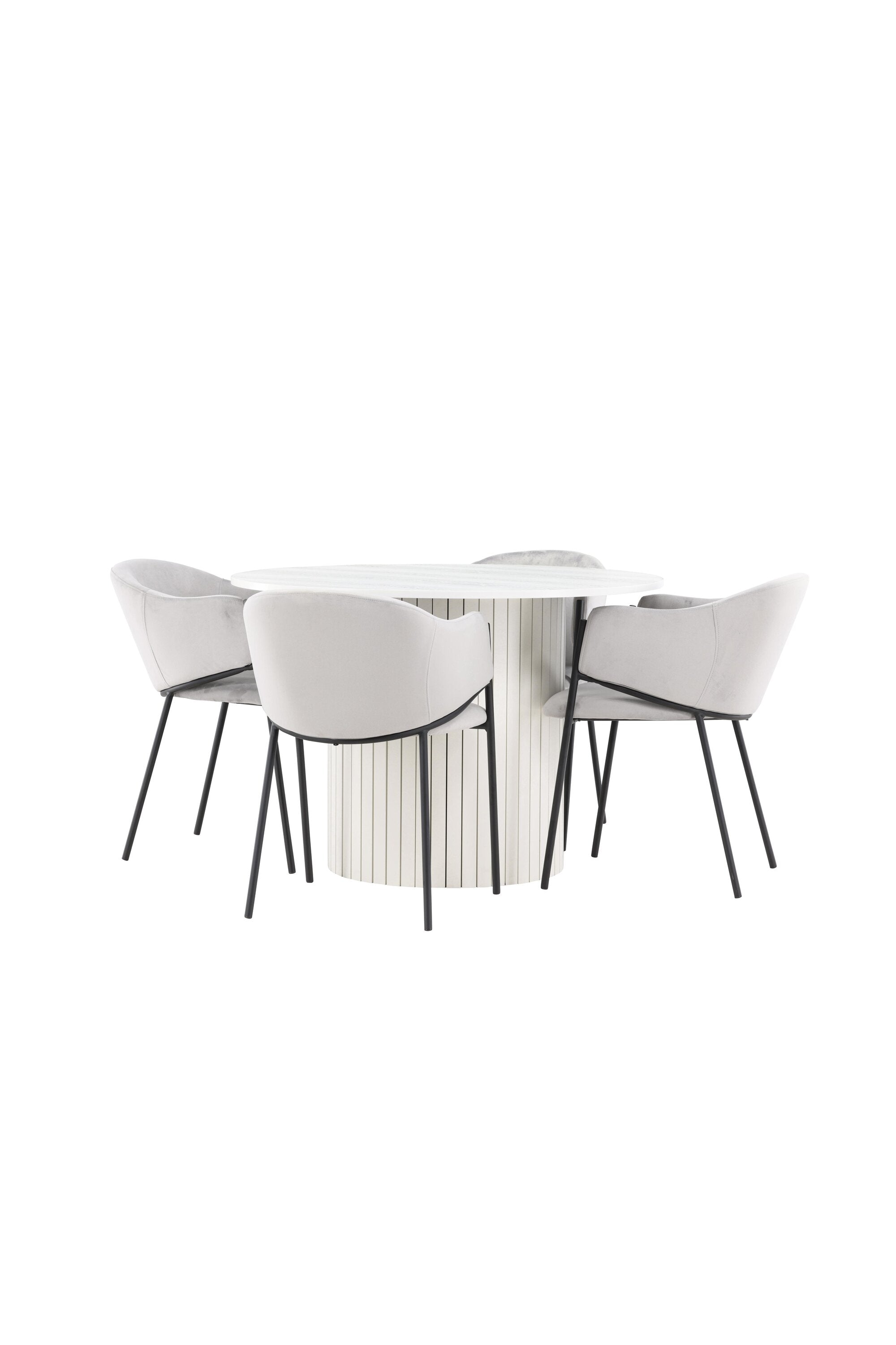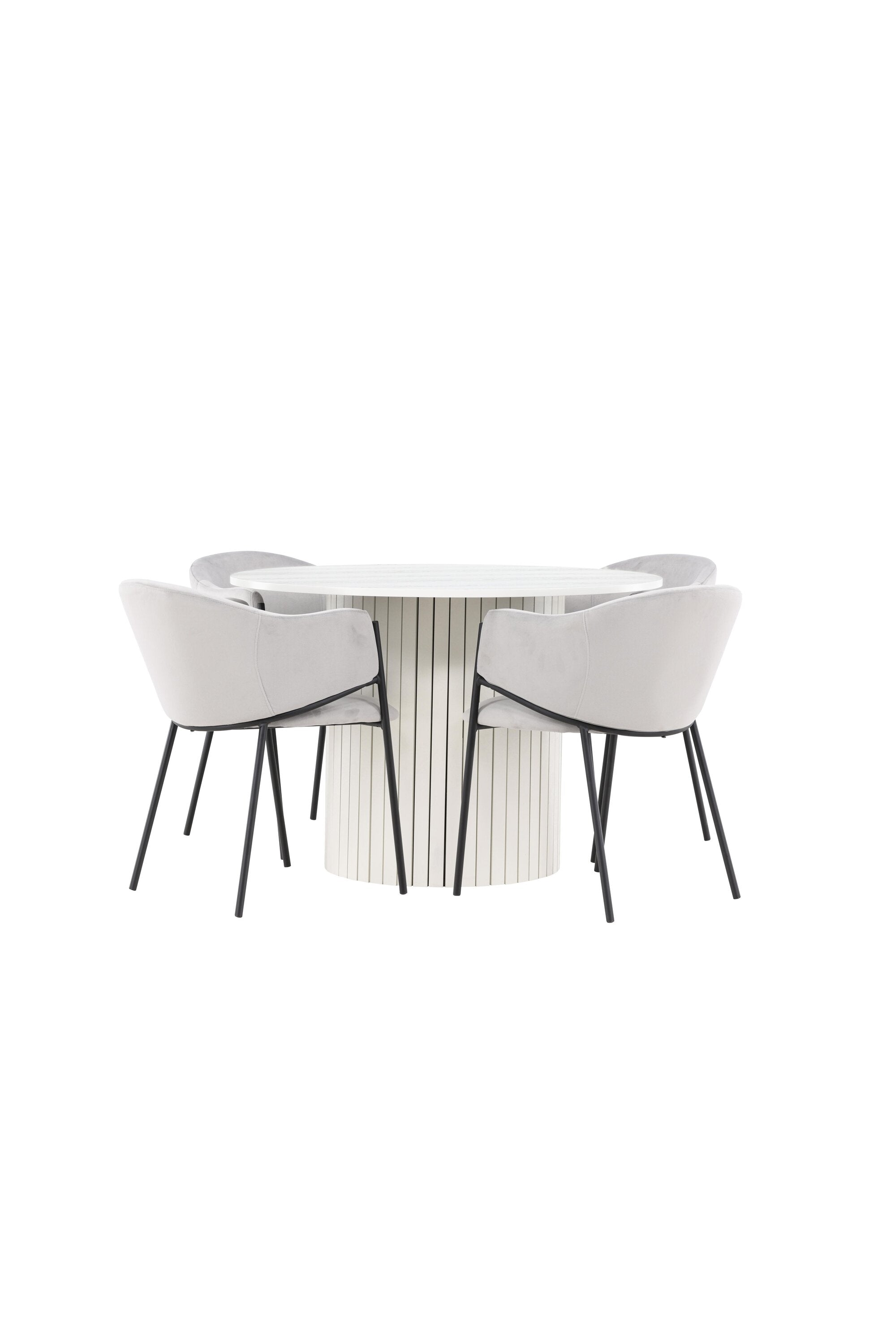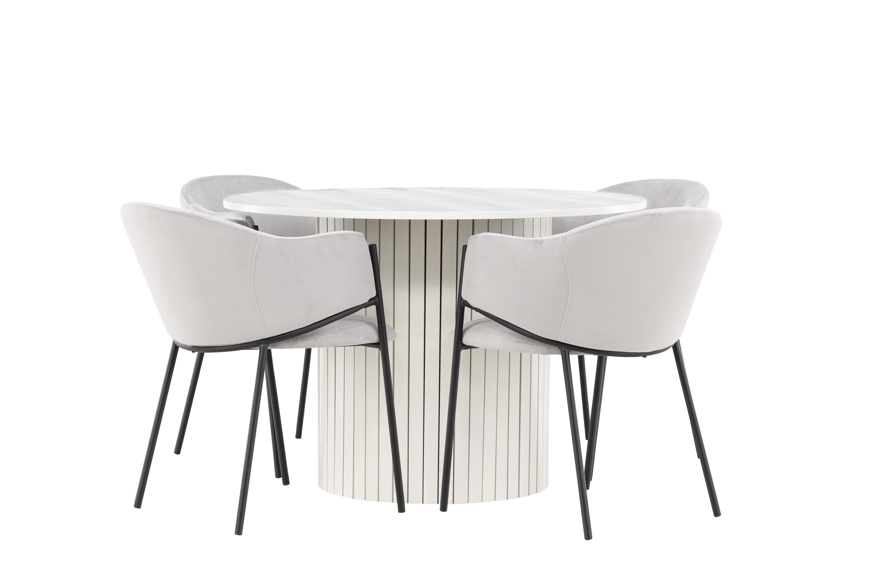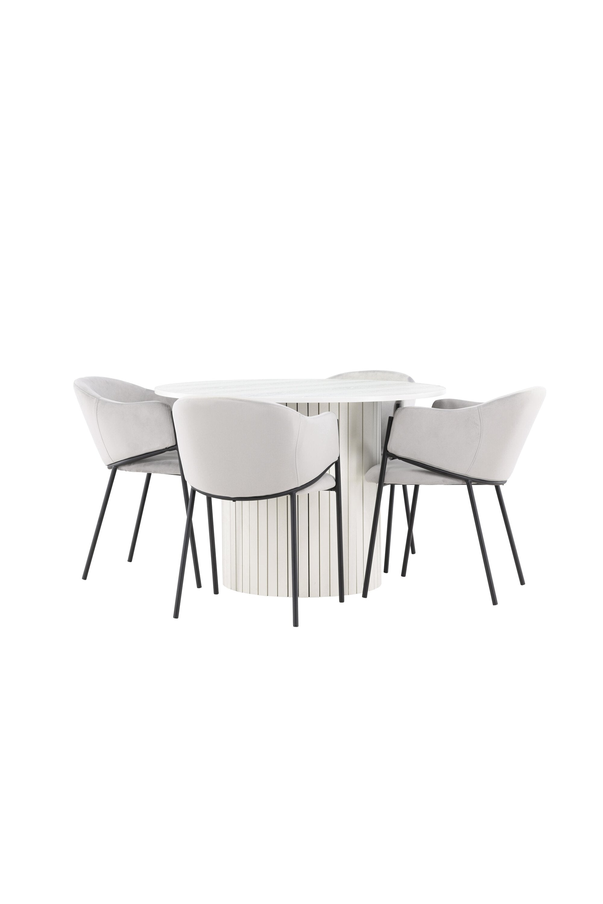 Vytvořte si stylový a příjemný jídelní kout s naší elegantní jídelní sadou, která kombinuje moderní stůl Häron s pohodlnými židlemi Evelina. Tato jídelní souprava, která je ideální jak pro každodenní večeři, tak pro slavnostní příležitosti, dodá vaší jídelně sofistikovaný a moderní pocit. Stůl Häron vyrobený z MDF má čistě bílou barvu, která dodá vaší jídelně světlou a svěží atmosféru. Stůl s průměrem 110 cm nabízí dostatek prostoru pro jídlo i rozhovory, přičemž jeho kulatý tvar vytváří harmonické a vyvážené prostředí. Robustní konstrukce stolu zajišťuje dlouhodobé používání a stabilitu. Čtyři židle Evelina se svými elegantními šedými sametovými sedáky skvěle doplňují stůl. Tyto židle nabízejí pohodlí i styl, takže jsou ideální pro dlouhé a příjemné večeře s rodinou a přáteli. Jejich moderní design s vysokými opěradly a měkkými sedáky dodá vaší jídelně sofistikovaný a moderní nádech. Tato jídelní souprava je dokonalou kombinací estetiky a funkčnosti, takže je vynikající volbou pro ty, kteří hledají elegantní a pohodlný jídelní kout. Vylepšete svou jídelnu kombinací stolu Häron a židlí Evelina a vytvořte si místo, kde se budou sdílet vzpomínky a radost.