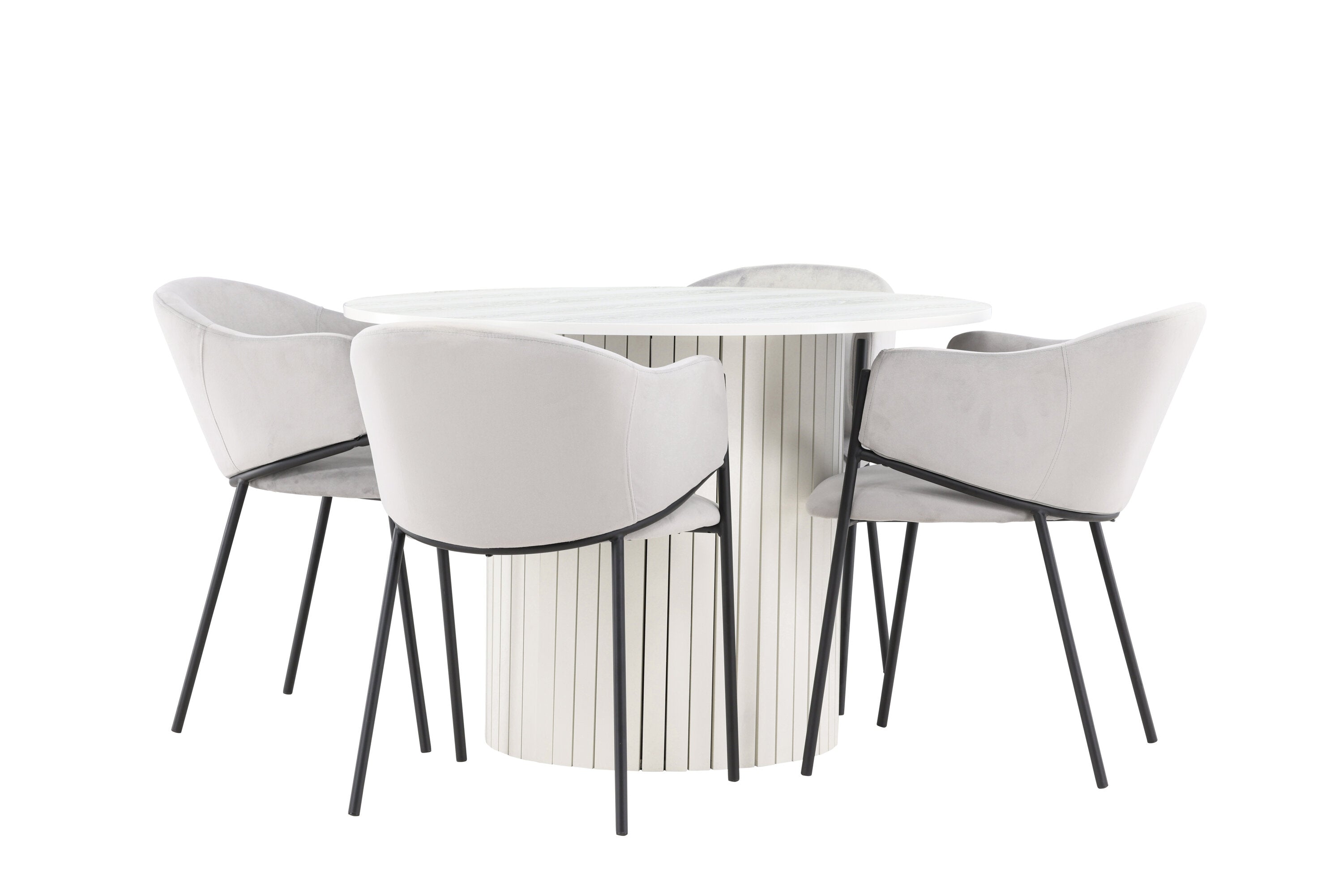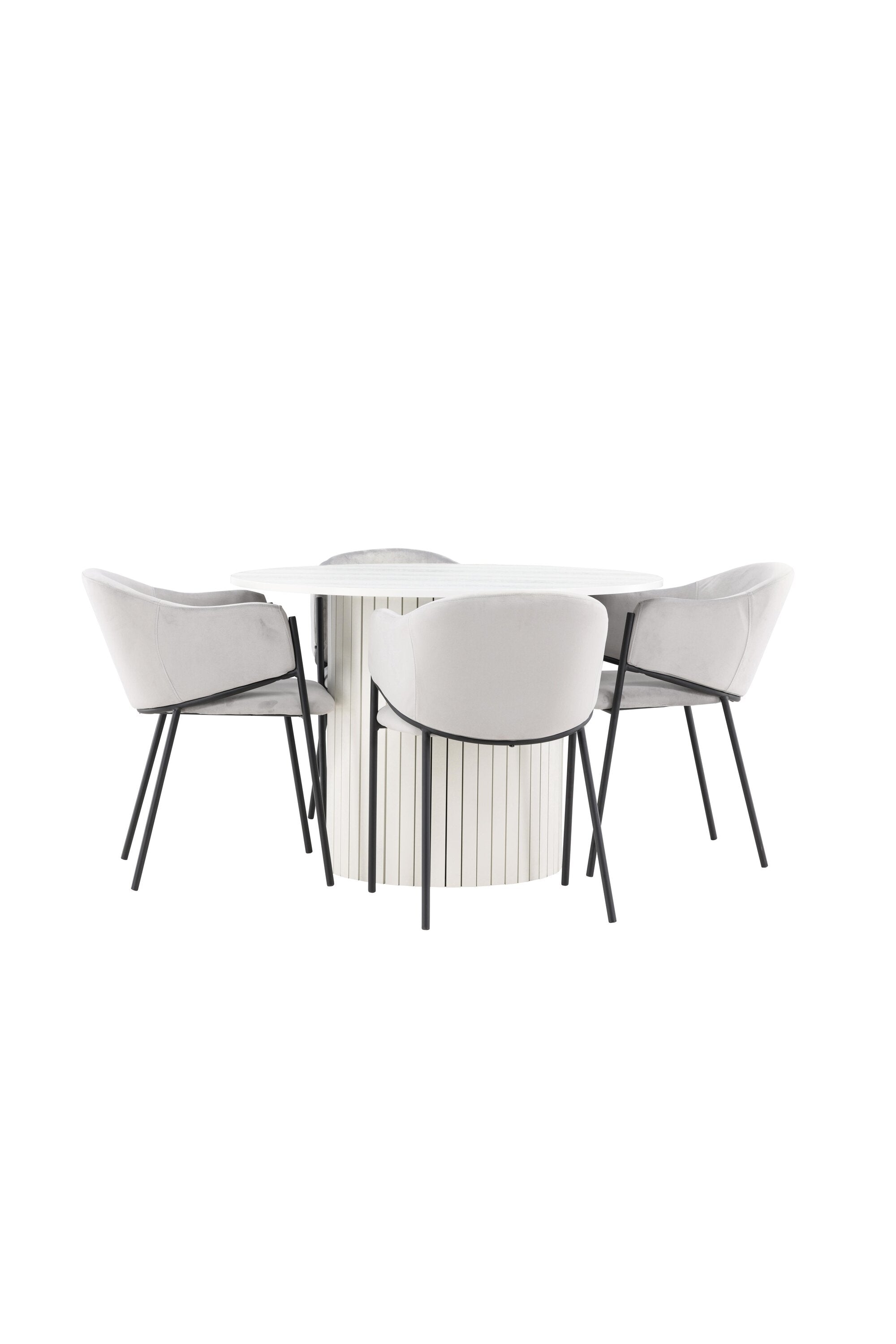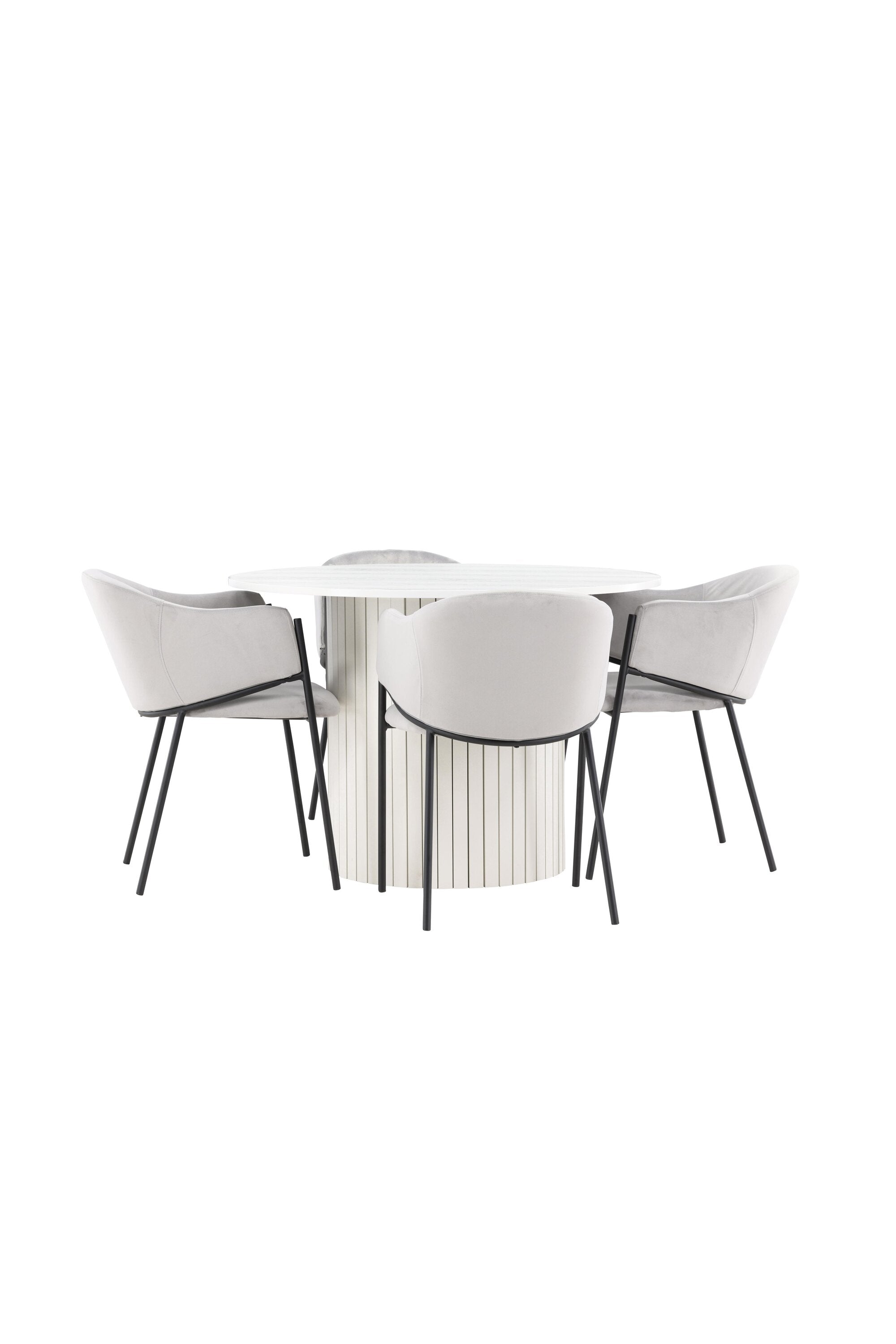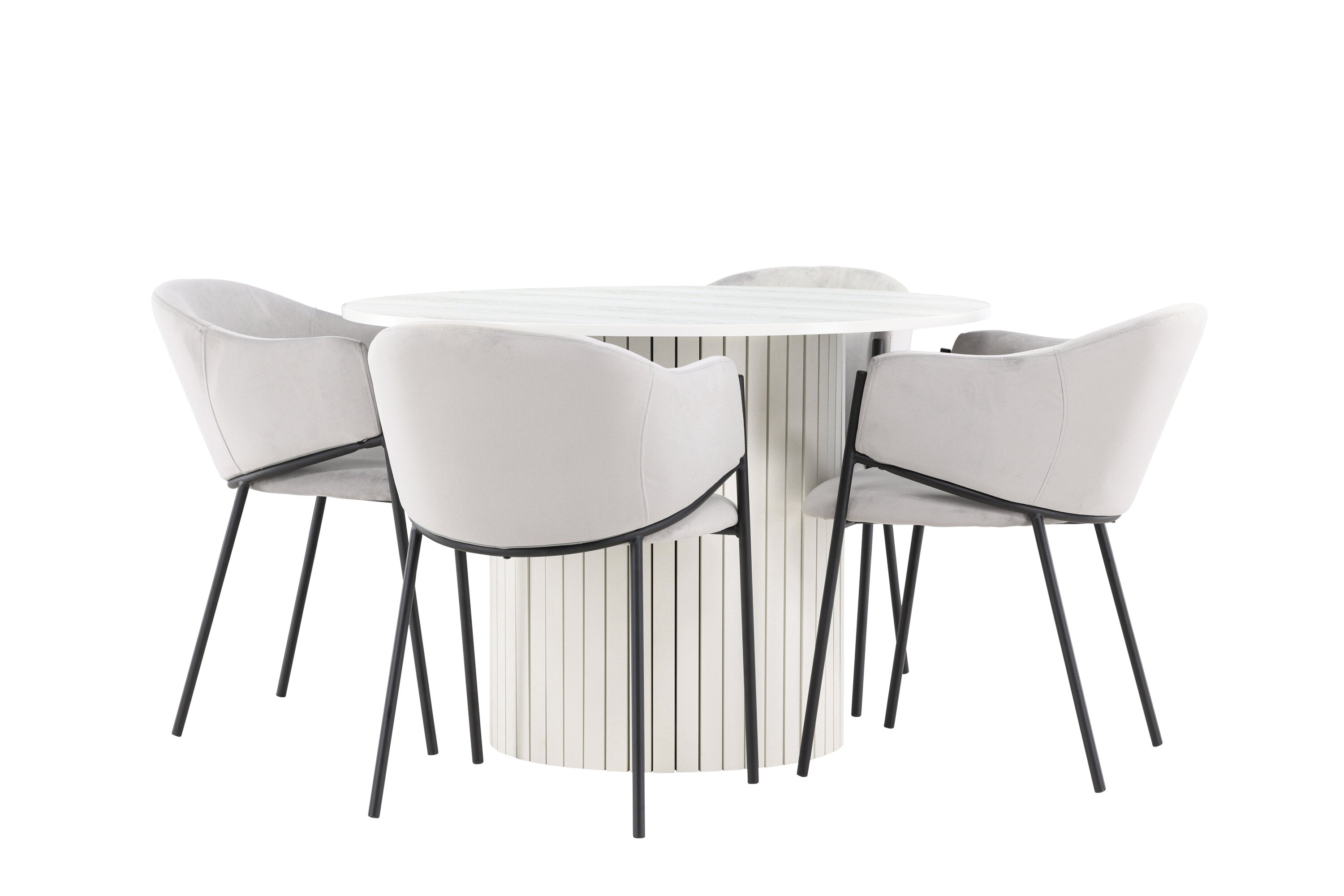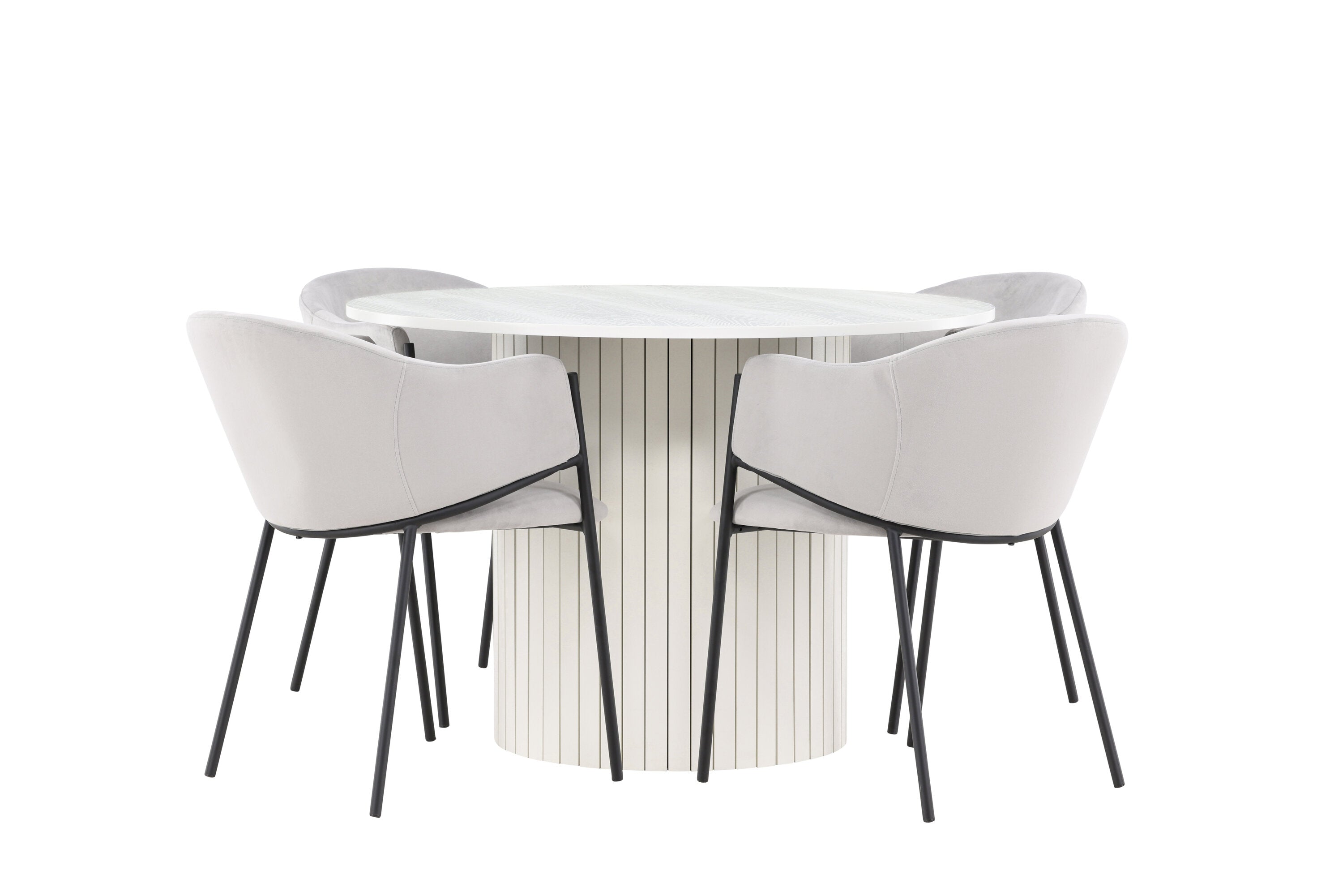 Vytvořte si stylový a příjemný jídelní kout s naší elegantní jídelní sadou, která kombinuje moderní stůl Häron s pohodlnými židlemi Evelina. Tato jídelní souprava, která je ideální jak pro každodenní večeři, tak pro slavnostní příležitosti, dodá vaší jídelně sofistikovaný a moderní pocit. Stůl Häron vyrobený z MDF má čistě bílou barvu, která dodá vaší jídelně světlou a svěží atmosféru. Stůl s průměrem 110 cm nabízí dostatek prostoru pro jídlo i rozhovory, přičemž jeho kulatý tvar vytváří harmonické a vyvážené prostředí. Robustní konstrukce stolu zajišťuje dlouhodobé používání a stabilitu. Čtyři židle Evelina se svými elegantními šedými sametovými sedáky skvěle doplňují stůl. Tyto židle nabízejí pohodlí i styl, takže jsou ideální pro dlouhé a příjemné večeře s rodinou a přáteli. Jejich moderní design s vysokými opěradly a měkkými sedáky dodá vaší jídelně sofistikovaný a moderní nádech. Tato jídelní souprava je dokonalou kombinací estetiky a funkčnosti, takže je vynikající volbou pro ty, kteří hledají elegantní a pohodlný jídelní kout. Vylepšete svou jídelnu kombinací stolu Häron a židlí Evelina a vytvořte si místo, kde se budou sdílet vzpomínky a radost.