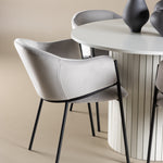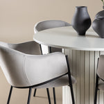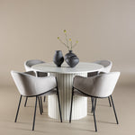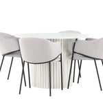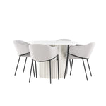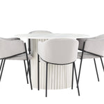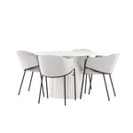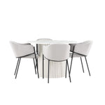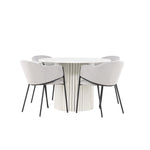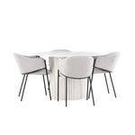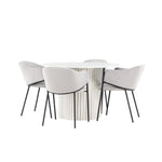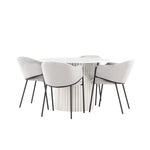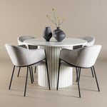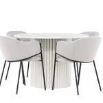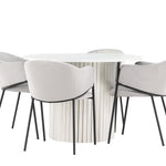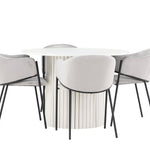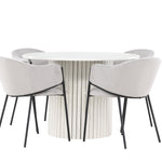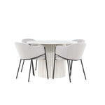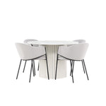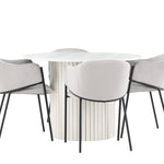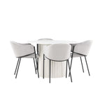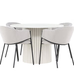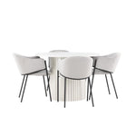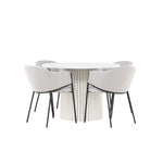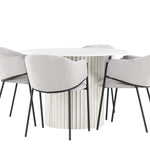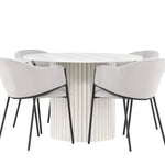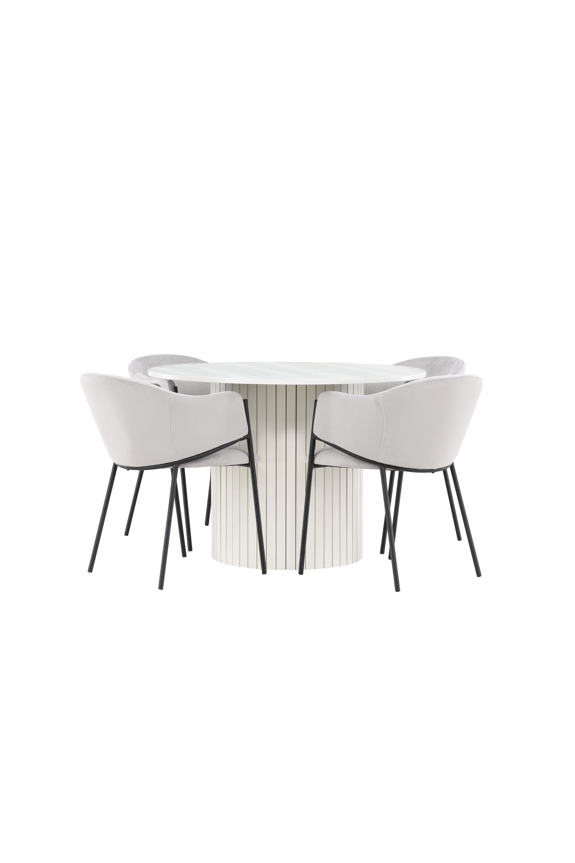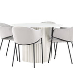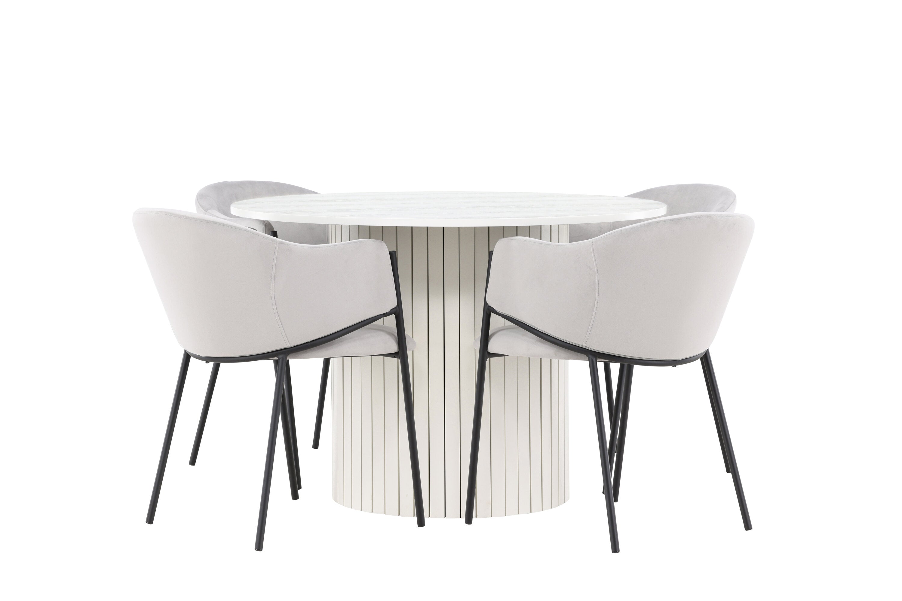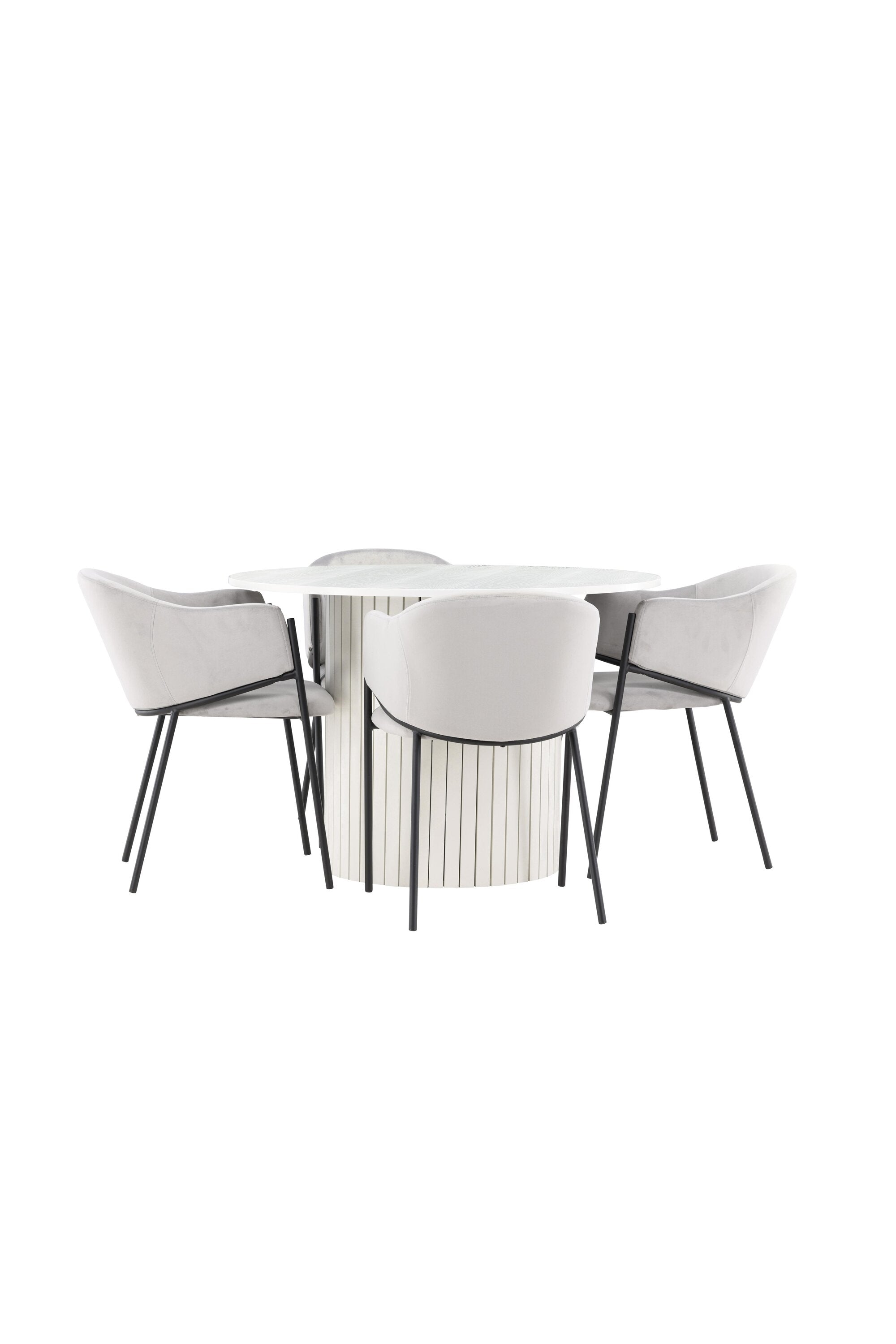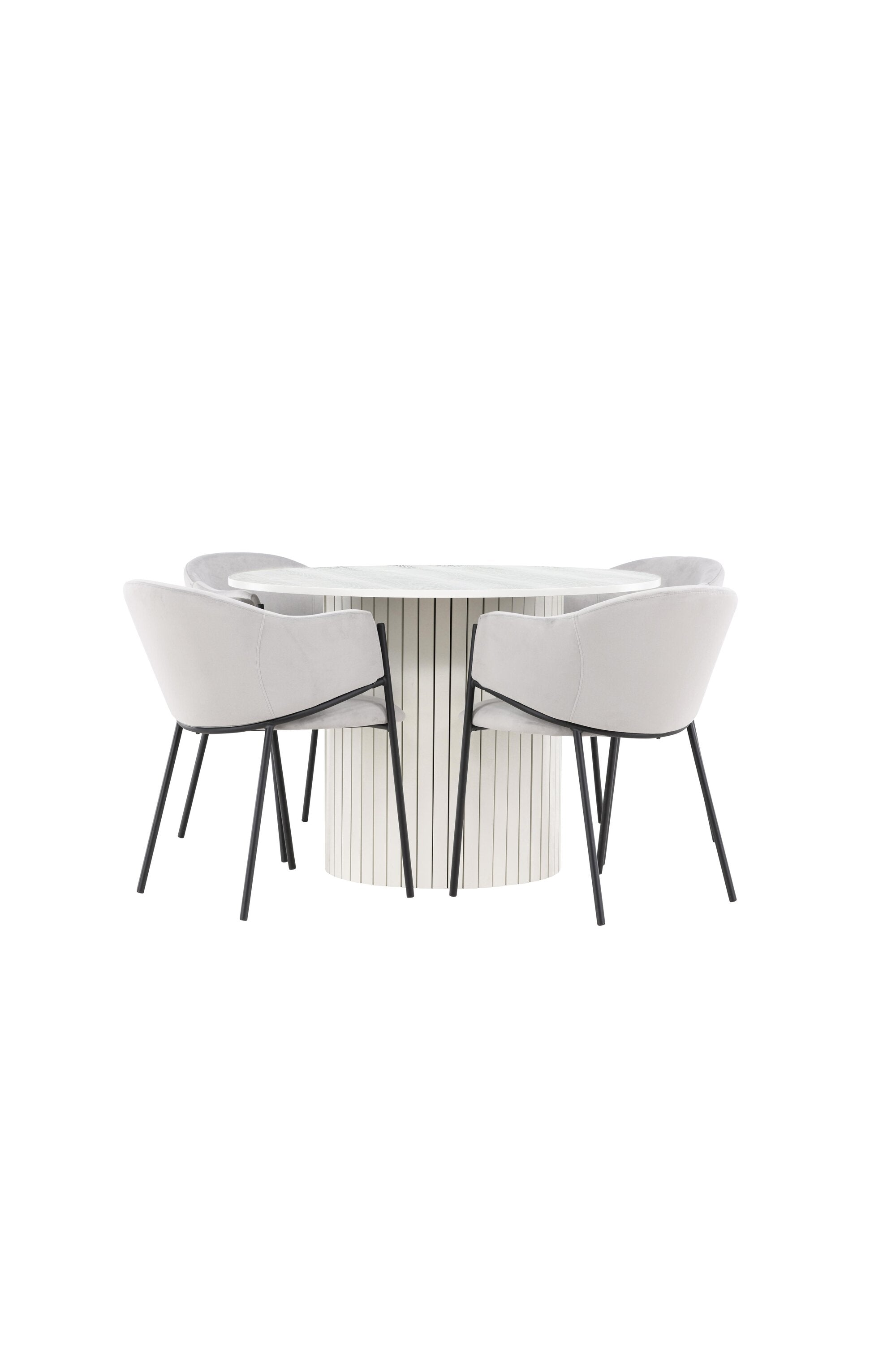 Vytvořte si stylový a příjemný jídelní kout s naší elegantní jídelní sadou, která kombinuje moderní stůl Häron s pohodlnými židlemi Evelina. Tato jídelní souprava, která je ideální jak pro každodenní večeři, tak pro slavnostní příležitosti, dodá vaší jídelně sofistikovaný a moderní pocit. Stůl Häron vyrobený z MDF má čistě bílou barvu, která dodá vaší jídelně světlou a svěží atmosféru. Stůl s průměrem 110 cm nabízí dostatek prostoru pro jídlo i rozhovory, přičemž jeho kulatý tvar vytváří harmonické a vyvážené prostředí. Robustní konstrukce stolu zajišťuje dlouhodobé používání a stabilitu. Čtyři židle Evelina se svými elegantními šedými sametovými sedáky skvěle doplňují stůl. Tyto židle nabízejí pohodlí i styl, takže jsou ideální pro dlouhé a příjemné večeře s rodinou a přáteli. Jejich moderní design s vysokými opěradly a měkkými sedáky dodá vaší jídelně sofistikovaný a moderní nádech. Tato jídelní souprava je dokonalou kombinací estetiky a funkčnosti, takže je vynikající volbou pro ty, kteří hledají elegantní a pohodlný jídelní kout. Vylepšete svou jídelnu kombinací stolu Häron a židlí Evelina a vytvořte si místo, kde se budou sdílet vzpomínky a radost.