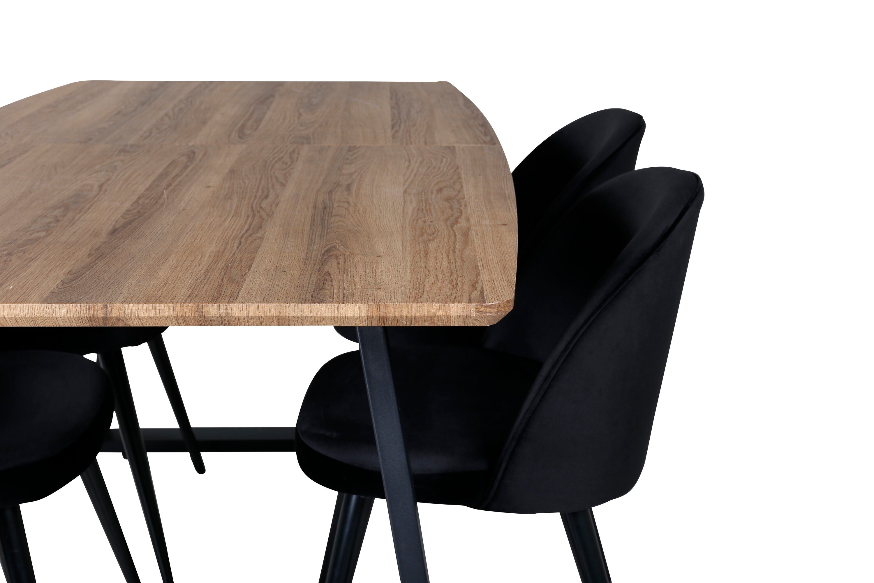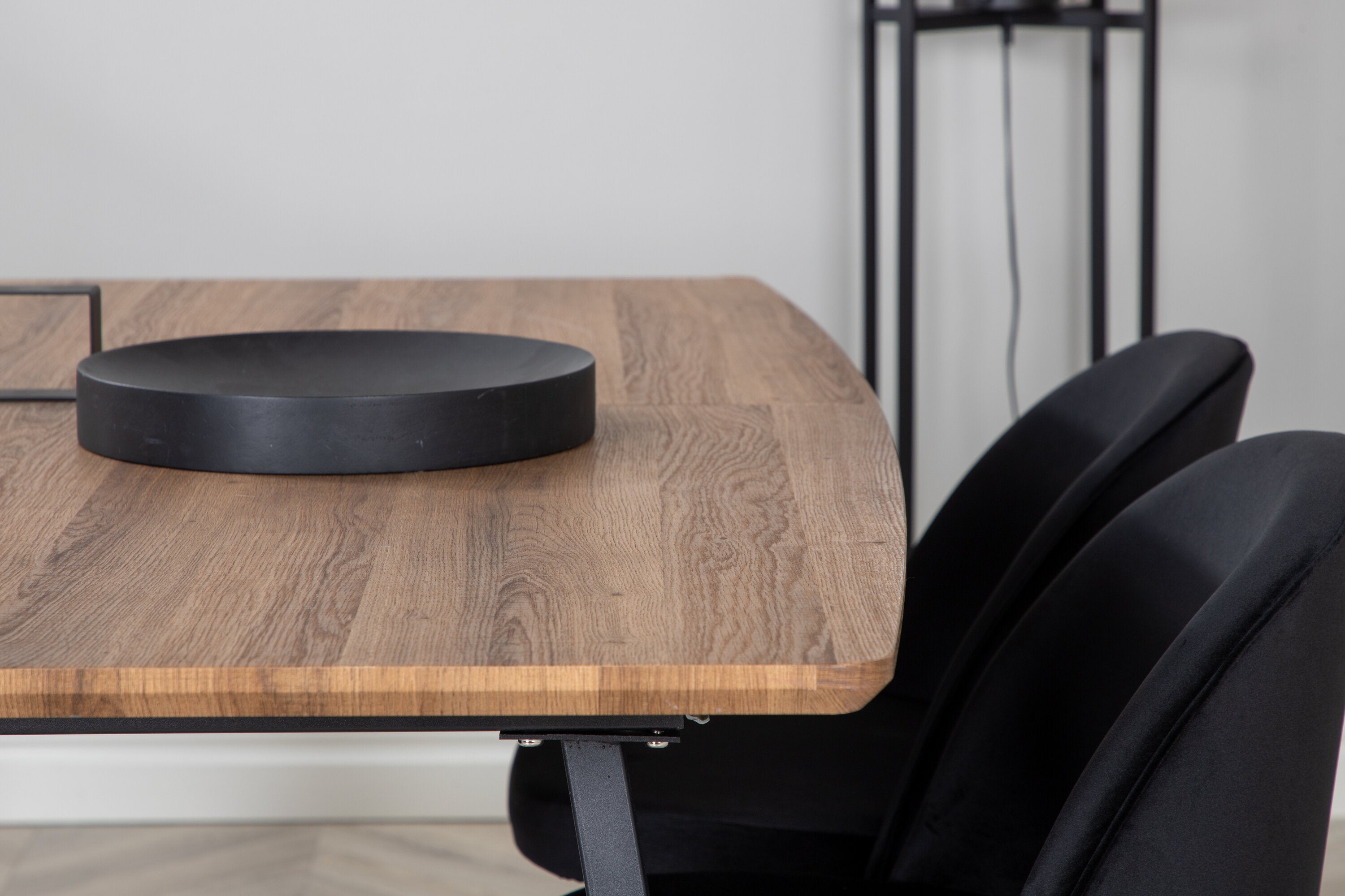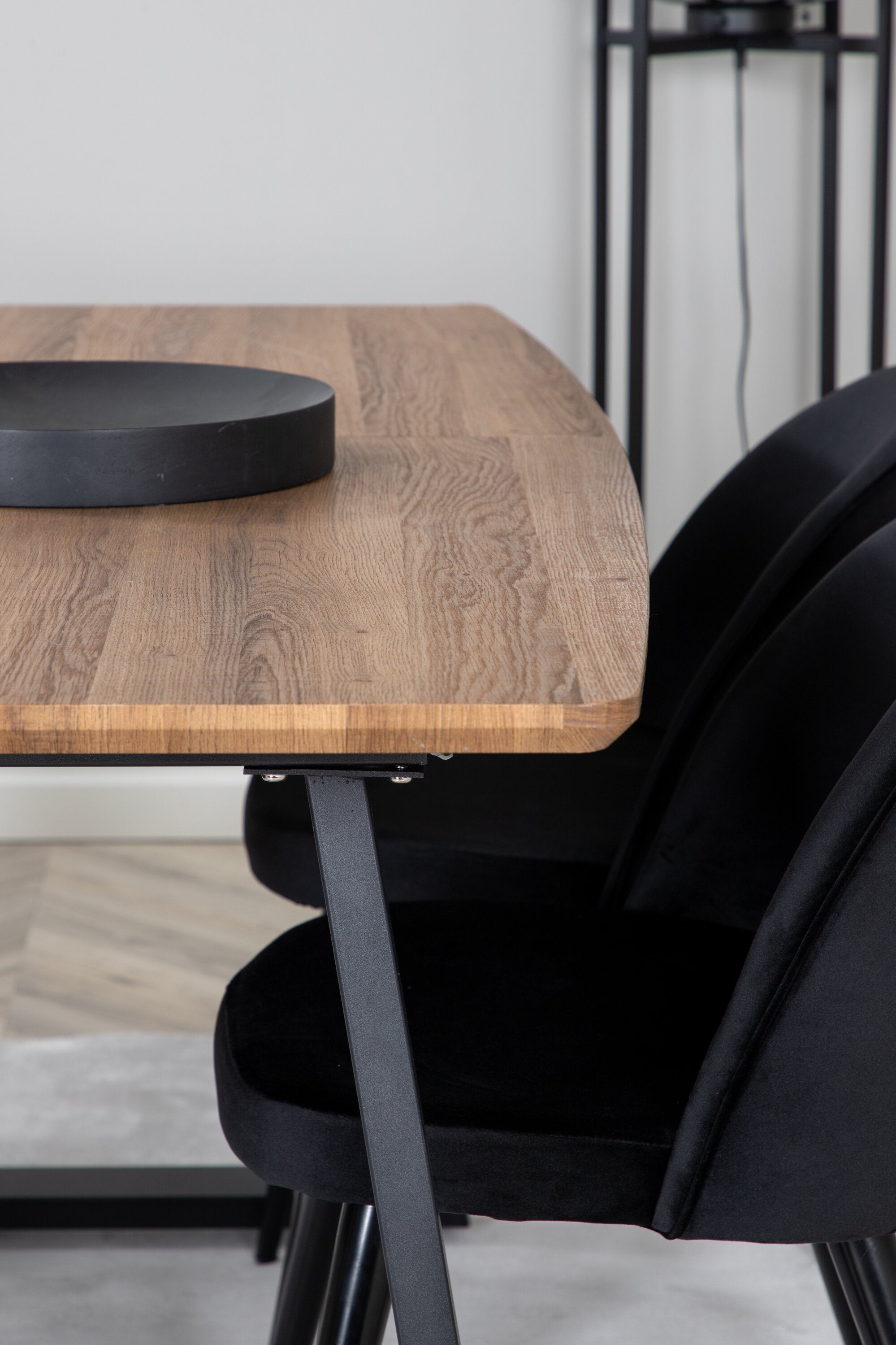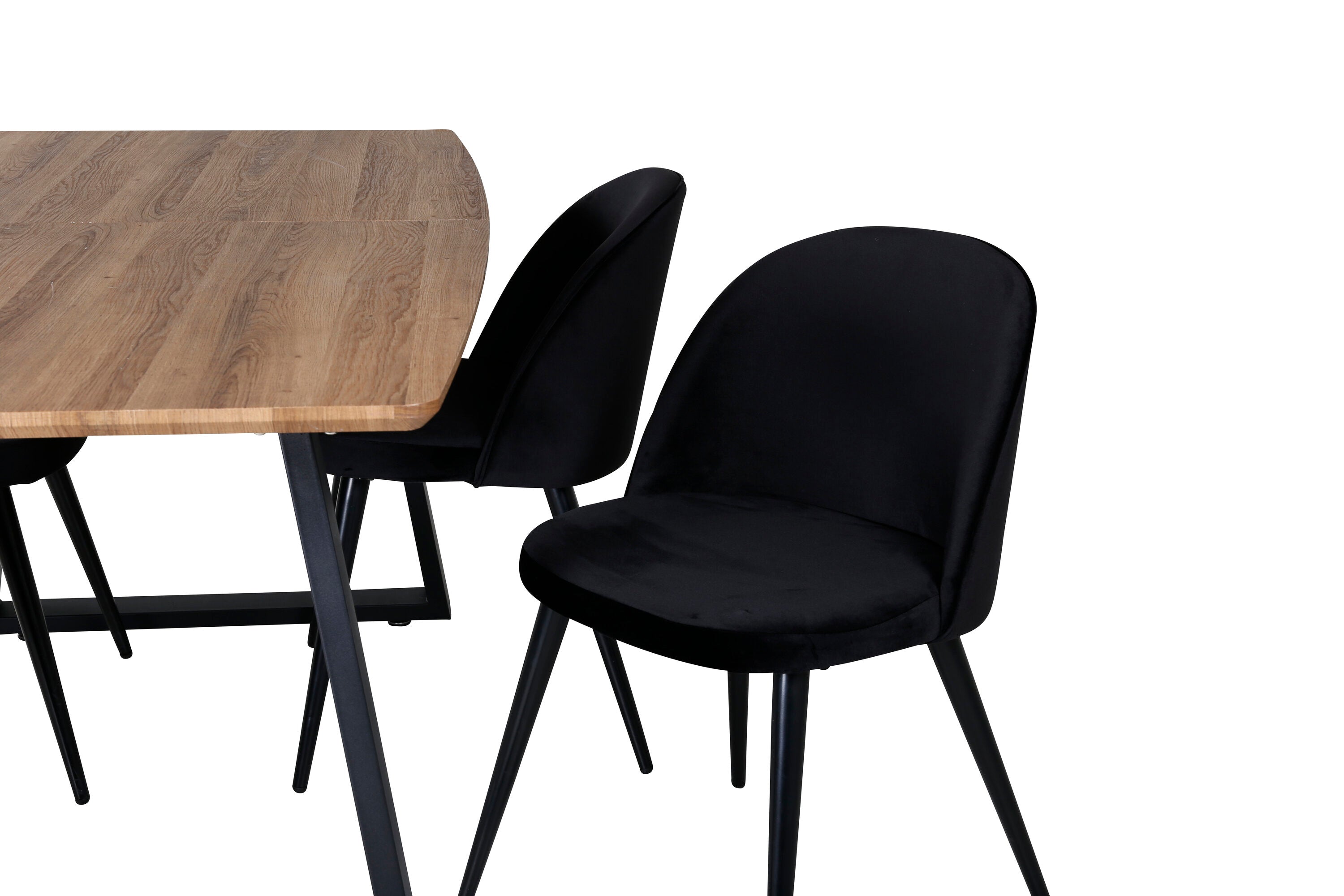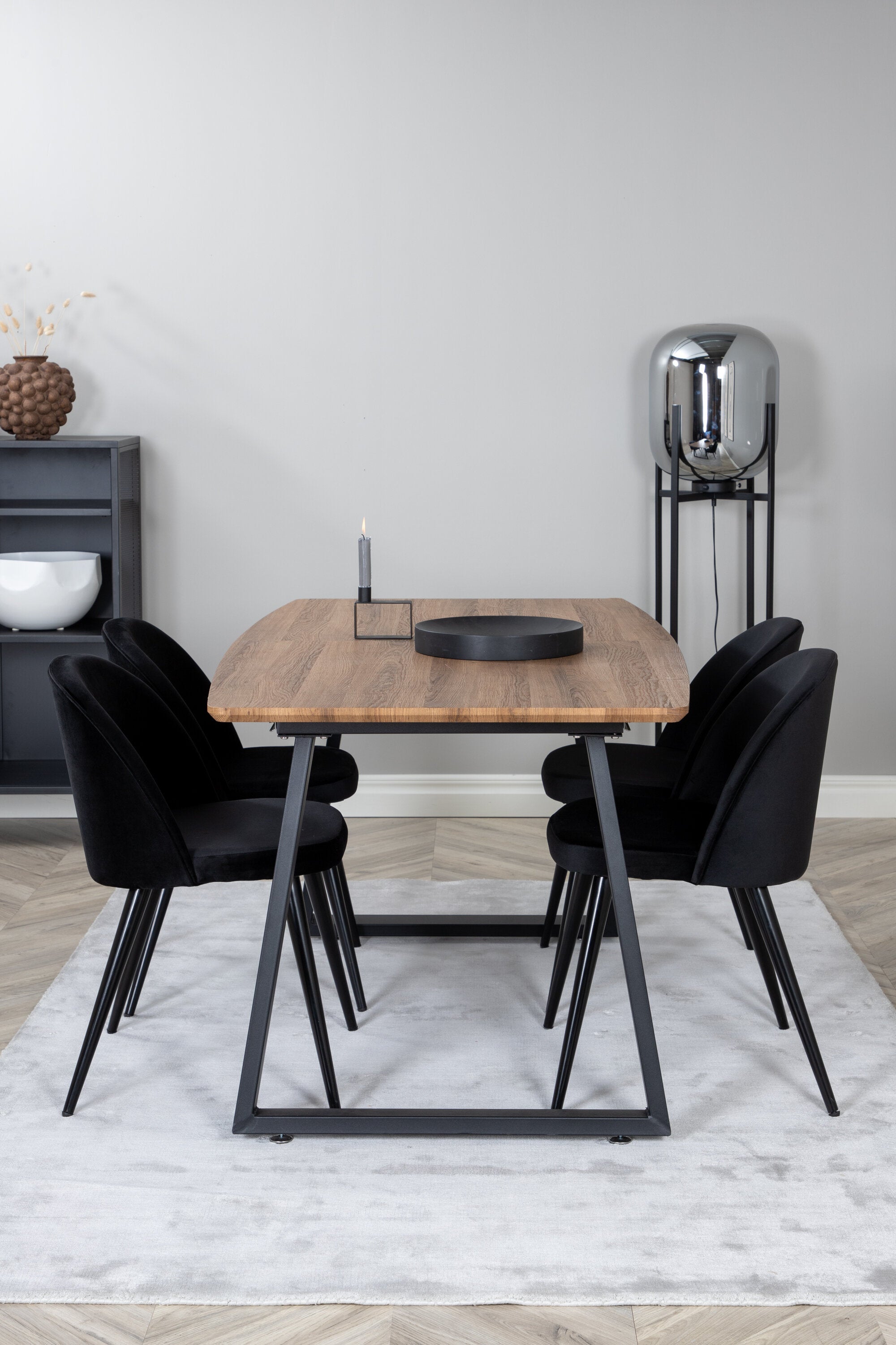 Vytvořte ve svém obývacím pokoji dojem módy s lahodnou skupinou jídel ve vkusném designu! Jídelní stůl Inca má nadčasový design s měkkými tvary. Desku stolu lze v případě potřeby prodloužit, z MDF v barvě dubu a nohy stolu v černém kovu vytvářejí přirozený a moderní pocit z místnosti. Zde v dokonalé kombinaci s jídelními židlemi ze série Velvet. Židle má plně oblečený design s nohami z kovu s černým práškovým nástřikem, opěrákem a sedákem s měkkým polstrováním z černé sametové látky. Pohodlně se usaďte a pozvěte na několik společenských okamžiků!