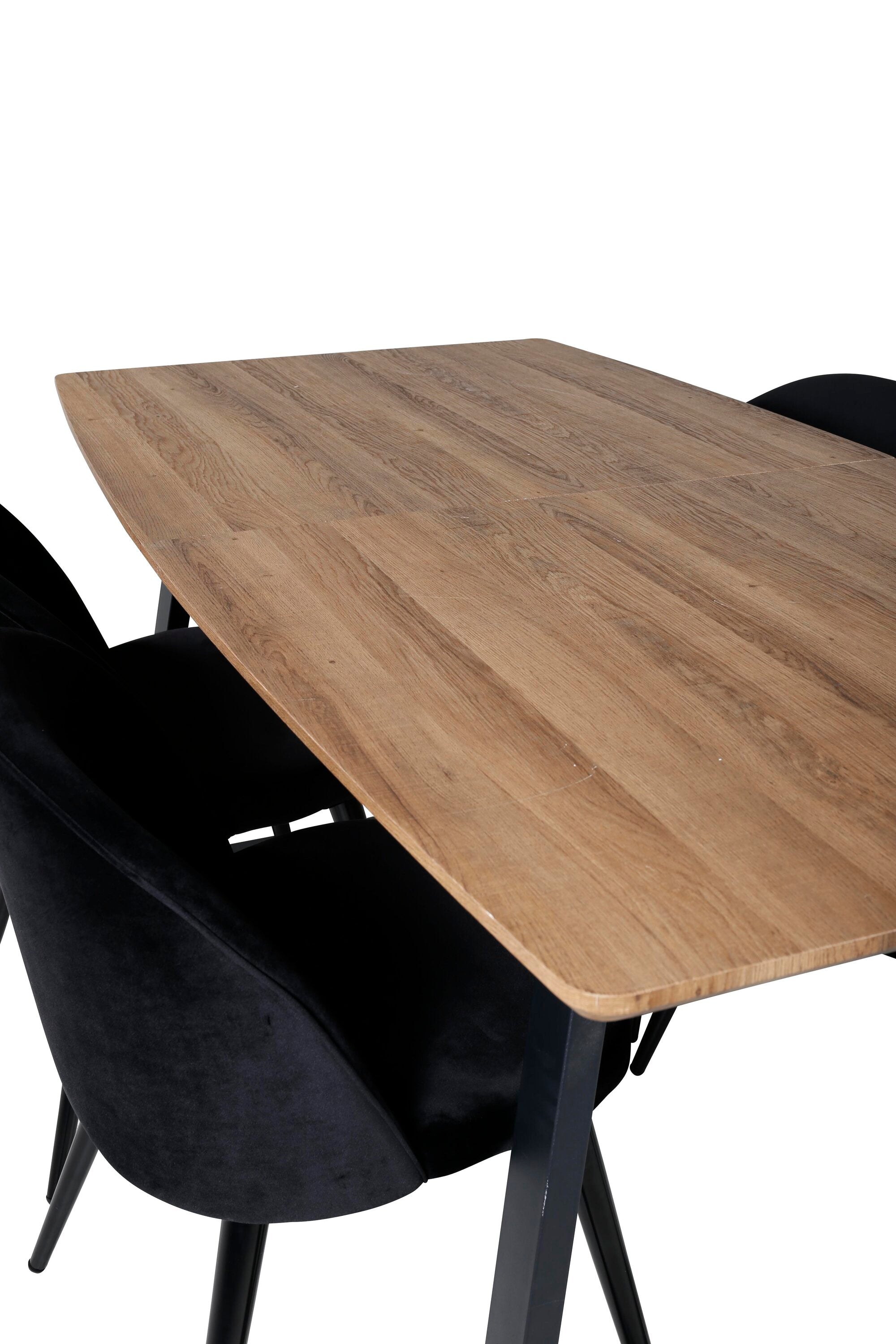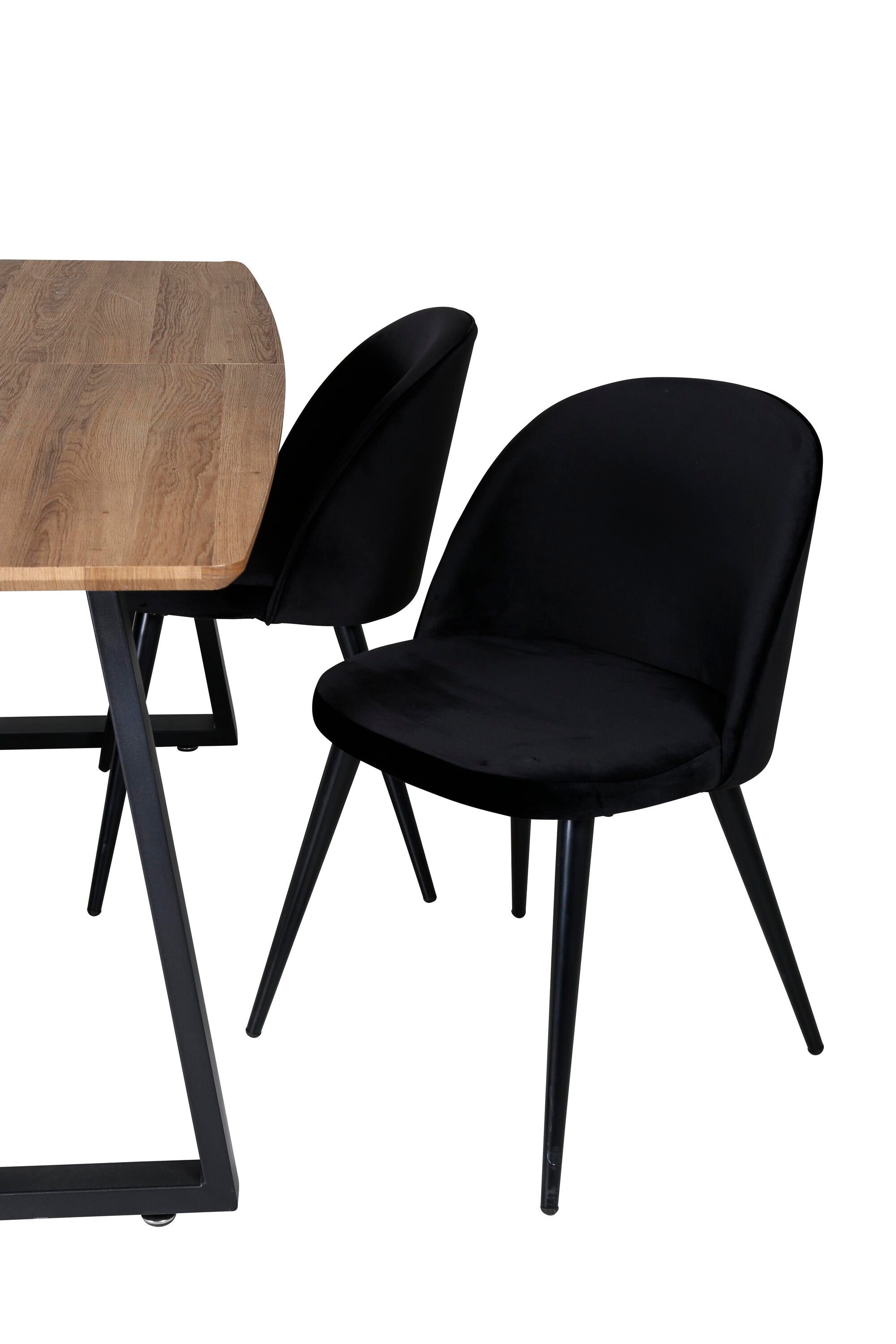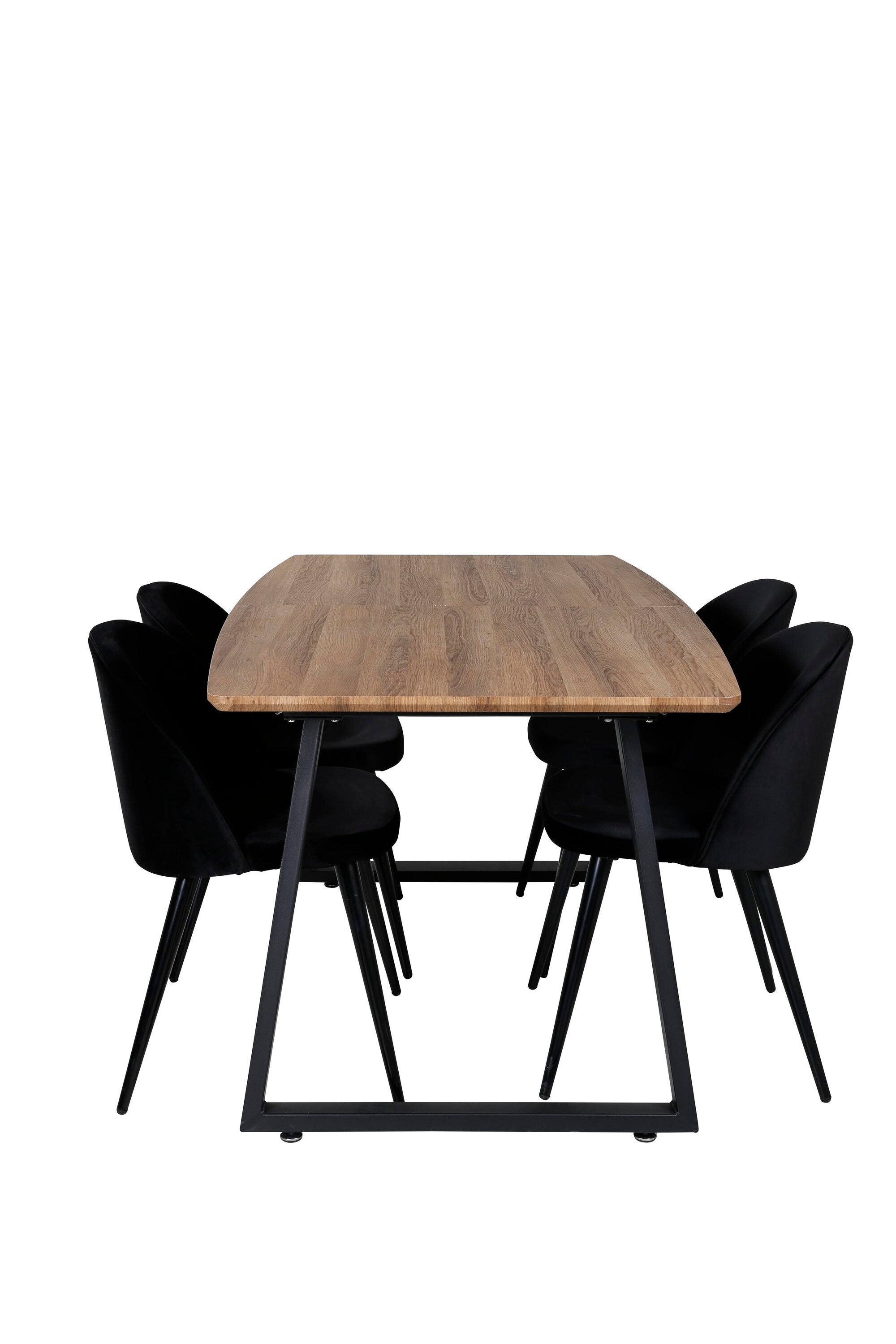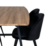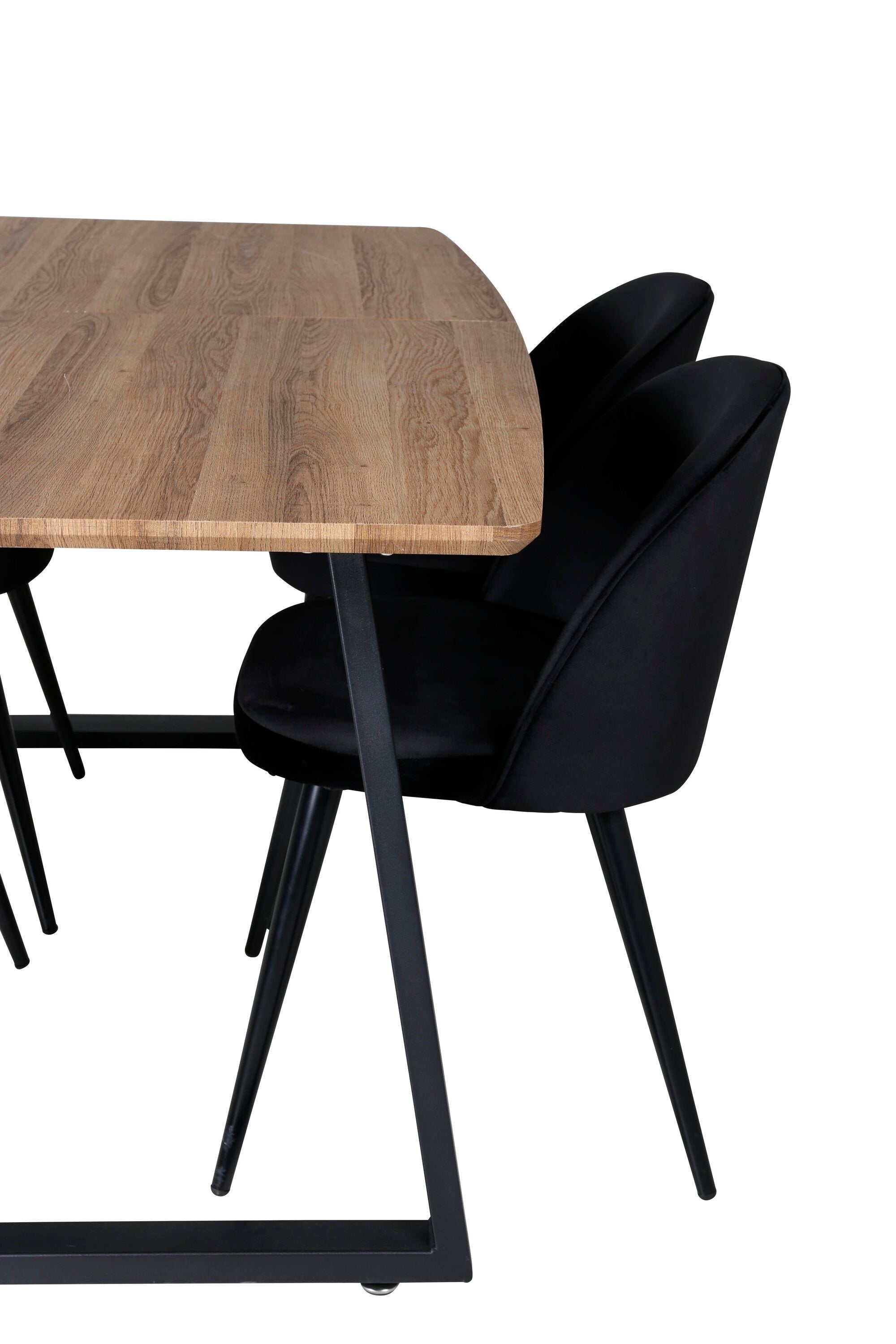 Vytvořte ve svém obývacím pokoji dojem módy s lahodnou skupinou jídel ve vkusném designu! Jídelní stůl Inca má nadčasový design s měkkými tvary. Desku stolu lze v případě potřeby prodloužit, z MDF v barvě dubu a nohy stolu v černém kovu vytvářejí přirozený a moderní pocit z místnosti. Zde v dokonalé kombinaci s jídelními židlemi ze série Velvet. Židle má plně oblečený design s nohami z kovu s černým práškovým nástřikem, opěrákem a sedákem s měkkým polstrováním z černé sametové látky. Pohodlně se usaďte a pozvěte na několik společenských okamžiků!