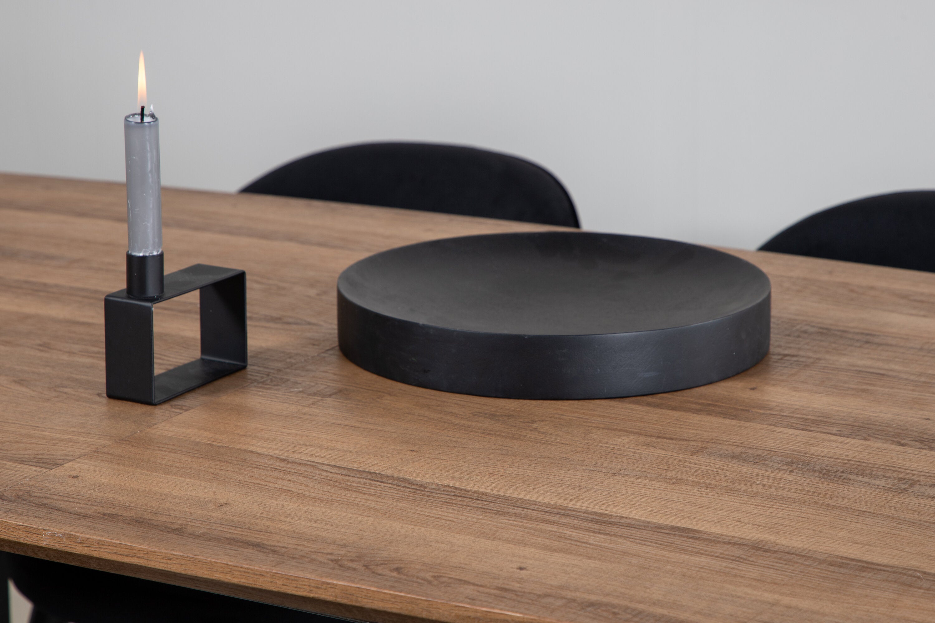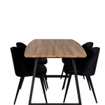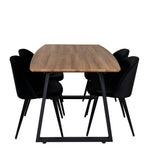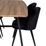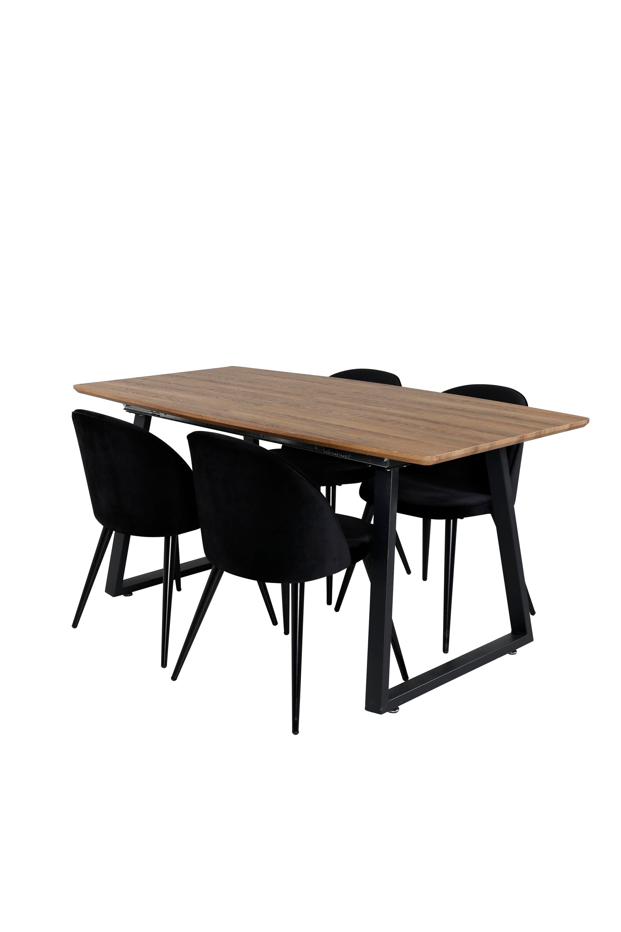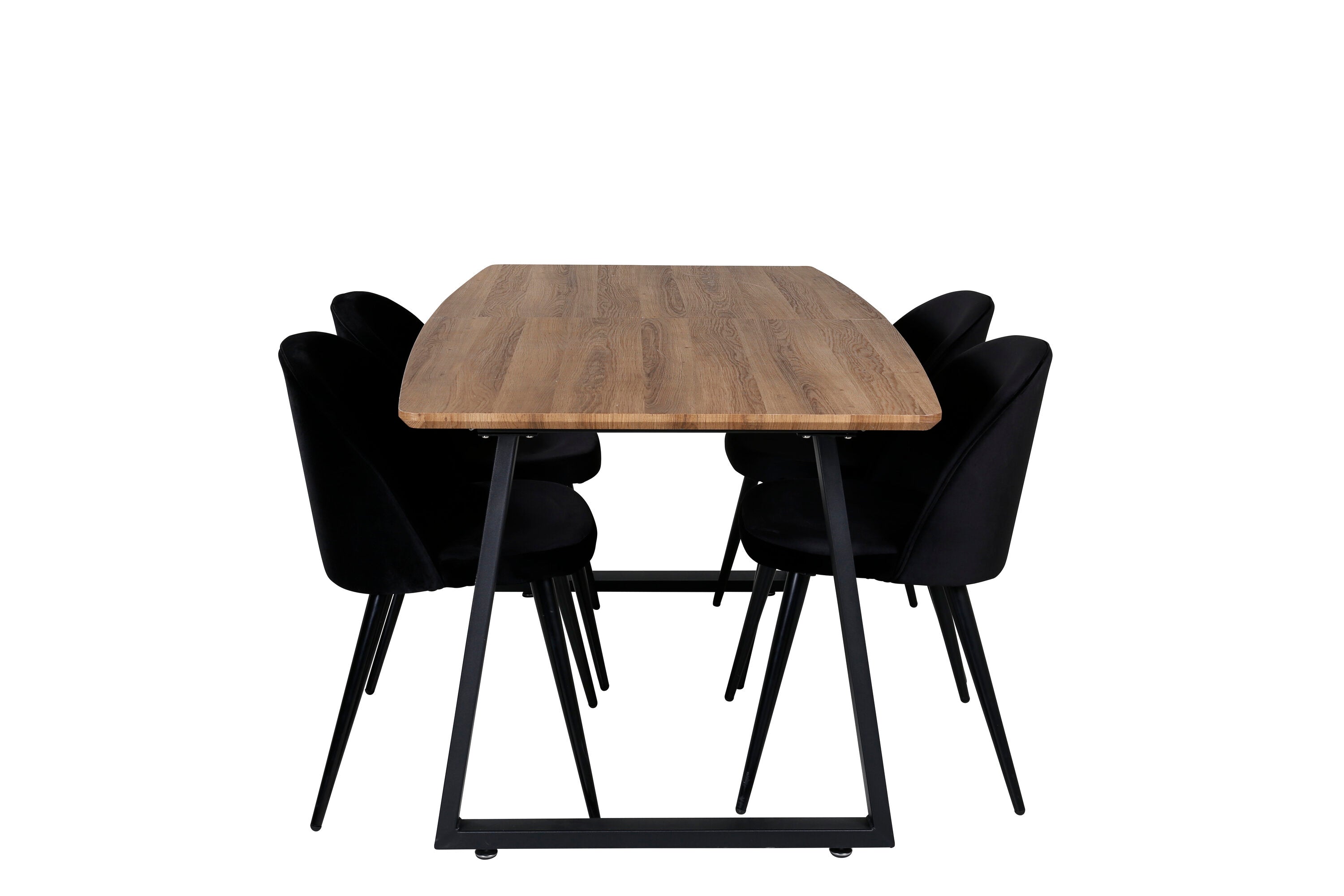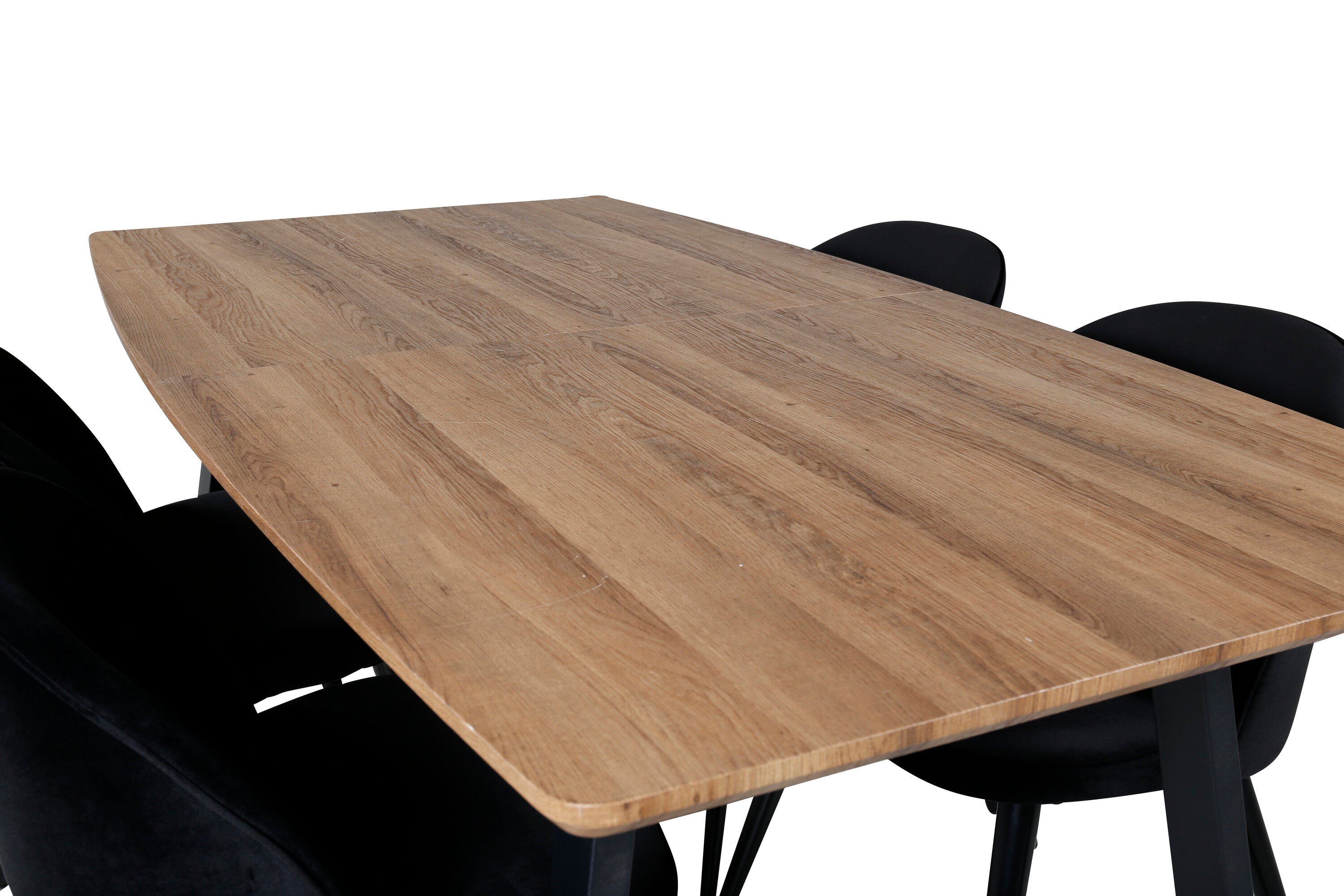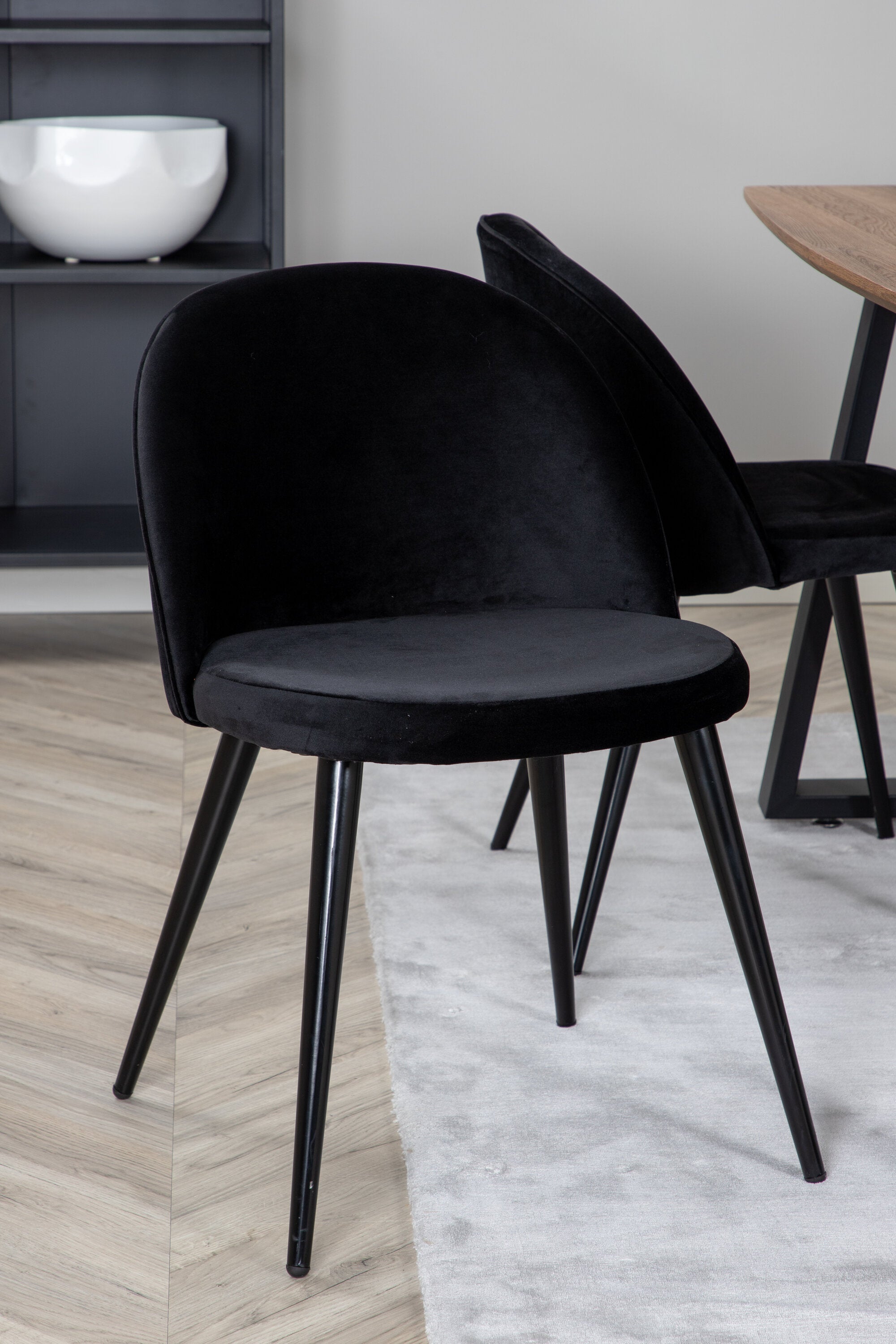 Vytvořte ve svém obývacím pokoji dojem módy s lahodnou skupinou jídel ve vkusném designu! Jídelní stůl Inca má nadčasový design s měkkými tvary. Desku stolu lze v případě potřeby prodloužit, z MDF v barvě dubu a nohy stolu v černém kovu vytvářejí přirozený a moderní pocit z místnosti. Zde v dokonalé kombinaci s jídelními židlemi ze série Velvet. Židle má plně oblečený design s nohami z kovu s černým práškovým nástřikem, opěrákem a sedákem s měkkým polstrováním z černé sametové látky. Pohodlně se usaďte a pozvěte na několik společenských okamžiků!