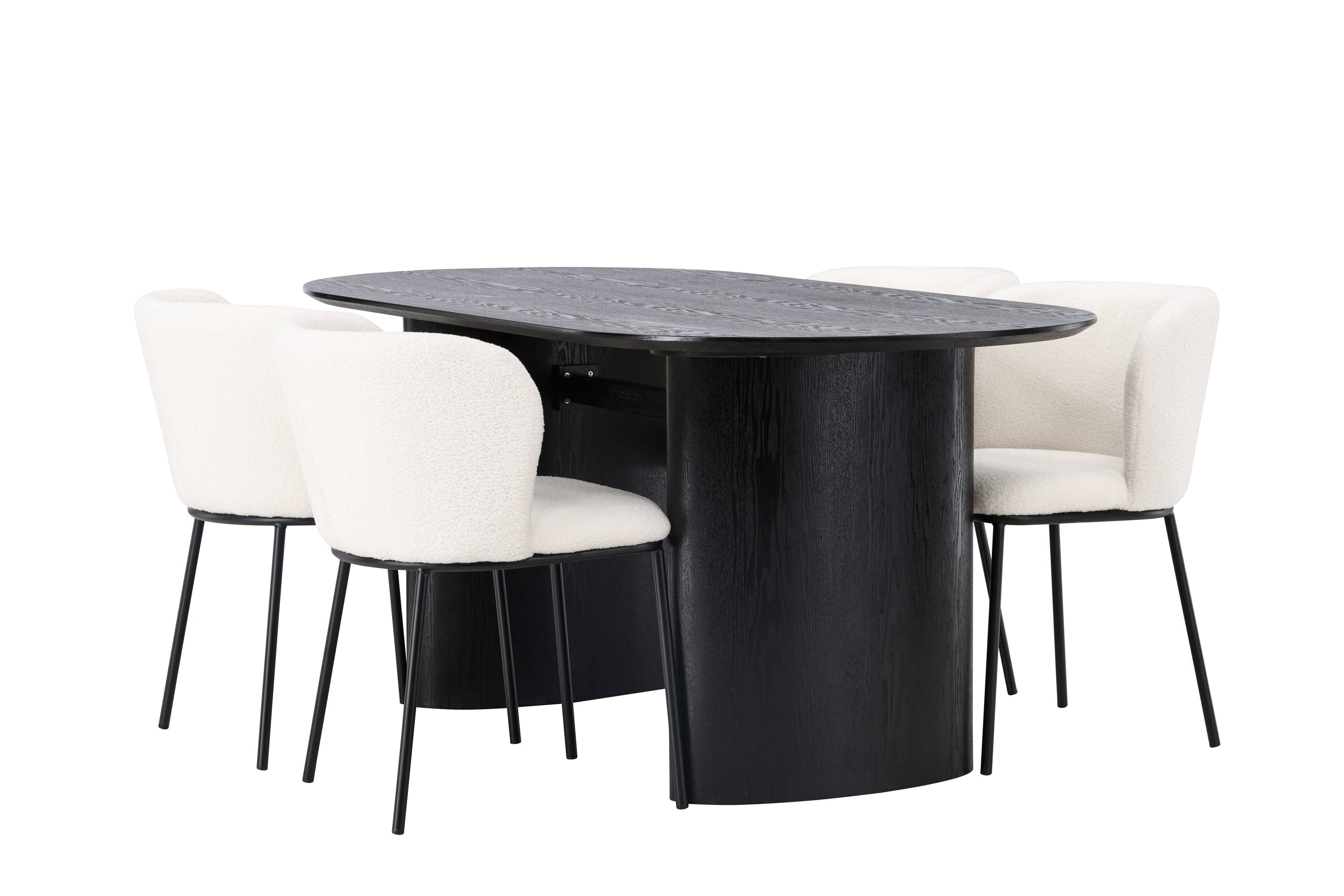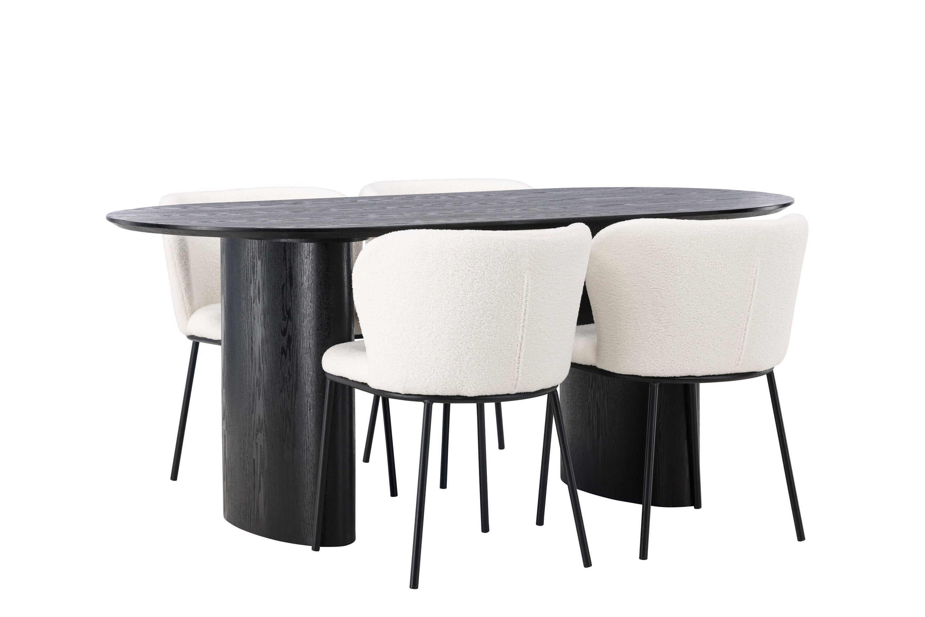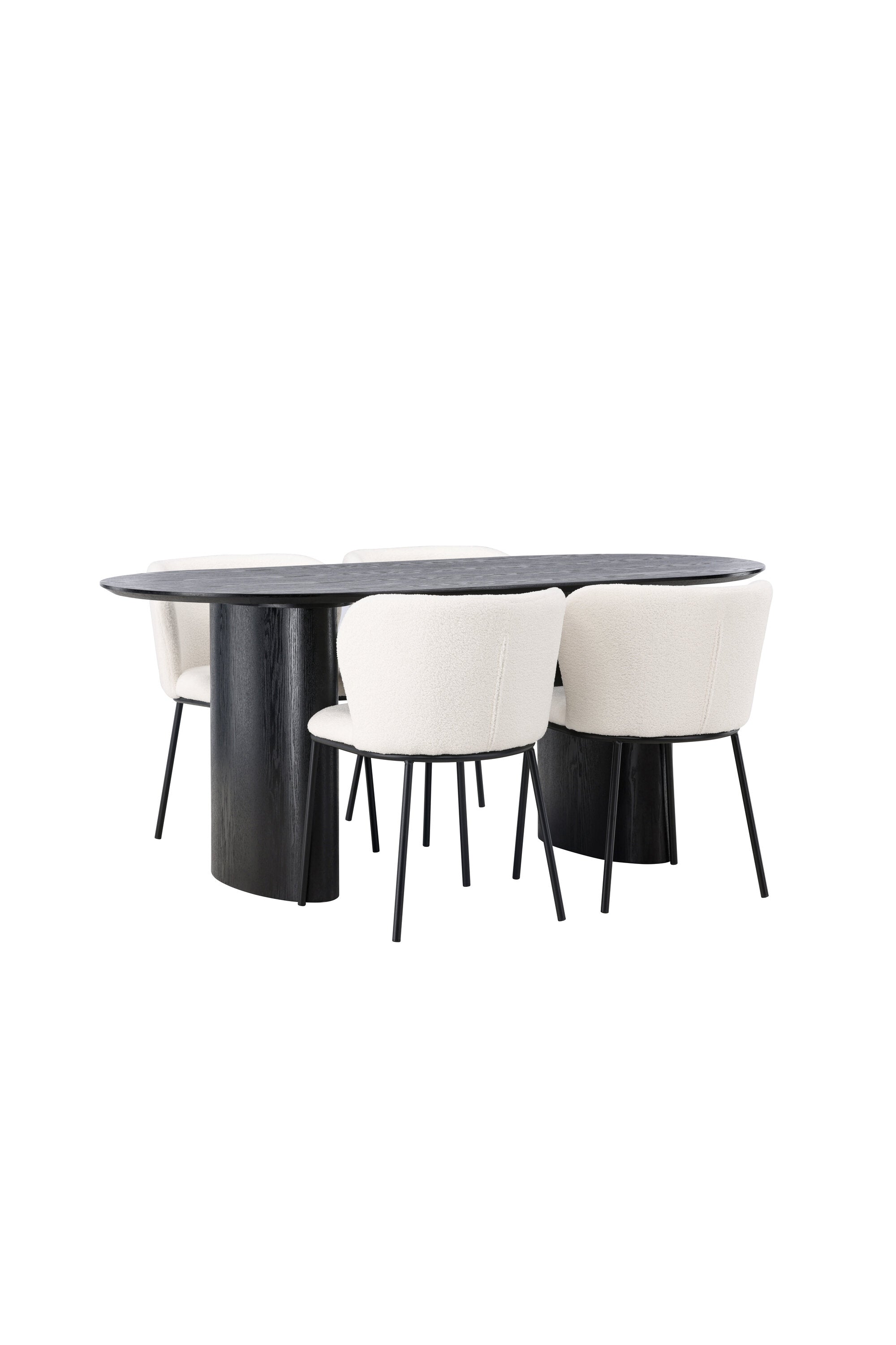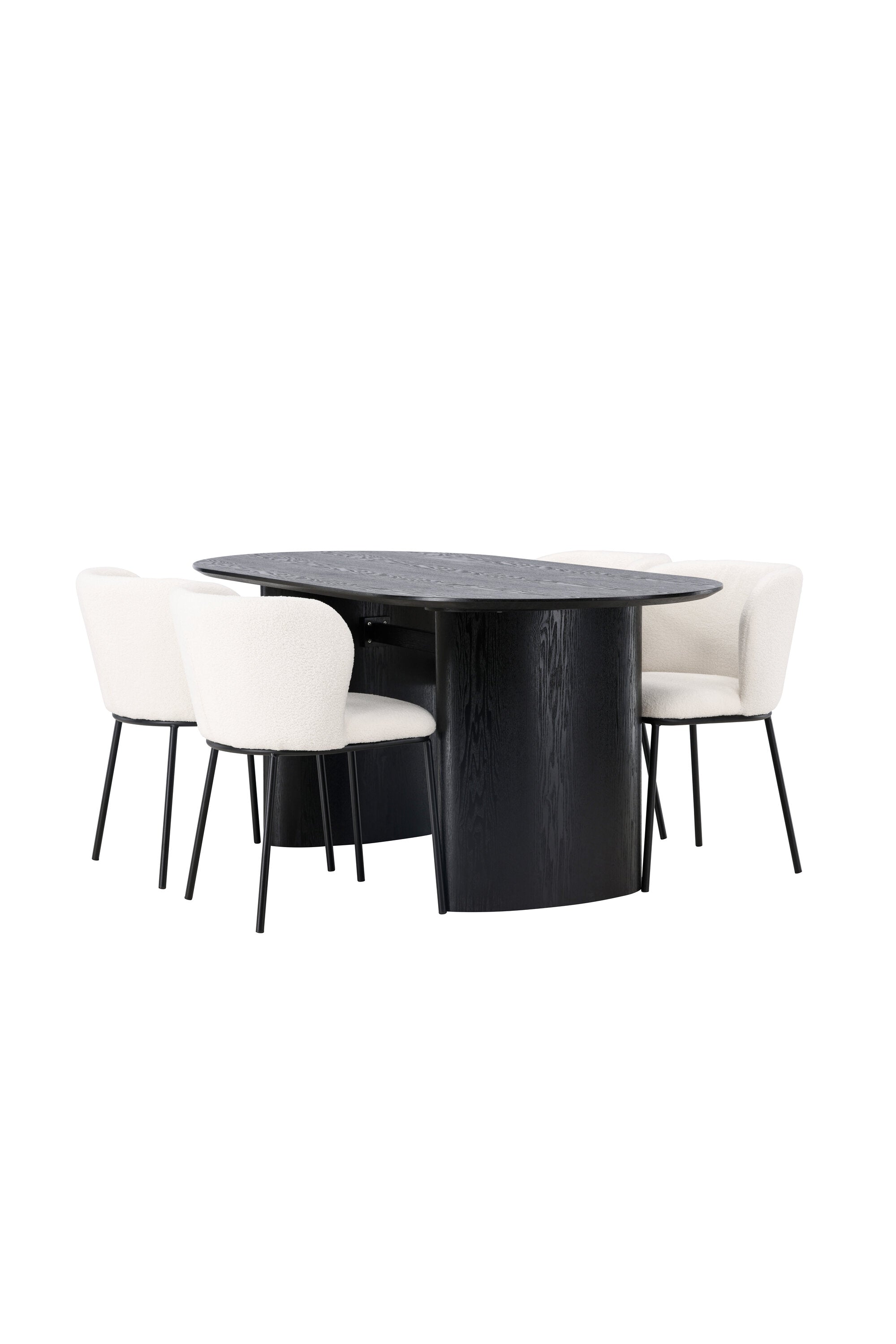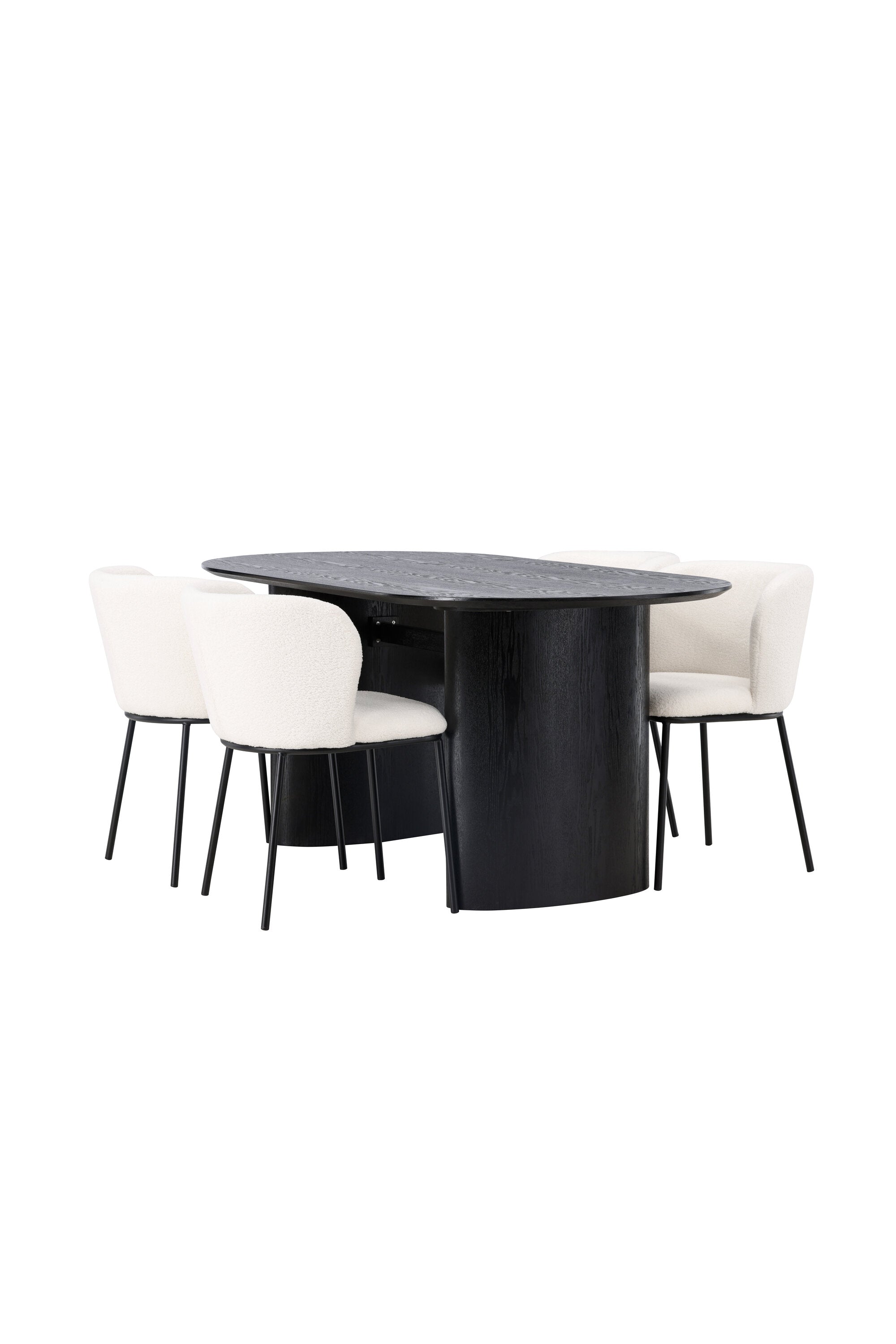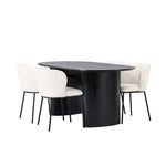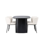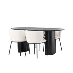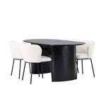 Fantastická kombinace moderních tvarů a měkkých materiálů! Oválný jídelní stůl Isolde v černé barvě má ​​moderní design s oválnou deskou stolu z MDF a robustním rámem, který působí stabilním dojmem. Živý materiál dává poutače krásný pohyb. Zde v nádherné kombinaci s bílými jídelními židlemi ze série Edina. Židle má pružný, celočalouněný sedák v bílé buklé tkanině a minimalistické nohy z černého kovu. Stylový design a pohodlný sedák vám dávají pohodlnou jídelní židli, která obstojí ve zkoušce času. Rozměry stolu: 180x75cm.