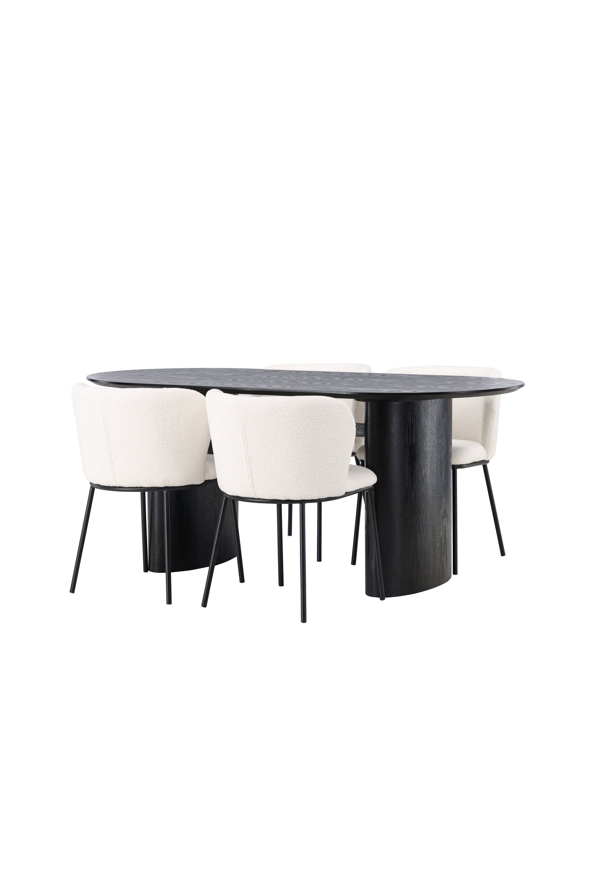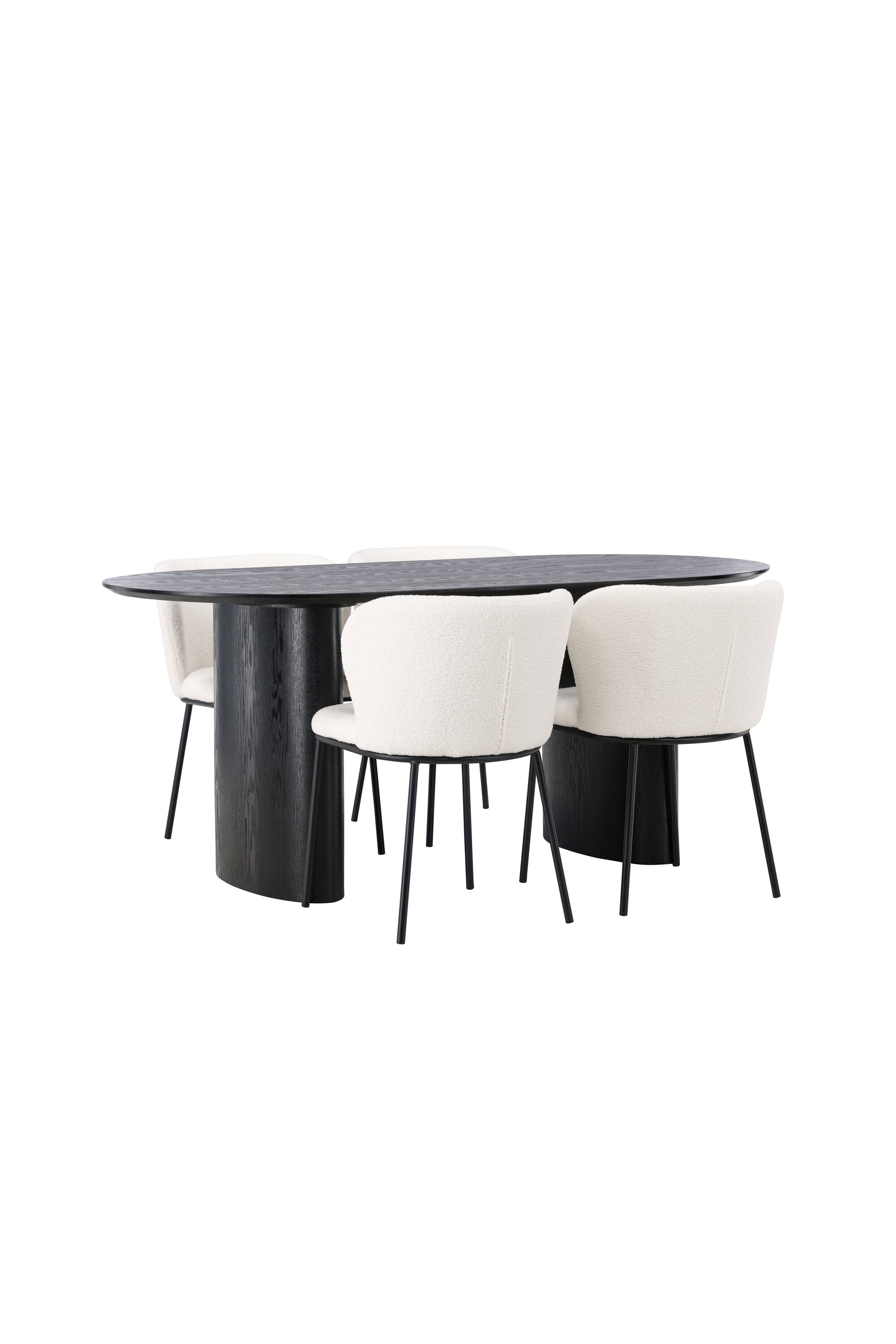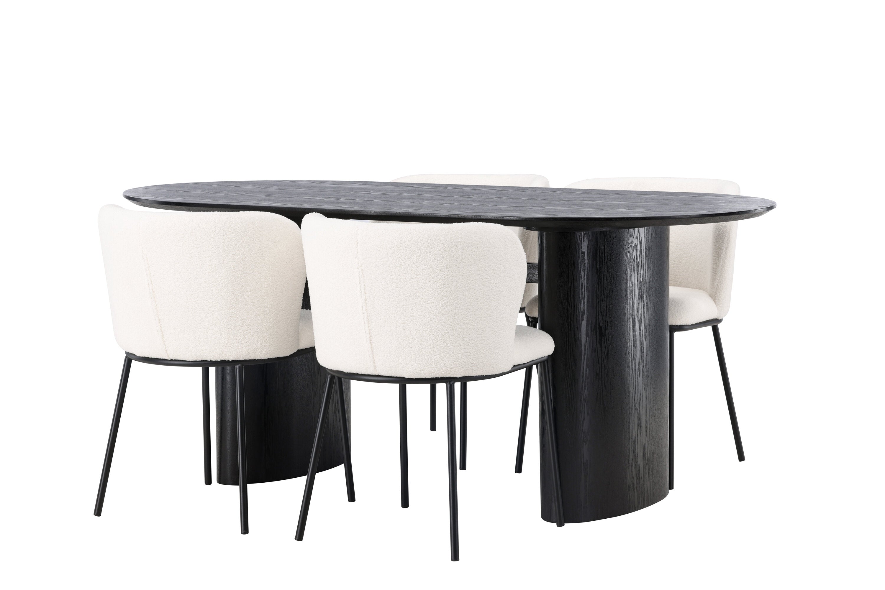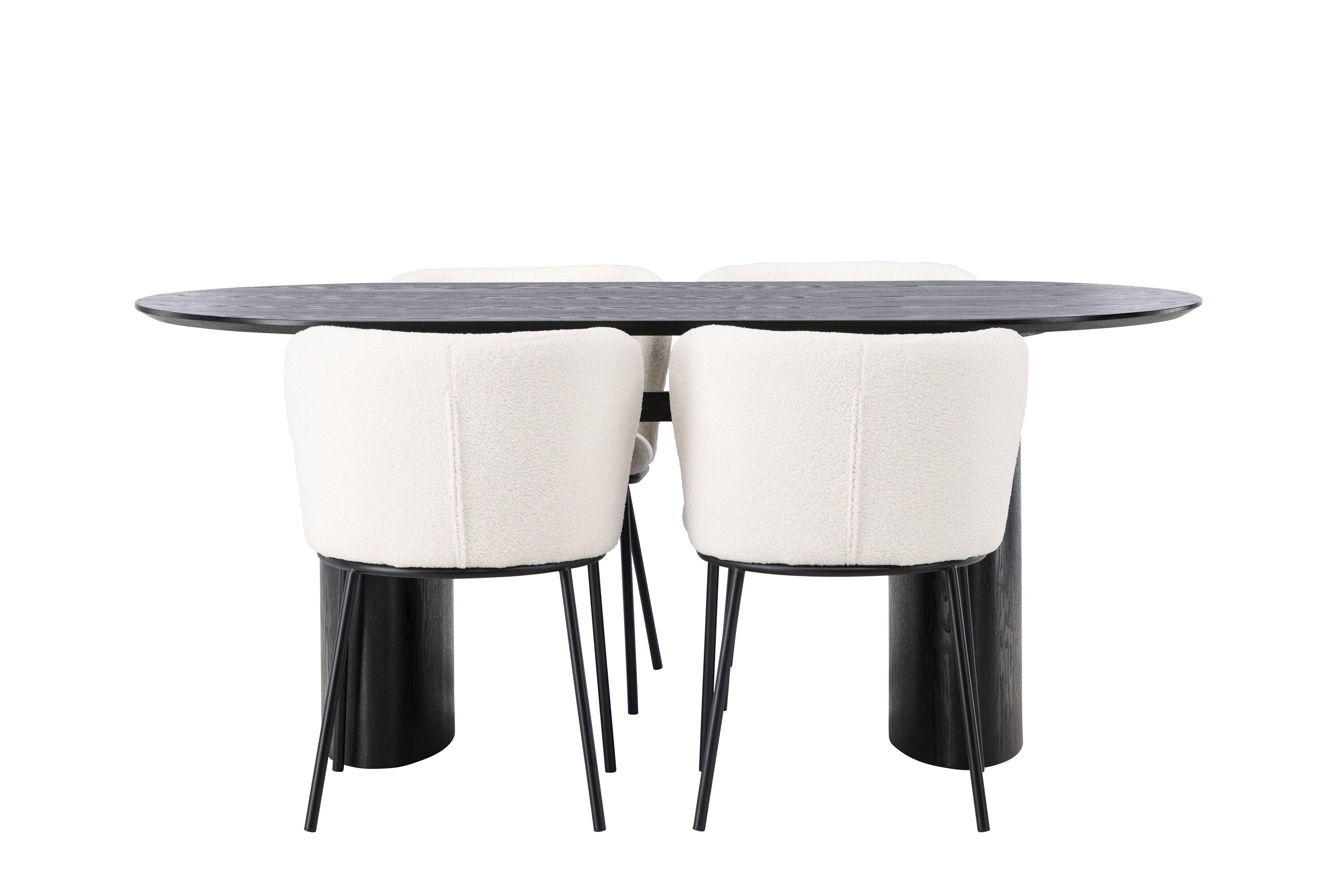 Fantastická kombinace moderních tvarů a měkkých materiálů! Oválný jídelní stůl Isolde v černé barvě má ​​moderní design s oválnou deskou stolu z MDF a robustním rámem, který působí stabilním dojmem. Živý materiál dává poutače krásný pohyb. Zde v nádherné kombinaci s bílými jídelními židlemi ze série Edina. Židle má pružný, celočalouněný sedák v bílé buklé tkanině a minimalistické nohy z černého kovu. Stylový design a pohodlný sedák vám dávají pohodlnou jídelní židli, která obstojí ve zkoušce času. Rozměry stolu: 180x75cm.