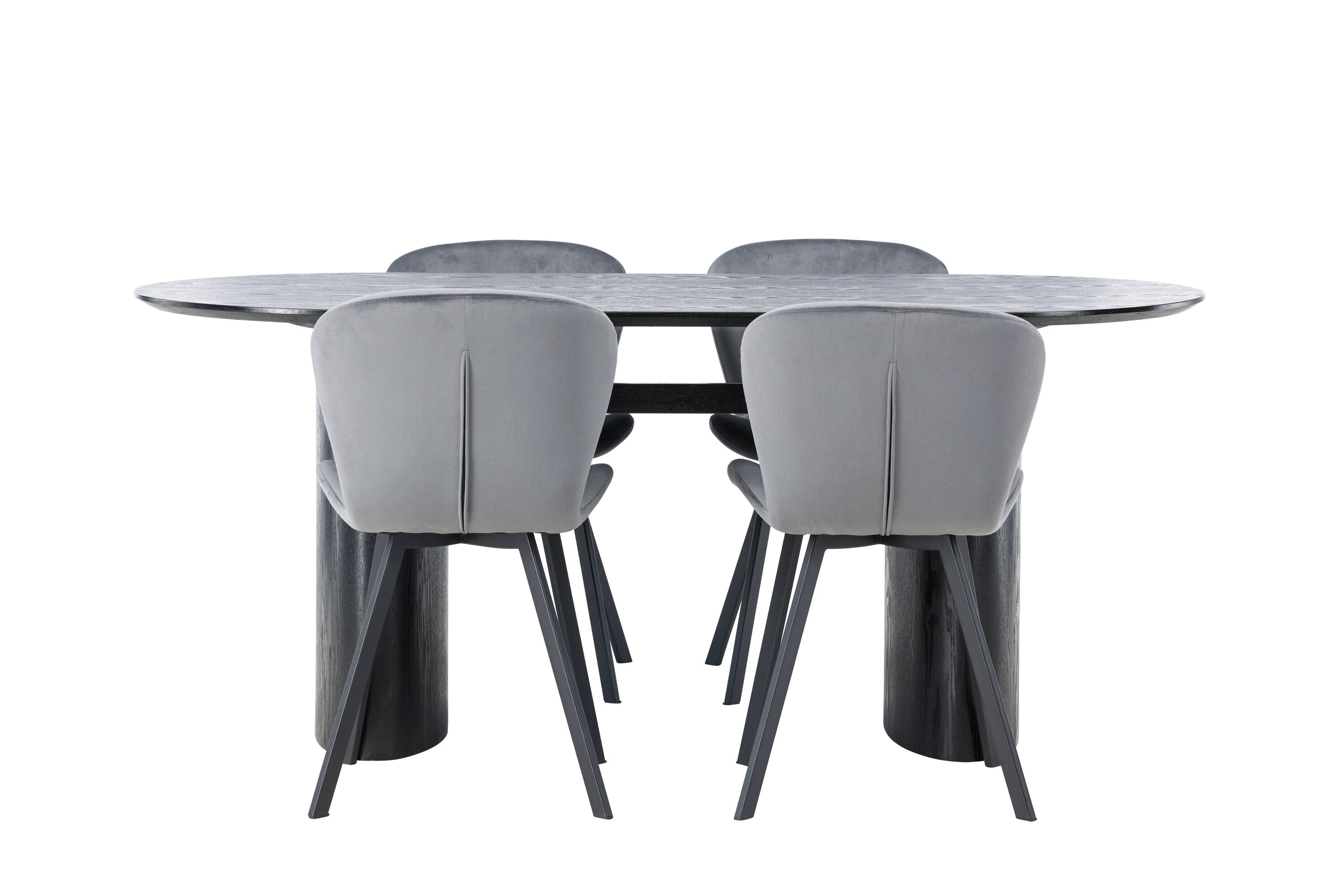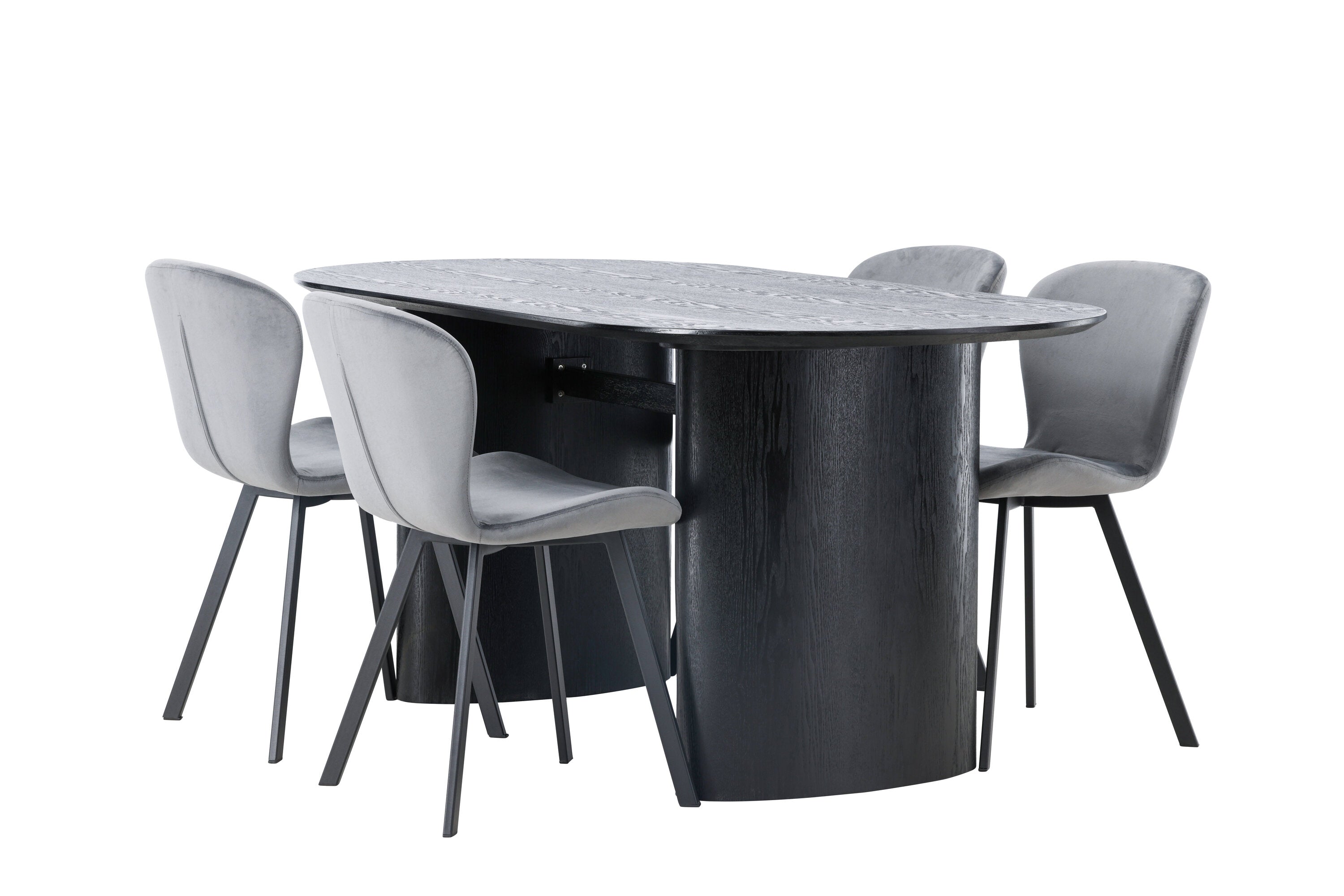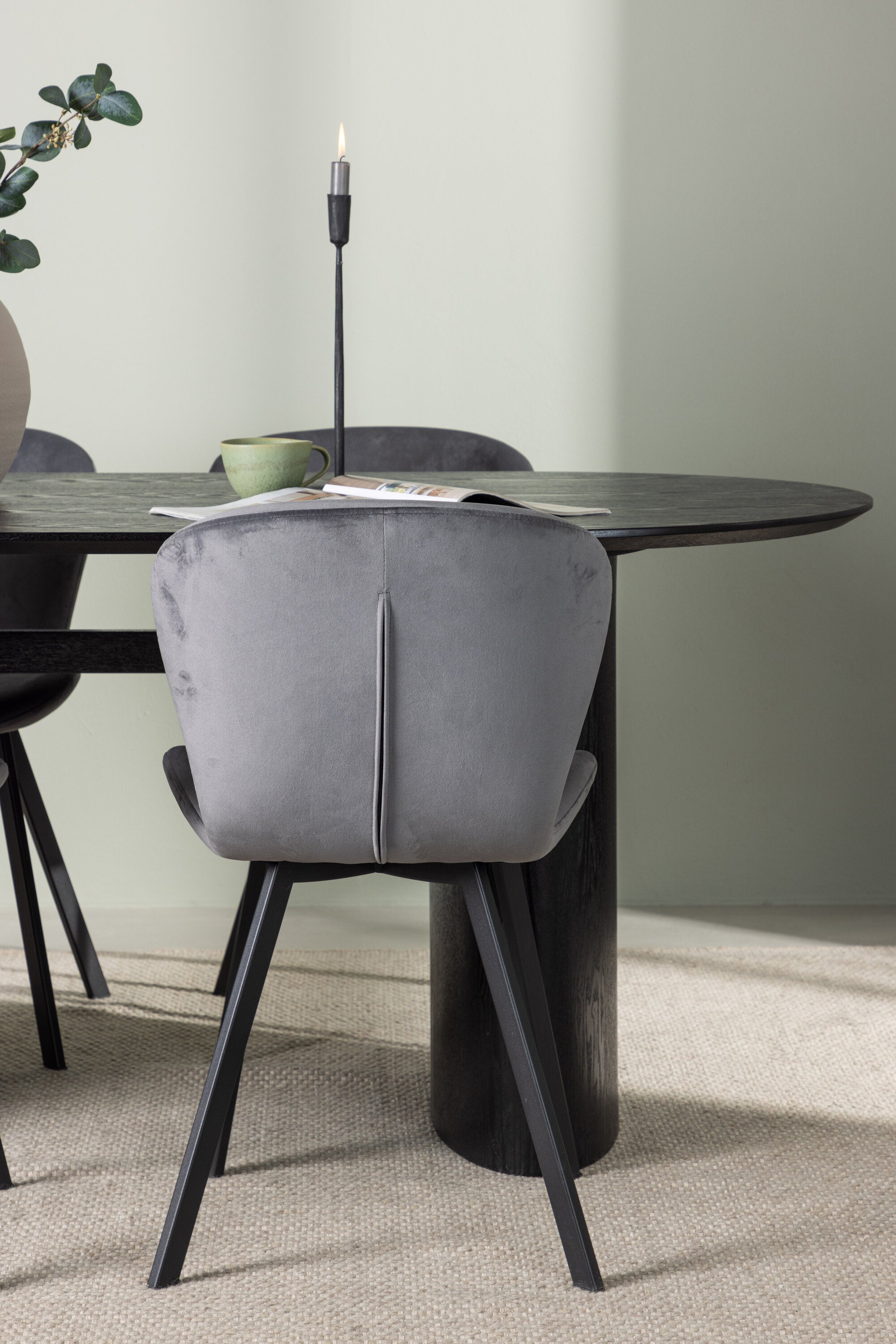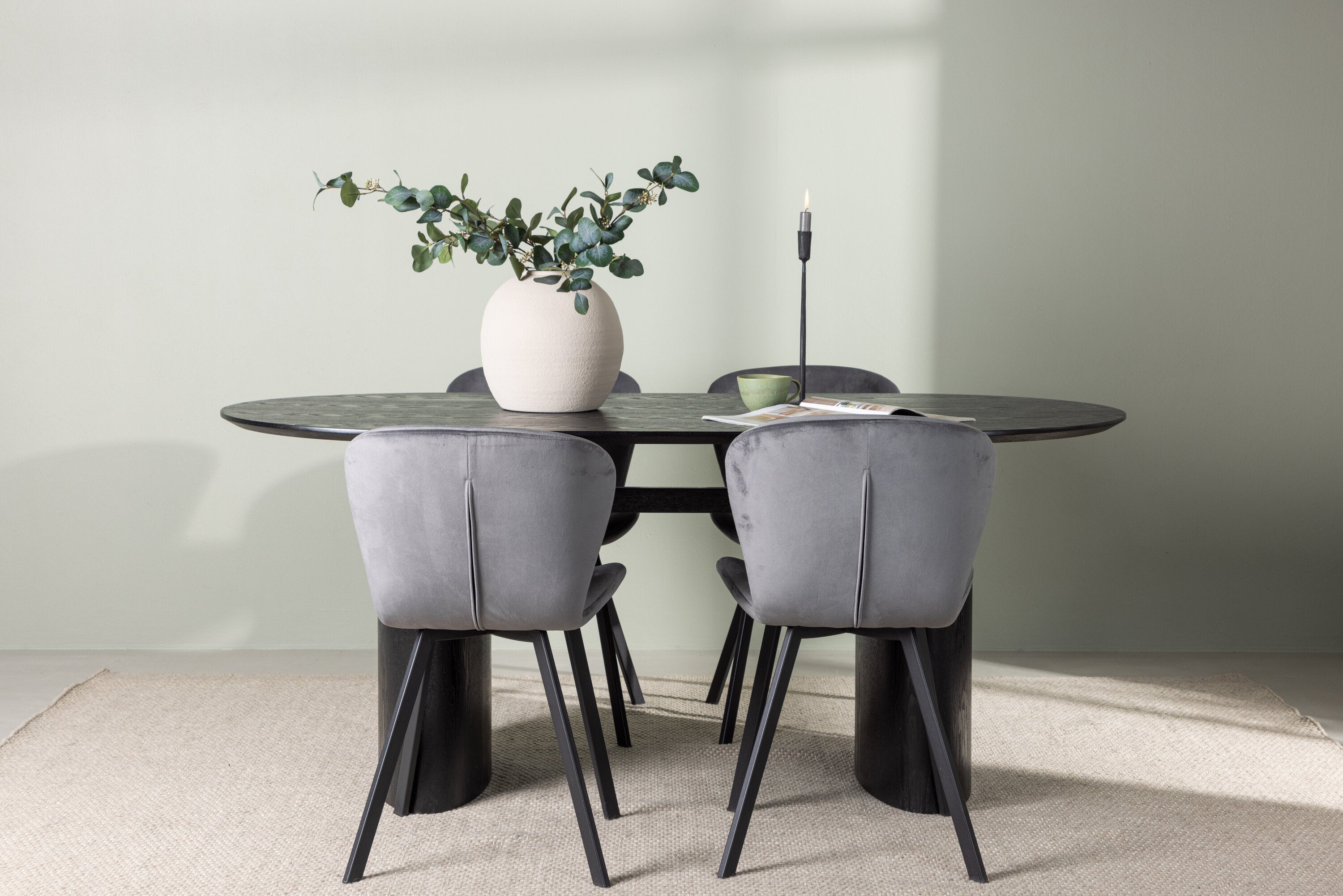 Příjemná barevná kombinace! Oválný jídelní stůl Isolde v černé barvě má ​​moderní design s oválnou deskou stolu z MDF a robustním rámem, který působí stabilním dojmem. Živý materiál dává poutače krásný pohyb. Zde v nádherné kombinaci s béžovými jídelními židlemi ze série Lilja. Židle má poddajný kulatý design se sedákem z béžové polyesterové tkaniny a mírně rozšířenými nohami židle v černém kovu. Zařiďte si obývací pokoj útulně! Rozměry stolu: 180x75cm.
