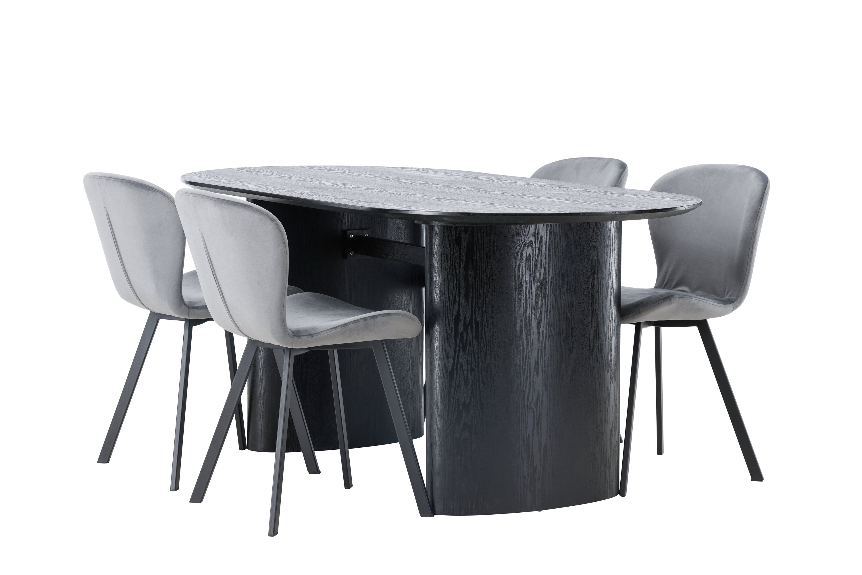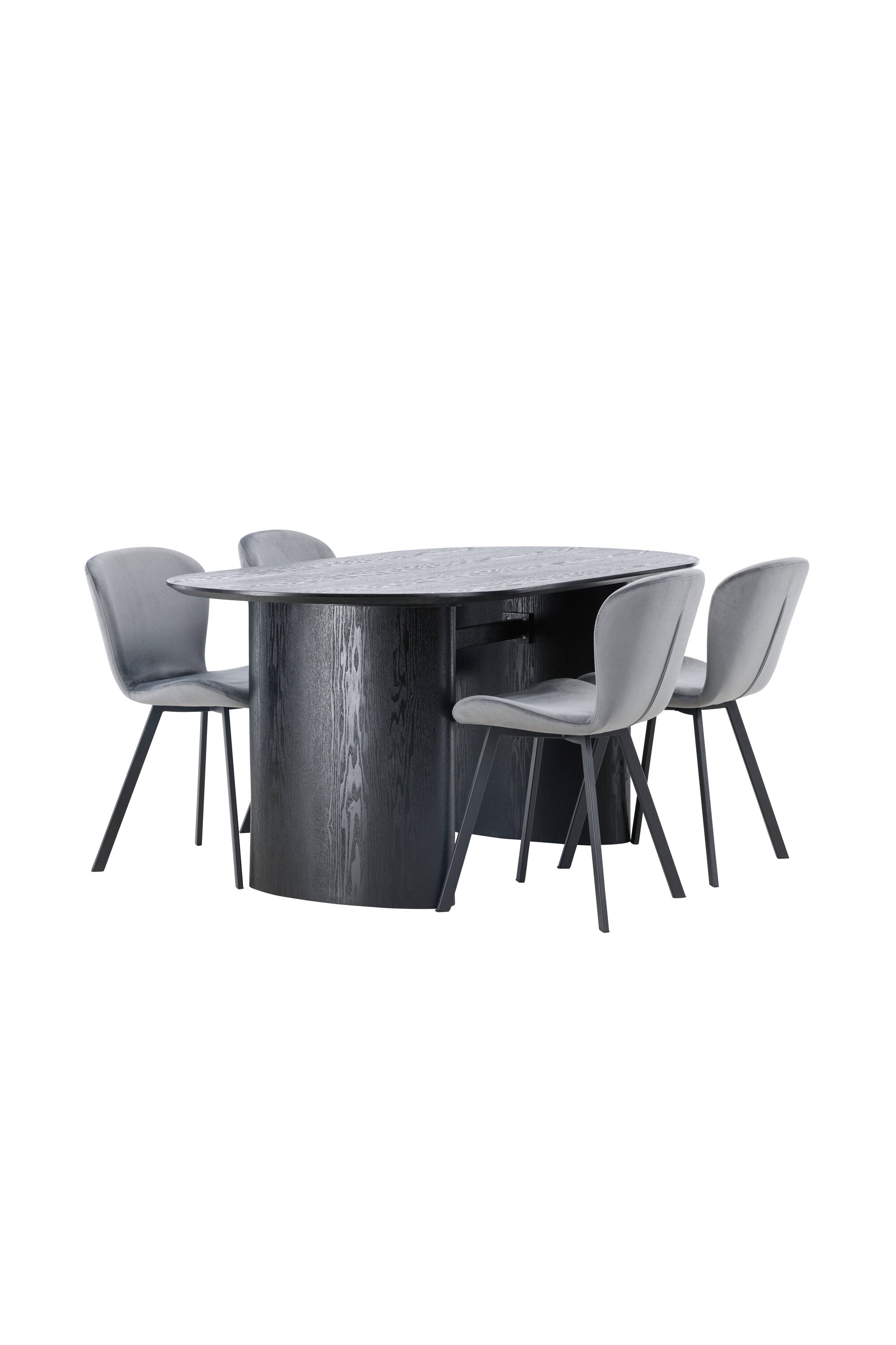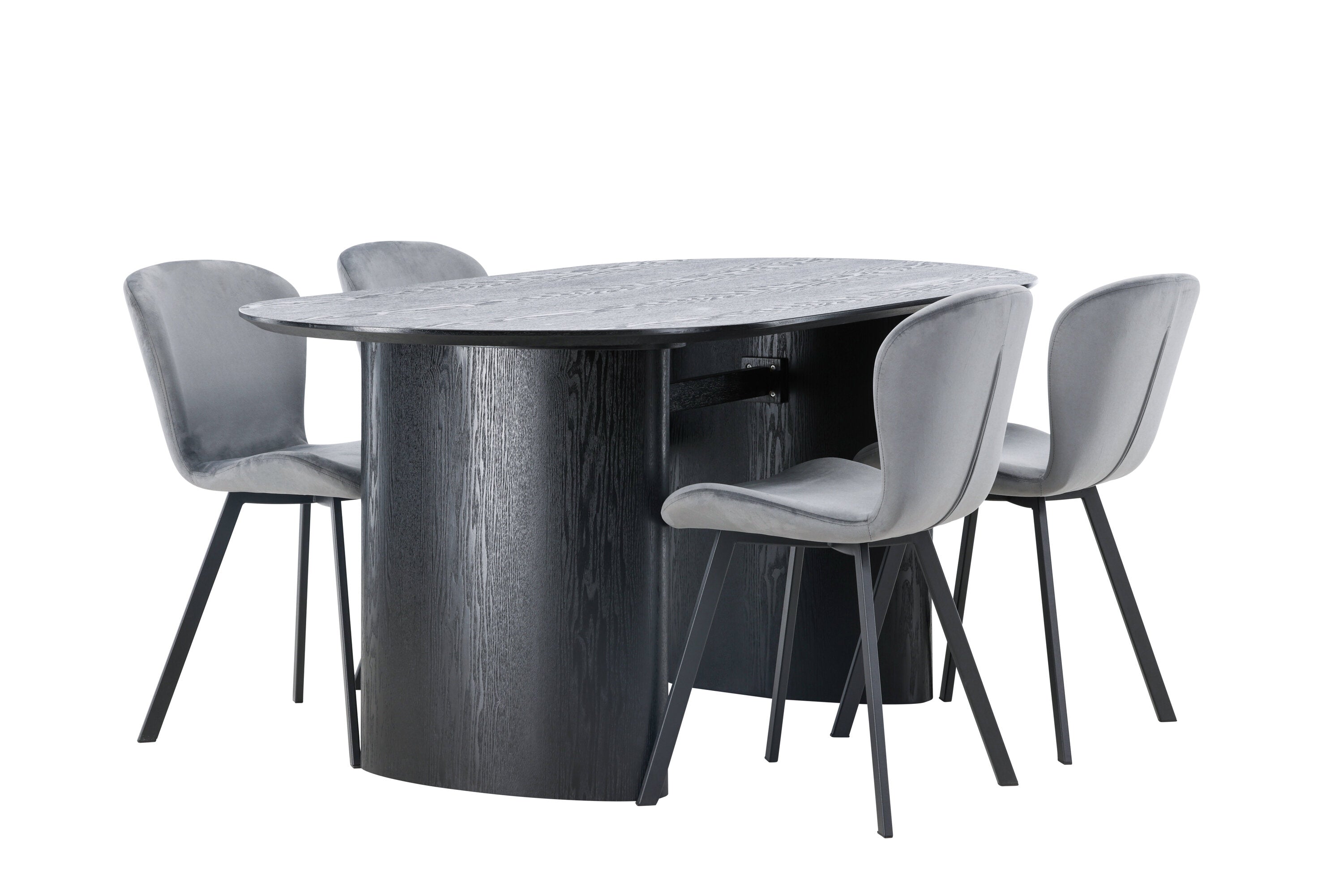 Příjemná barevná kombinace! Oválný jídelní stůl Isolde v černé barvě má ​​moderní design s oválnou deskou stolu z MDF a robustním rámem, který působí stabilním dojmem. Živý materiál dává poutače krásný pohyb. Zde v nádherné kombinaci s béžovými jídelními židlemi ze série Lilja. Židle má poddajný kulatý design se sedákem z béžové polyesterové tkaniny a mírně rozšířenými nohami židle v černém kovu. Zařiďte si obývací pokoj útulně! Rozměry stolu: 180x75cm.