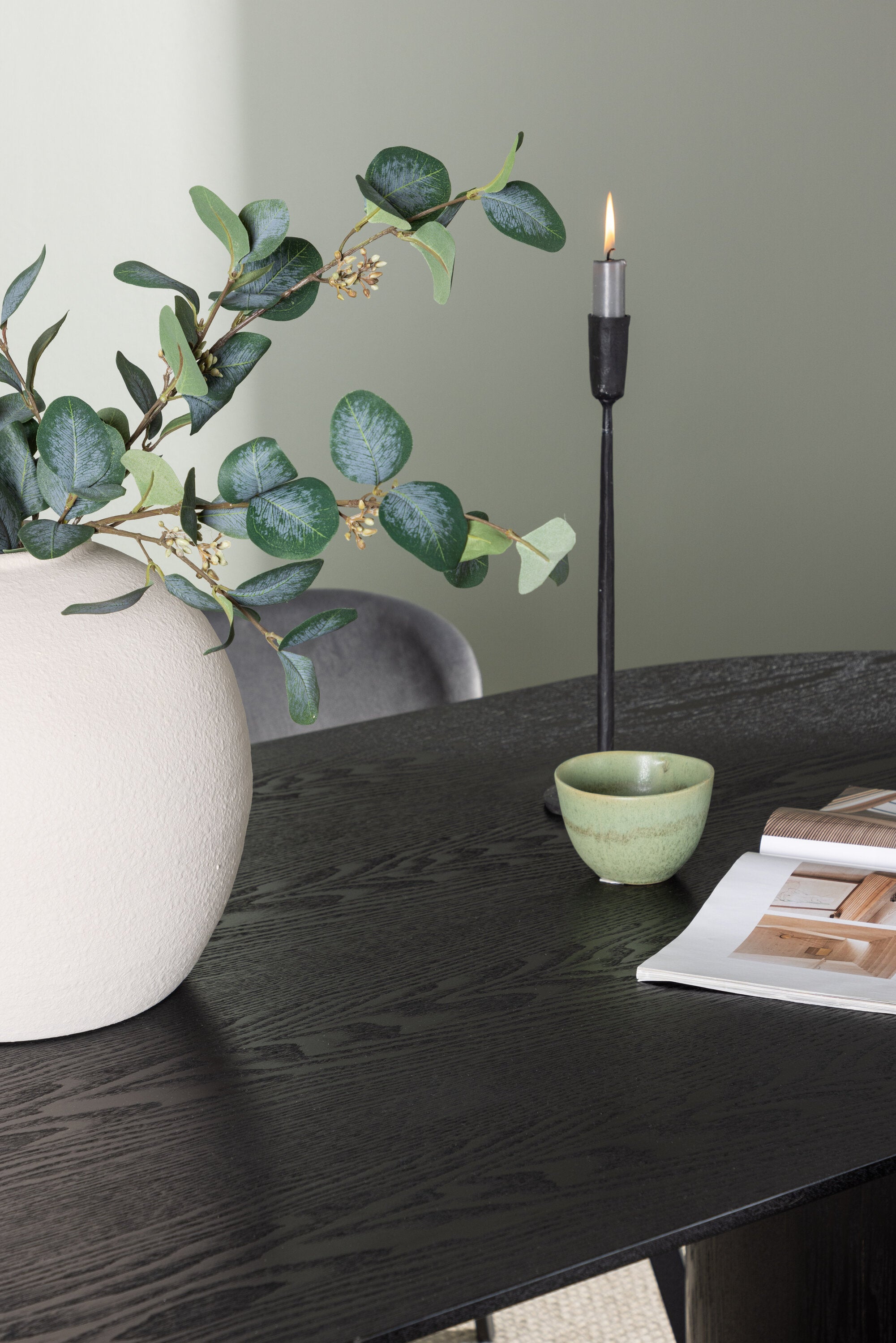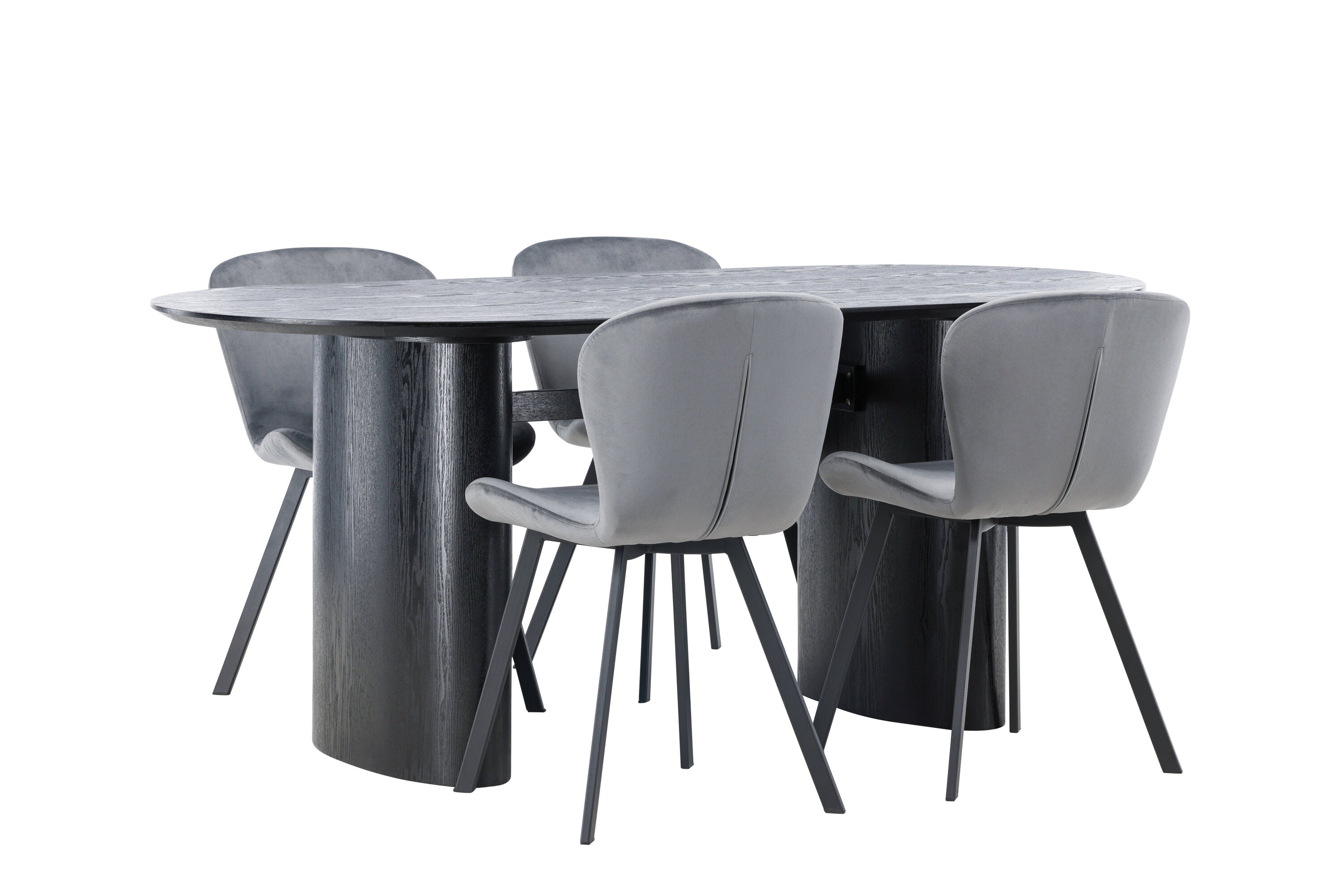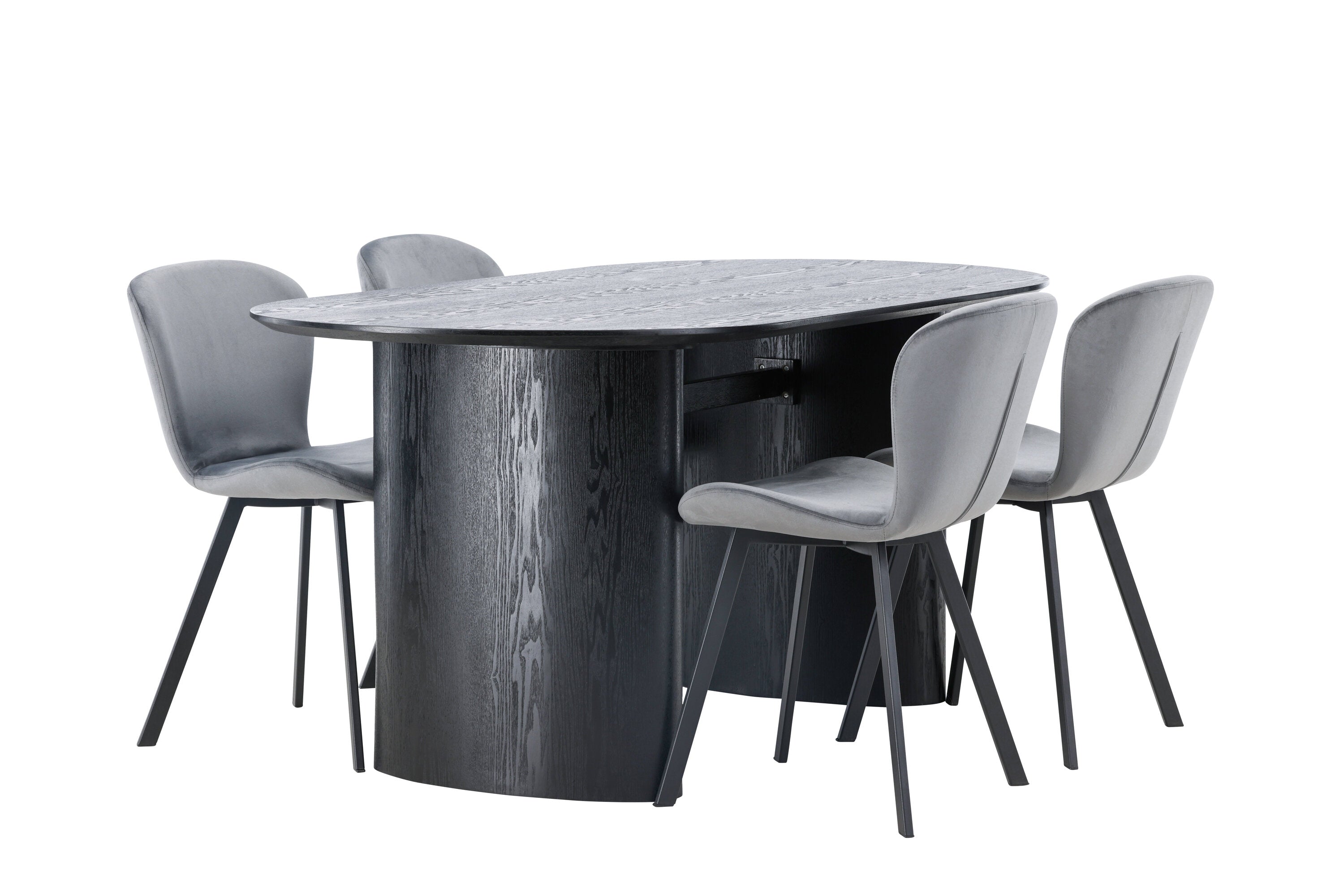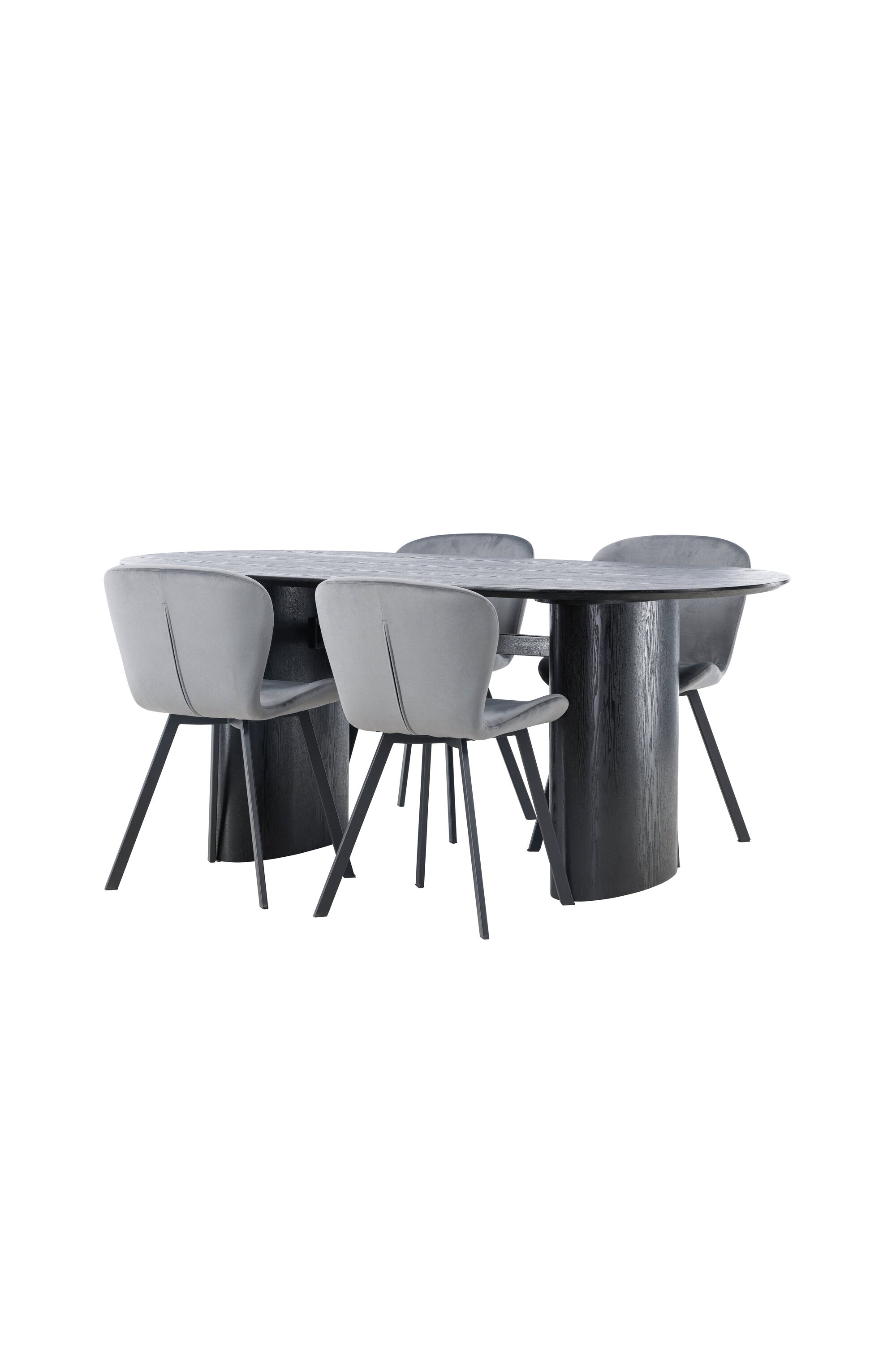 Příjemná barevná kombinace! Oválný jídelní stůl Isolde v černé barvě má ​​moderní design s oválnou deskou stolu z MDF a robustním rámem, který působí stabilním dojmem. Živý materiál dává poutače krásný pohyb. Zde v nádherné kombinaci s béžovými jídelními židlemi ze série Lilja. Židle má poddajný kulatý design se sedákem z béžové polyesterové tkaniny a mírně rozšířenými nohami židle v černém kovu. Zařiďte si obývací pokoj útulně! Rozměry stolu: 180x75cm.