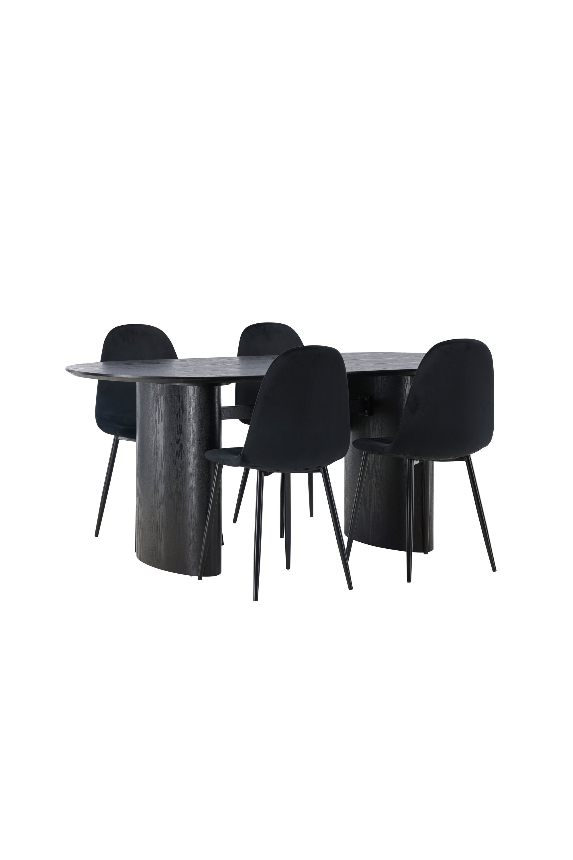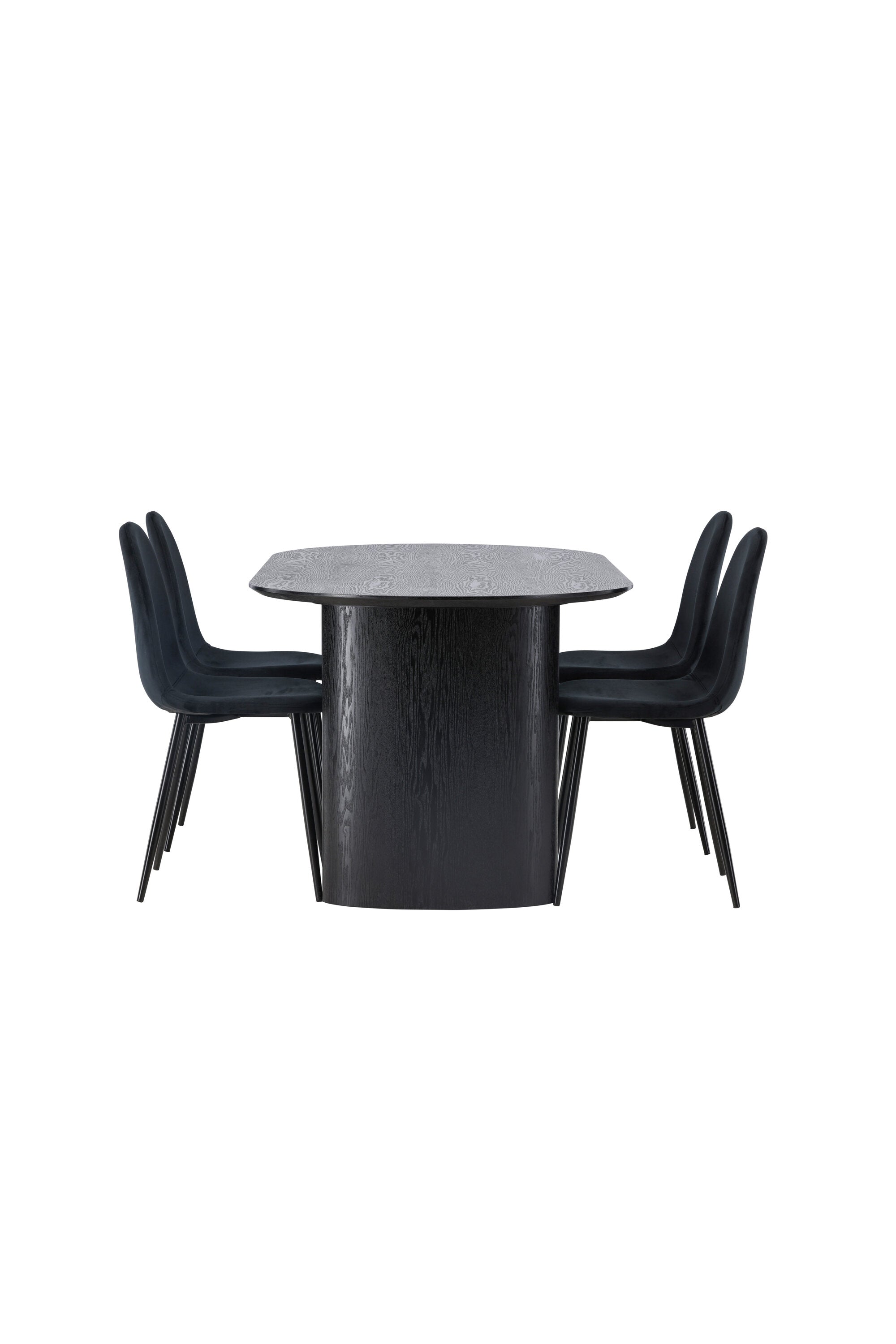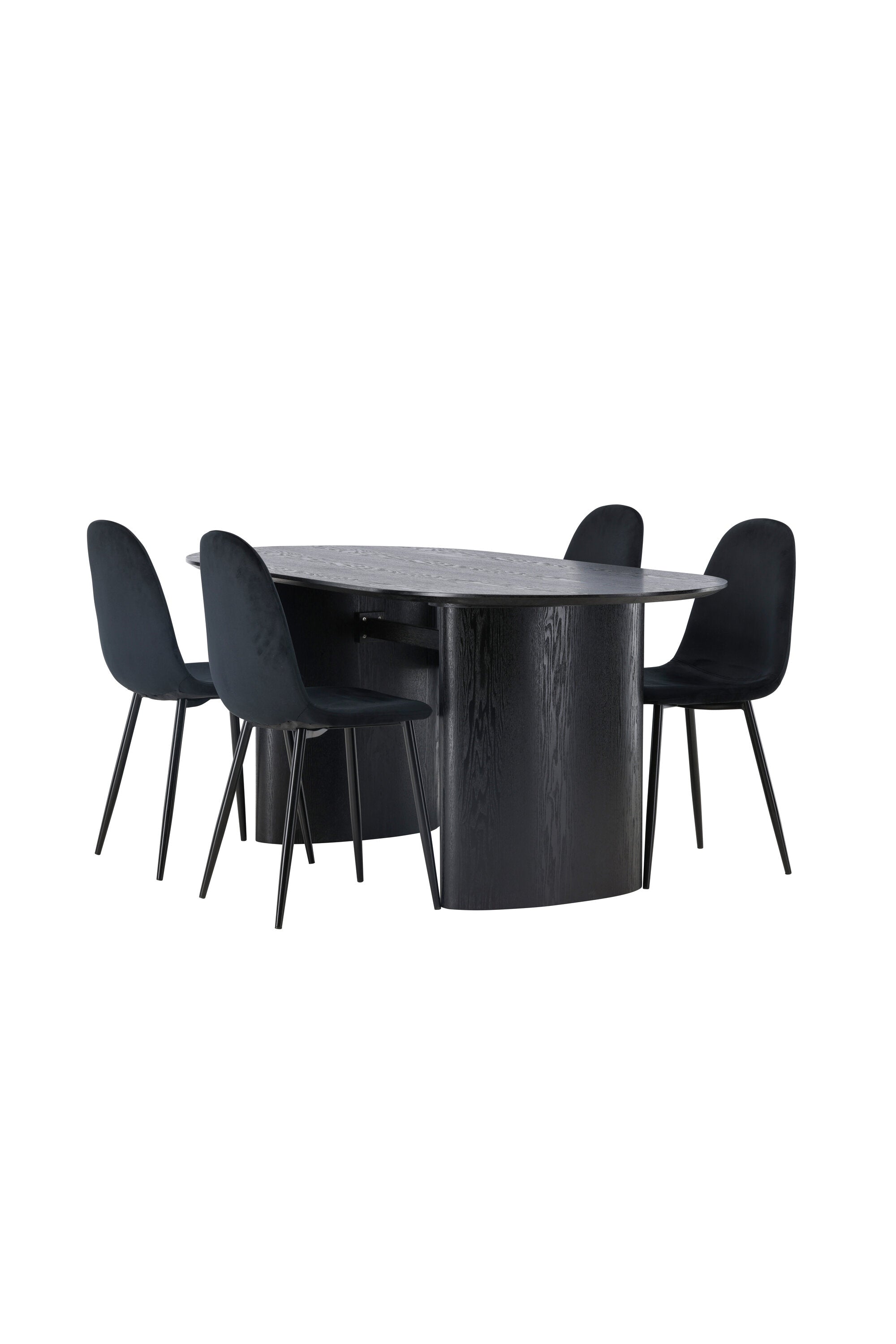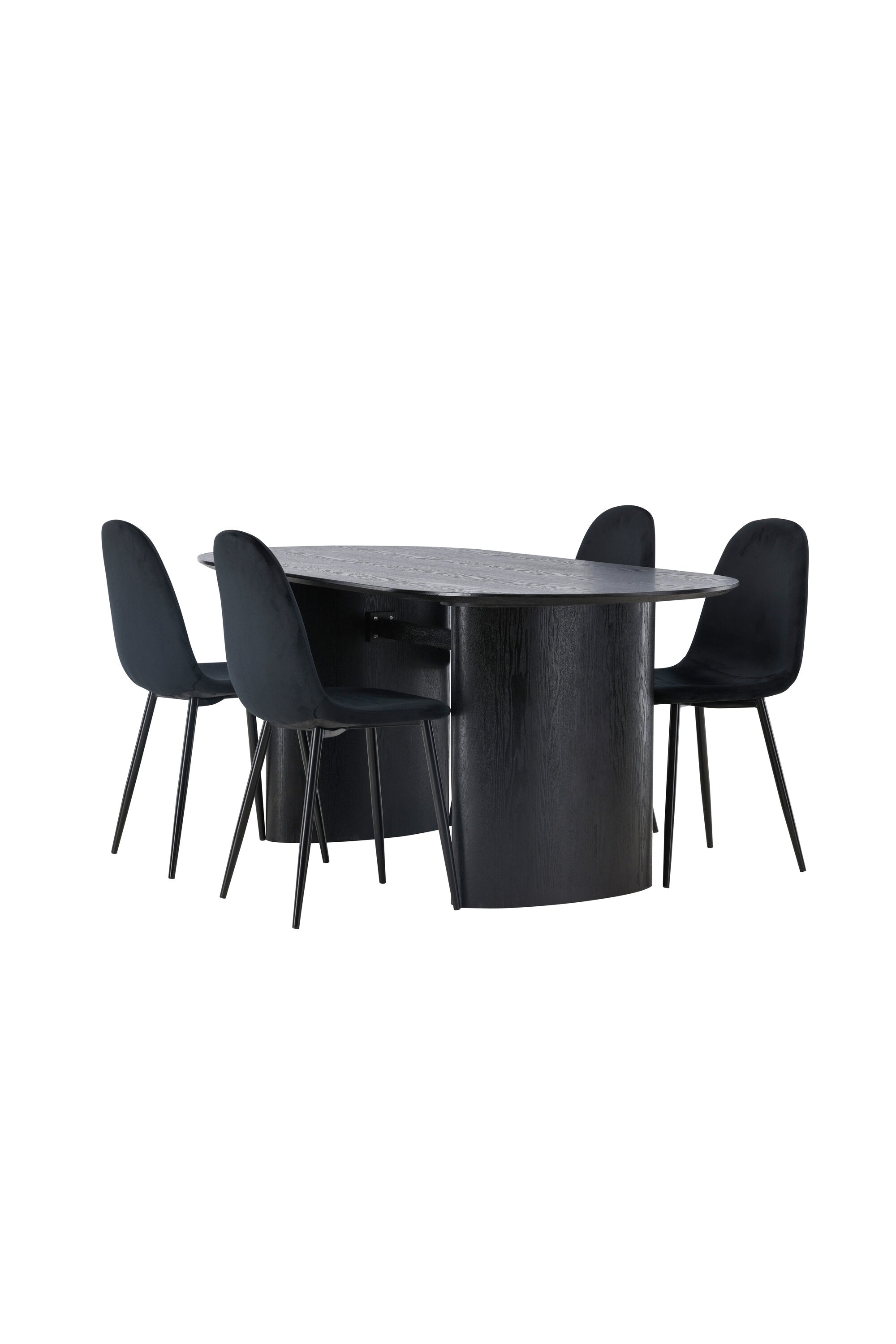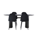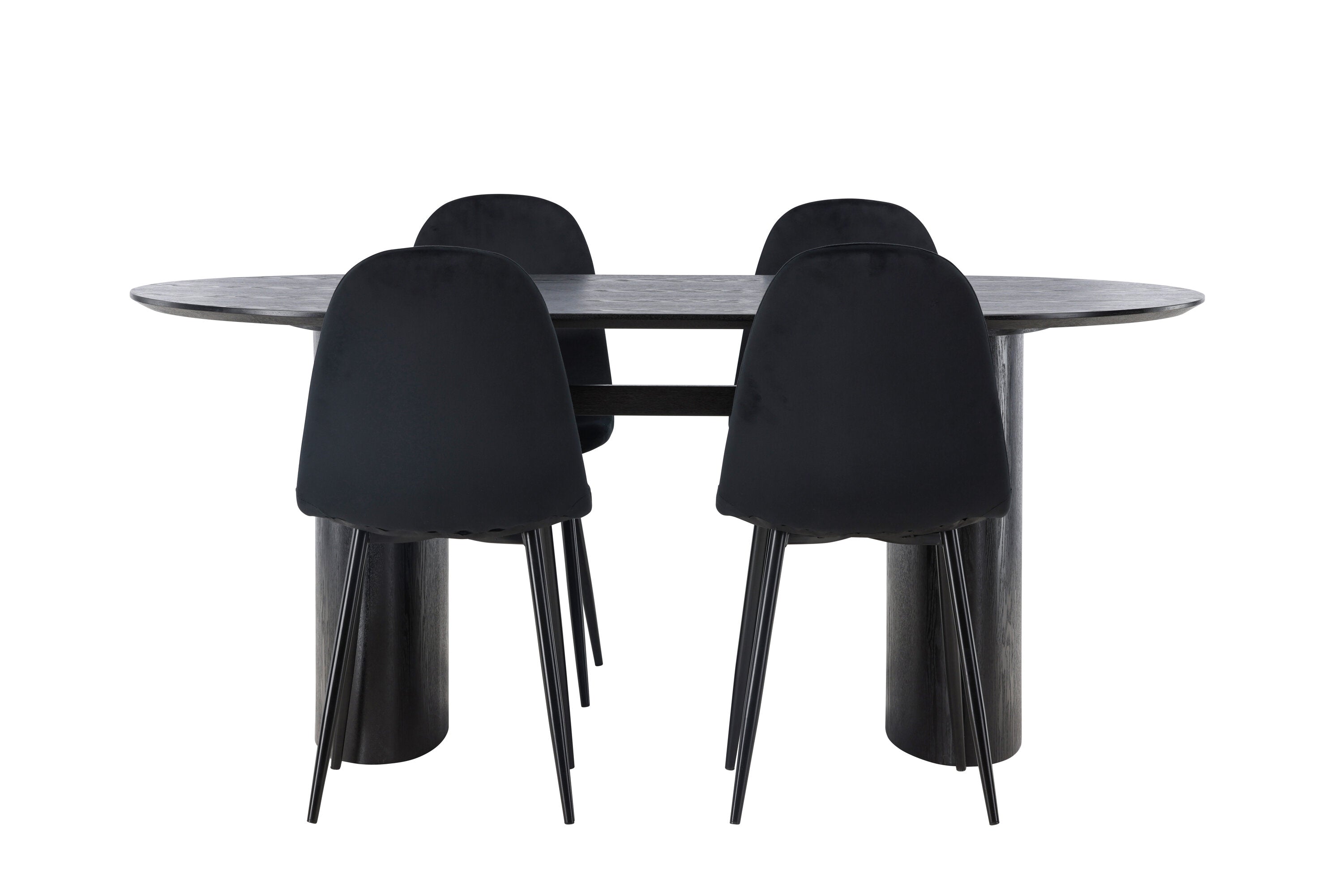 Trendy jídelní sestava v černé barvě! Oválný jídelní stůl Isolde v černé barvě má ​​moderní design s oválnou deskou stolu z MDF a robustním rámem, který působí stabilním dojmem. Živý materiál dává vkusný pohyb poutače. Zde ve stylové kombinaci s černými jídelními židlemi ze série Polar. Židle má celočalouněný design, nohy z kovu s černým práškovým nástřikem a zaoblené opěradlo a sedák z černé sametové látky s měkkým polstrováním. Tato jídelní skupina se cítí jak osobní, tak příjemná! Rozměry stolu: 180x75cm.