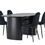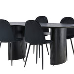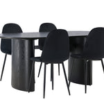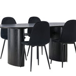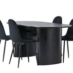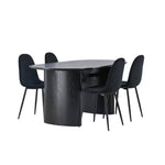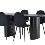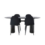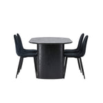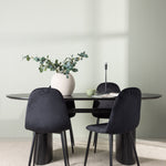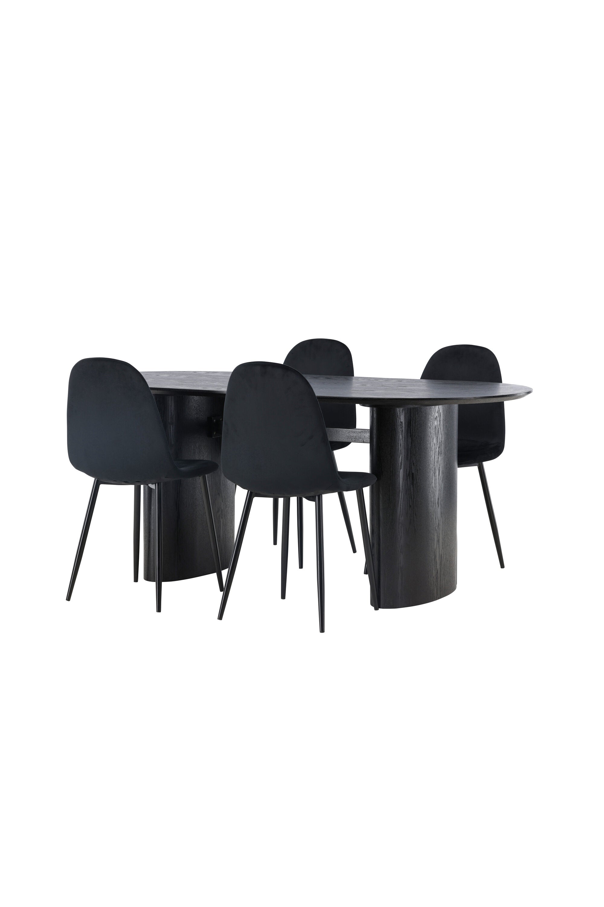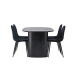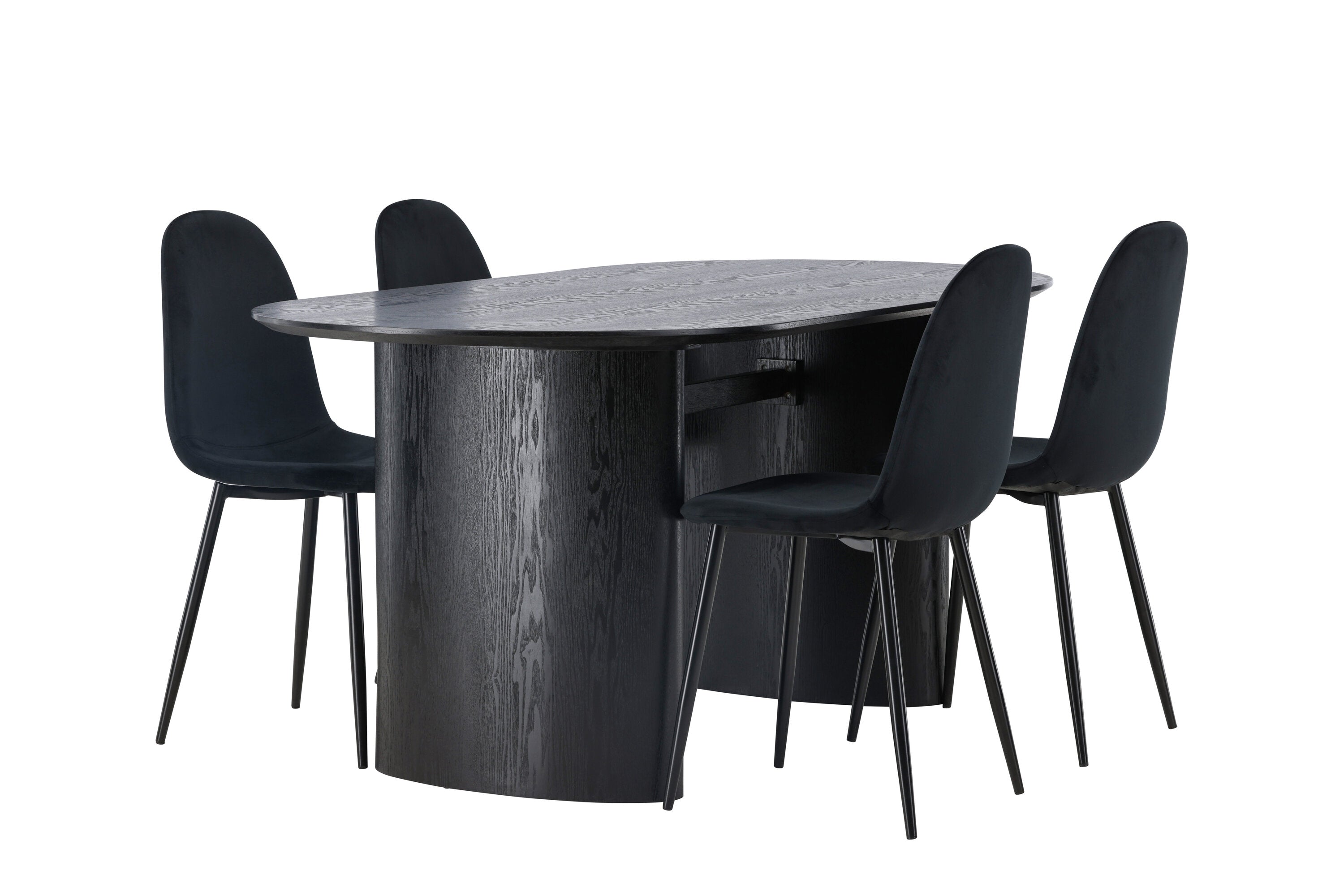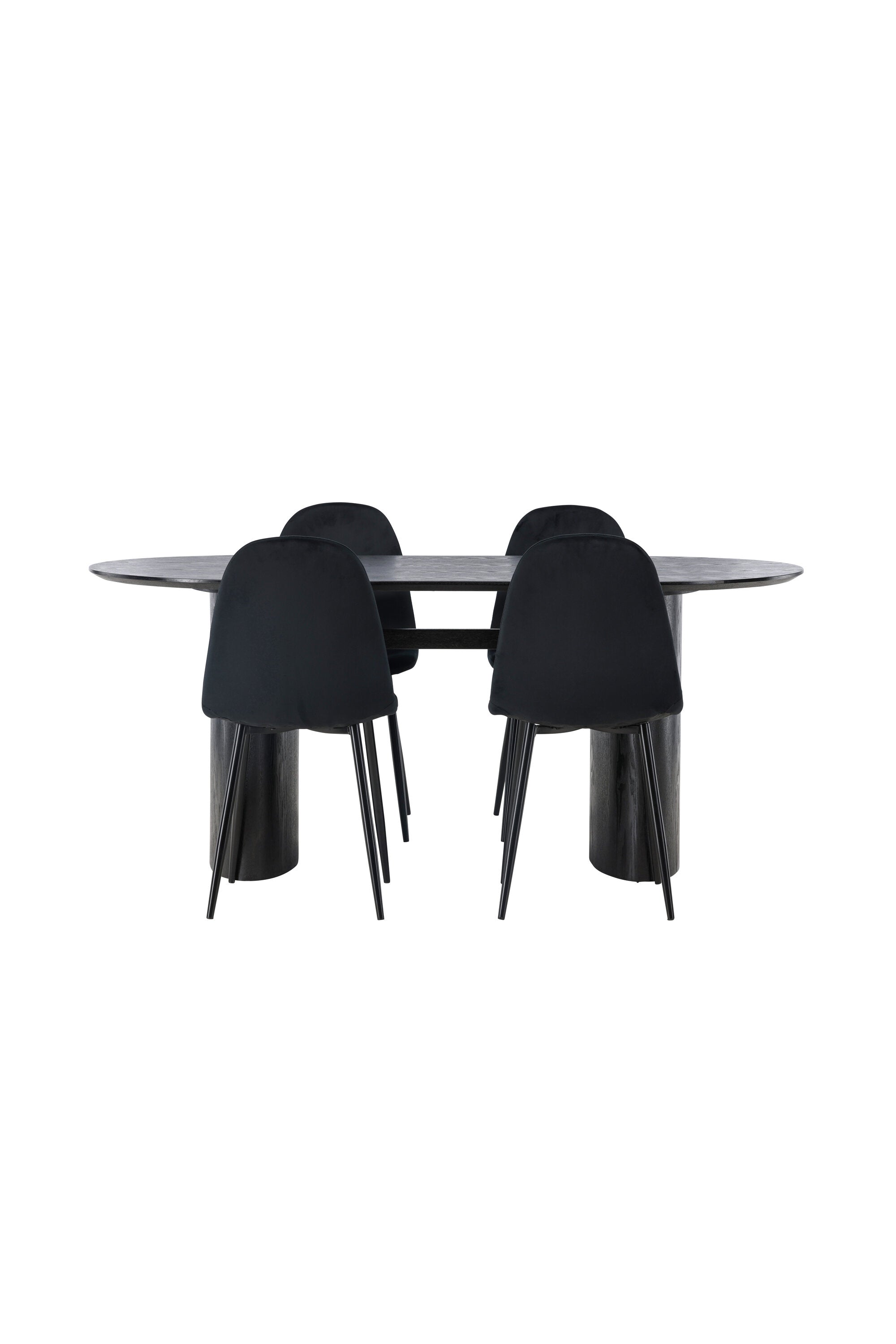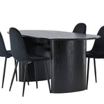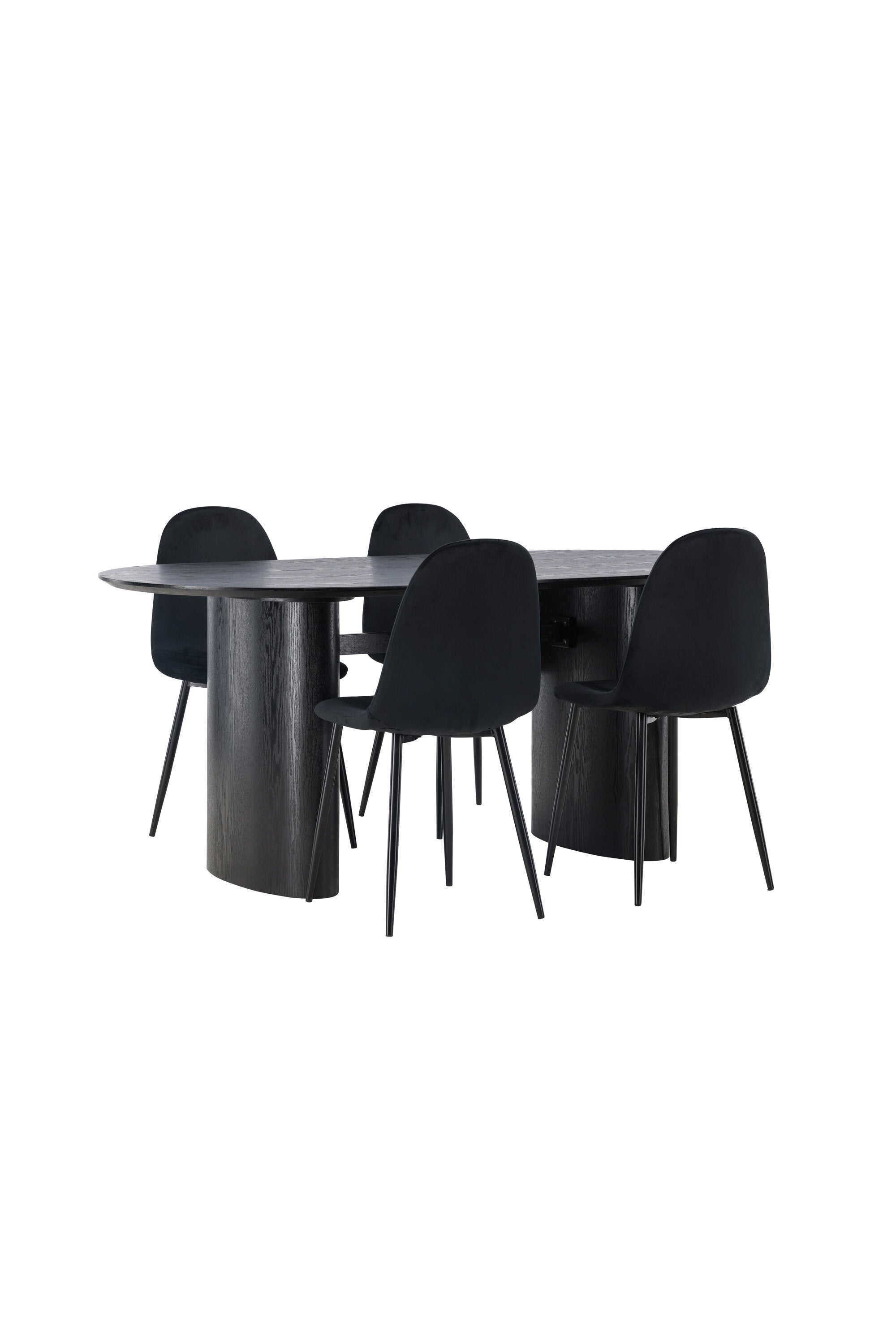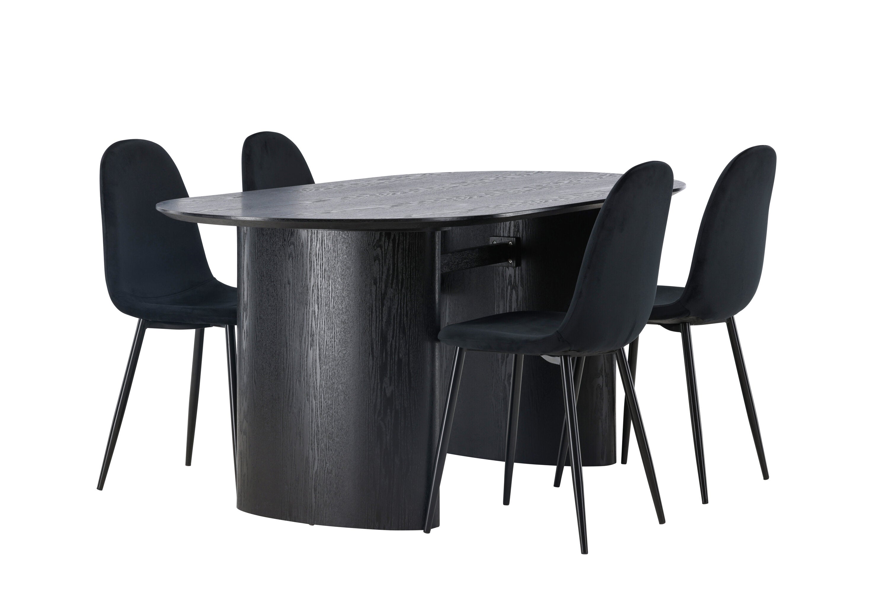 Trendy jídelní sestava v černé barvě! Oválný jídelní stůl Isolde v černé barvě má ​​moderní design s oválnou deskou stolu z MDF a robustním rámem, který působí stabilním dojmem. Živý materiál dává vkusný pohyb poutače. Zde ve stylové kombinaci s černými jídelními židlemi ze série Polar. Židle má celočalouněný design, nohy z kovu s černým práškovým nástřikem a zaoblené opěradlo a sedák z černé sametové látky s měkkým polstrováním. Tato jídelní skupina se cítí jak osobní, tak příjemná! Rozměry stolu: 180x75cm.