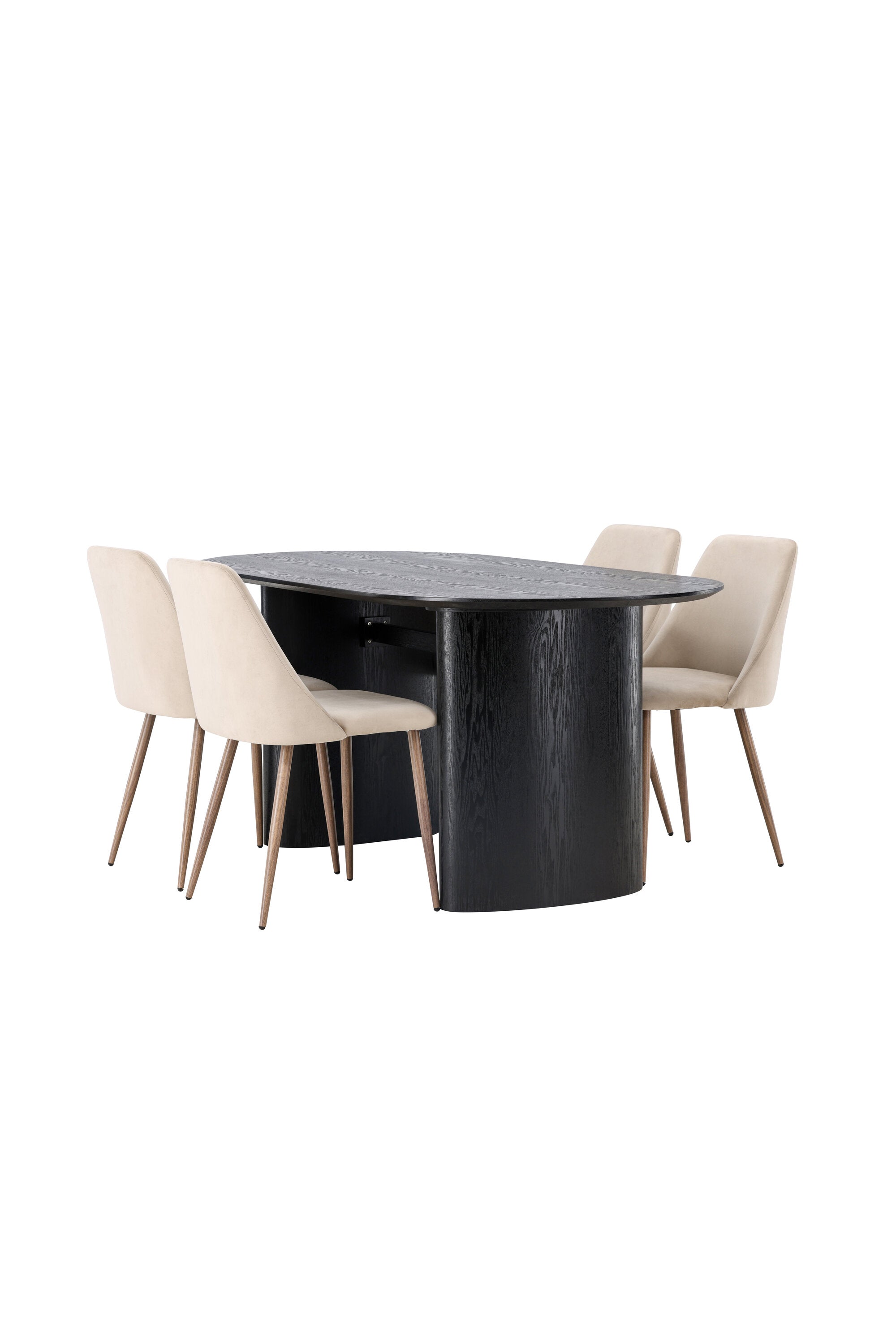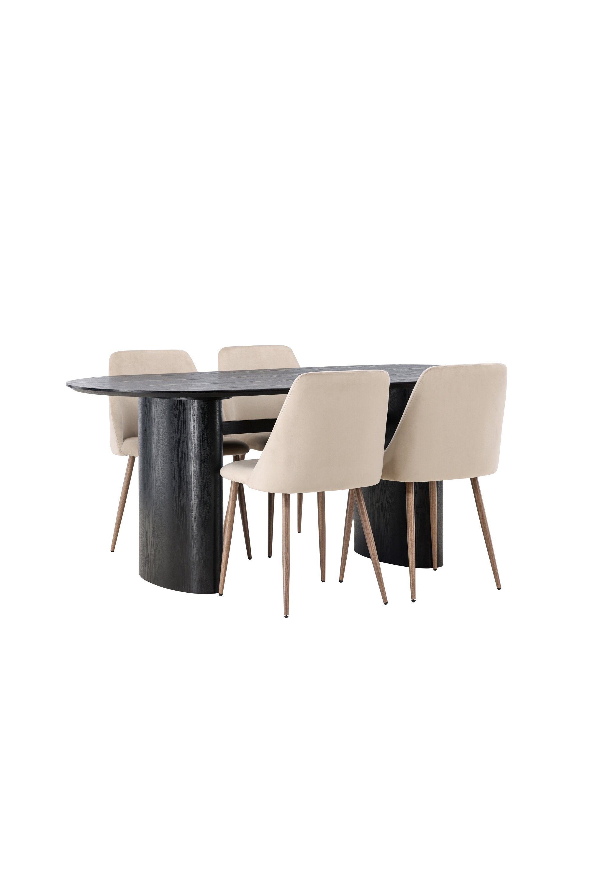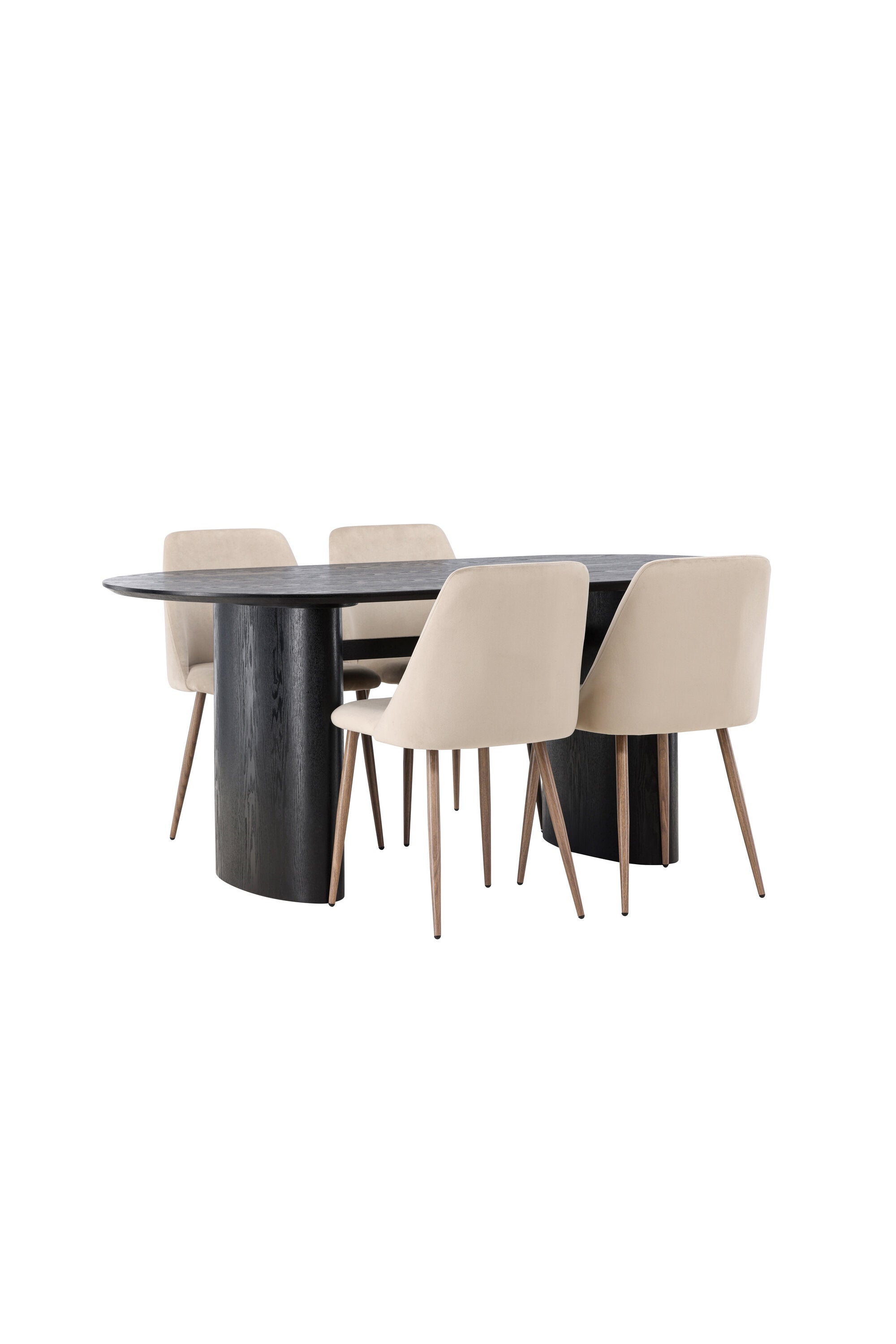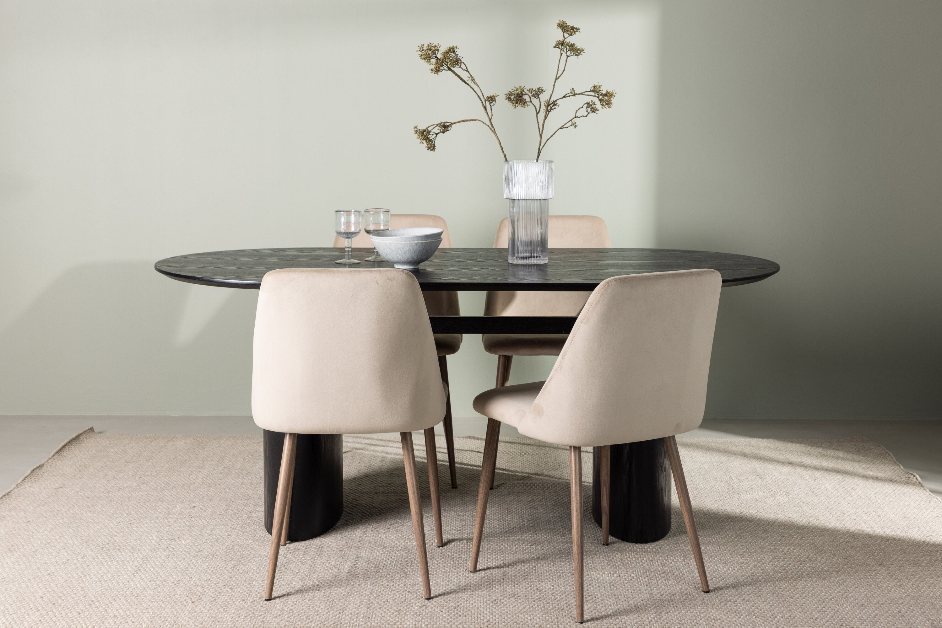Teplé tóny a odolné materiály! Oválný jídelní stůl Isolde v černé barvě má ​​moderní design s oválnou deskou stolu z MDF a robustním rámem, který působí stabilním dojmem. Živý materiál dává poutače krásný pohyb. Zde společně s našimi jídelními židlemi pískové barvy ze série Night. Židle má celočalouněný sedák z hnědé sametové látky a nohy z oceli v barvě ořechu. Spojuje to nejlepší z obou světů! Rozměry stolu: 180x75cm.