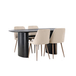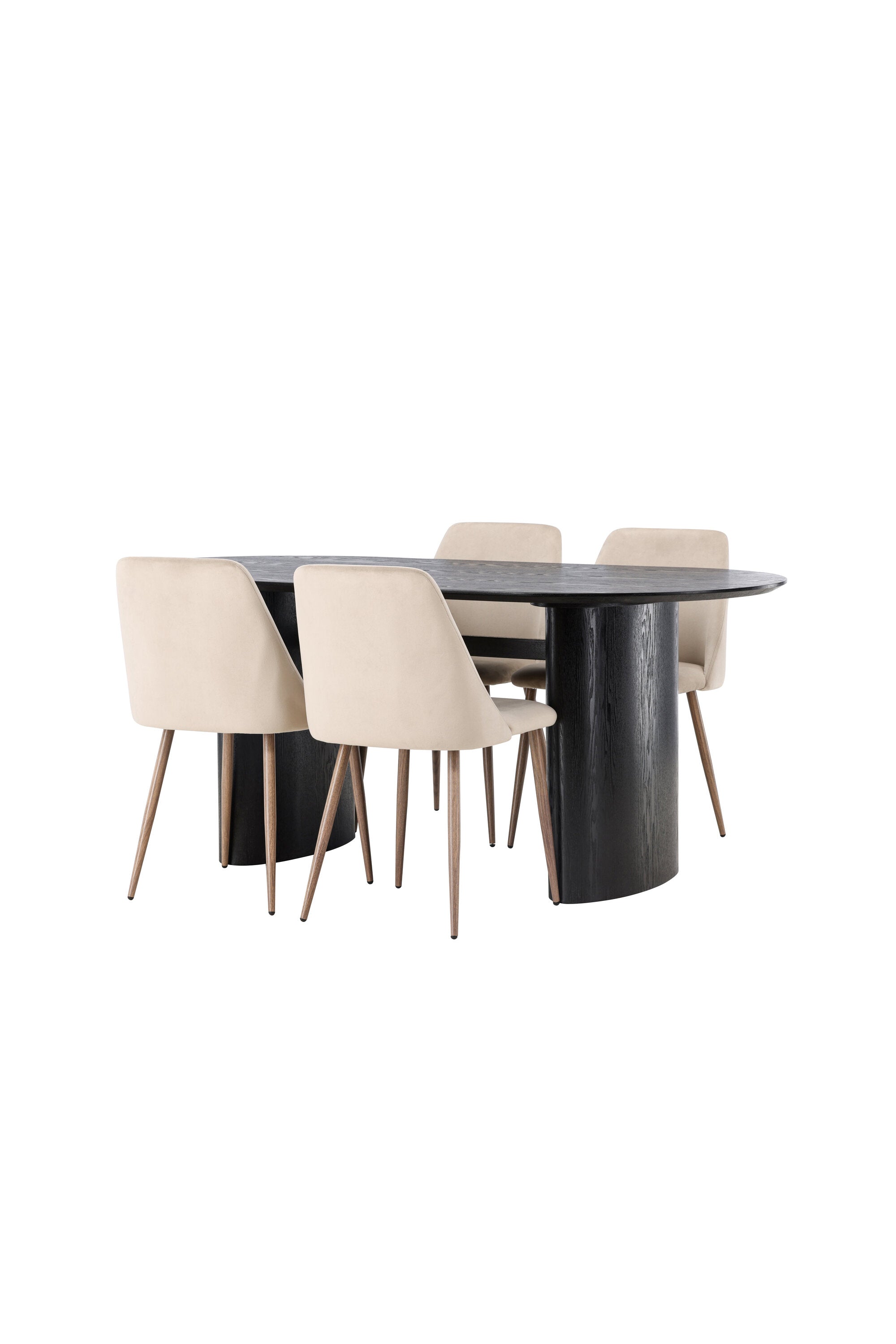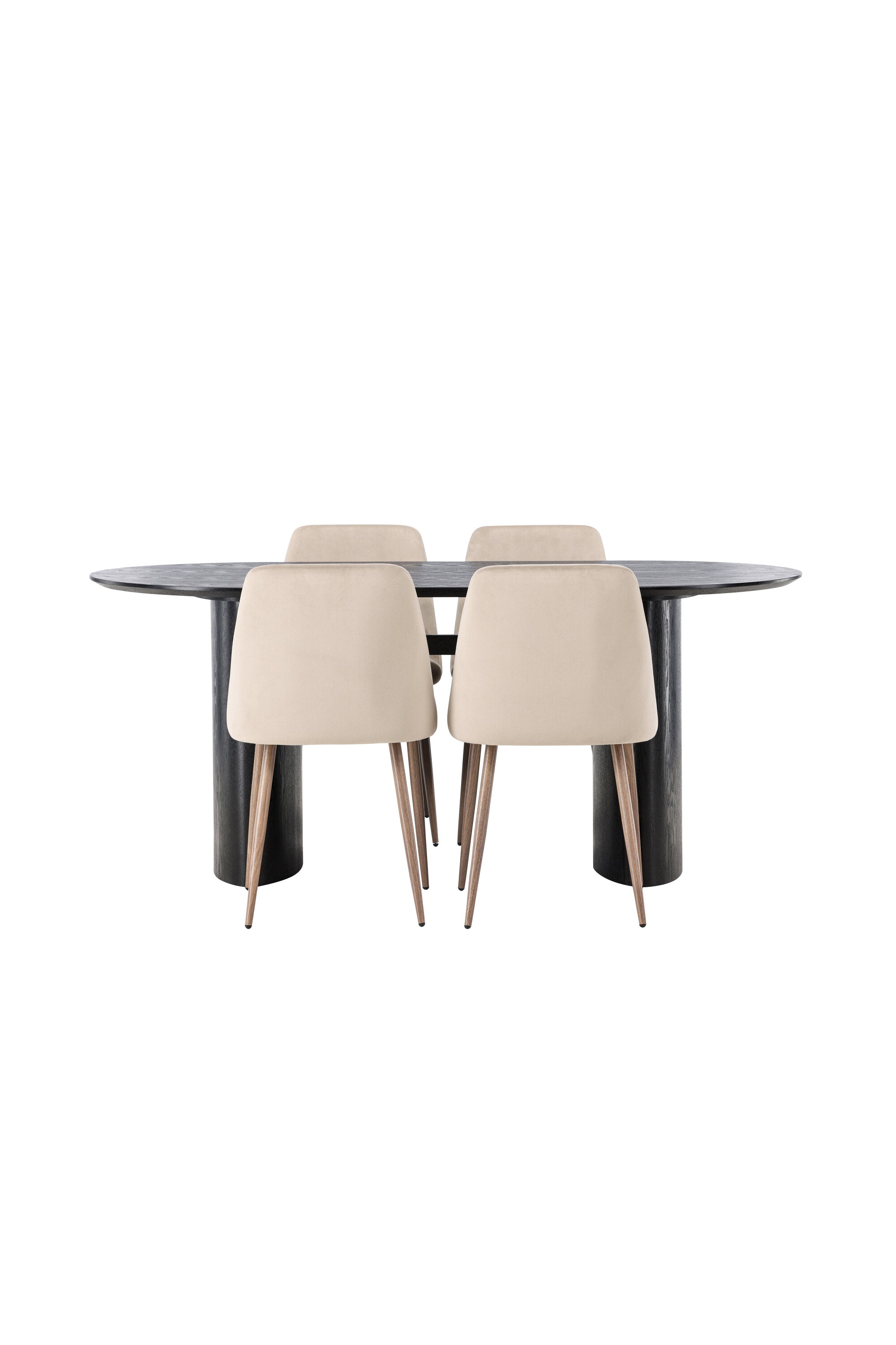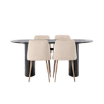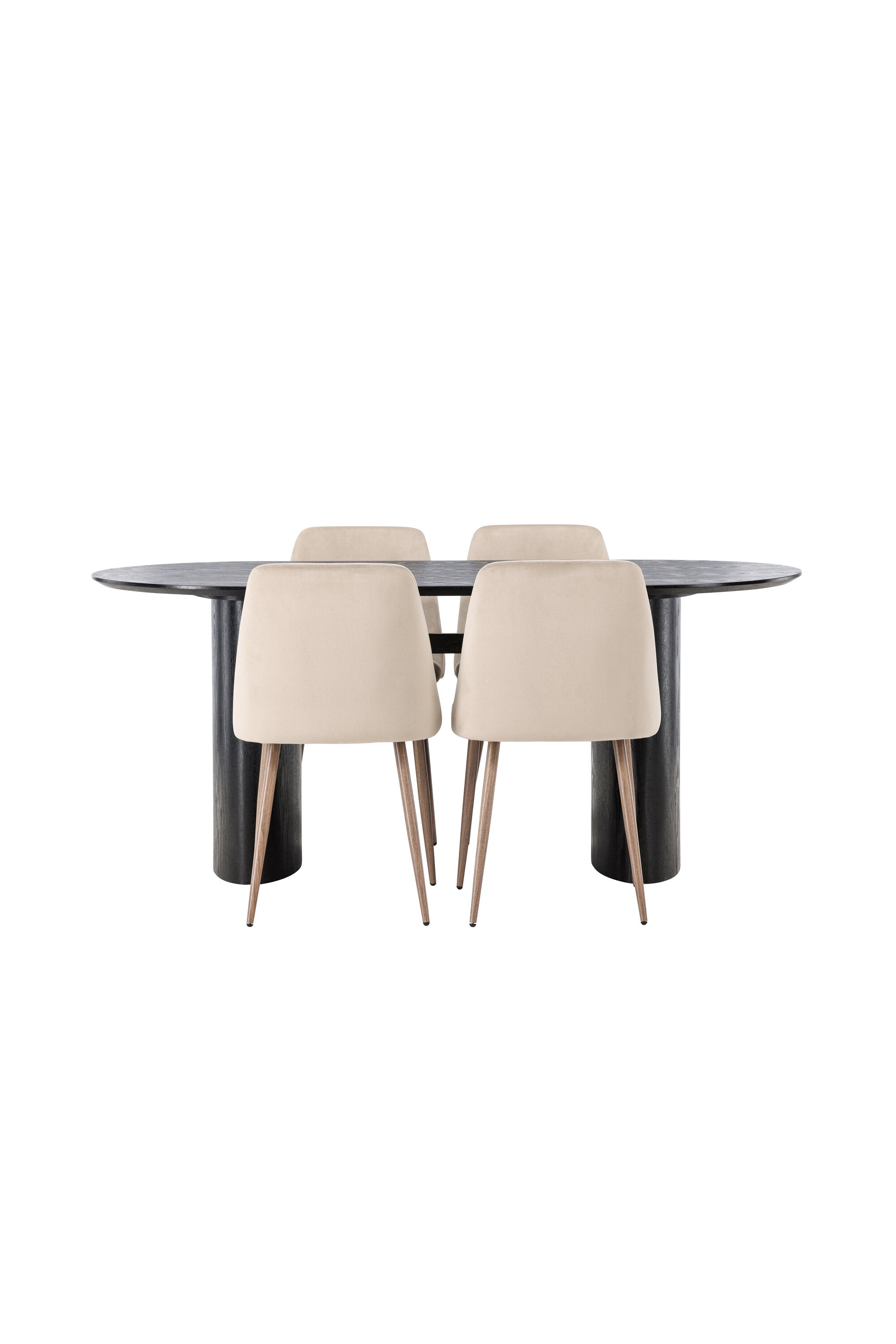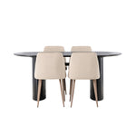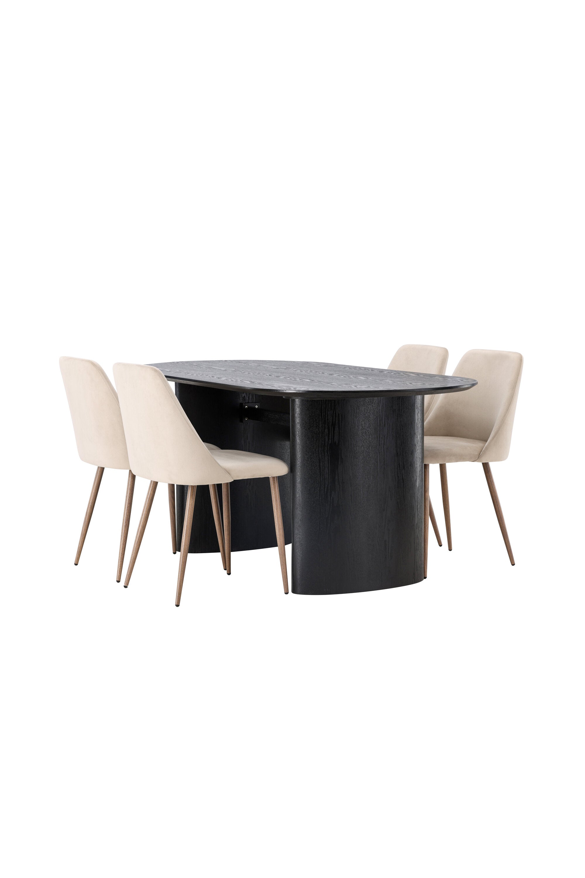 Teplé tóny a odolné materiály! Oválný jídelní stůl Isolde v černé barvě má ​​moderní design s oválnou deskou stolu z MDF a robustním rámem, který působí stabilním dojmem. Živý materiál dává poutače krásný pohyb. Zde společně s našimi jídelními židlemi pískové barvy ze série Night. Židle má celočalouněný sedák z hnědé sametové látky a nohy z oceli v barvě ořechu. Spojuje to nejlepší z obou světů! Rozměry stolu: 180x75cm.