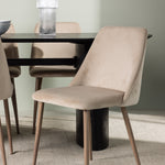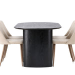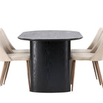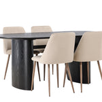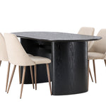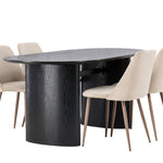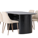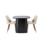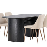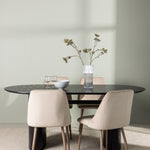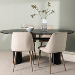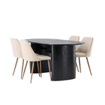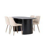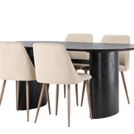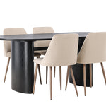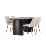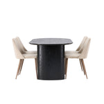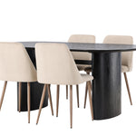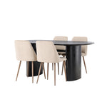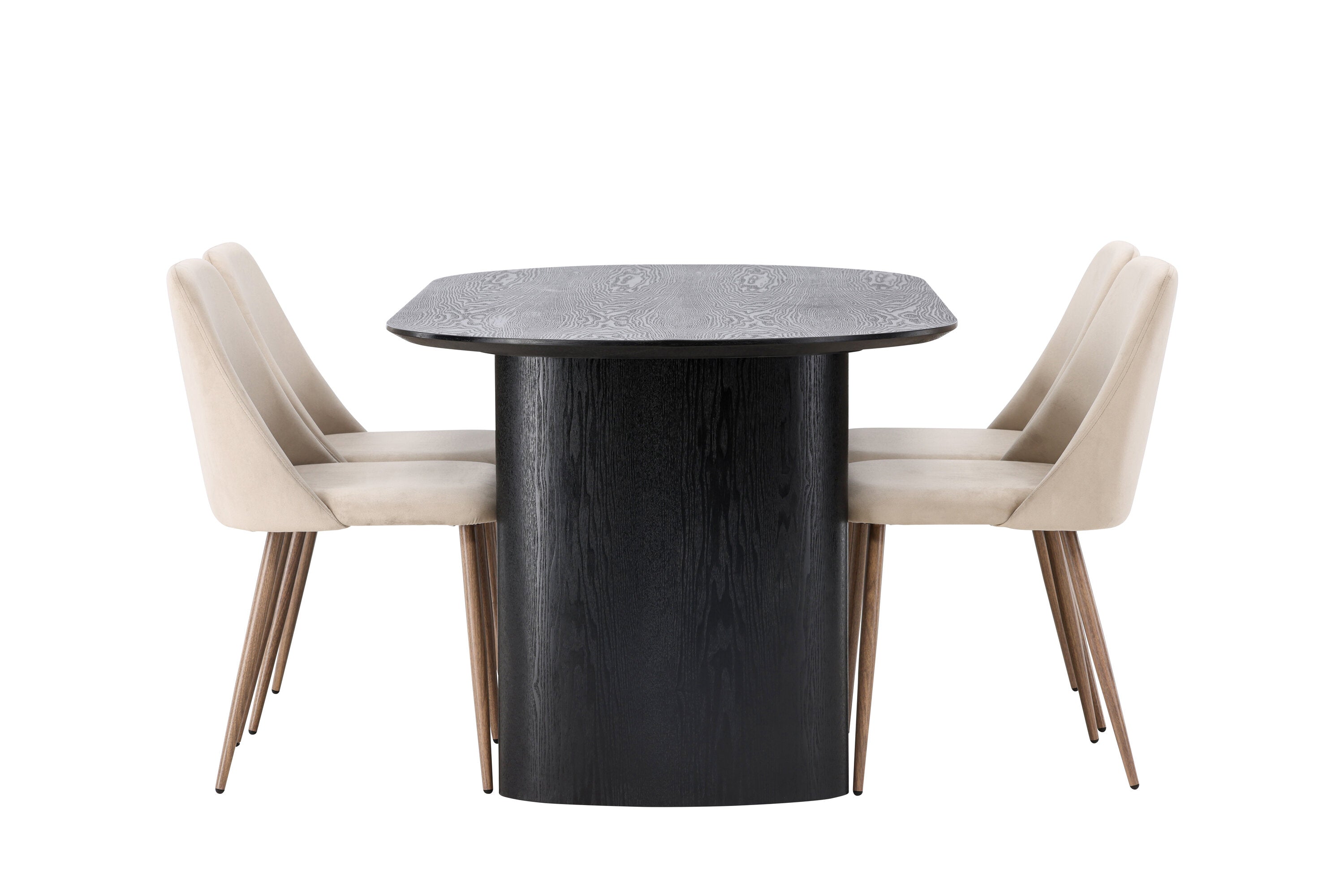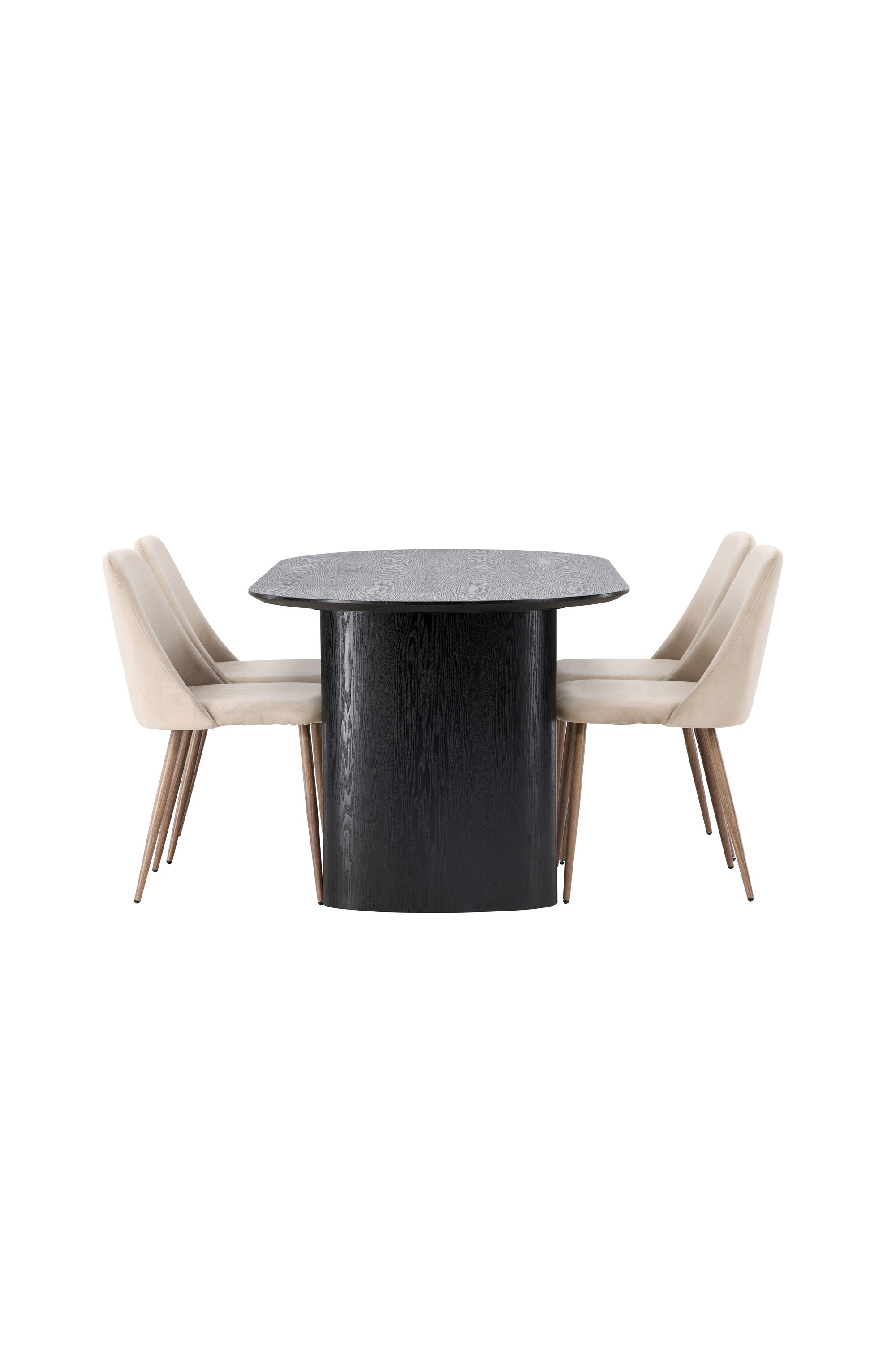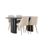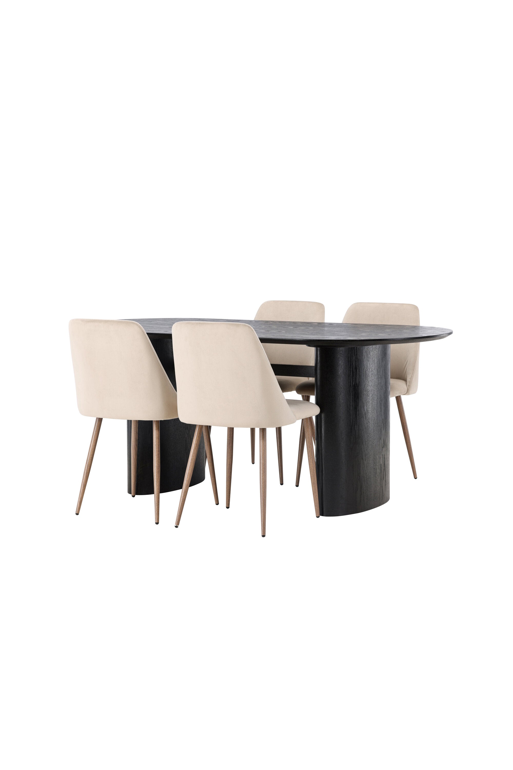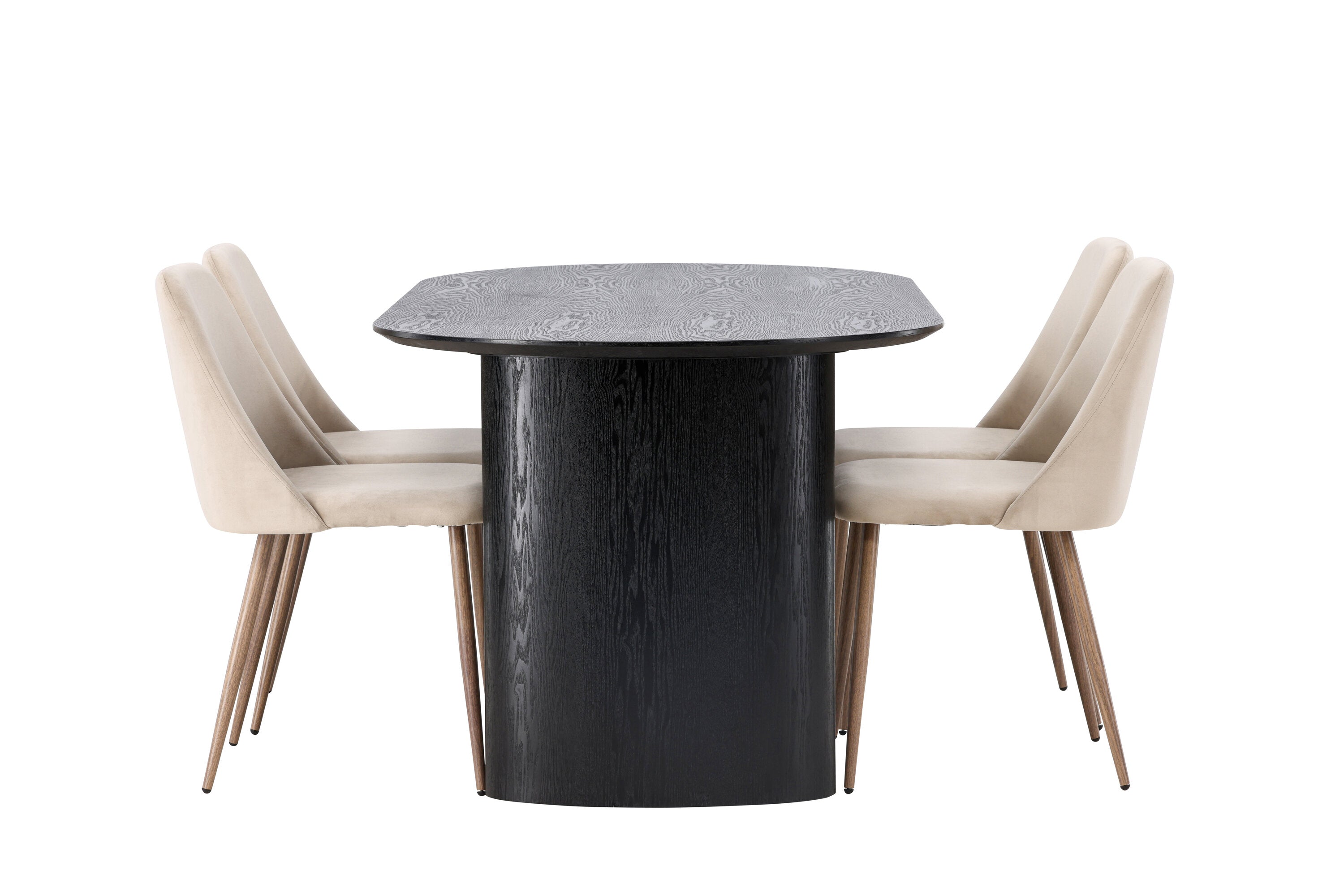 Teplé tóny a odolné materiály! Oválný jídelní stůl Isolde v černé barvě má ​​moderní design s oválnou deskou stolu z MDF a robustním rámem, který působí stabilním dojmem. Živý materiál dává poutače krásný pohyb. Zde společně s našimi jídelními židlemi pískové barvy ze série Night. Židle má celočalouněný sedák z hnědé sametové látky a nohy z oceli v barvě ořechu. Spojuje to nejlepší z obou světů! Rozměry stolu: 180x75cm.