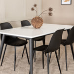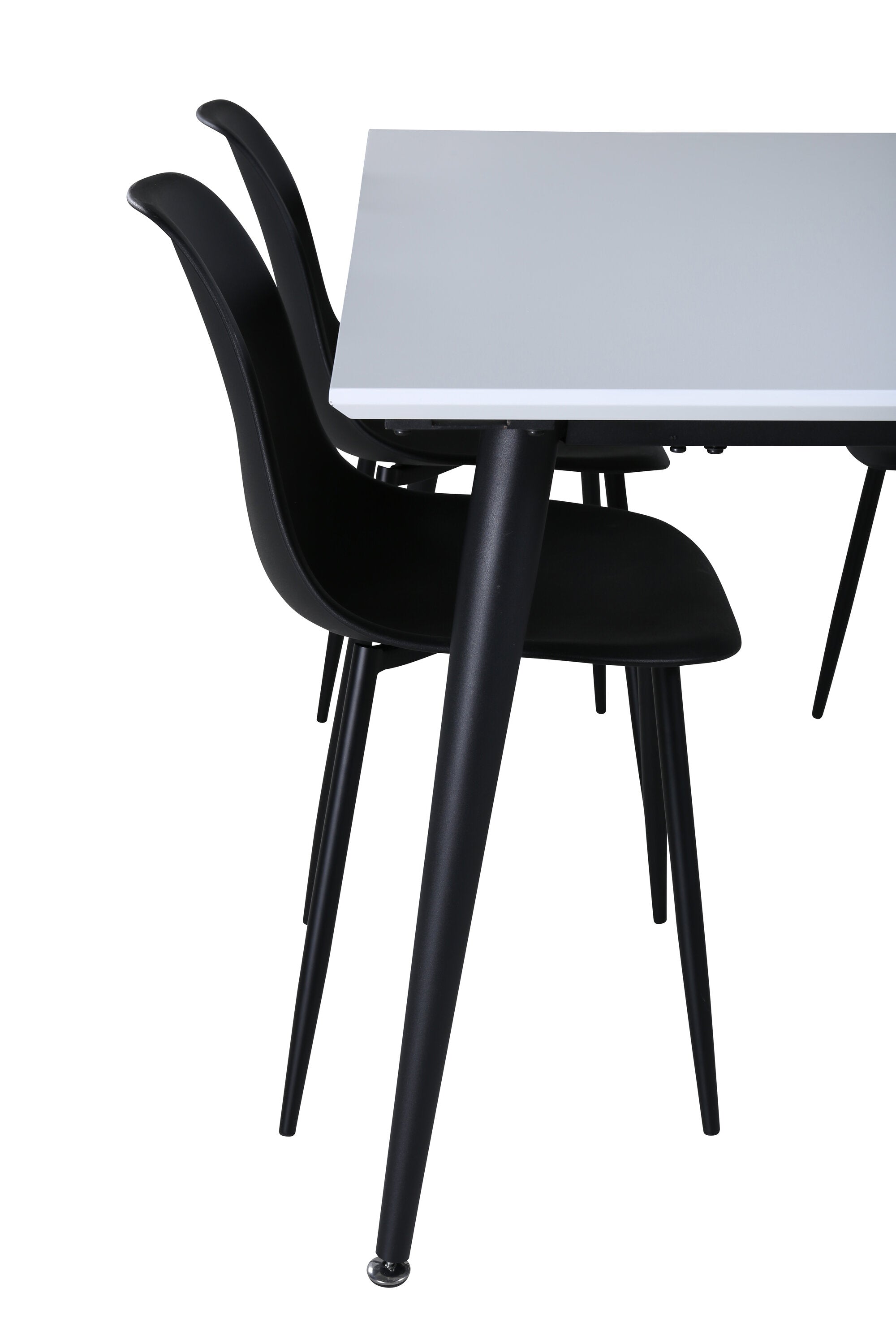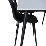 Vybavte obývací pokoj rodinnou stravovací skupinou s moderním nádechem! Jídelní stůl Jimmy má klasický obdélníkový design v barvách bílá a černá. Stůl má skandinávský design s deskou v bílé HPL a MDF a černými, lehce rozšířenými, železnými nohami stolu. Rozměry stolu: Délka Rozkládací mezi: 150 cm a 240 cm, šířka: 90 cm, výška: 76 cm. Zde je stůl sladěn se 6 jídelními židlemi ze série Polar, která má konzistentně černou barvu. Sedák židle je z praktického plastu a nohy židle ze železa. Rozměry židle: výška: 81 cm, výška sedáku: 46 cm, šířka: 45,5 cm, hloubka: 58 cm. Rozšiřte svá pozvání na večeři a ponořte se do příjemné skupinky jídla spolu s blízkými.