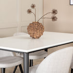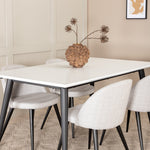 Klasický a moderní jídelní stůl ze série Jimmy ve skandinávském designu, u kterého se může sejít celá rodina k večeři a společenskému setkání. Stůl je rozkládací a má bílou desku z HPL a MDF a černé, lehce rozšířené, železné nohy stolu. Rozměry stolu: Délka Rozkládací mezi: 150 cm a 240 cm, šířka: 90 cm, výška: 76 cm. Zde spolu s 6. z našich oblíbených jídelních židlí Velvet se světle šedými sedáky z polyesteru a kostí v černém kovu. Rozměry židle: Výška: 76,5 cm, výška sedáku: 46,5 cm, šířka: 50 cm, hloubka: 57 cm. Nechte srdce domova charakterizovat vaši novou, poutavou skupinu potravin.