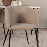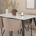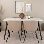 Naše oblíbené jídelní židle Berit v luxusním provedení prodlouží příjemné chvíle při večeři! Židle má velkorysou hloubku sedáku se sedákem z béžového sametu a stylovou úzkou nohou židle z černého železa. Rozměry židle: výška: 78 cm, výška sedáku: 49 cm, šířka: 55 cm, hloubka: 55 cm. Zde je 6 jídelních židlí sladěno s klasickým jídelním stolem Jimmy - bezpečná karta pro všechny příležitosti! Díky rozšiřitelné horní desce v bílé HPL a MDF dýze a lehce rozšířeným nohám z černého kovu se tento stůl dokonale hodí do všech stylů interiéru a domácností. Rozměry stolu: Délka Rozkládací mezi: 150 cm a 240 cm, šířka: 90 cm, výška: 76 cm.