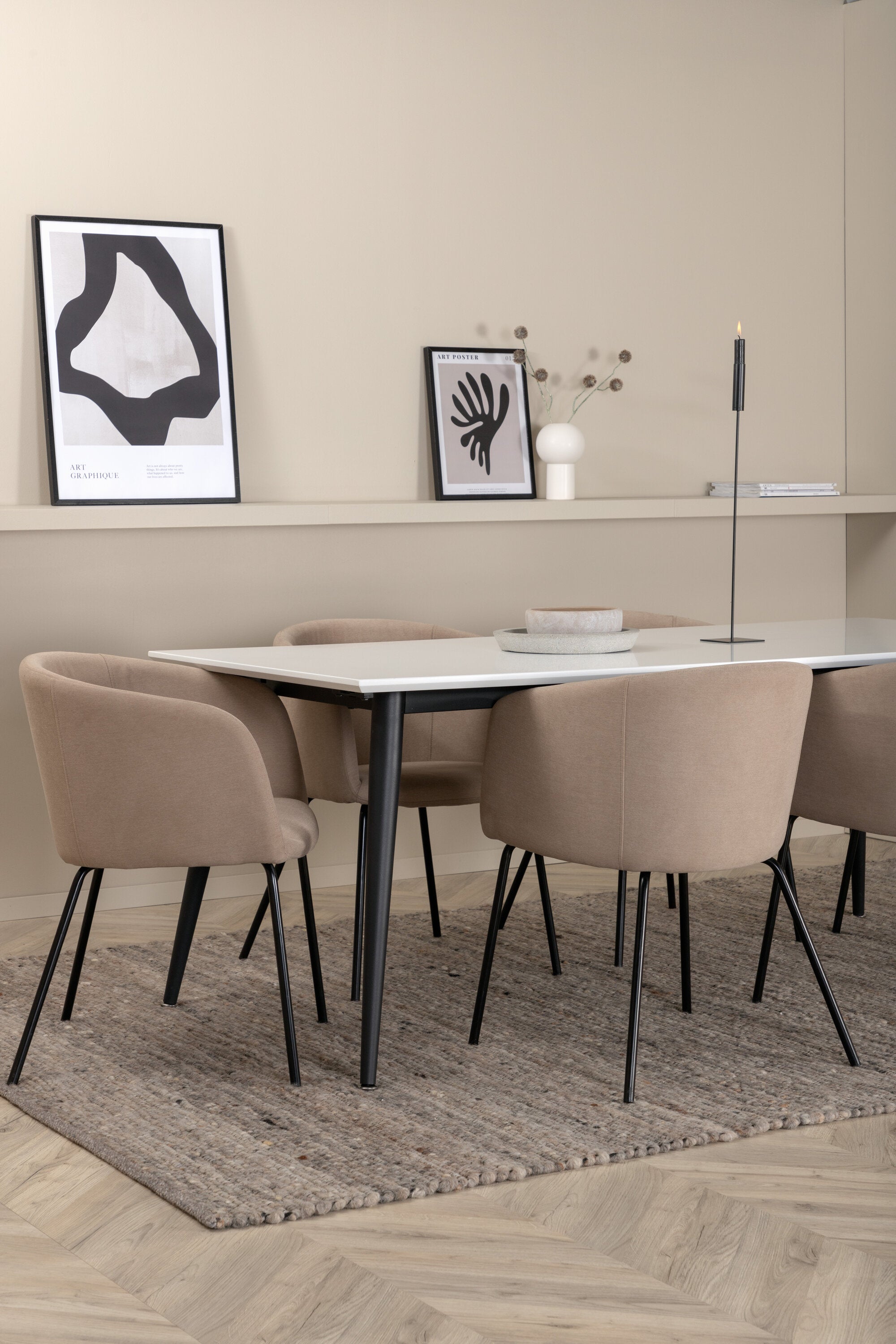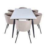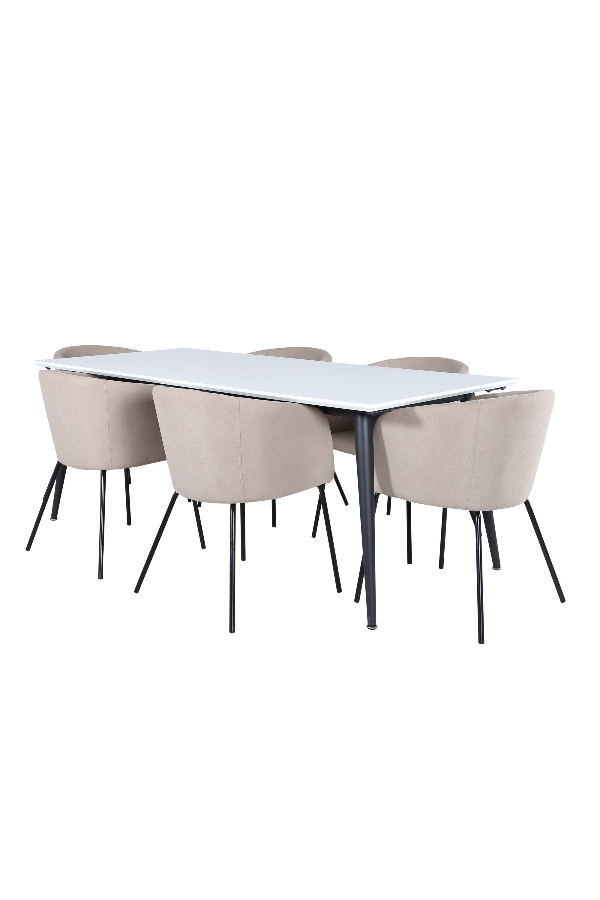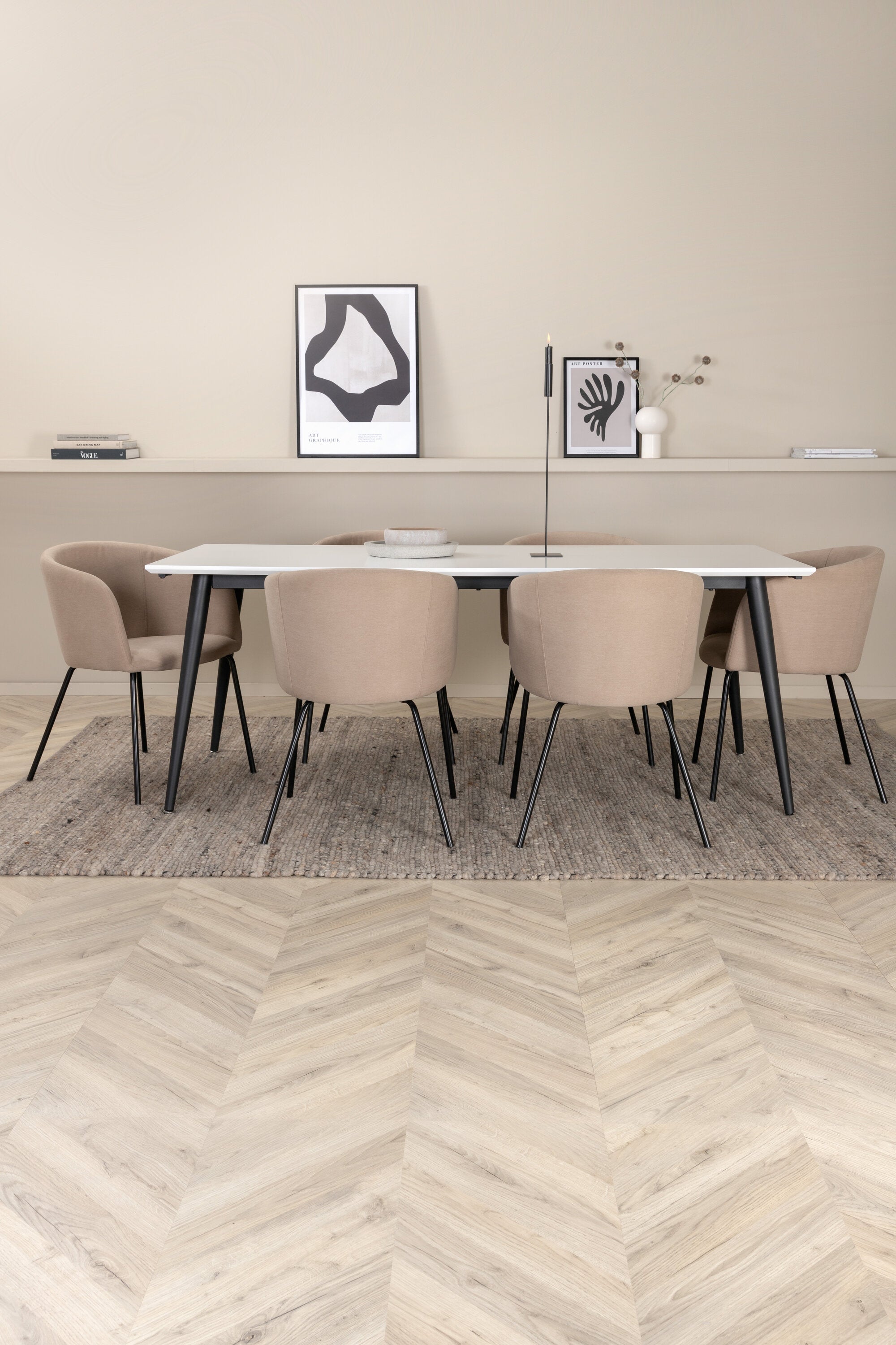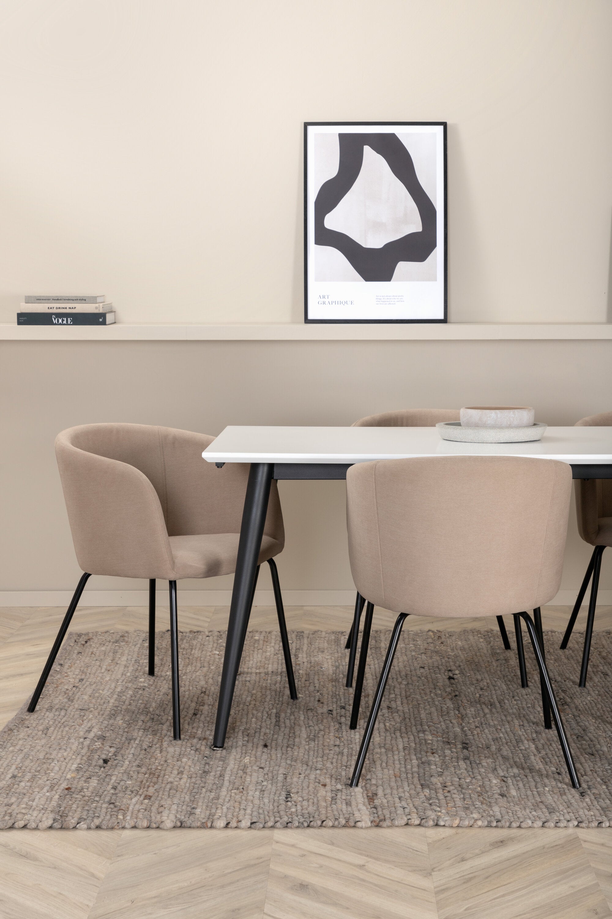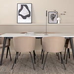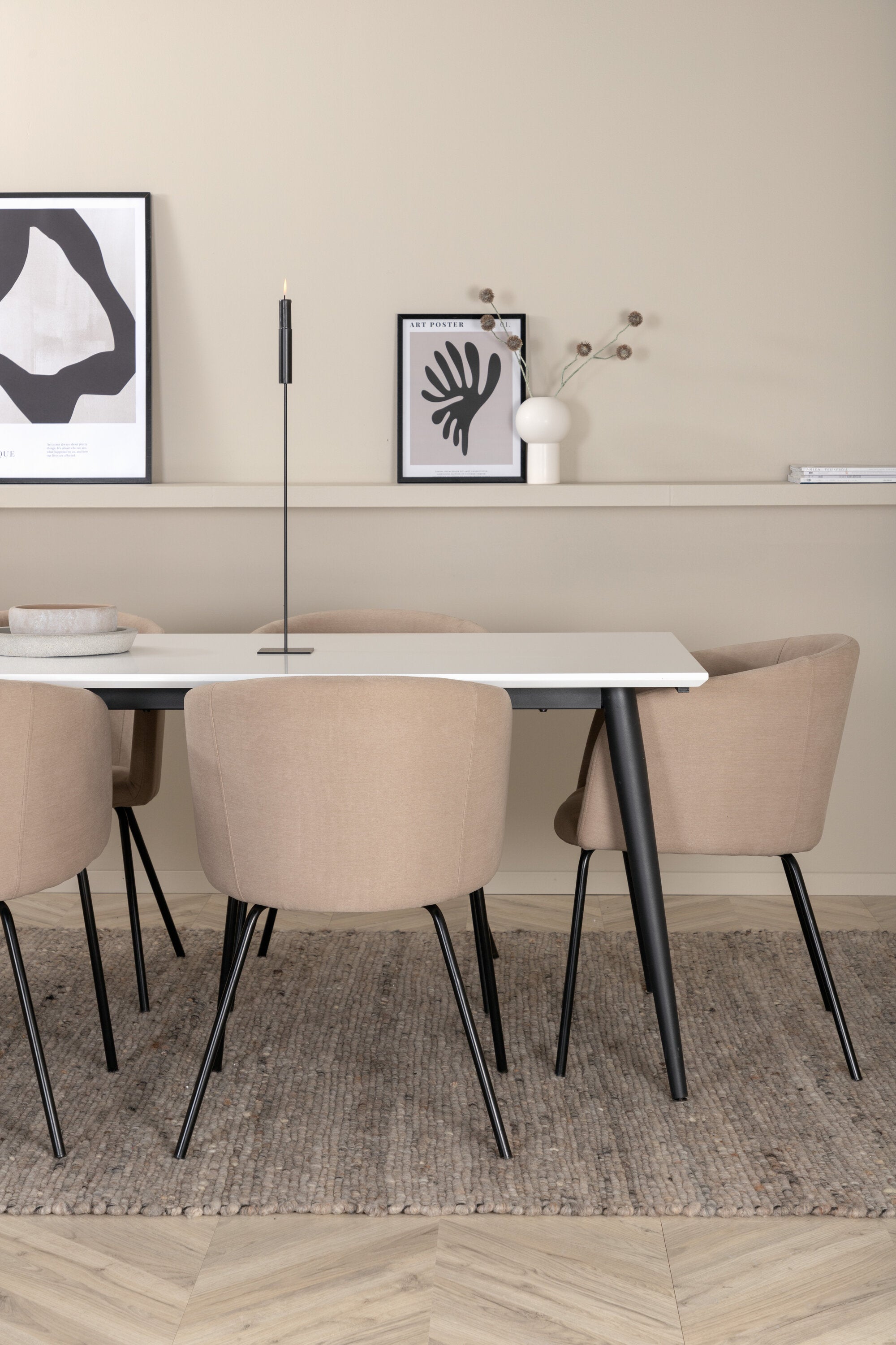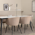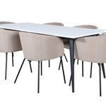 Naše oblíbené jídelní židle Berit v luxusním provedení prodlouží příjemné chvíle při večeři! Židle má velkorysou hloubku sezení se sedákem z béžového polyesterového lnu a stylovou úzkou nohou stoličky z černého železa. Rozměry židle: výška: 78 cm, výška sedáku: 49 cm, šířka: 55 cm, hloubka: 55 cm. Zde je 6 jídelních židlí sladěno s klasickým jídelním stolem Jimmy - bezpečná karta pro všechny příležitosti! Díky rozšiřitelné horní desce v bílé HPL a MDF dýze a lehce rozšířeným nohám z černého kovu se tento stůl dokonale hodí do všech stylů interiéru a domácností. Rozměry stolu: Délka Rozložitelná mezi: 195 cm a 285 cm, šířka: 90 cm, výška: 76 cm.