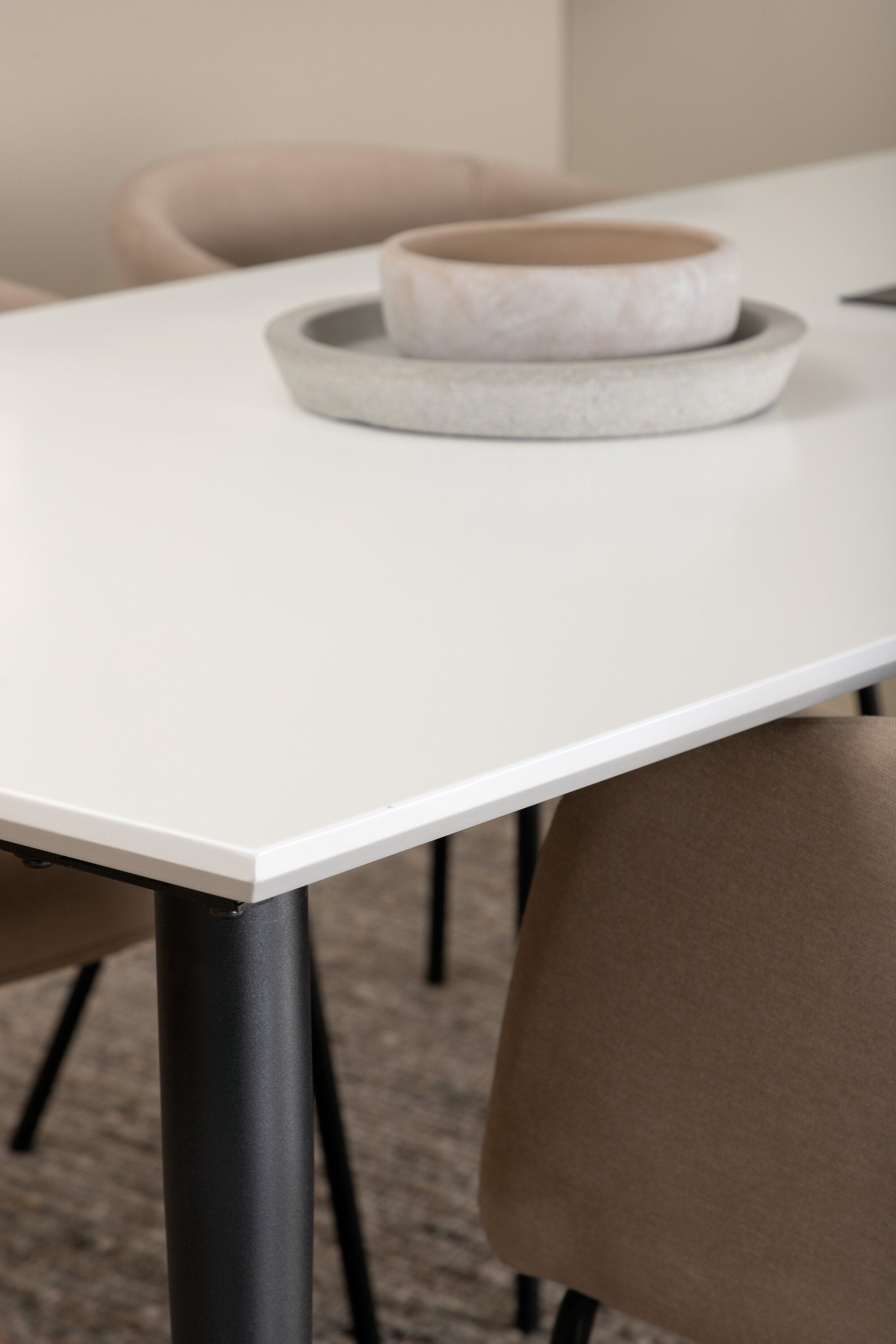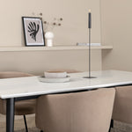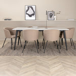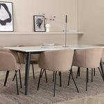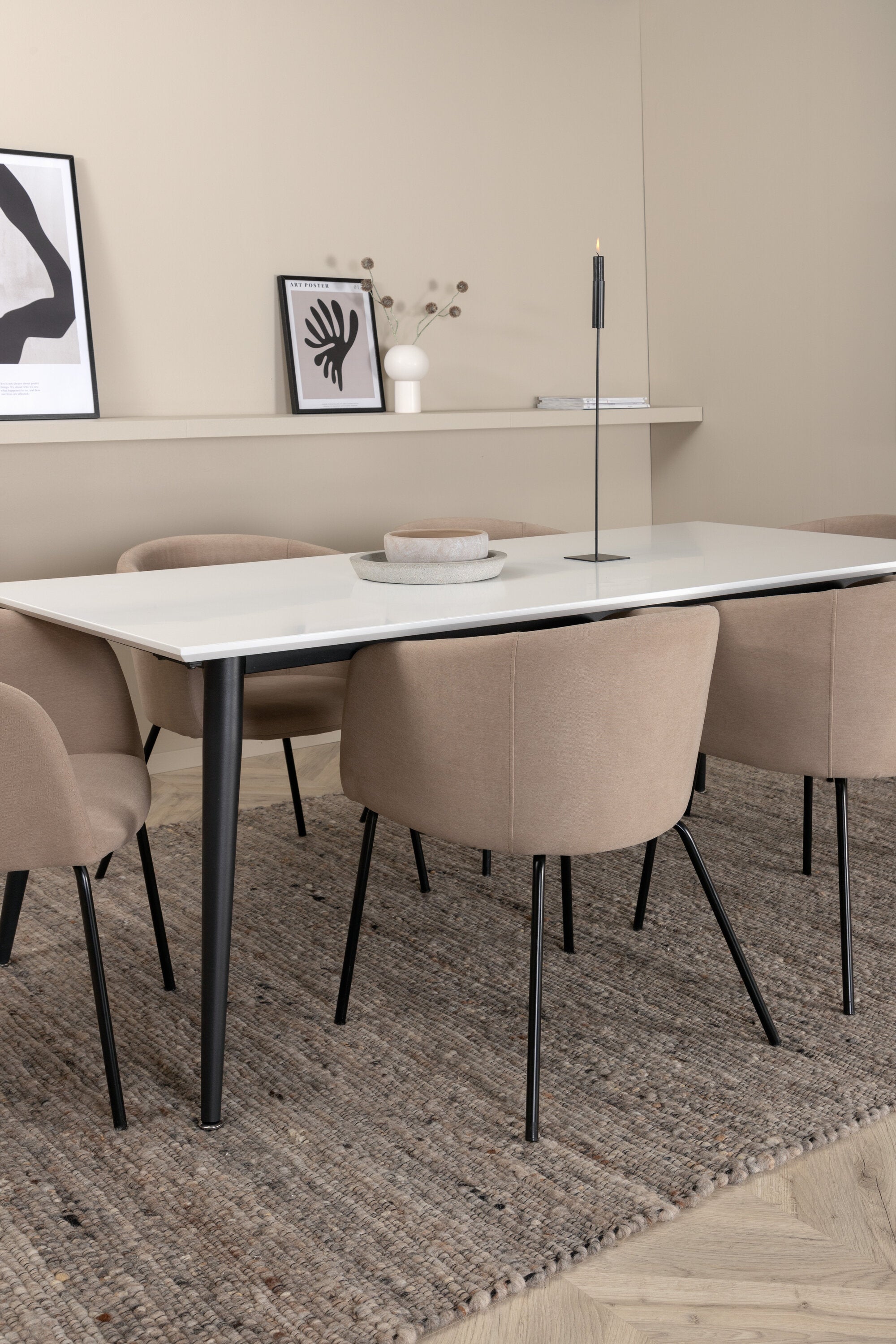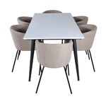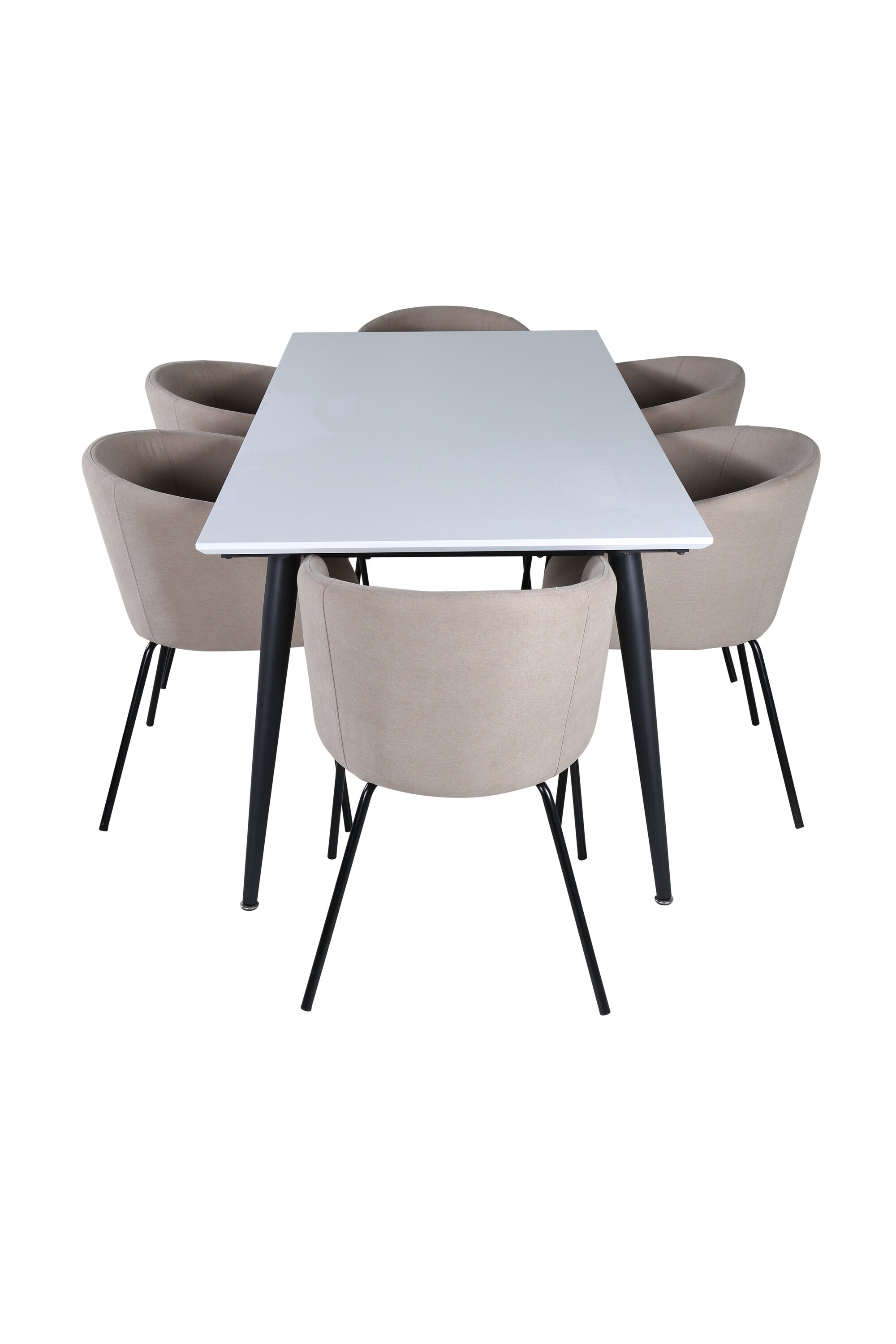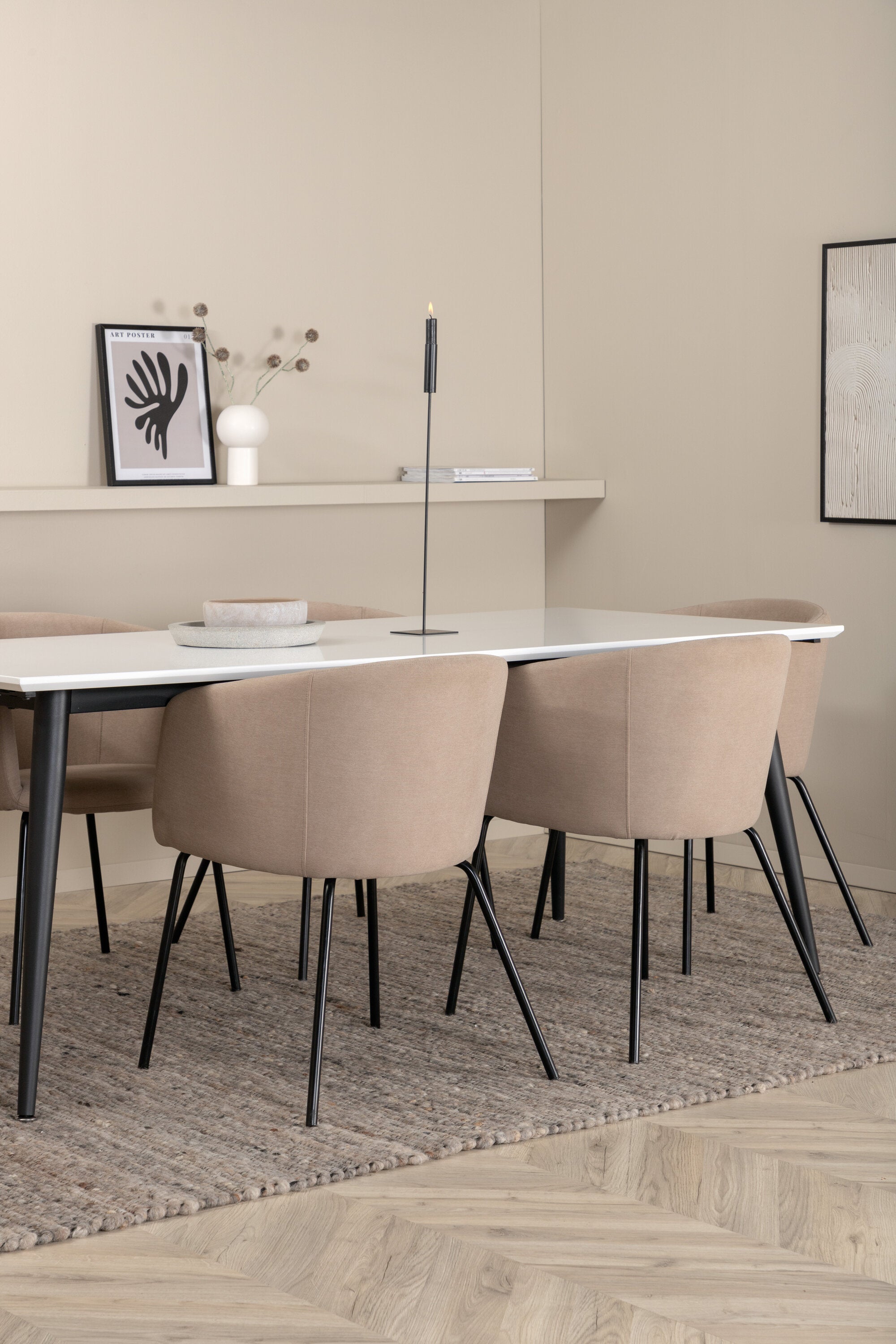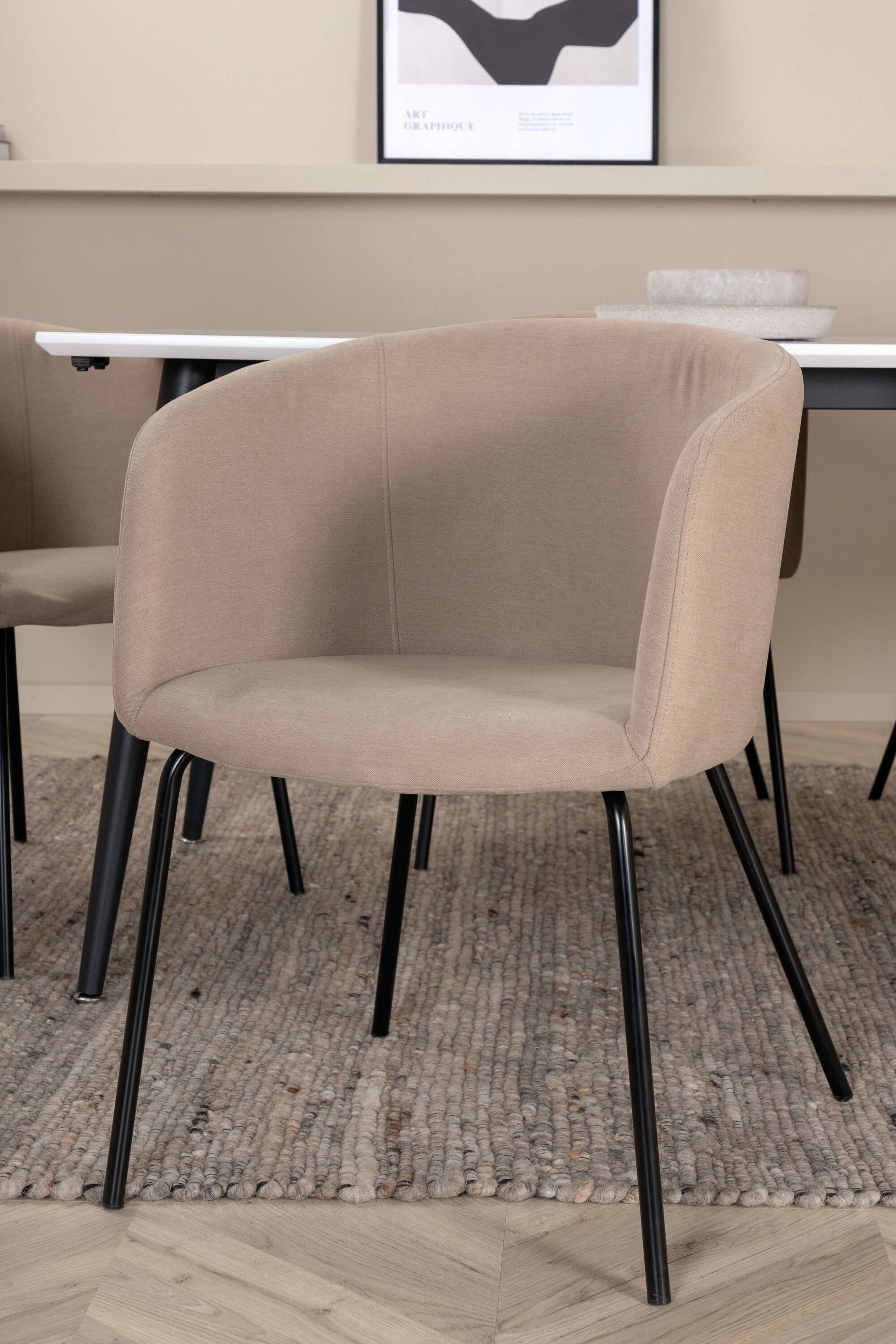 Naše oblíbené jídelní židle Berit v luxusním provedení prodlouží příjemné chvíle při večeři! Židle má velkorysou hloubku sezení se sedákem z béžového polyesterového lnu a stylovou úzkou nohou stoličky z černého železa. Rozměry židle: výška: 78 cm, výška sedáku: 49 cm, šířka: 55 cm, hloubka: 55 cm. Zde je 6 jídelních židlí sladěno s klasickým jídelním stolem Jimmy - bezpečná karta pro všechny příležitosti! Díky rozšiřitelné horní desce v bílé HPL a MDF dýze a lehce rozšířeným nohám z černého kovu se tento stůl dokonale hodí do všech stylů interiéru a domácností. Rozměry stolu: Délka Rozložitelná mezi: 195 cm a 285 cm, šířka: 90 cm, výška: 76 cm.