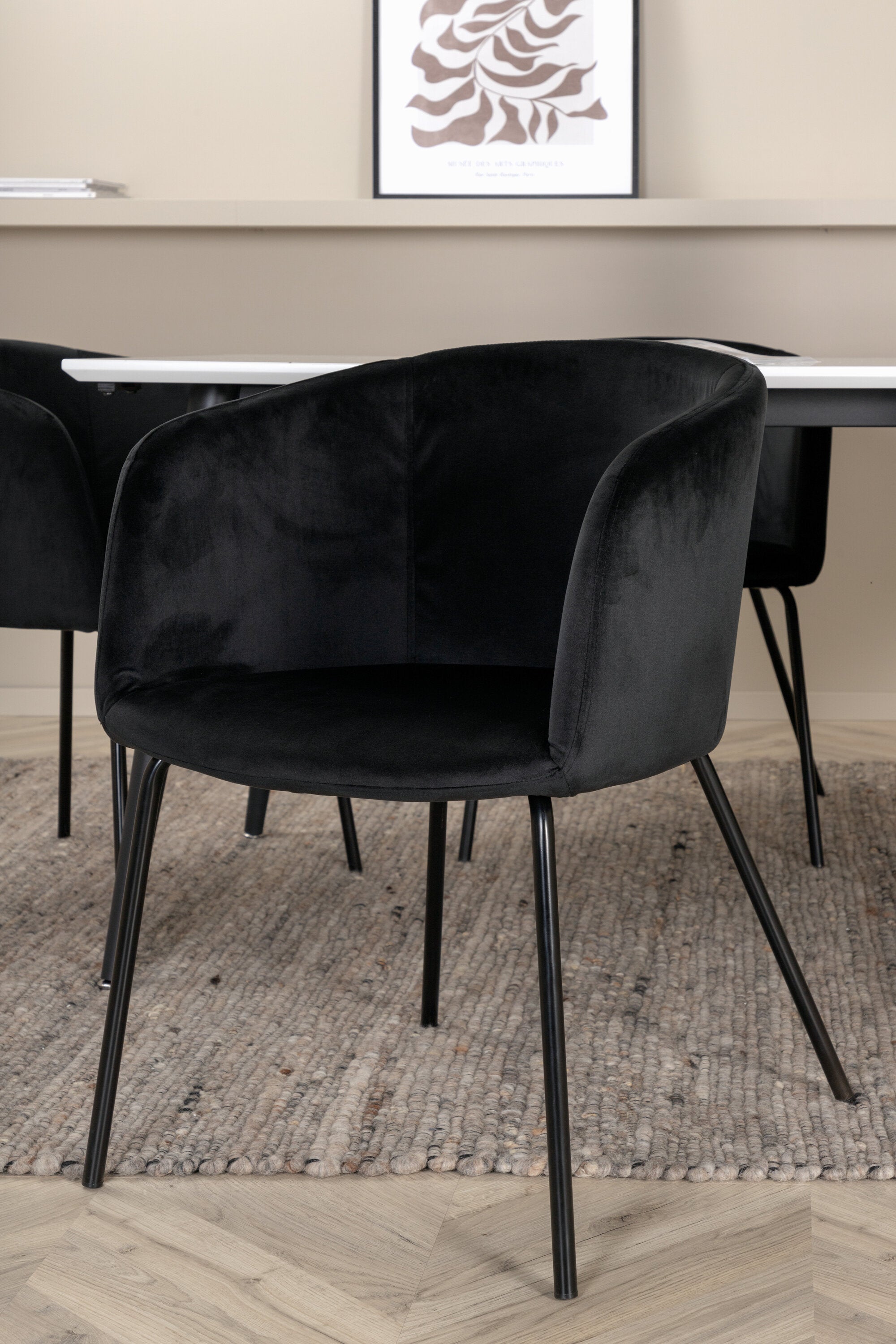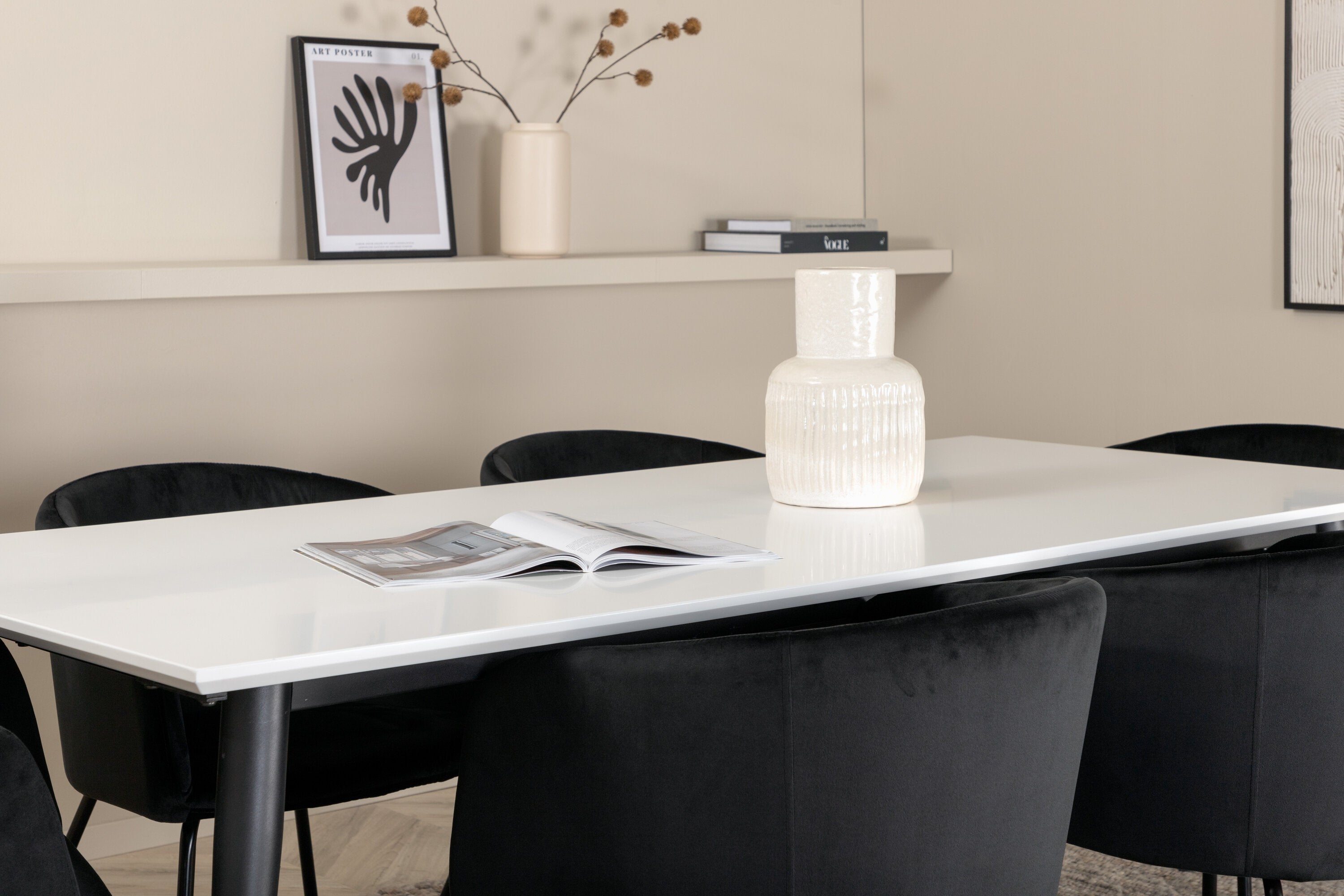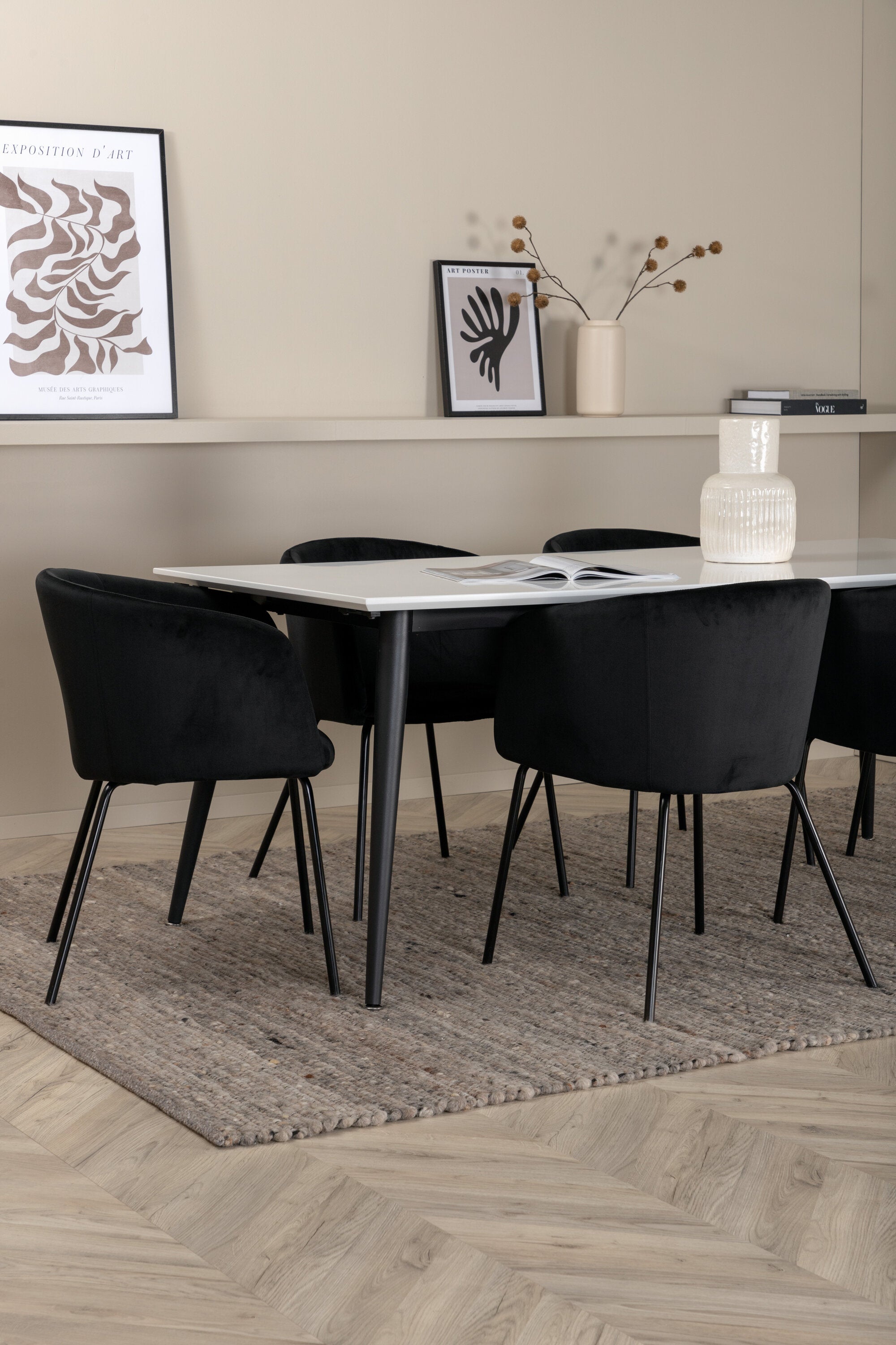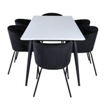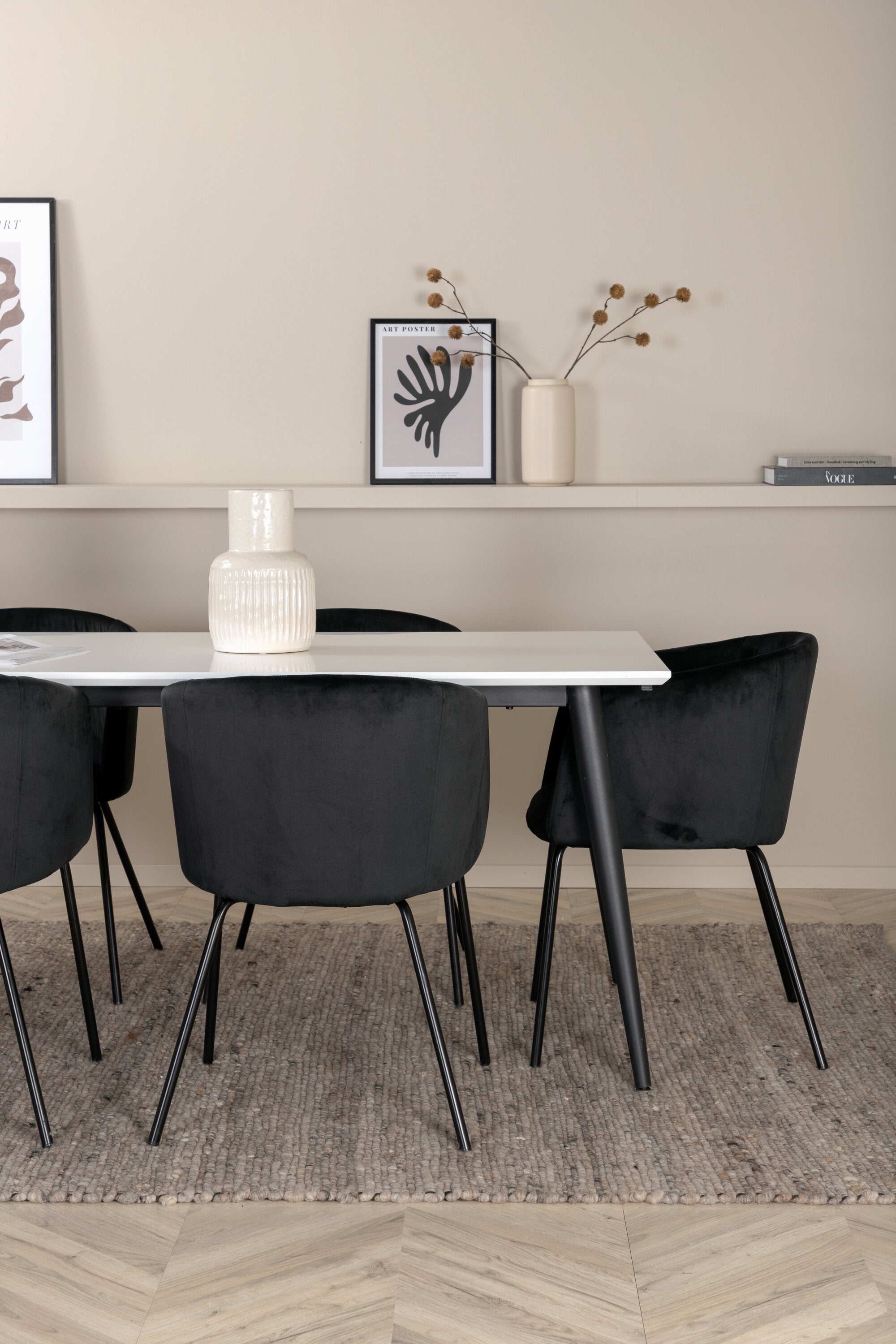 Pampig a elegantní skupina potravin! Naše oblíbené jídelní židle Berit v luxusním designu prodlouží příjemné chvíle večeře. Židle má velkorysou hloubku sedáku se sedákem z černého sametu a stylovou úzkou nohou židle z černého železa. Rozměry židle: výška: 78 cm, výška sedáku: 49 cm, šířka: 55 cm, hloubka: 55 cm. Zde je 6 jídelních židlí sladěno s klasickým jídelním stolem Jimmy - bezpečná karta pro všechny příležitosti! Díky rozšiřitelné horní desce v bílé HPL a MDF dýze a lehce rozšířeným nohám z černého kovu se tento stůl dokonale hodí do všech stylů interiéru a domácností. Rozměry stolu: Délka Rozložitelná mezi: 195 cm a 285 cm, šířka: 90 cm, výška: 76 cm.