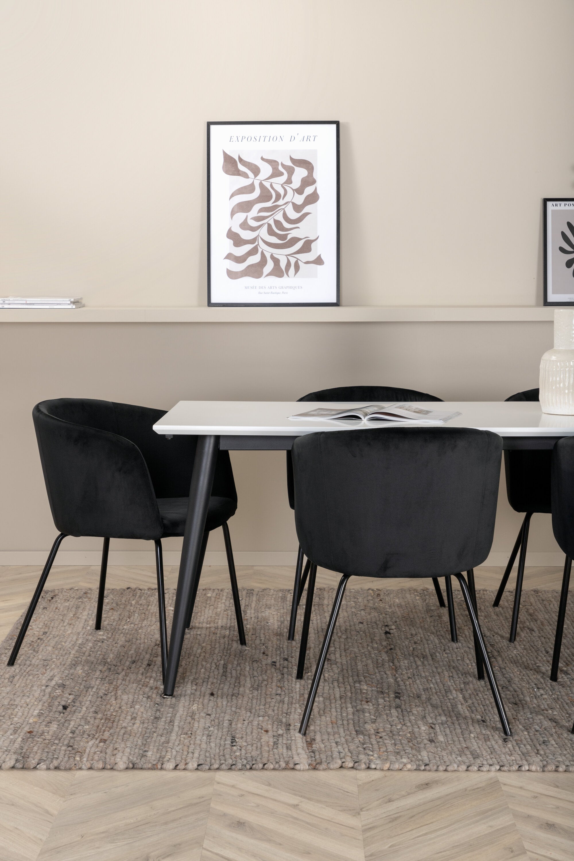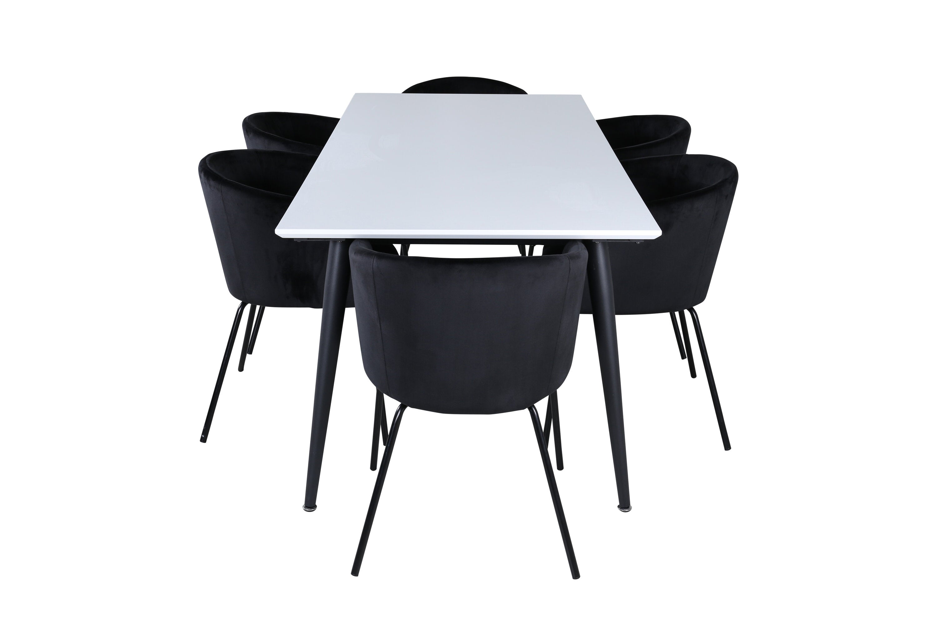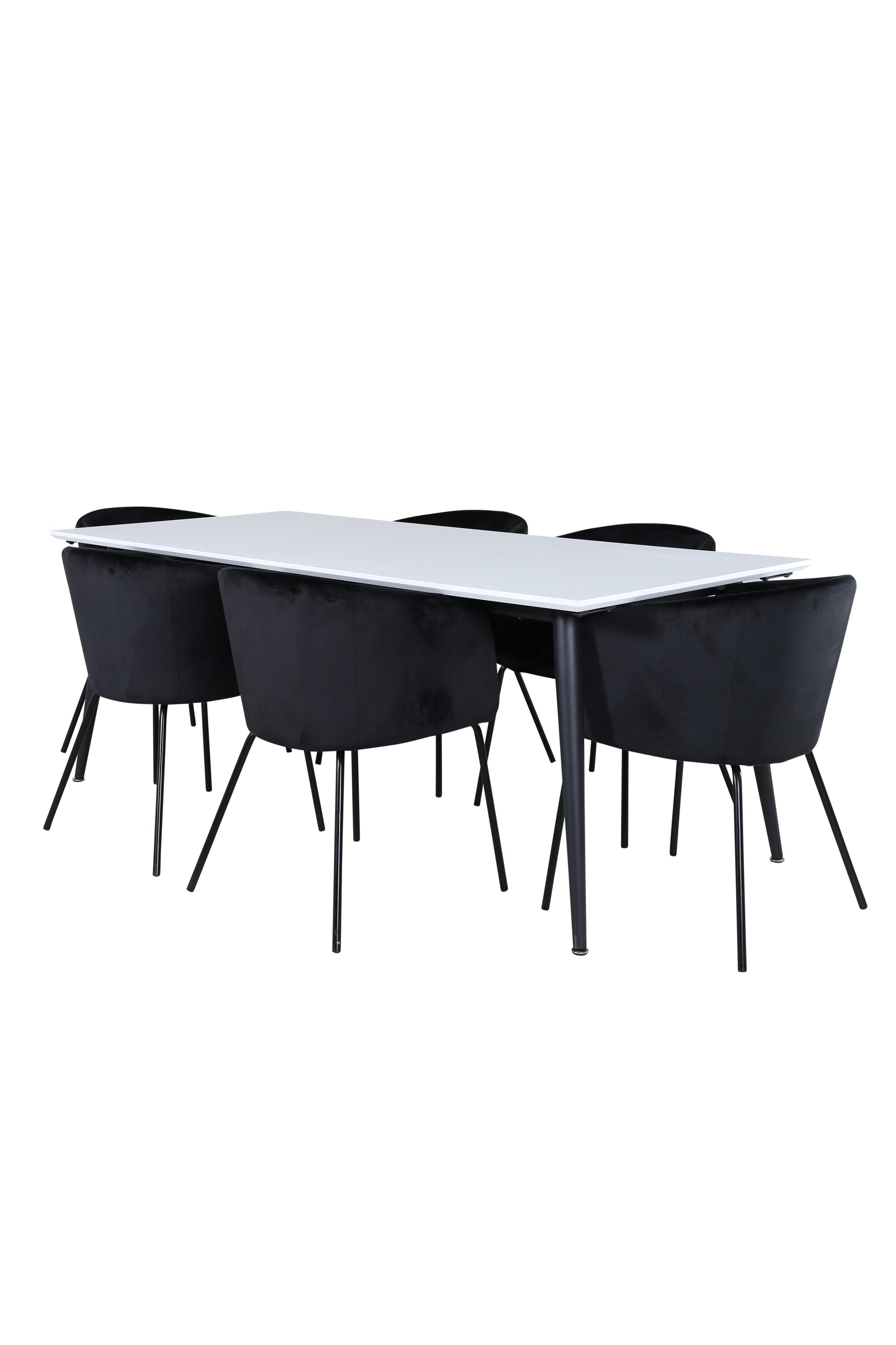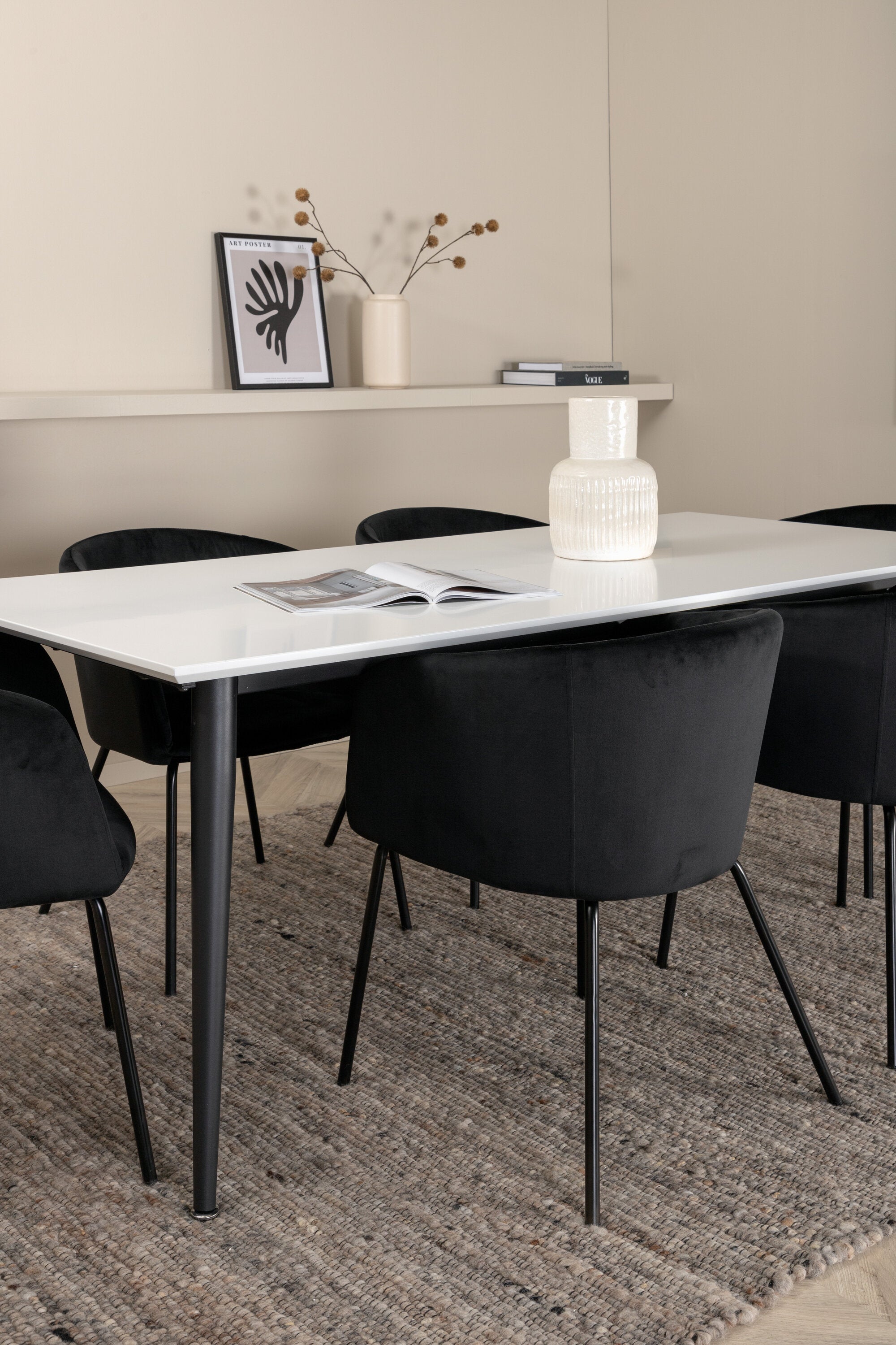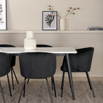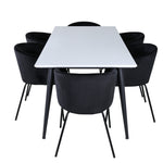 Pampig a elegantní skupina potravin! Naše oblíbené jídelní židle Berit v luxusním designu prodlouží příjemné chvíle večeře. Židle má velkorysou hloubku sedáku se sedákem z černého sametu a stylovou úzkou nohou židle z černého železa. Rozměry židle: výška: 78 cm, výška sedáku: 49 cm, šířka: 55 cm, hloubka: 55 cm. Zde je 6 jídelních židlí sladěno s klasickým jídelním stolem Jimmy - bezpečná karta pro všechny příležitosti! Díky rozšiřitelné horní desce v bílé HPL a MDF dýze a lehce rozšířeným nohám z černého kovu se tento stůl dokonale hodí do všech stylů interiéru a domácností. Rozměry stolu: Délka Rozložitelná mezi: 195 cm a 285 cm, šířka: 90 cm, výška: 76 cm.