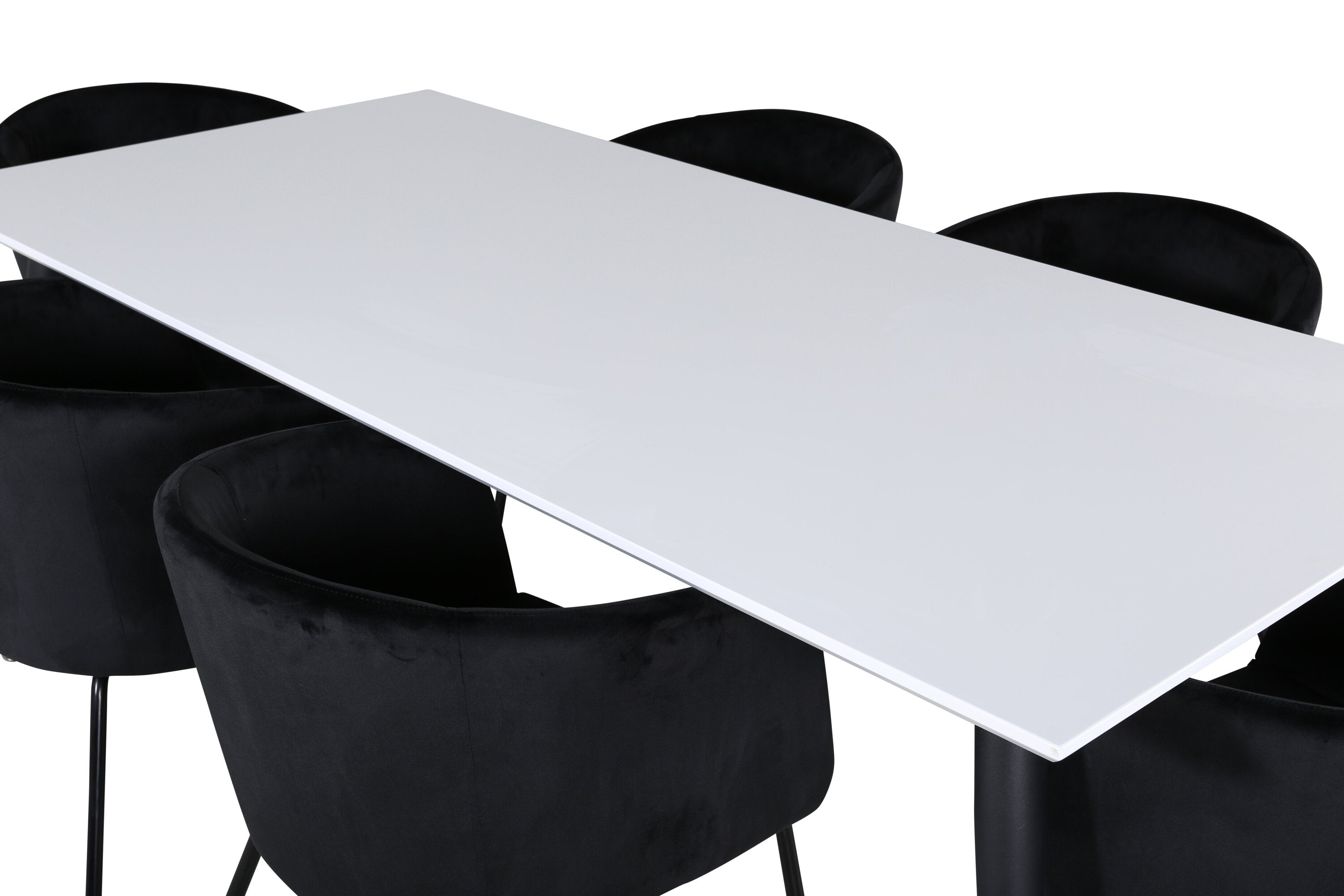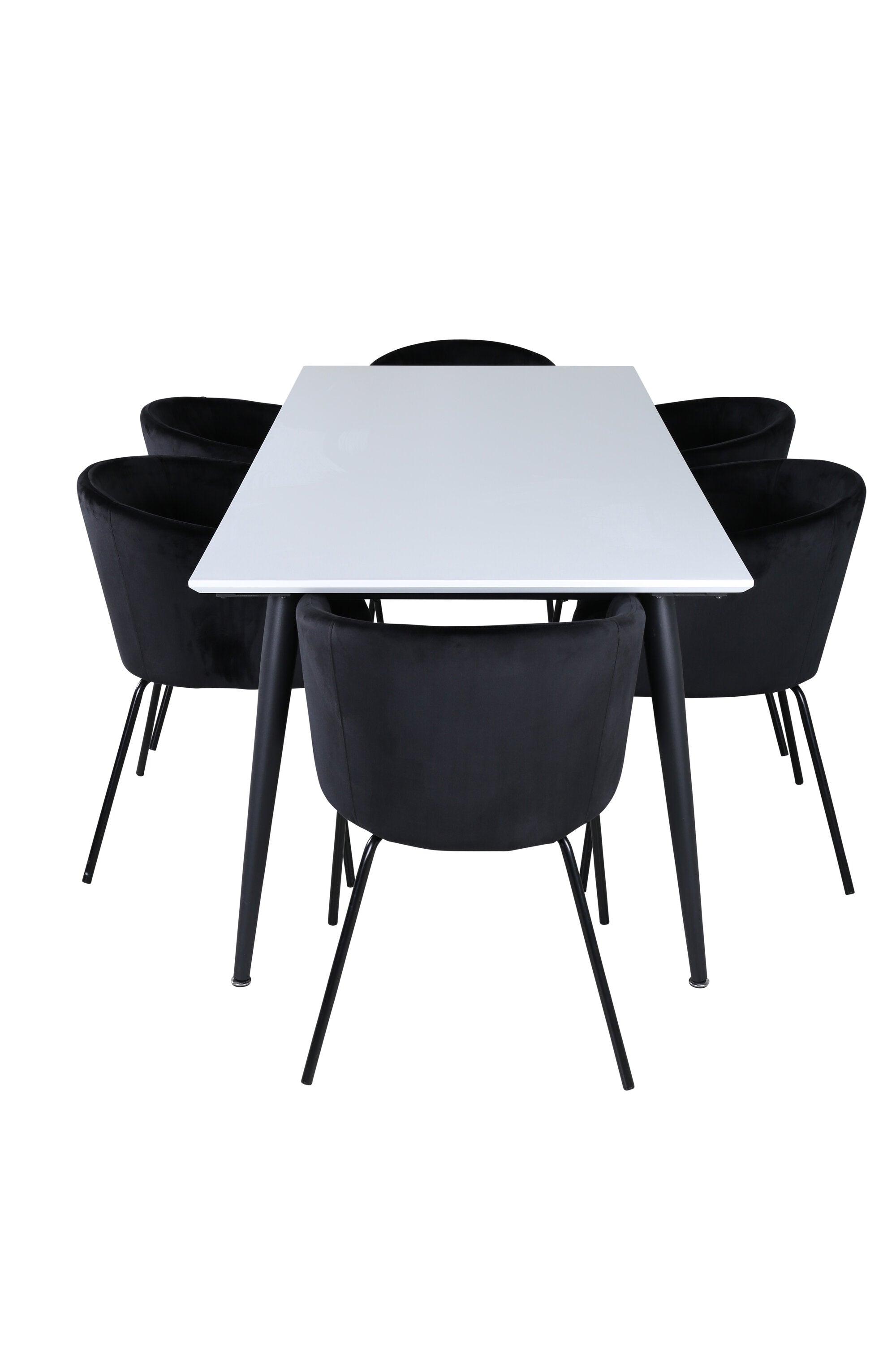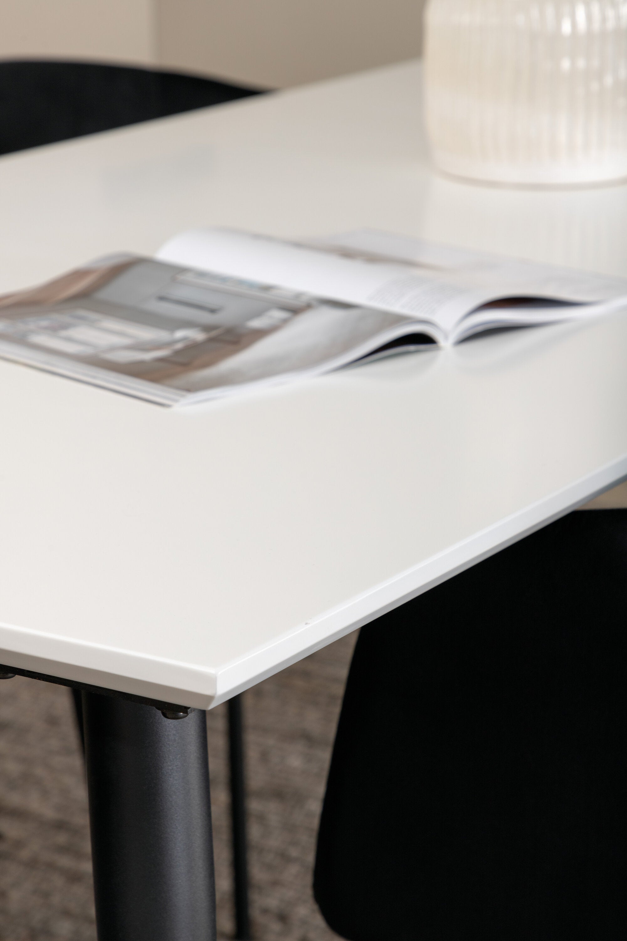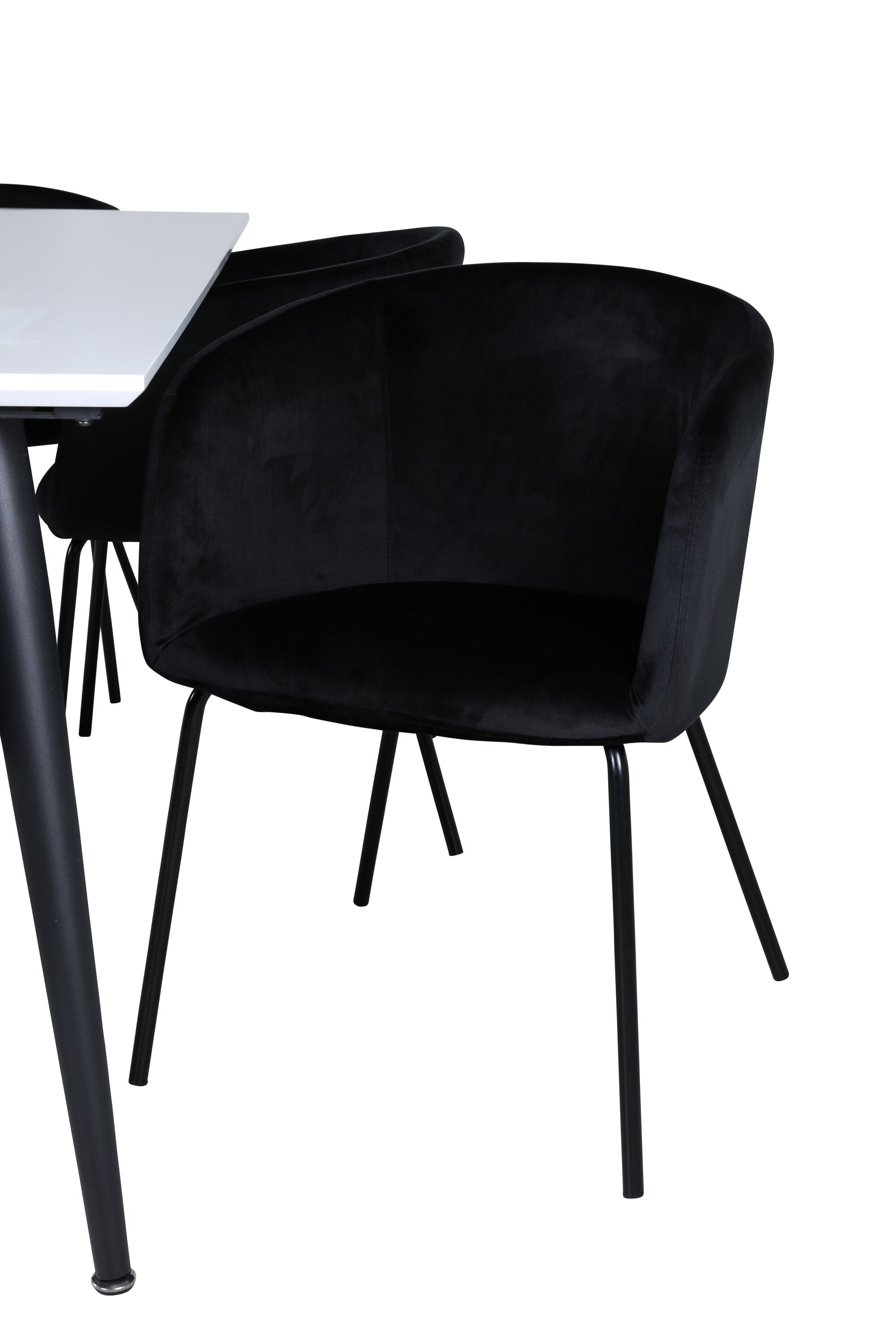 Pampig a elegantní skupina potravin! Naše oblíbené jídelní židle Berit v luxusním designu prodlouží příjemné chvíle večeře. Židle má velkorysou hloubku sedáku se sedákem z černého sametu a stylovou úzkou nohou židle z černého železa. Rozměry židle: výška: 78 cm, výška sedáku: 49 cm, šířka: 55 cm, hloubka: 55 cm. Zde je 6 jídelních židlí sladěno s klasickým jídelním stolem Jimmy - bezpečná karta pro všechny příležitosti! Díky rozšiřitelné horní desce v bílé HPL a MDF dýze a lehce rozšířeným nohám z černého kovu se tento stůl dokonale hodí do všech stylů interiéru a domácností. Rozměry stolu: Délka Rozložitelná mezi: 195 cm a 285 cm, šířka: 90 cm, výška: 76 cm.