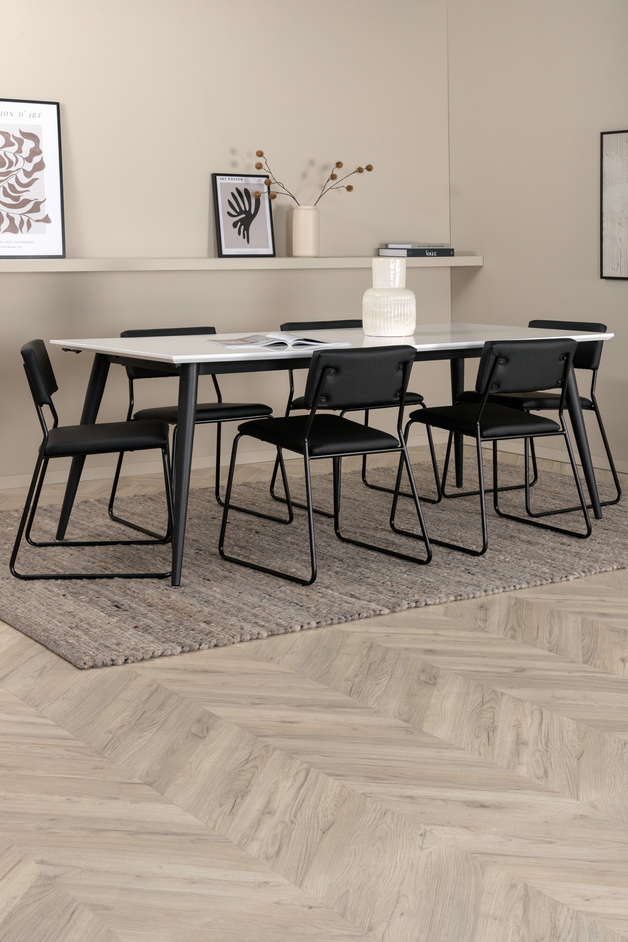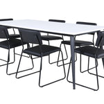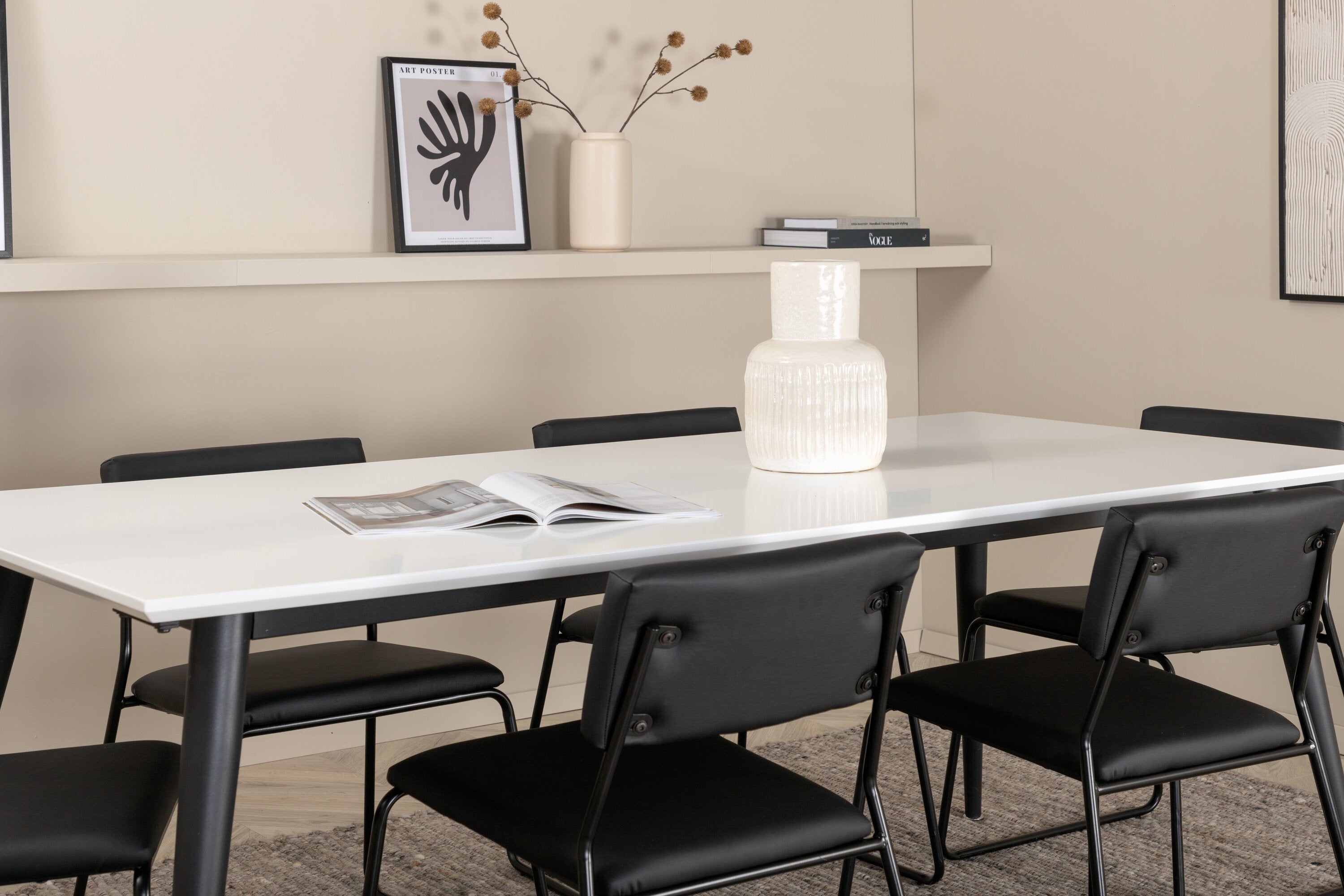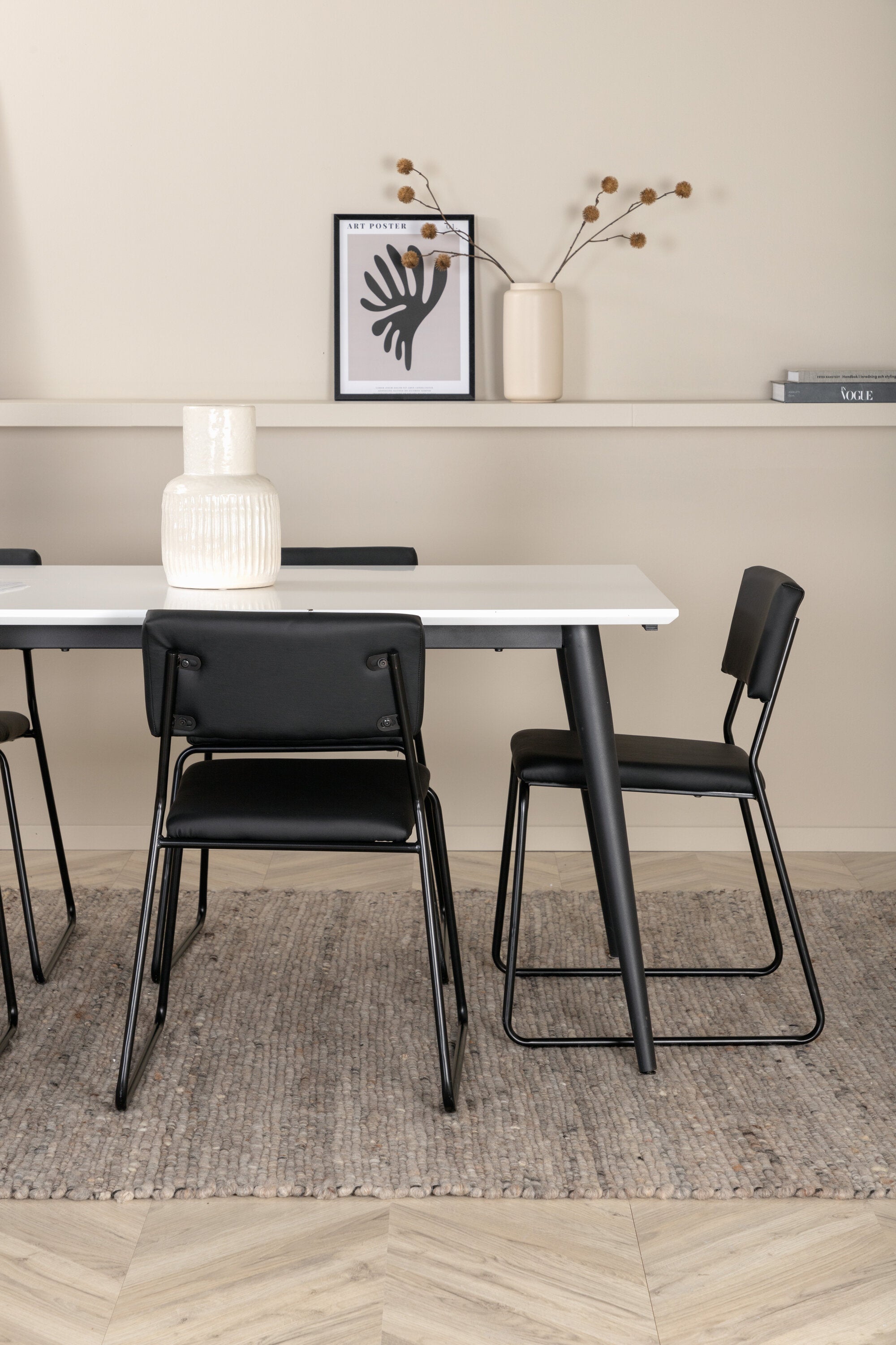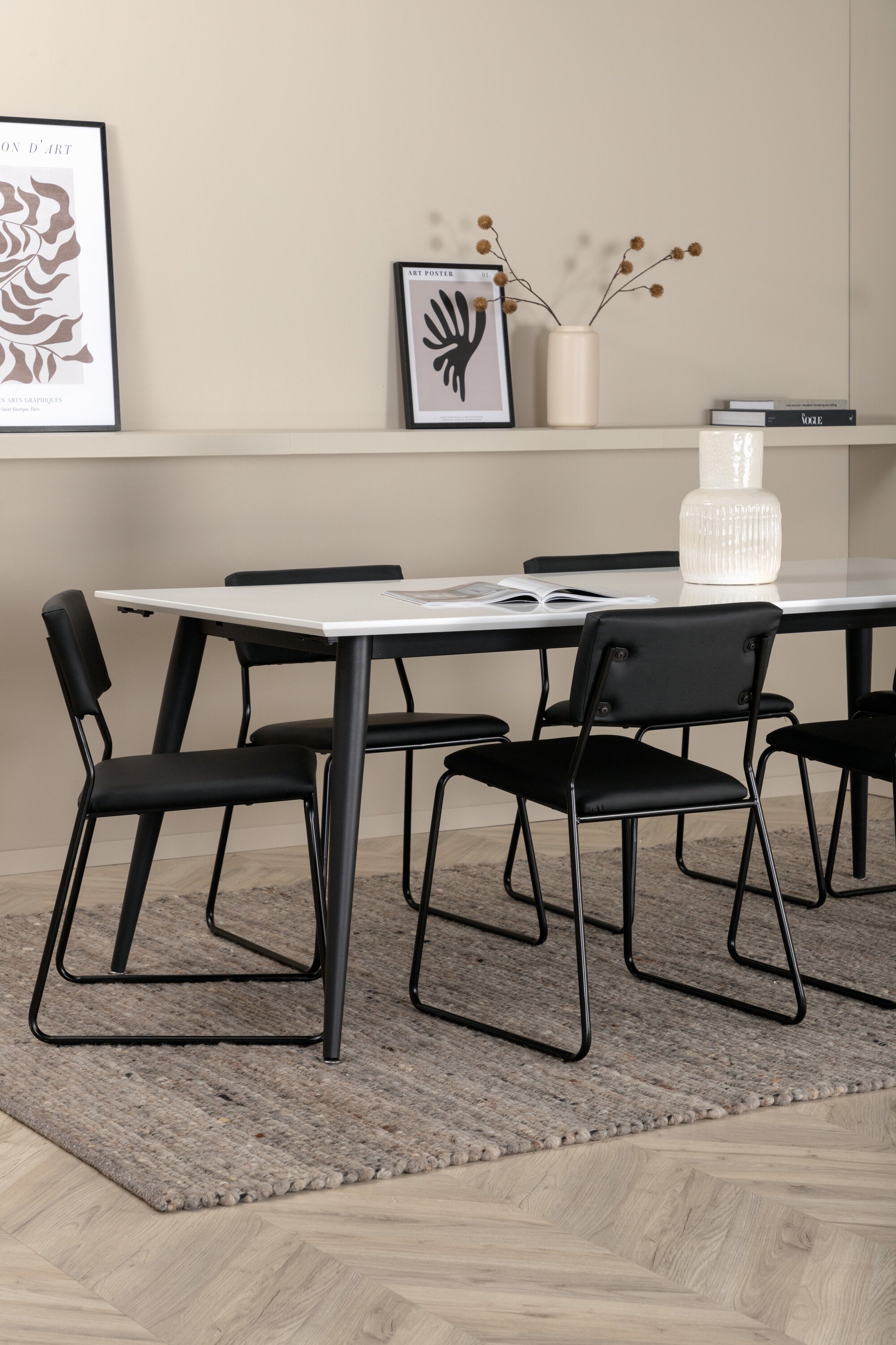 Minimalistický a stylový – skupina jídel pro všechny příležitosti! Jídelní stůl Jimmy má výsuvnou horní desku z bílé HPL a MDF dýhy a lehce rozšířené nohy v černém kovu, klasický vzhled, díky kterému je tento stůl ideální pro všechny styly interiéru a domácnosti. Rozměry stolu: Délka Rozložitelná mezi: 195 cm a 285 cm, šířka: 90 cm, výška: 76 cm. Zde spolu se 6 jídelními židlemi Kenth v pěkném designu. Nohy židle jsou stylově úzké v černém železe a pohodlná sedadla z nafoukané černé umělé kůže. Rozměry židle: Výška: 76 cm, výška sedáku: 48,5 cm, šířka: 40 cm, hloubka: 52 cm.
