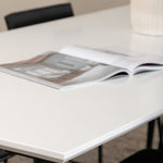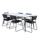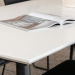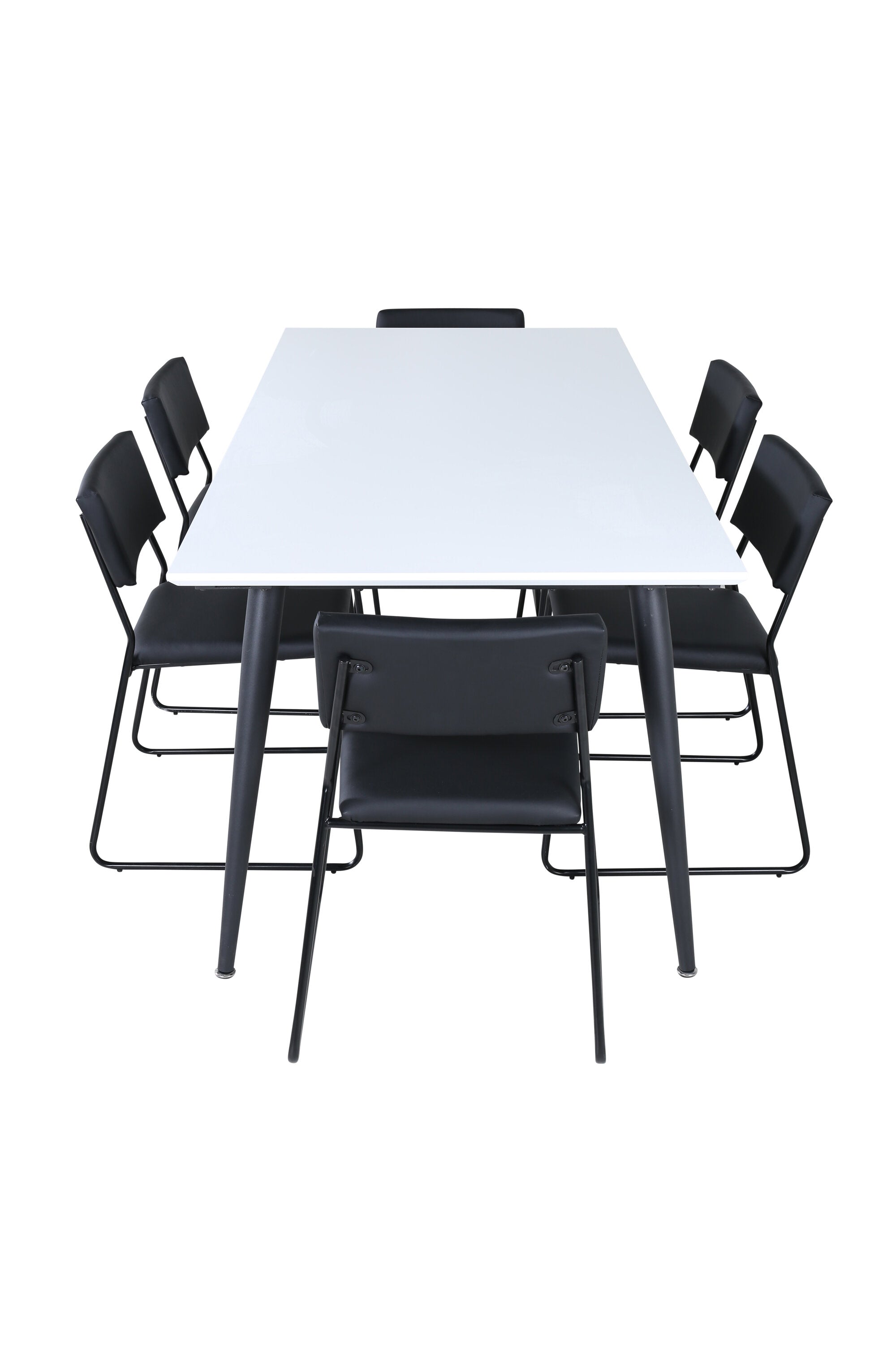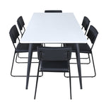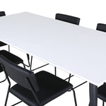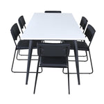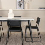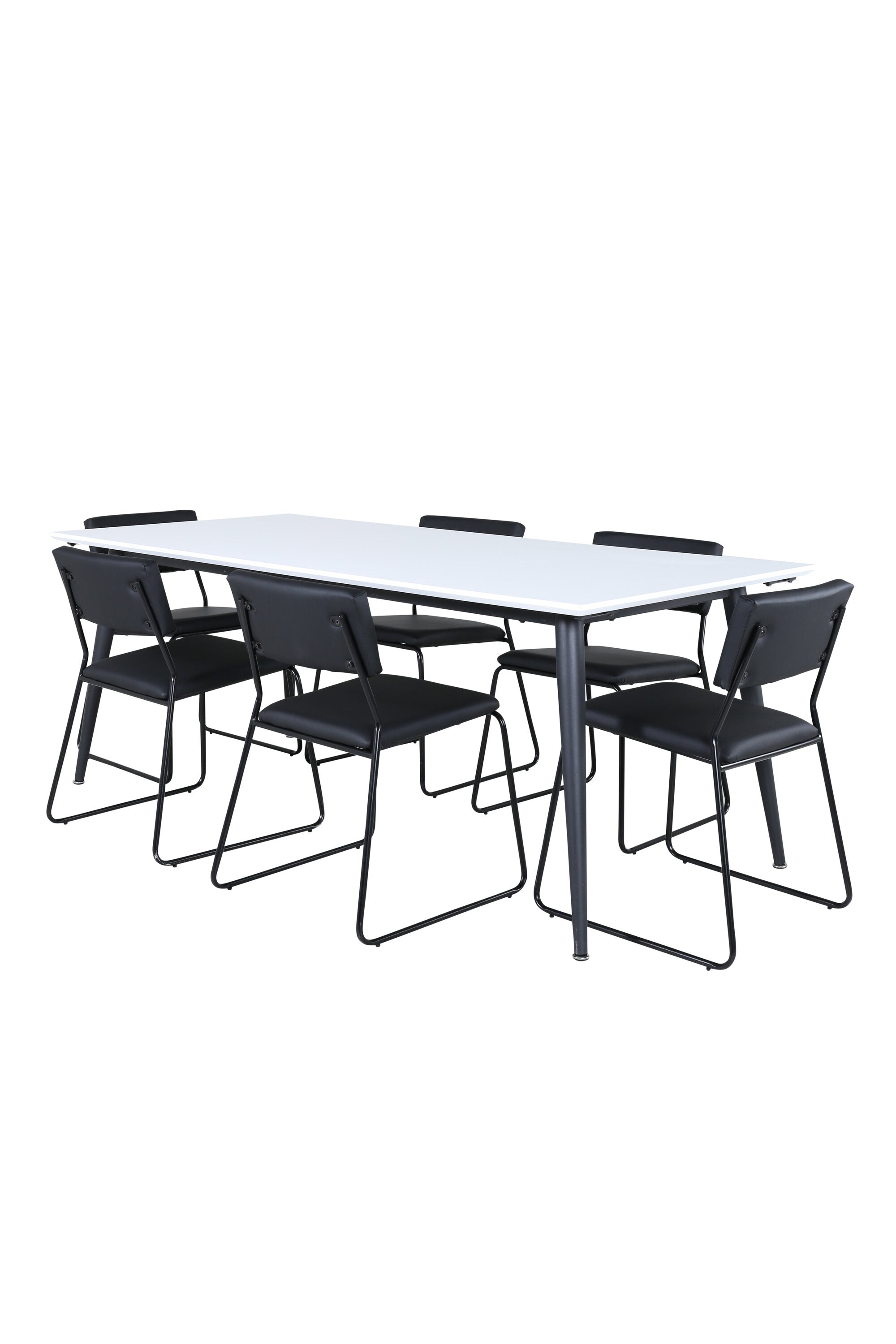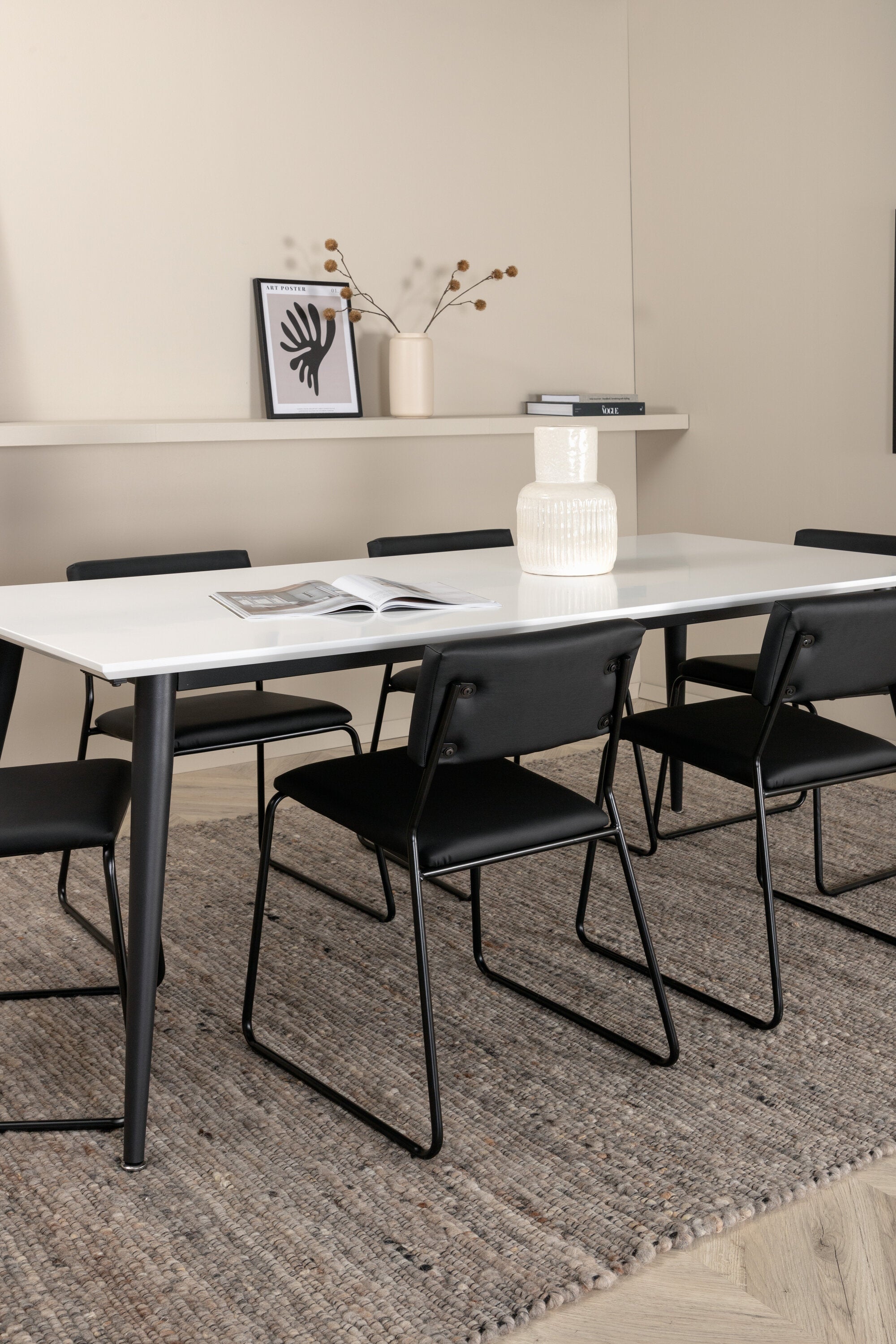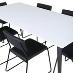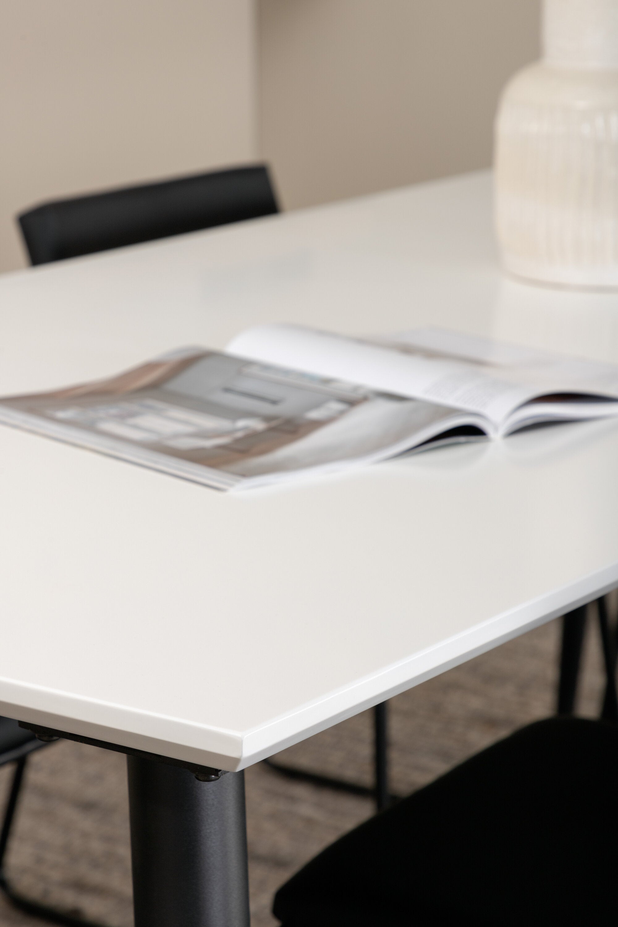 Minimalistický a stylový – skupina jídel pro všechny příležitosti! Jídelní stůl Jimmy má výsuvnou horní desku z bílé HPL a MDF dýhy a lehce rozšířené nohy v černém kovu, klasický vzhled, díky kterému je tento stůl ideální pro všechny styly interiéru a domácnosti. Rozměry stolu: Délka Rozložitelná mezi: 195 cm a 285 cm, šířka: 90 cm, výška: 76 cm. Zde spolu se 6 jídelními židlemi Kenth v pěkném designu. Nohy židle jsou stylově úzké v černém železe a pohodlná sedadla z nafoukané černé umělé kůže. Rozměry židle: Výška: 76 cm, výška sedáku: 48,5 cm, šířka: 40 cm, hloubka: 52 cm.