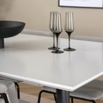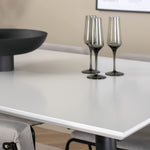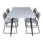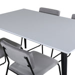 Minimalistický a stylový – skupina jídel pro všechny příležitosti! Jídelní stůl Jimmy má výsuvnou horní desku z bílé HPL a MDF dýhy a lehce rozšířené nohy v černém kovu, klasický vzhled, díky kterému je tento stůl ideální pro všechny styly interiéru a domácnosti. Rozměry stolu: Délka Rozkládací mezi: 150 cm a 240 cm, šířka: 90 cm, výška: 76 cm. Zde spolu se 4 jídelními židlemi Kenth v pěkném designu. Nohy židle jsou stylově úzké v černém železe a sedadla pohodlná v šedém sametu. Rozměry židle: Výška: 76 cm, výška sedáku: 48,5 cm, šířka: 40 cm, hloubka: 52 cm.
